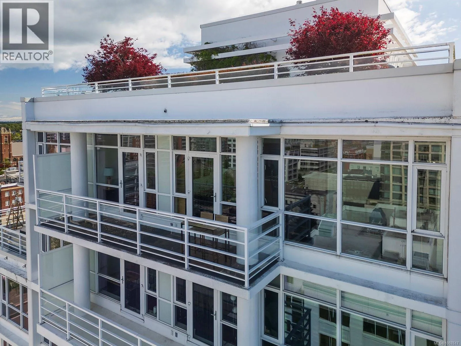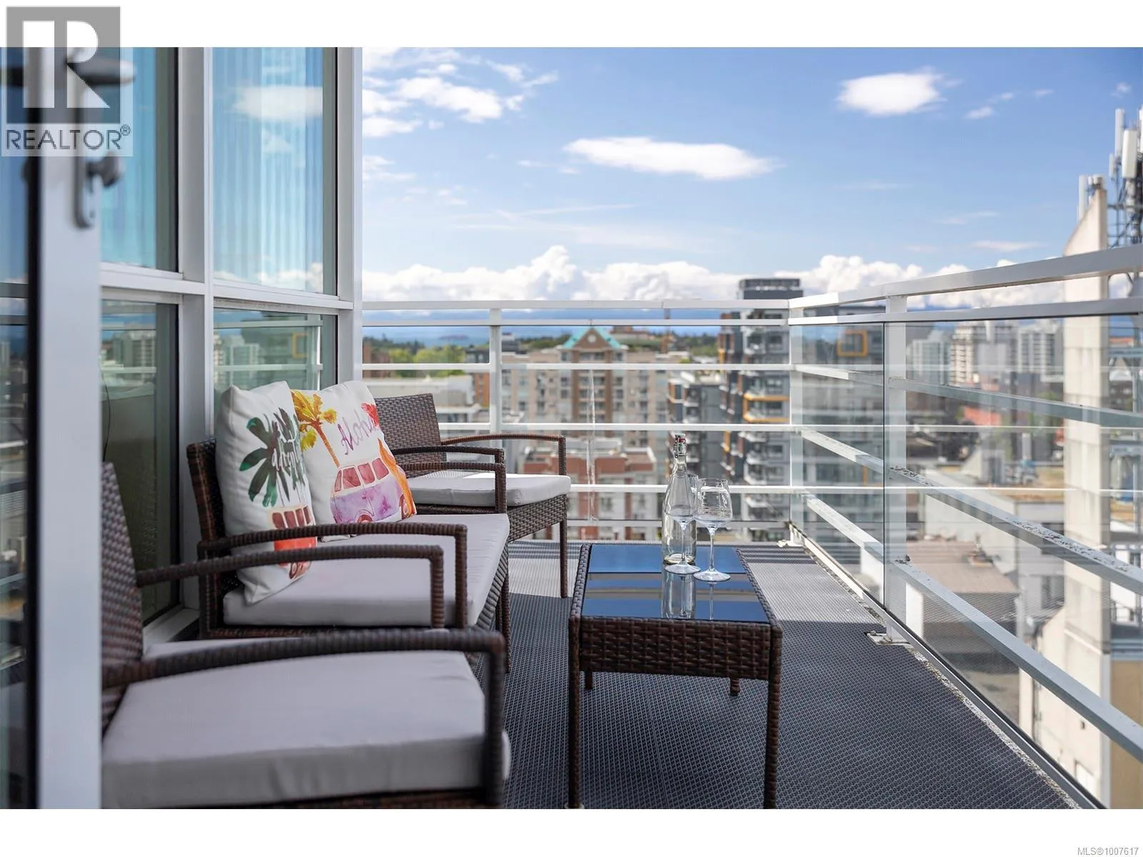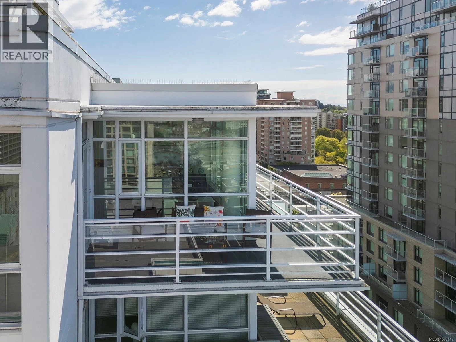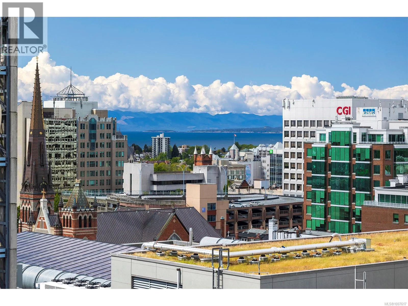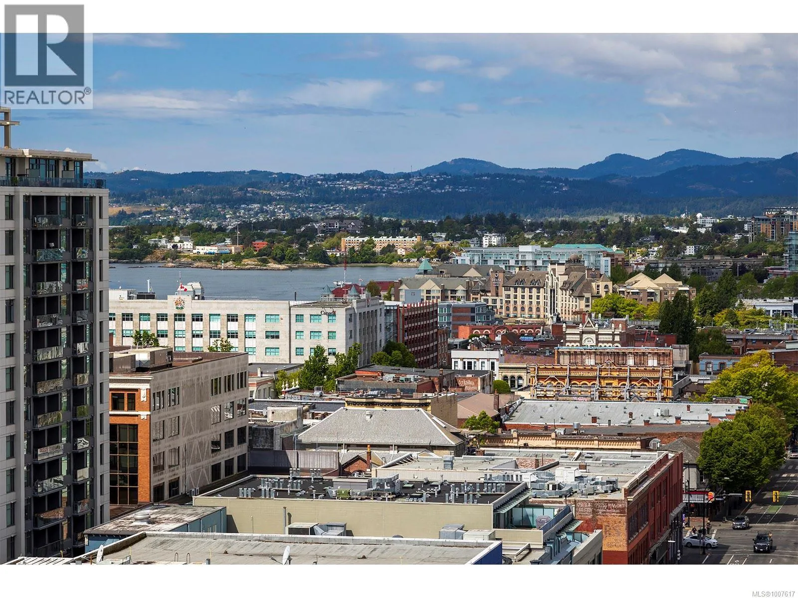 Step into Penthouse 1502, where panoramic ocean and city views fill expansive floor-to-ceiling windows. The open layout features wood floors and high ceilings, offering a comfortable space for daily living and relaxed entertaining. A contemporary kitchen with quartz counters flows into bright dining and living areas. Bedrooms are thoughtfully separated for privacy. The spacious primary suite includes dual closets and an ensuite with heated floors, soaker tub, and separate shower. A second bedroom or office and full guest bath complete the plan. Two large balconies (260+ sq ft) extend the living space outdoors, with gas and water hookups on the larger, west-facing side. Building amenities include a rooftop terrace with 360° views, full lounge with kitchen, patio with BBQ, and a resident caretaker. Located in one of Victoriaâs most walkable neighbourhoodsâjust minutes from the Inner Harbour, cafés, dining, shopping, and nightlife. A rare penthouse offering in the heart of the city! (id:27476)