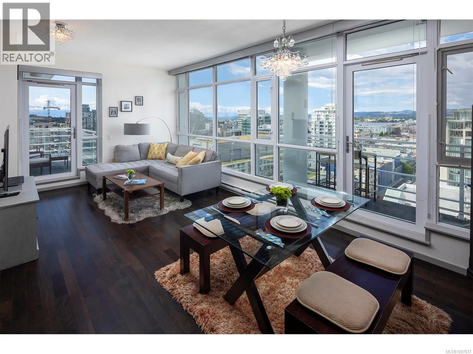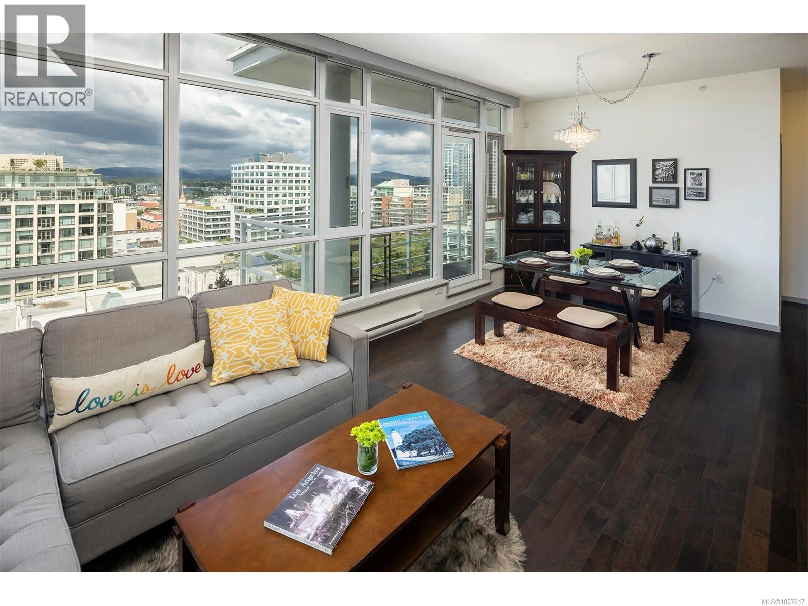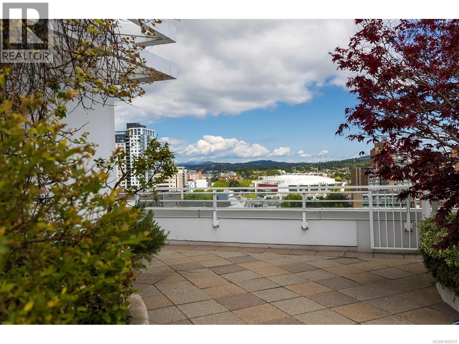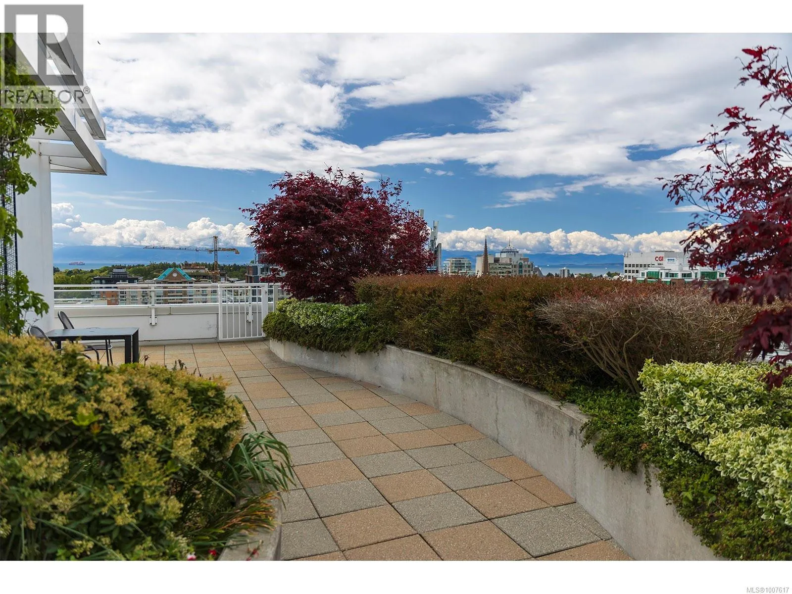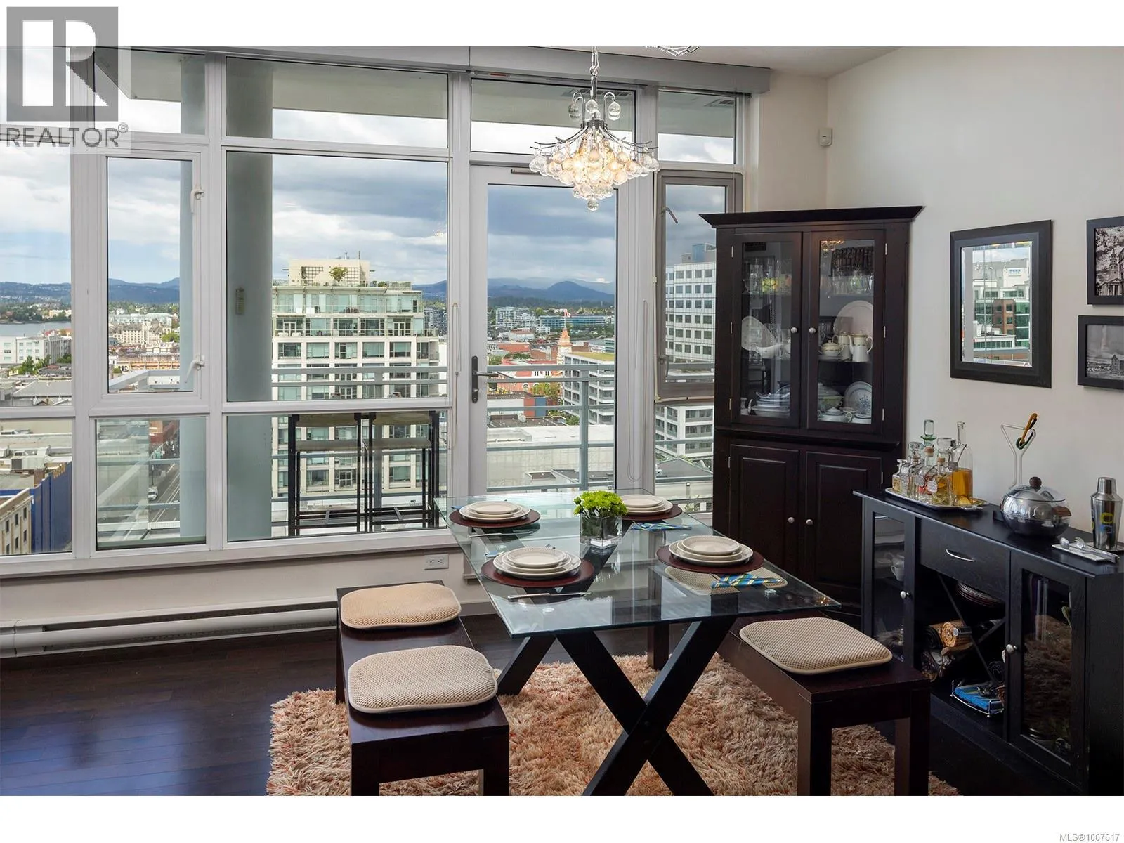 Step into Penthouse 1502, where panoramic ocean and city views fill expansive floor-to-ceiling windows. The open layout features wood floors and high ceilings, offering a comfortable space for daily living and relaxed entertaining. A contemporary kitchen with quartz counters flows into bright dining and living areas. Bedrooms are thoughtfully separated for privacy. The spacious primary suite includes dual closets and an ensuite with heated floors, soaker tub, and separate shower. A second bedroom or office and full guest bath complete the plan. Two large balconies (260+ sq ft) extend the living space outdoors, with gas and water hookups on the larger, west-facing side. Building amenities include a rooftop terrace with 360° views, full lounge with kitchen, patio with BBQ, and a resident caretaker. Located in one of Victoriaâs most walkable neighbourhoodsâjust minutes from the Inner Harbour, cafés, dining, shopping, and nightlife. A rare penthouse offering in the heart of the city! (id:27476)