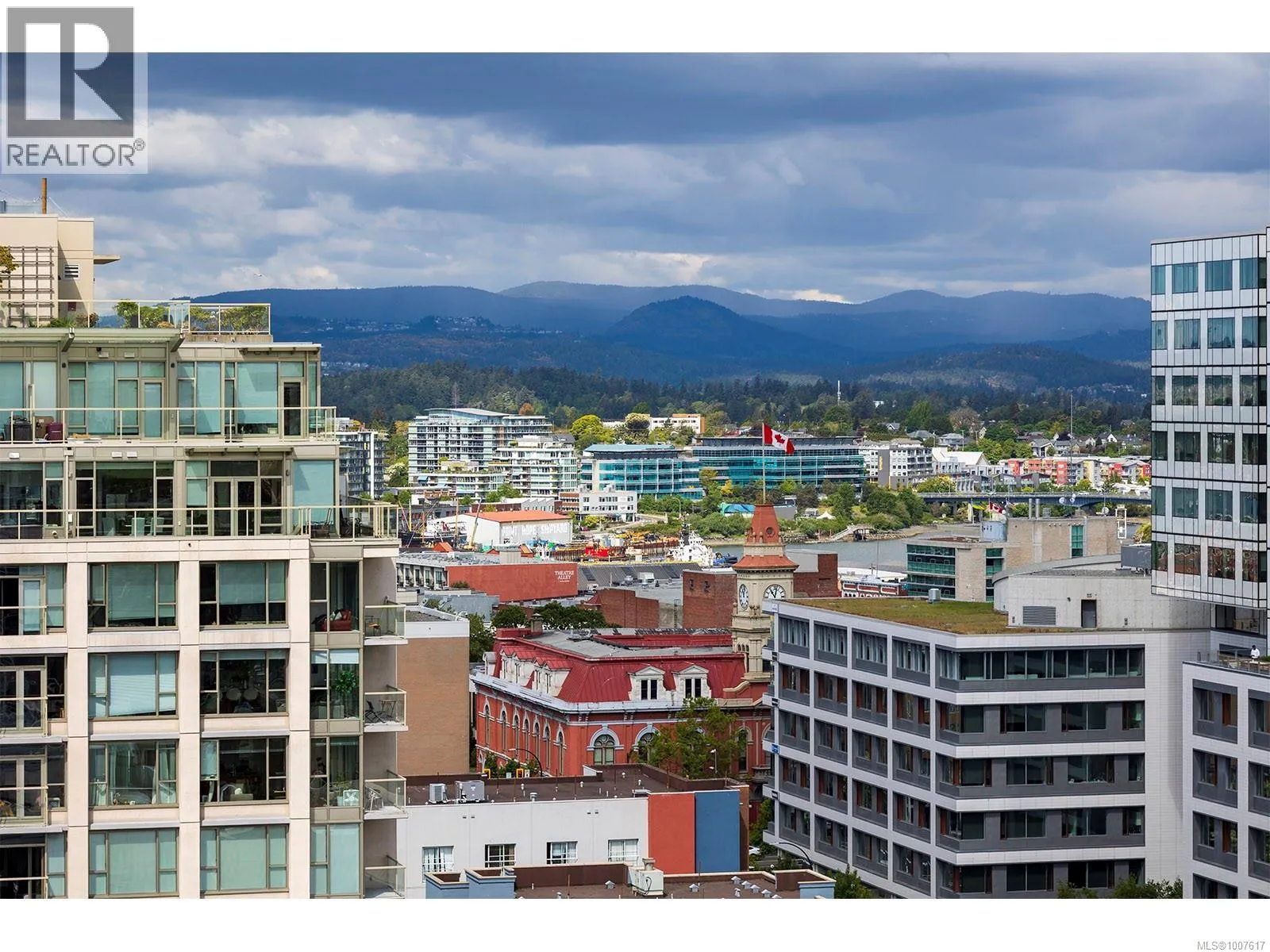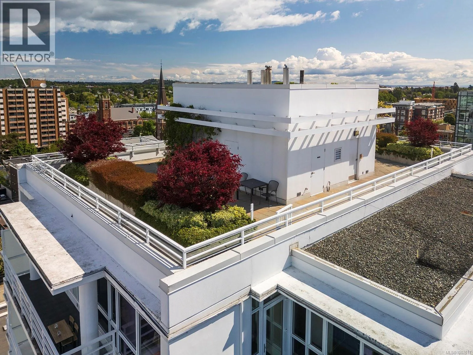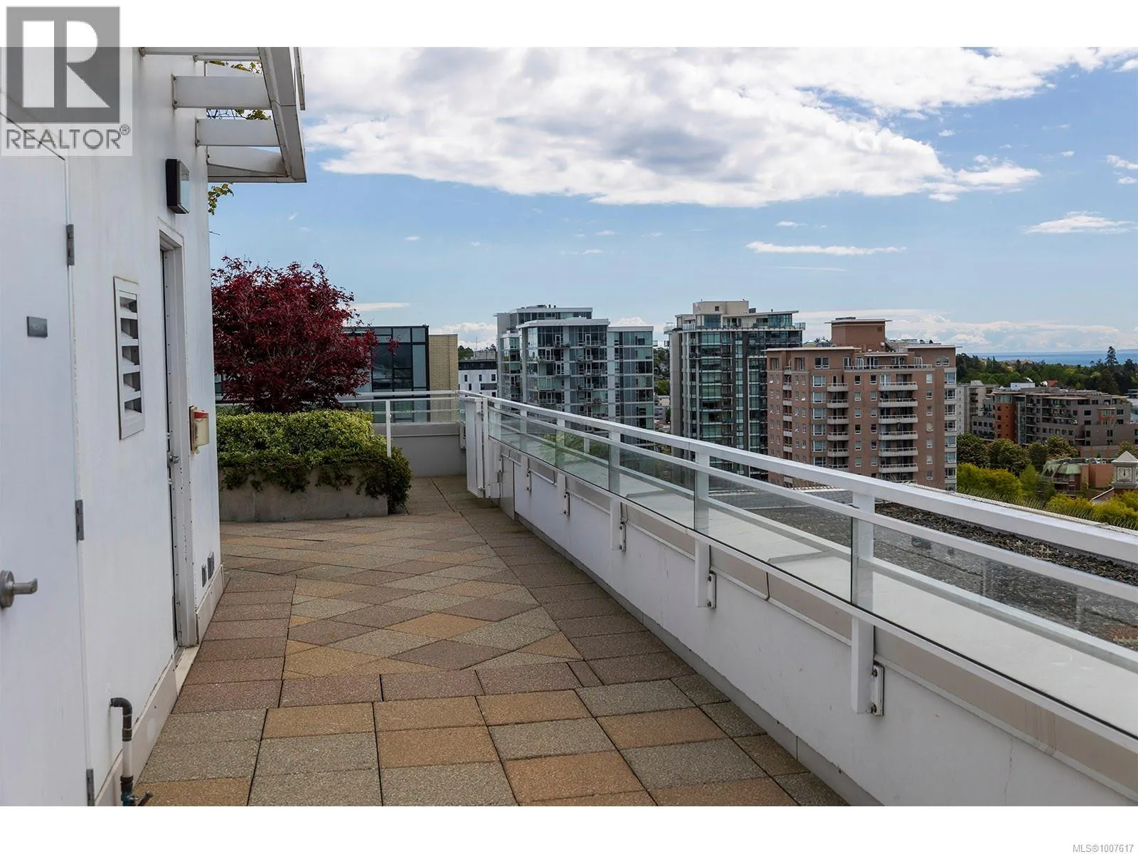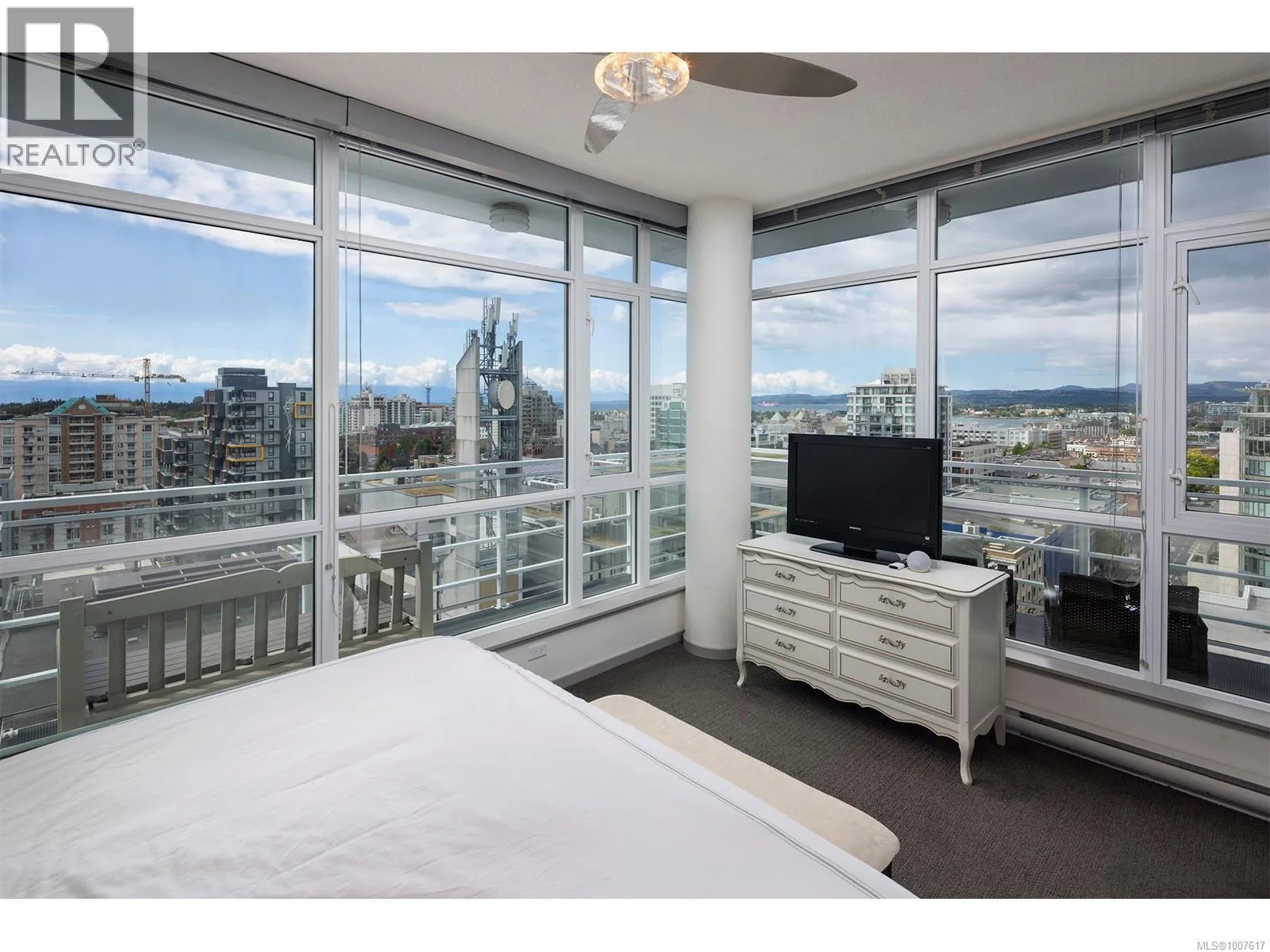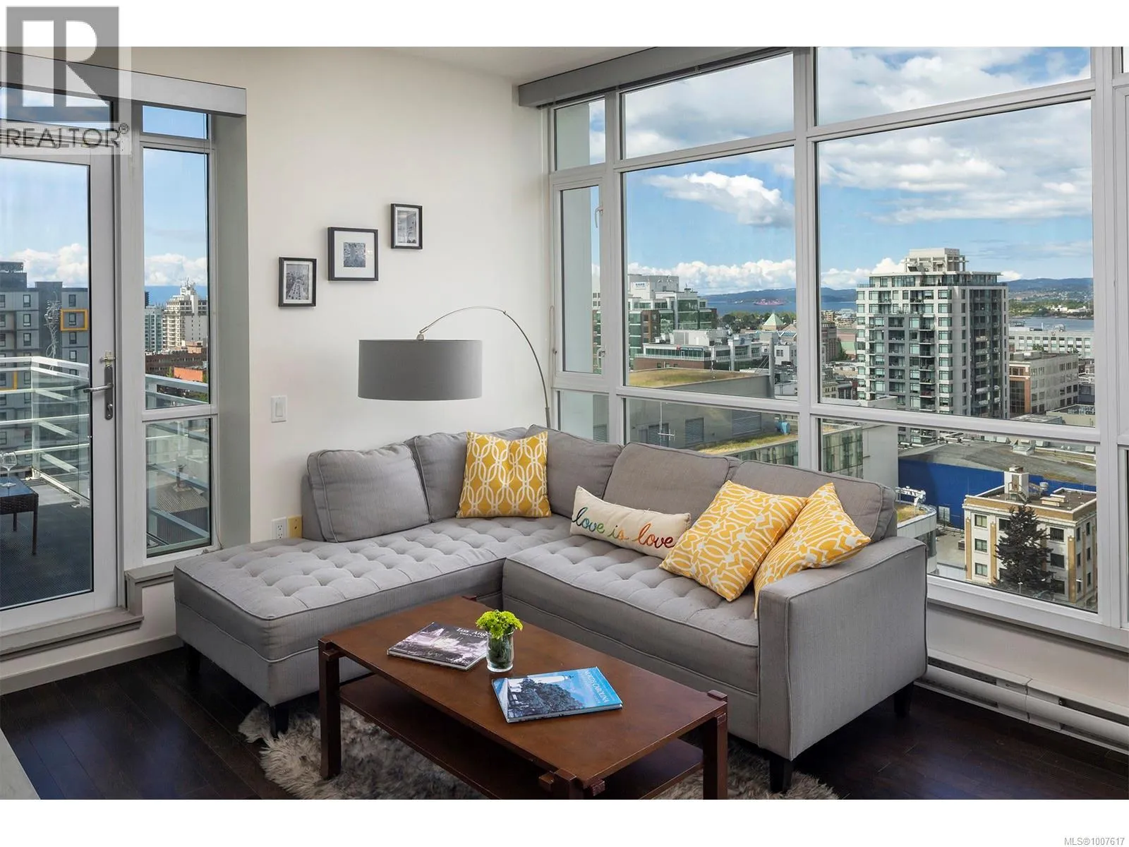 Step into Penthouse 1502, where panoramic ocean and city views fill expansive floor-to-ceiling windows. The open layout features wood floors and high ceilings, offering a comfortable space for daily living and relaxed entertaining. A contemporary kitchen with quartz counters flows into bright dining and living areas. Bedrooms are thoughtfully separated for privacy. The spacious primary suite includes dual closets and an ensuite with heated floors, soaker tub, and separate shower. A second bedroom or office and full guest bath complete the plan. Two large balconies (260+ sq ft) extend the living space outdoors, with gas and water hookups on the larger, west-facing side. Building amenities include a rooftop terrace with 360° views, full lounge with kitchen, patio with BBQ, and a resident caretaker. Located in one of Victoriaâs most walkable neighbourhoodsâjust minutes from the Inner Harbour, cafés, dining, shopping, and nightlife. A rare penthouse offering in the heart of the city! (id:27476)