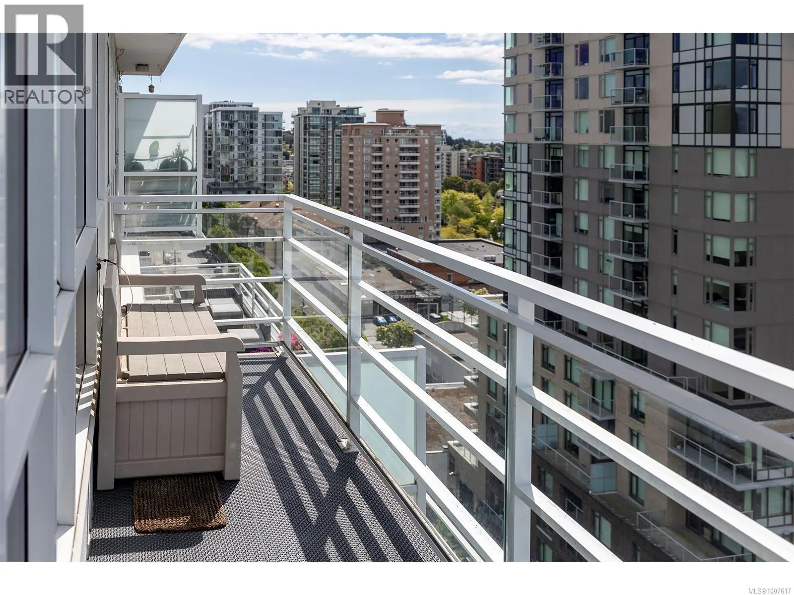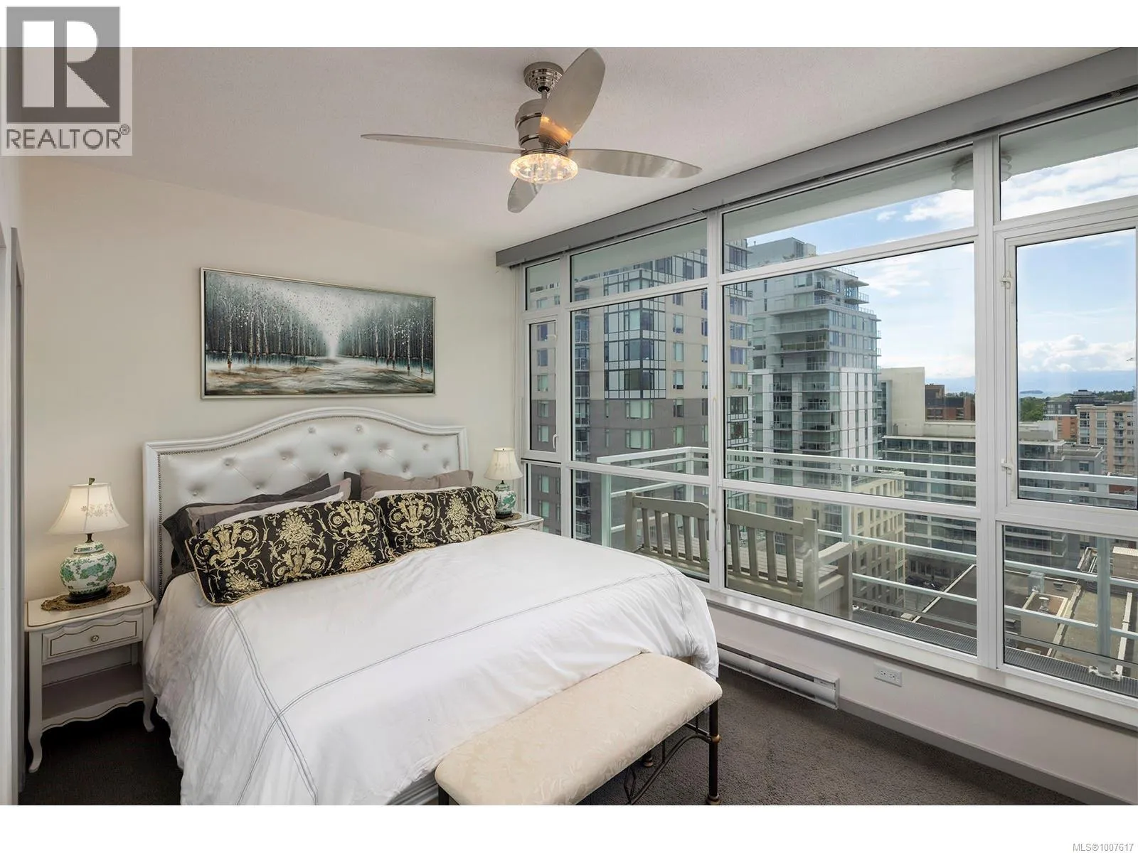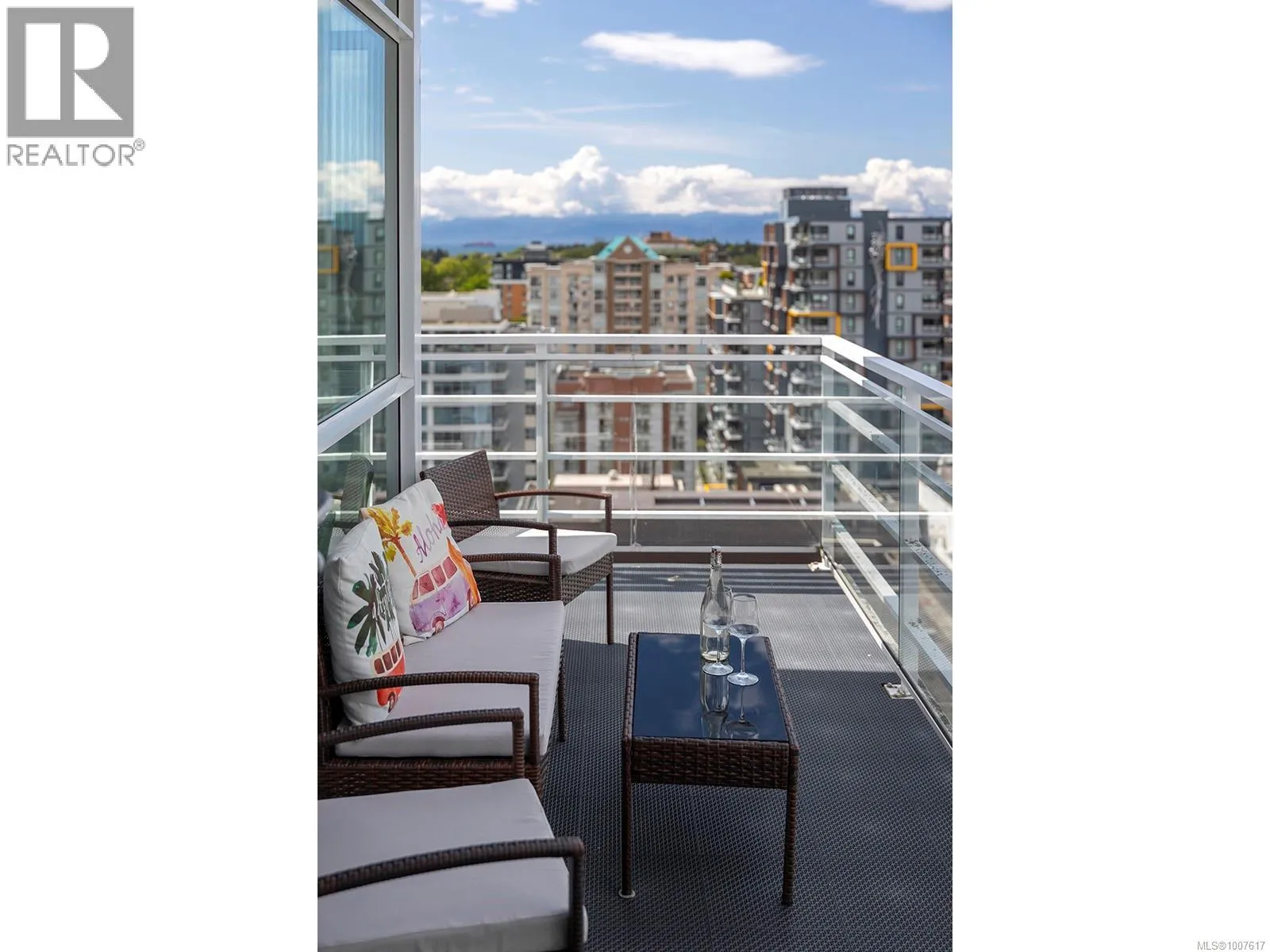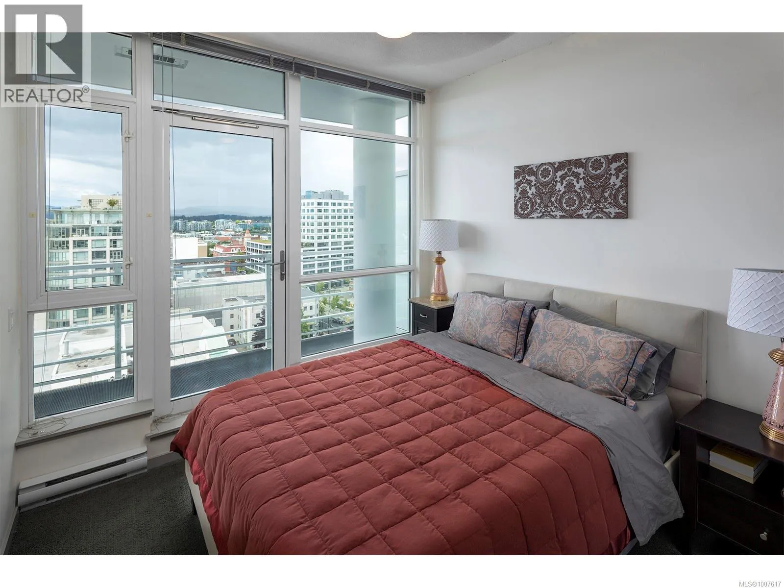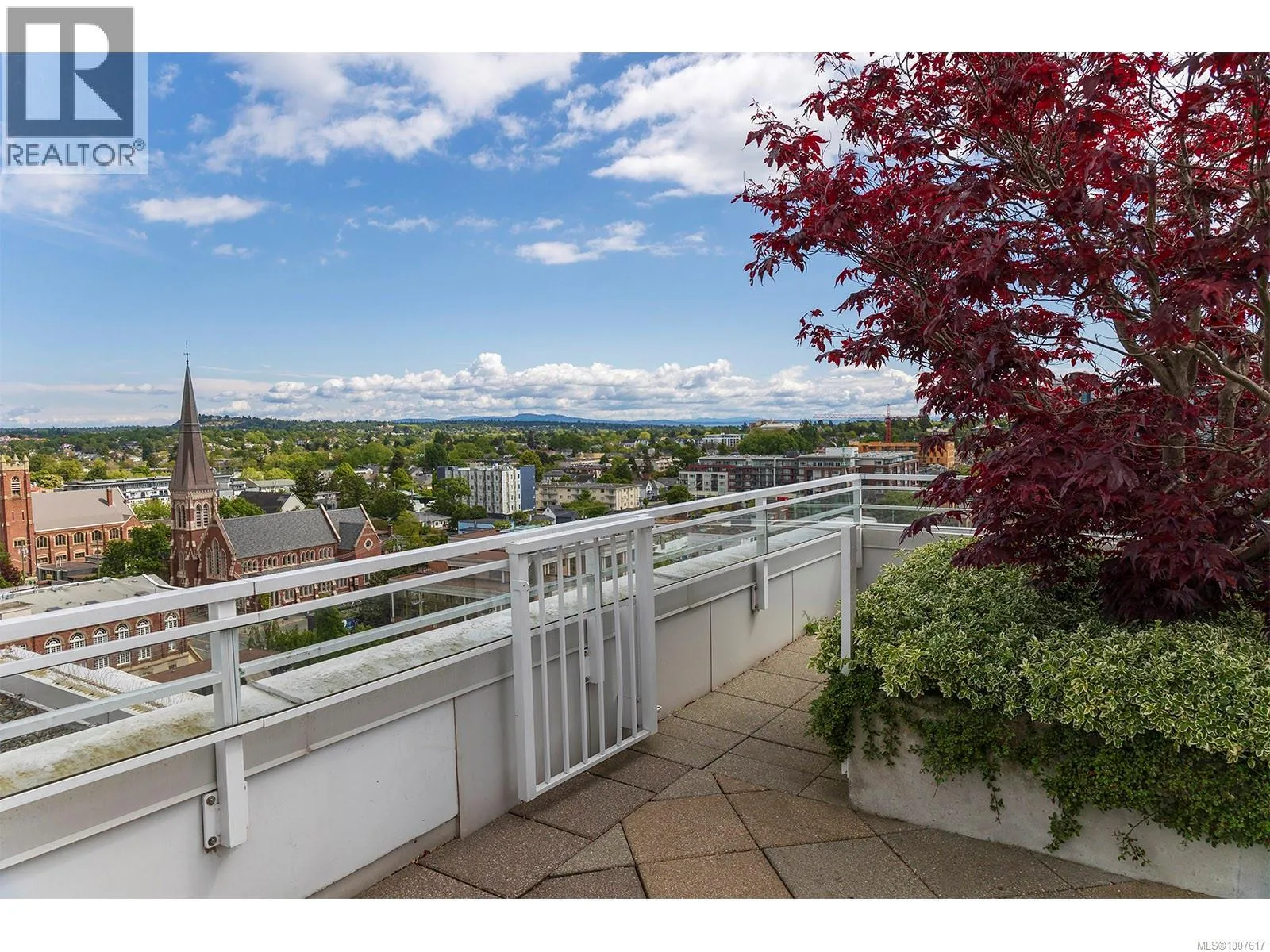 Step into Penthouse 1502, where panoramic ocean and city views fill expansive floor-to-ceiling windows. The open layout features wood floors and high ceilings, offering a comfortable space for daily living and relaxed entertaining. A contemporary kitchen with quartz counters flows into bright dining and living areas. Bedrooms are thoughtfully separated for privacy. The spacious primary suite includes dual closets and an ensuite with heated floors, soaker tub, and separate shower. A second bedroom or office and full guest bath complete the plan. Two large balconies (260+ sq ft) extend the living space outdoors, with gas and water hookups on the larger, west-facing side. Building amenities include a rooftop terrace with 360° views, full lounge with kitchen, patio with BBQ, and a resident caretaker. Located in one of Victoriaâs most walkable neighbourhoodsâjust minutes from the Inner Harbour, cafés, dining, shopping, and nightlife. A rare penthouse offering in the heart of the city! (id:27476)