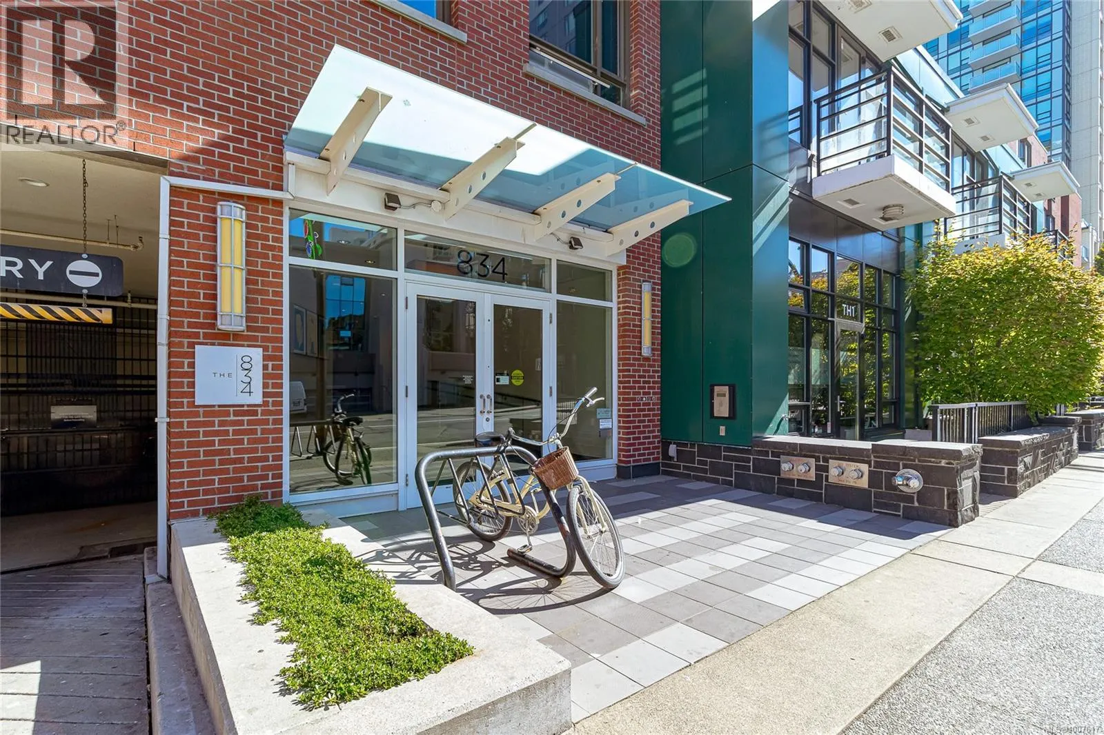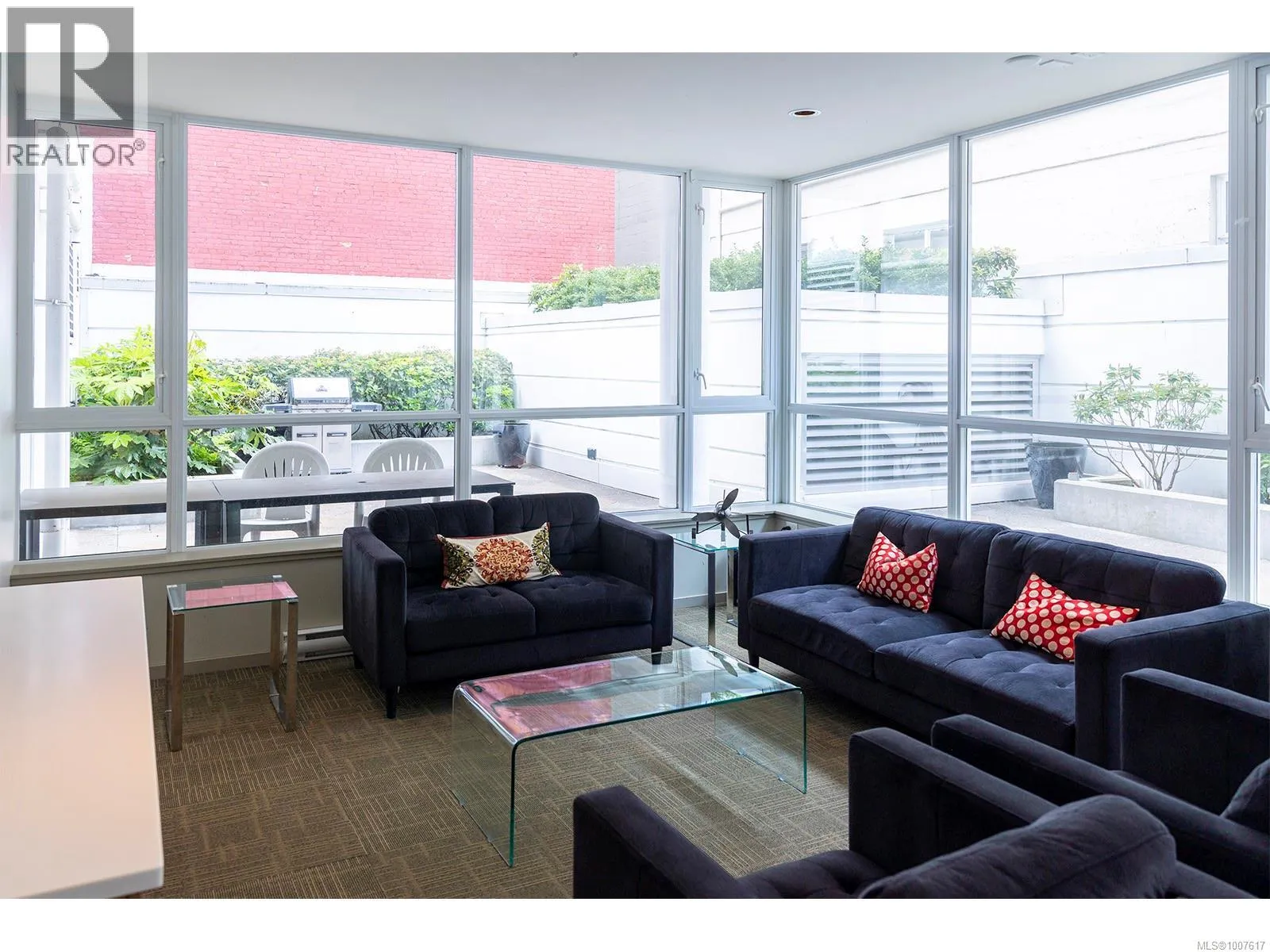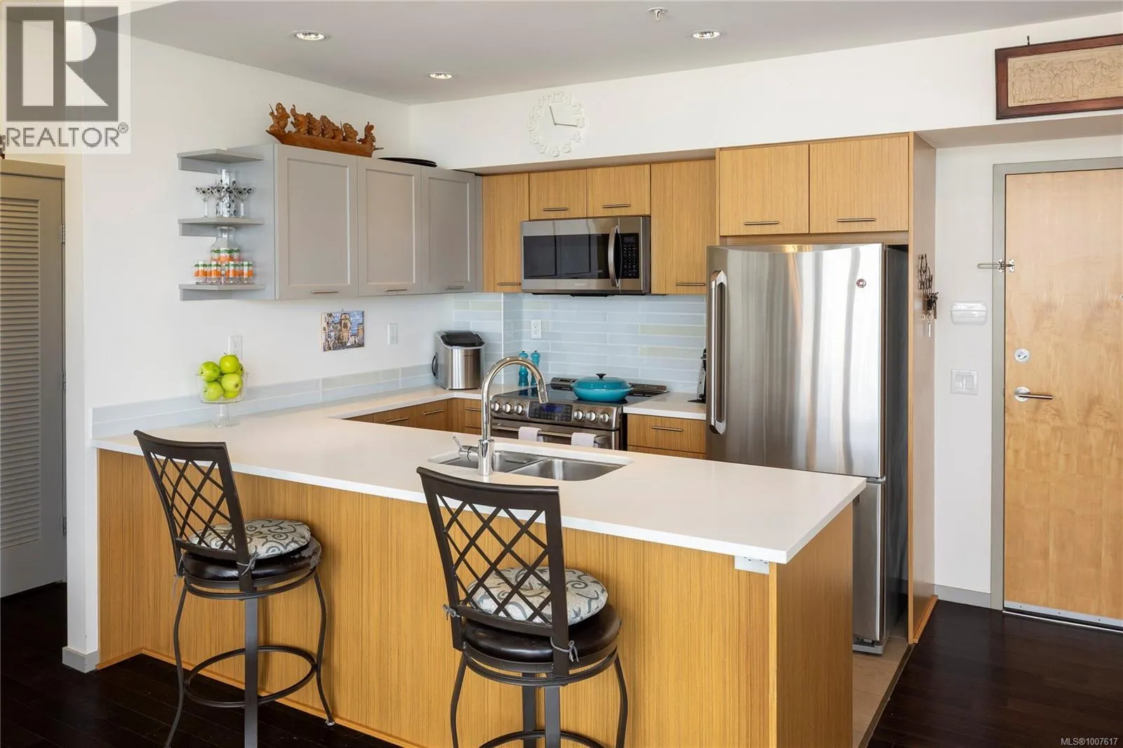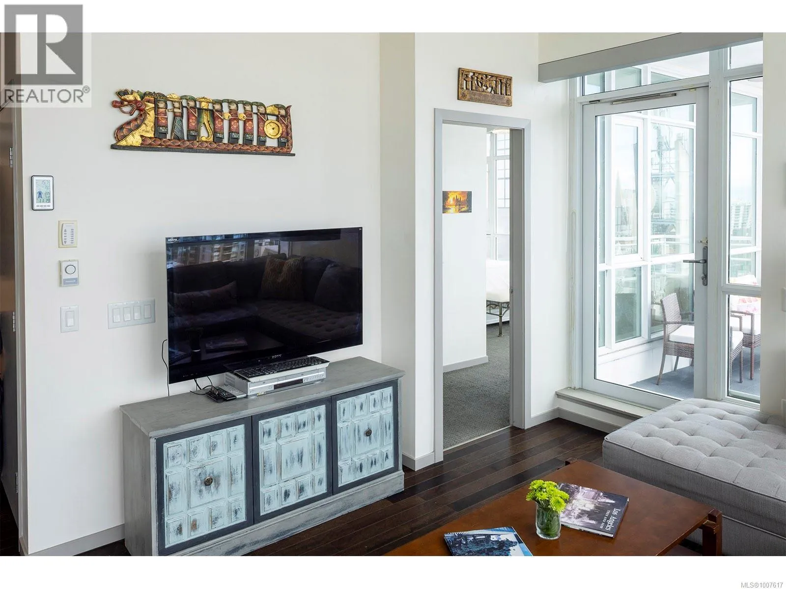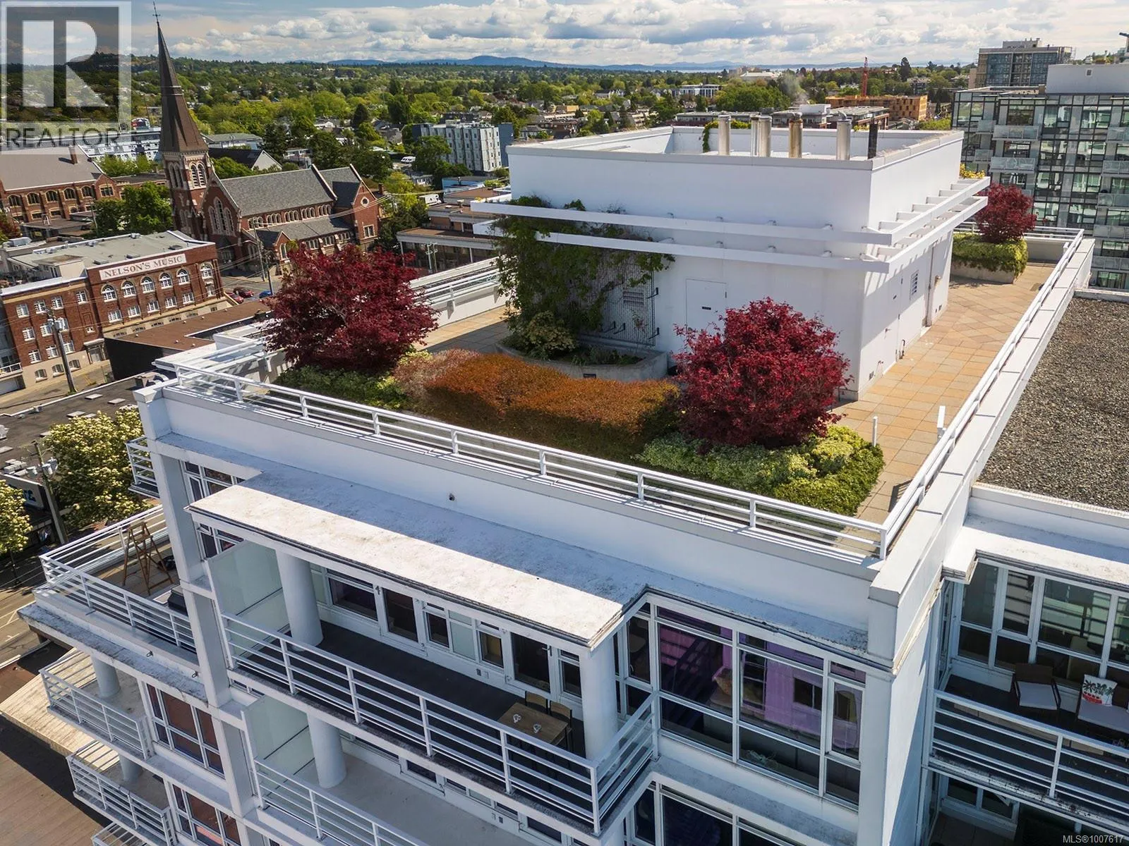 Step into Penthouse 1502, where panoramic ocean and city views fill expansive floor-to-ceiling windows. The open layout features wood floors and high ceilings, offering a comfortable space for daily living and relaxed entertaining. A contemporary kitchen with quartz counters flows into bright dining and living areas. Bedrooms are thoughtfully separated for privacy. The spacious primary suite includes dual closets and an ensuite with heated floors, soaker tub, and separate shower. A second bedroom or office and full guest bath complete the plan. Two large balconies (260+ sq ft) extend the living space outdoors, with gas and water hookups on the larger, west-facing side. Building amenities include a rooftop terrace with 360° views, full lounge with kitchen, patio with BBQ, and a resident caretaker. Located in one of Victoriaâs most walkable neighbourhoodsâjust minutes from the Inner Harbour, cafés, dining, shopping, and nightlife. A rare penthouse offering in the heart of the city! (id:27476)
