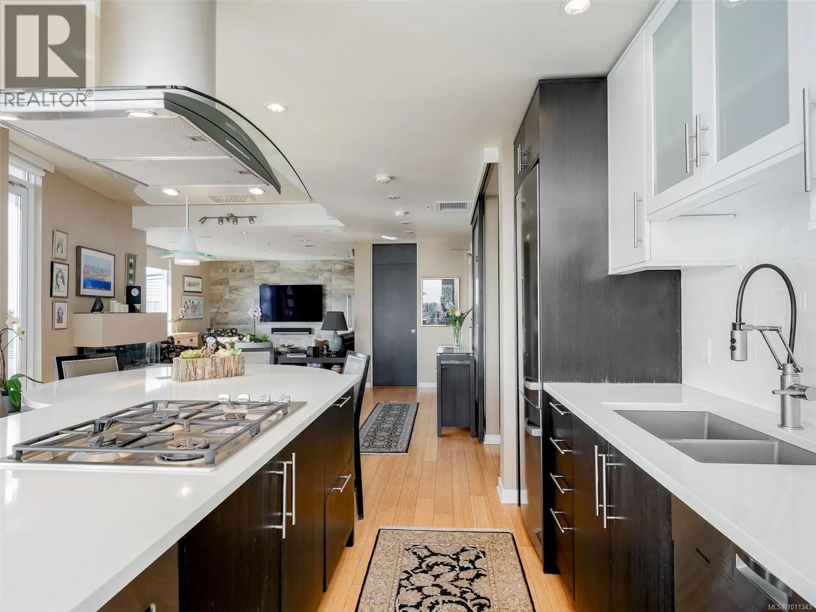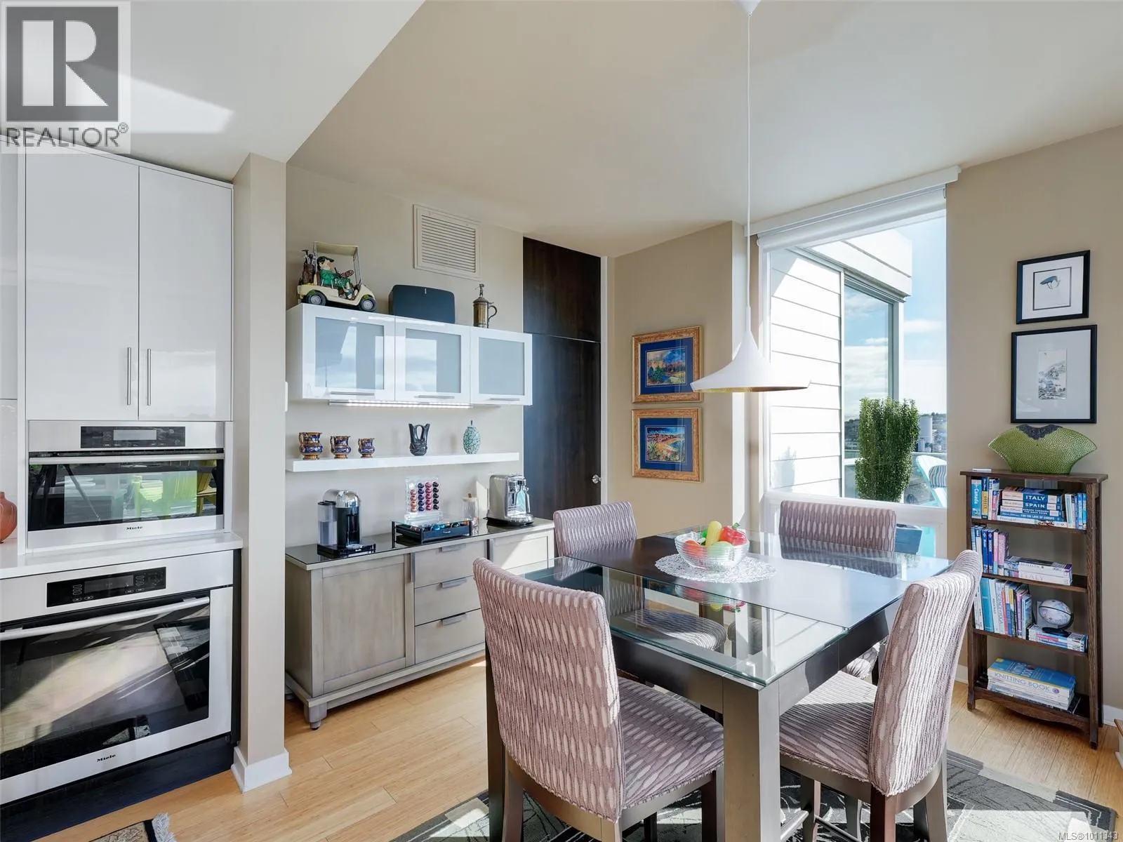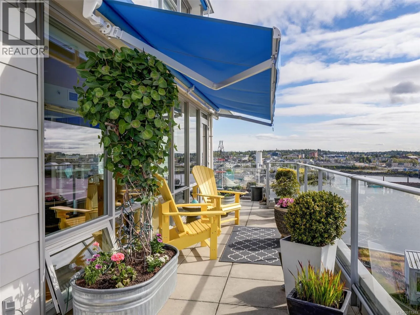 A rare offering in Dockside Greenâthis meticulously maintained sub-penthouse blends thoughtful updates w/ refined style. Built in 2008, this 1,140 sqft 2-bed + converted den condo offers a bright, open layout with high-end finishes. Enjoy heated bathrm floors, a steam shower, quartz counters, Miele appliances, custom Thomas & Birch cabinetry, a built-in Sonos sound system, Connect 4 automation, new electric blinds & awnings, and one of the few decks with a dedicated BBQ gas line. The large deck offers stunning viewsâperfect for relaxing or entertaining. Extras include 2 secure parking spots & 2 dedicated kayak racks. Dockside Green is a vibrant, eco-friendly community with a well-managed strata and easy access to shops, cafes, and the Galloping Goose Trail. Ideal for a newly retired couple or young professionals seeking a turnkey lifestyle. With premium upgrades and exceptional amenities, this unique condo offers a rare opportunity in one of Victoriaâs most sought-after neighborhoods. (id:27476)