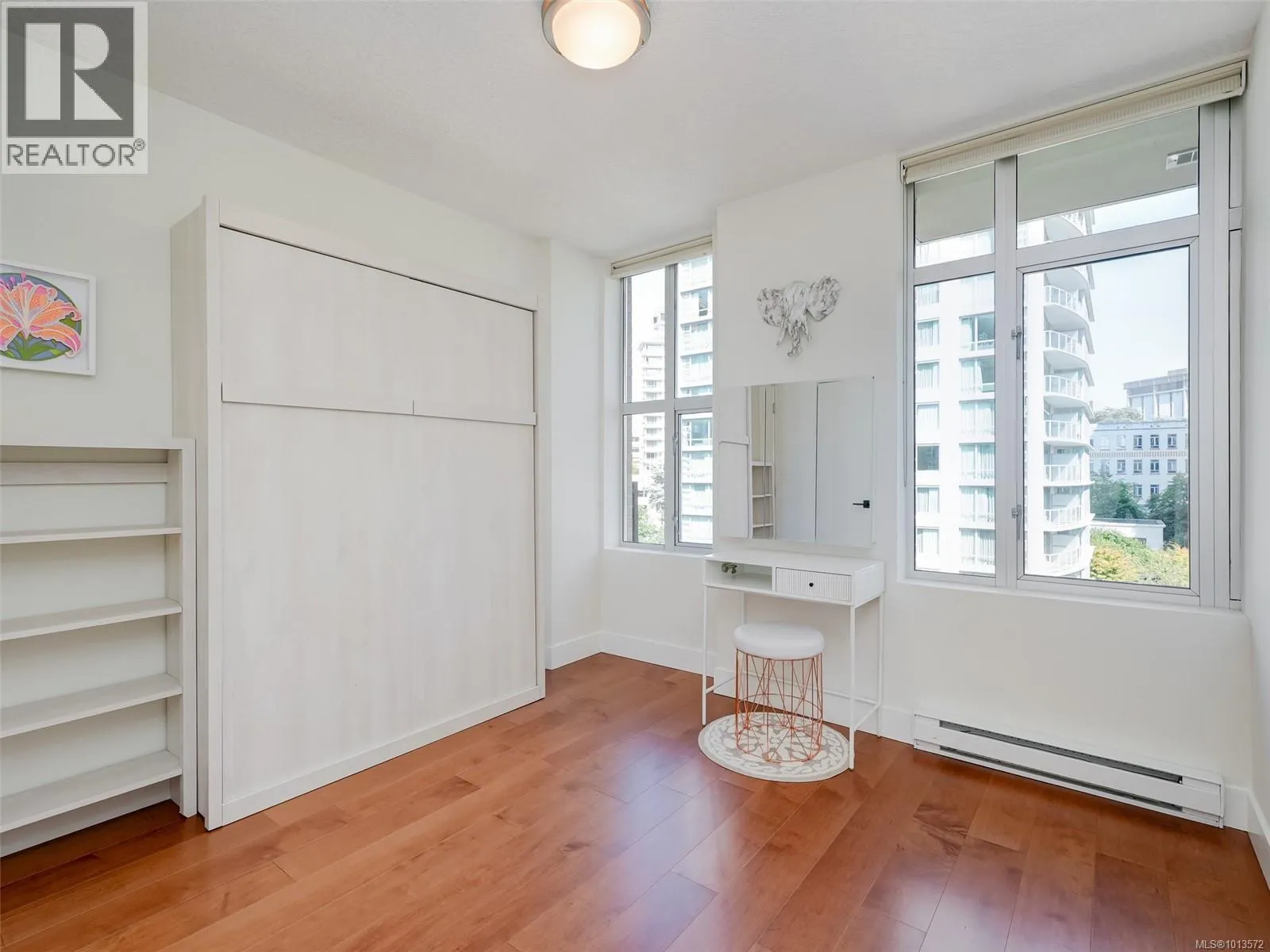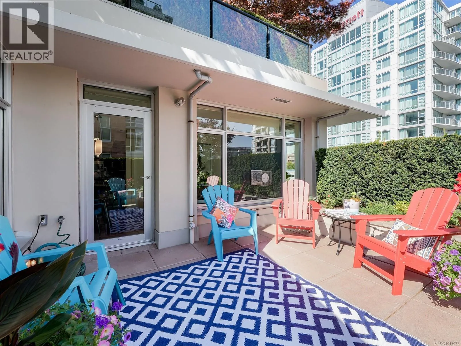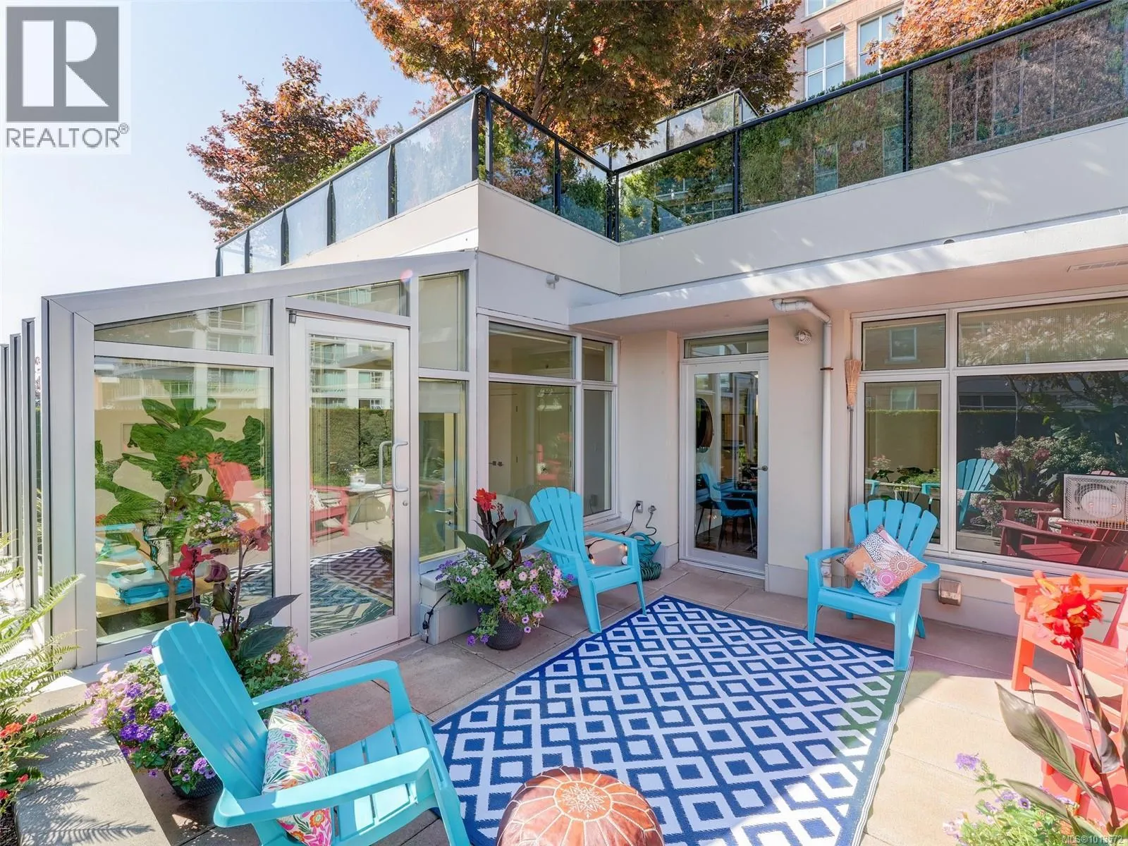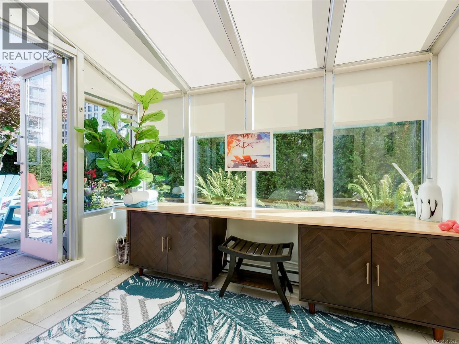 Discover refined living at Aria, one of Victoriaâs most coveted addresses in the Humboldt Valley. This bright two-bedroom, two-bath corner suite is filled with natural light and features a versatile glass-enclosed sunroomâperfect as a dedicated home office, yoga space, or creative studio. A completely private 226 sq. ft. garden terrace extends the living space outdoors, offering a serene urban retreat. The thoughtful floor plan separates the bedrooms, with the second enhanced by a custom Murphy bed for added flexibility. Move-in ready and tastefully appointed, this home is ideal for those seeking a balance of work and lifestyle. Residents enjoy a strong community, with concierge service, fitness centre with sauna, lounge, workshop, secure parking, and vibrant social clubs including book, walking, and craft groups. Pet-friendly with no size restrictions, Aria blends sophistication, convenience, and connection in the heart of downtown Victoria. Truly a wonderful place to call home! (id:27476)
