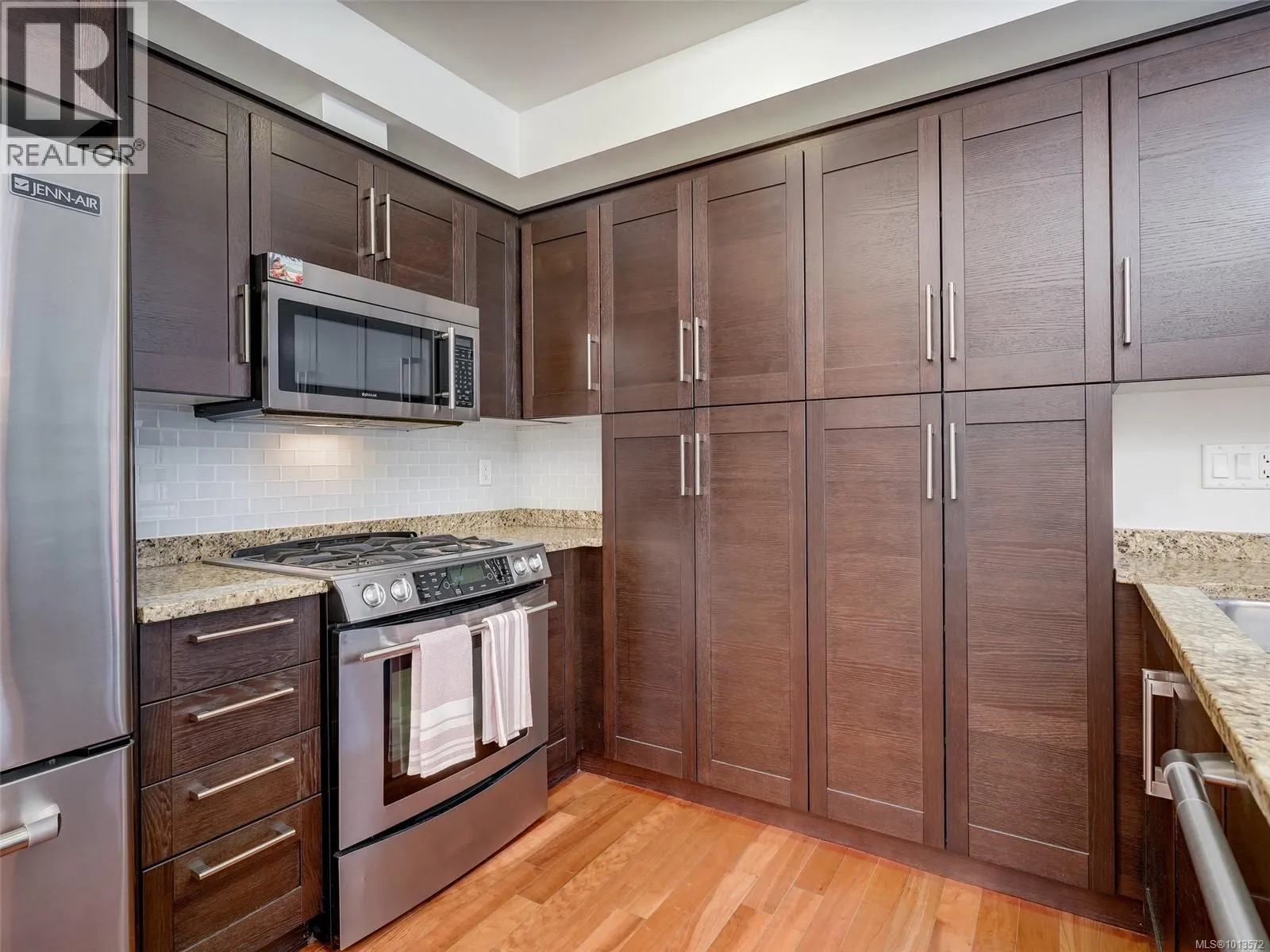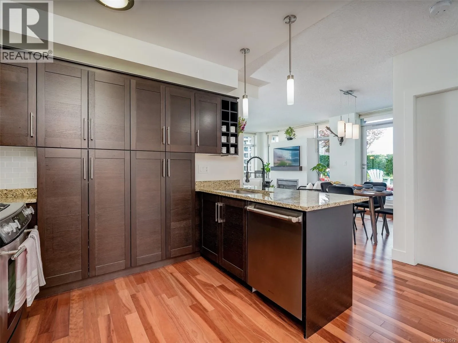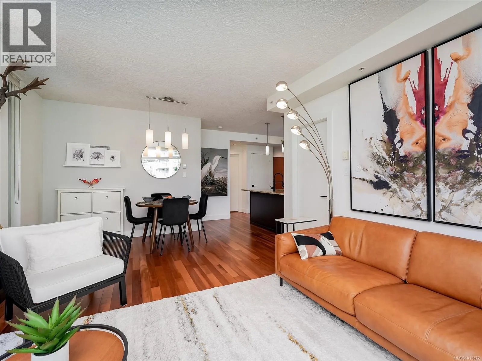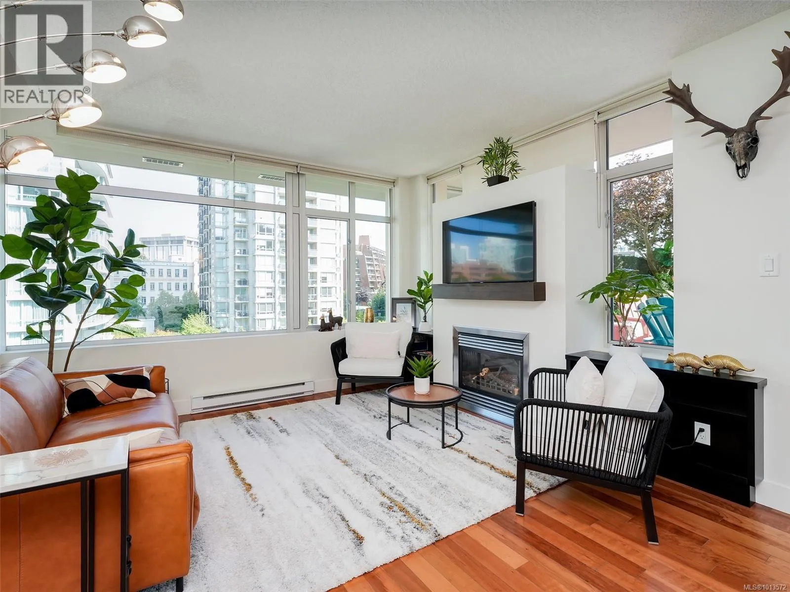 Discover refined living at Aria, one of Victoriaâs most coveted addresses in the Humboldt Valley. This bright two-bedroom, two-bath corner suite is filled with natural light and features a versatile glass-enclosed sunroomâperfect as a dedicated home office, yoga space, or creative studio. A completely private 226 sq. ft. garden terrace extends the living space outdoors, offering a serene urban retreat. The thoughtful floor plan separates the bedrooms, with the second enhanced by a custom Murphy bed for added flexibility. Move-in ready and tastefully appointed, this home is ideal for those seeking a balance of work and lifestyle. Residents enjoy a strong community, with concierge service, fitness centre with sauna, lounge, workshop, secure parking, and vibrant social clubs including book, walking, and craft groups. Pet-friendly with no size restrictions, Aria blends sophistication, convenience, and connection in the heart of downtown Victoria. Truly a wonderful place to call home! (id:27476)