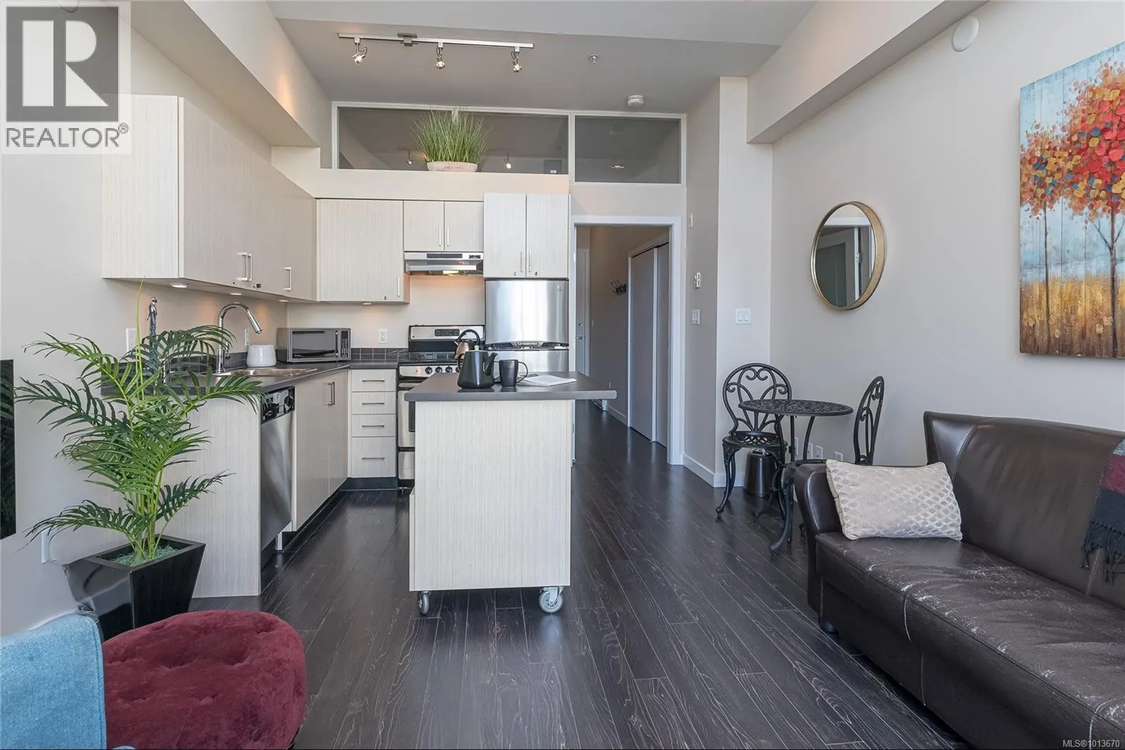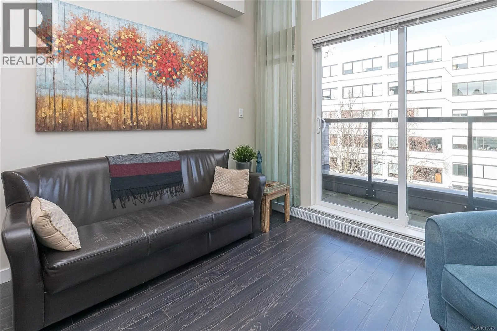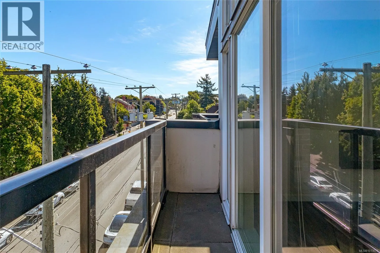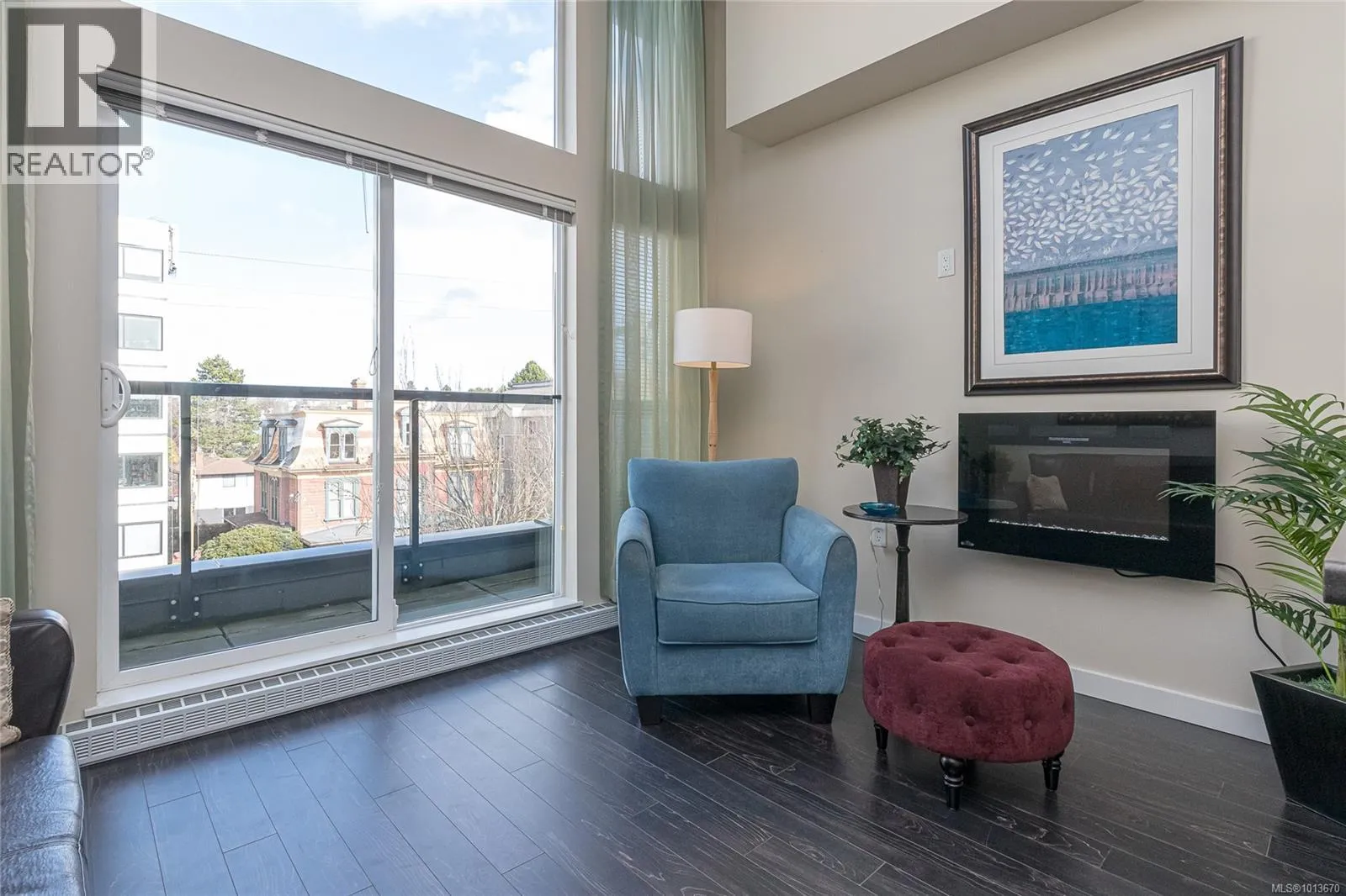 Fantastic bright one bedroom condo with city views! Unique top floor unit with 11 foot ceilings, floor to ceiling windows. Fabulous roof top deck with 360 views, lounge seating and BBQ. Access to unit is via elevator to 4th floor, opening to open air hallway and private unit entrance. Kitchen includes stainless stove, fridge, dishwasher, microwave and plenty of cupboards. Features include moveable island, electric fireplace, in unit washer and dryer, blinds and sliding glass door to balcony.''The Zen'' building is zoned CA-2 allowing for many options for use - residential home, home/office combination or professional office space. Rentals and pets allowed. Walk score of 100 and close to Cook Street Village, Downtown and all amenities, cafes and restaurants. Unmatched convenience close to downtown yet removed from the congestion. Convenient front door transit access and many parking options including abundant free and pay parking in close proximity. Secure entrance and bike storage. (id:27476)