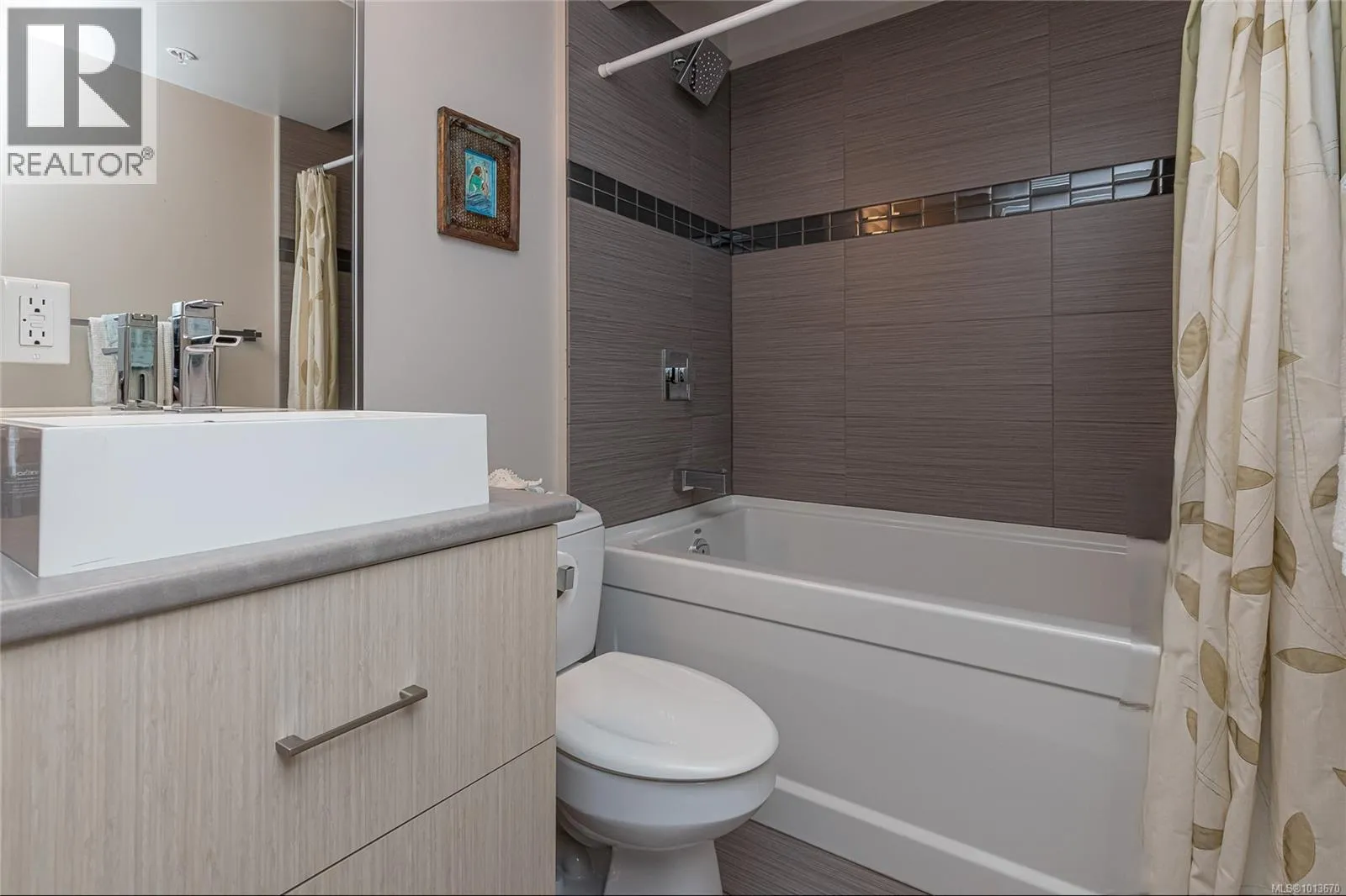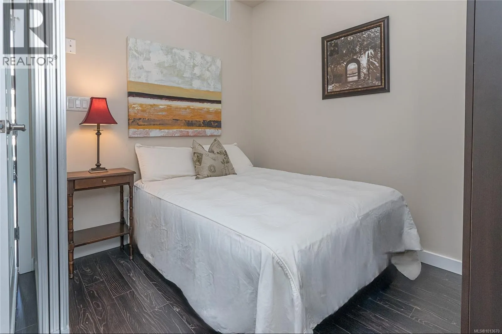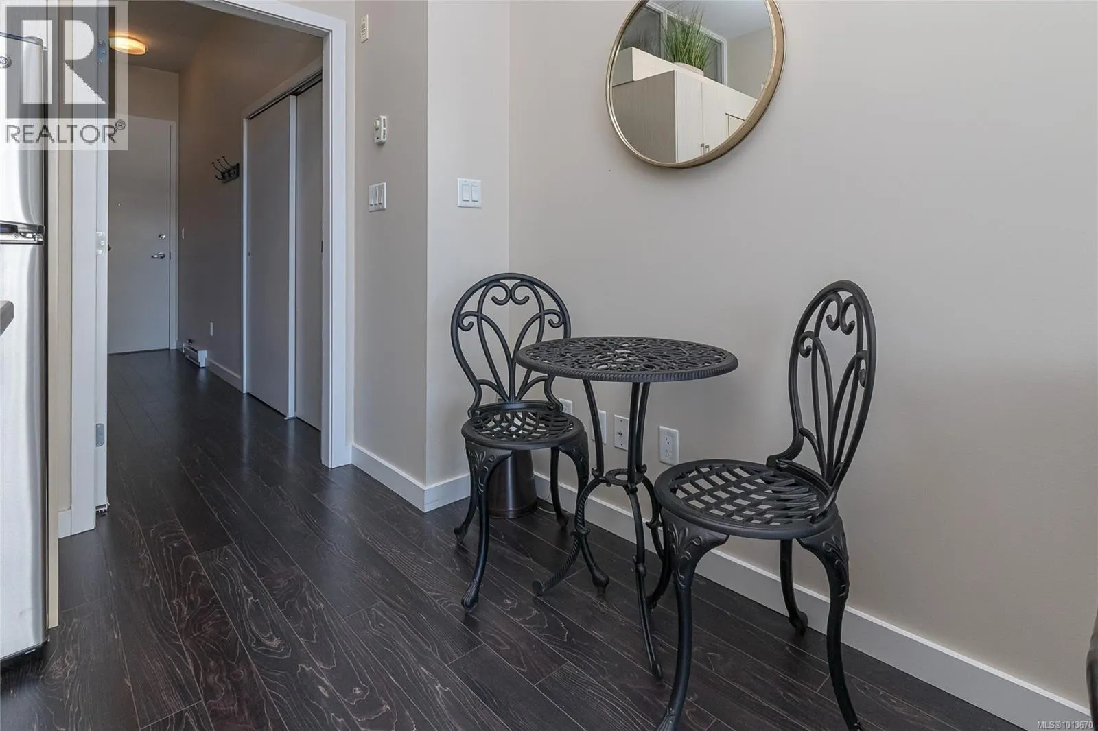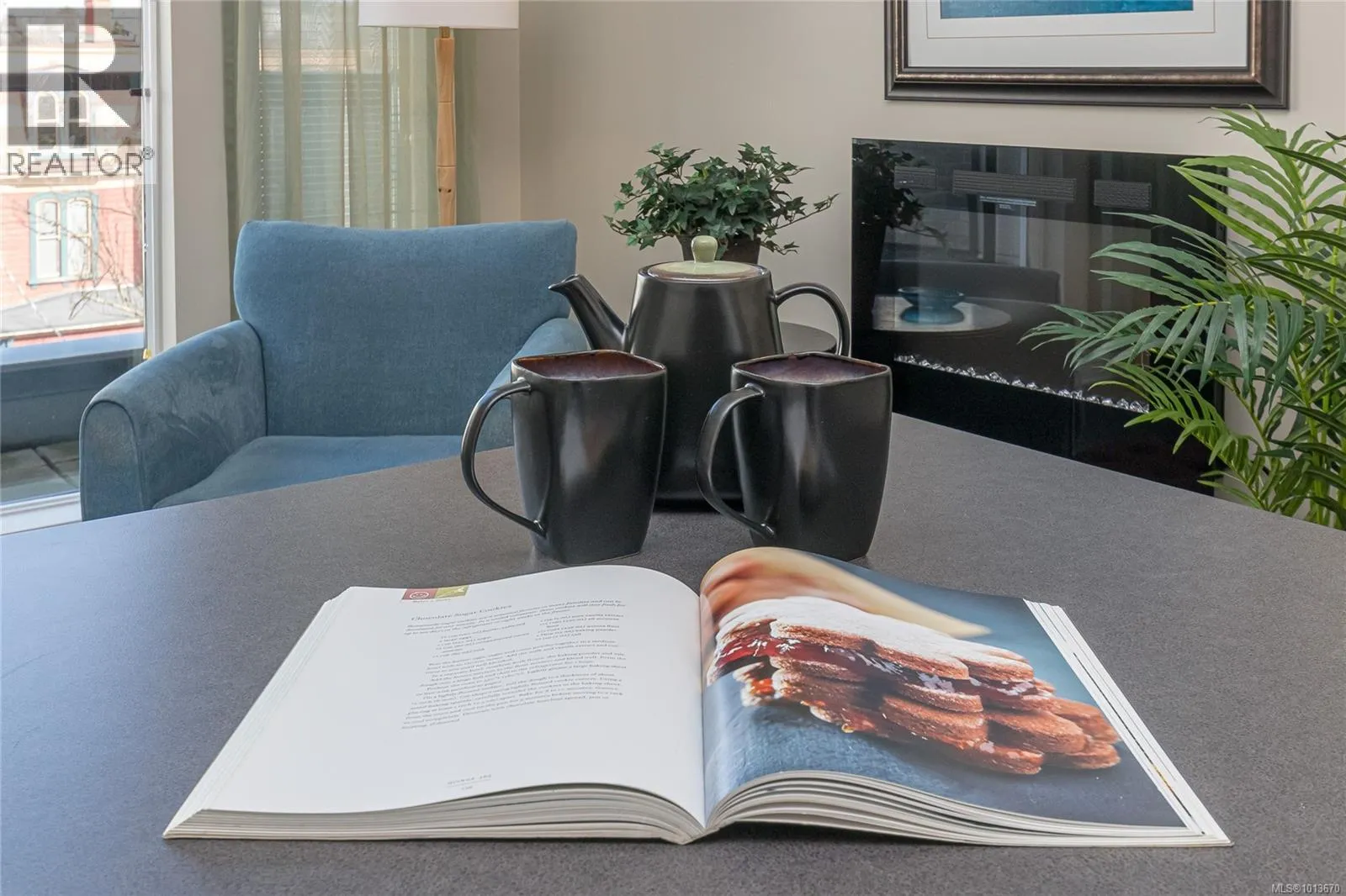 Fantastic bright one bedroom condo with city views! Unique top floor unit with 11 foot ceilings, floor to ceiling windows. Fabulous roof top deck with 360 views, lounge seating and BBQ. Access to unit is via elevator to 4th floor, opening to open air hallway and private unit entrance. Kitchen includes stainless stove, fridge, dishwasher, microwave and plenty of cupboards. Features include moveable island, electric fireplace, in unit washer and dryer, blinds and sliding glass door to balcony.''The Zen'' building is zoned CA-2 allowing for many options for use - residential home, home/office combination or professional office space. Rentals and pets allowed. Walk score of 100 and close to Cook Street Village, Downtown and all amenities, cafes and restaurants. Unmatched convenience close to downtown yet removed from the congestion. Convenient front door transit access and many parking options including abundant free and pay parking in close proximity. Secure entrance and bike storage. (id:27476)