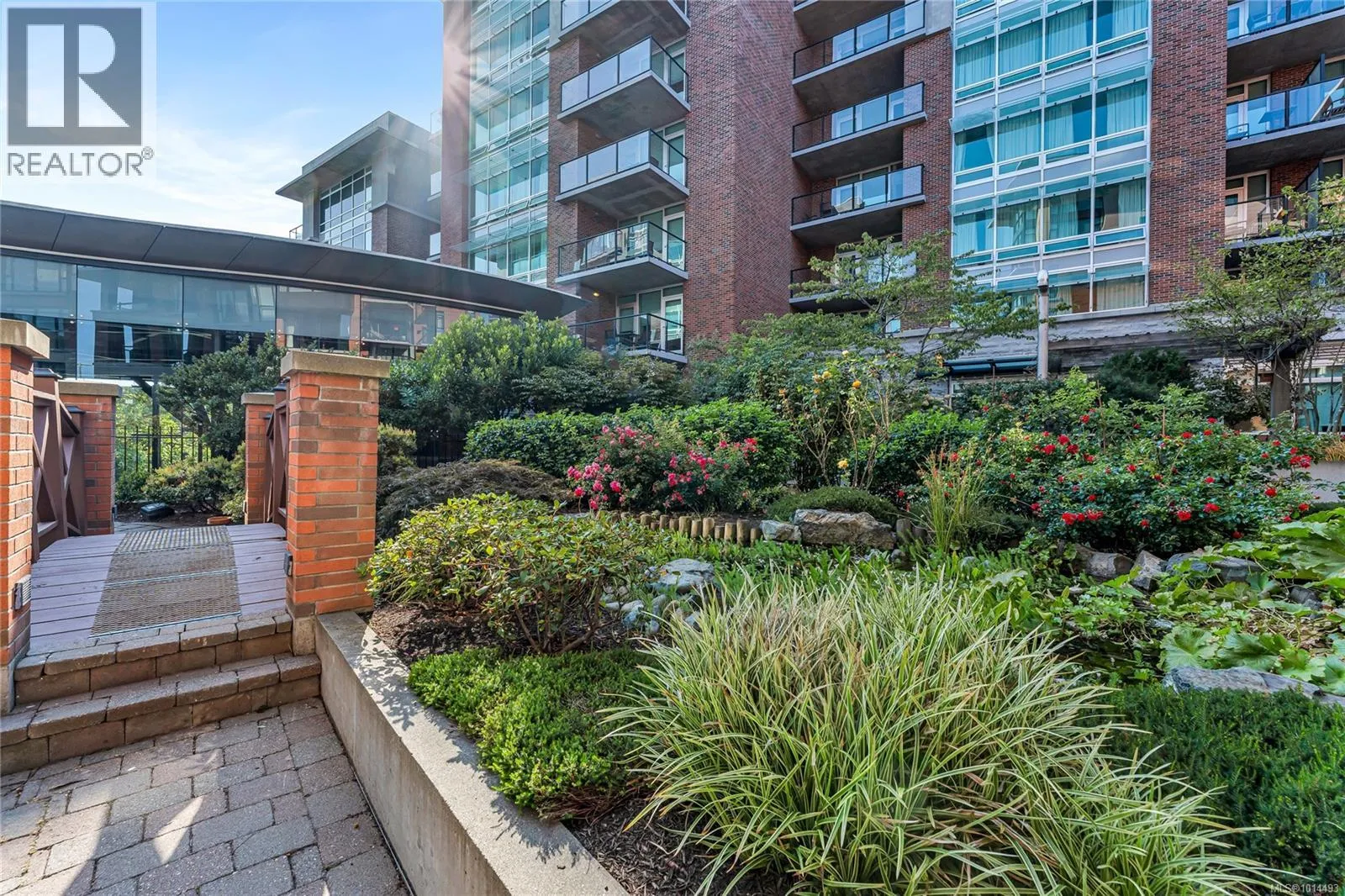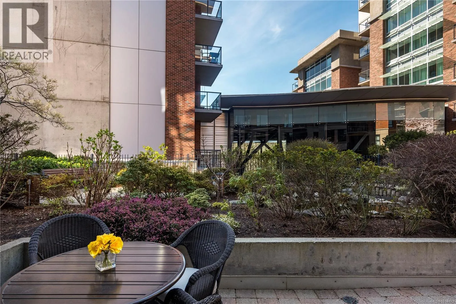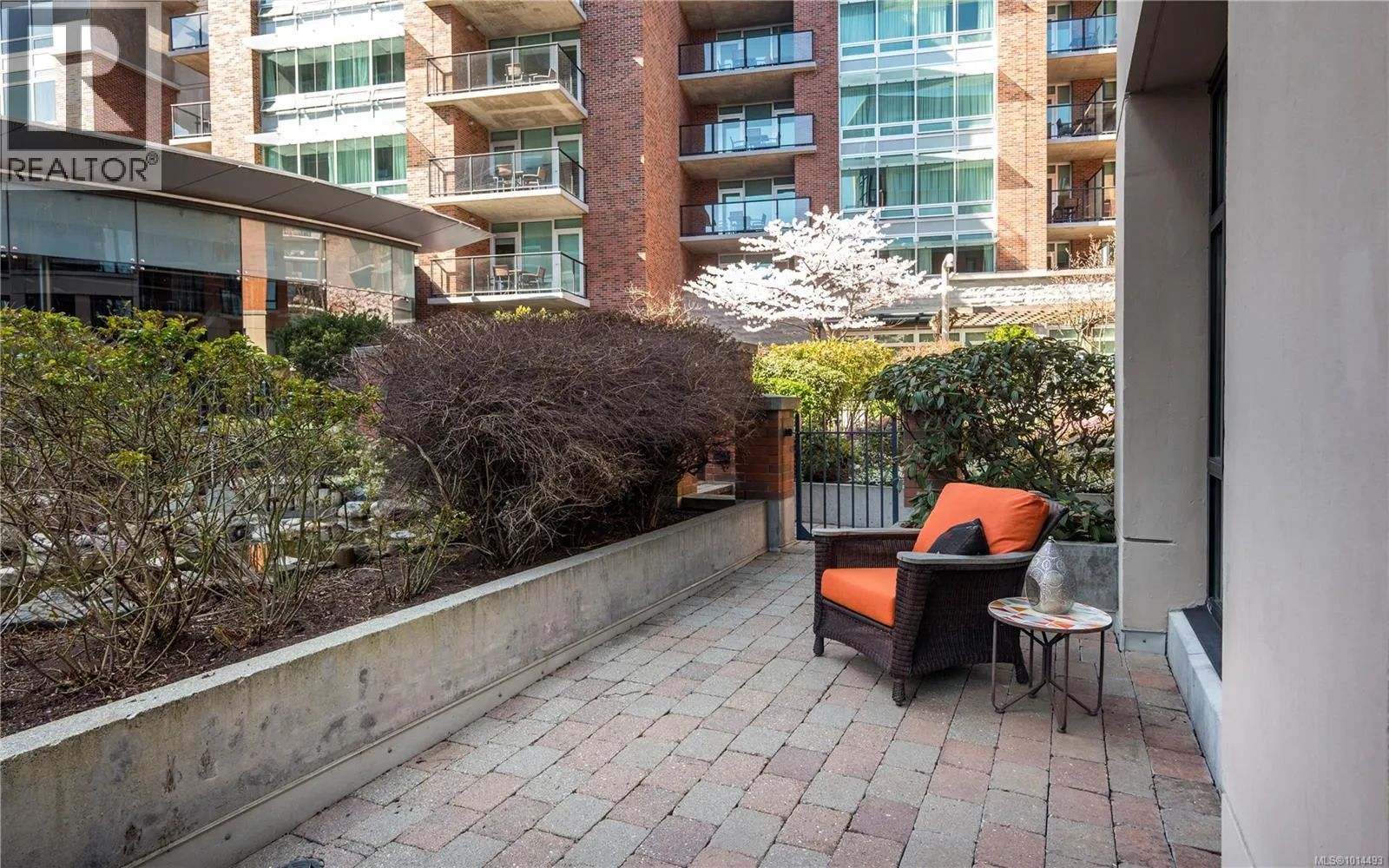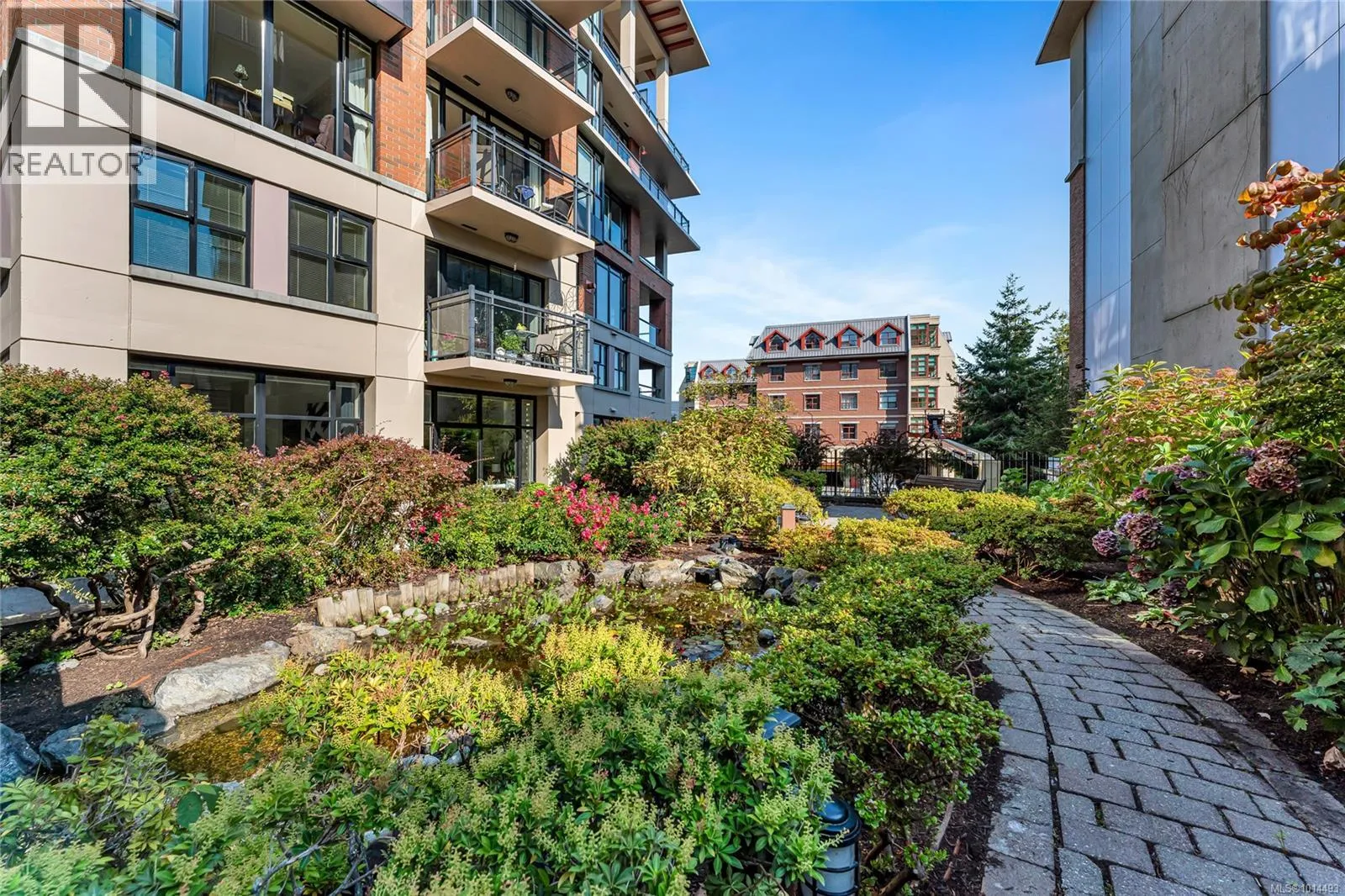Discover an extraordinary blend of space, light, and tranquillity in Victoriaâs sought-after Humboldt Valley, bordering Fairfield and just steps to Beacon Hill Park, St. Annâs Academy, Cook St Village, and the Inner Harbour. This ground-level residence feels more like a private townhome, with soaring 9â9â ceilings, an open layout, and a seamless flow to the outdoors. The true centrepiece is an impressive 23'7'' x 8'6â south-facing patio that extends into beautifully landscaped courtyard gardens. Sun-drenched and sheltered, this outdoor retreat becomes an extension of your living space - perfect for morning coffee, entertaining, or unwinding in peace. Surrounded by greenery, it offers a rare garden connection that few condominiums can match, blending the ease of condo living with the serenity of a private yard. Inside, the two-bedroom, two-bathroom layout is bright and thoughtfully designed. Floor-to-ceiling windows in the primary suite bring the gardens indoors, while the ensuite bath provides a private retreat. A modern kitchen anchors the living space, complemented by an open den and generous storage. This home offers true one-level living with zero steps - from the front door of the building to your patio, making it ideal for those seeking to downsize without compromise, combining space, comfort, and accessibility. Located in City Place, an award-winning steel and concrete building. This residence provides both elegance and peace of mind with secure underground parking (including EV charger), bike storage, and a separate locker. The building welcomes pets, including up to two dogs, and rentals are permitted, offering flexibility and long-term value. A rare offering that balances the calm of a garden sanctuary with the quality and security of concrete construction. (id:27476)