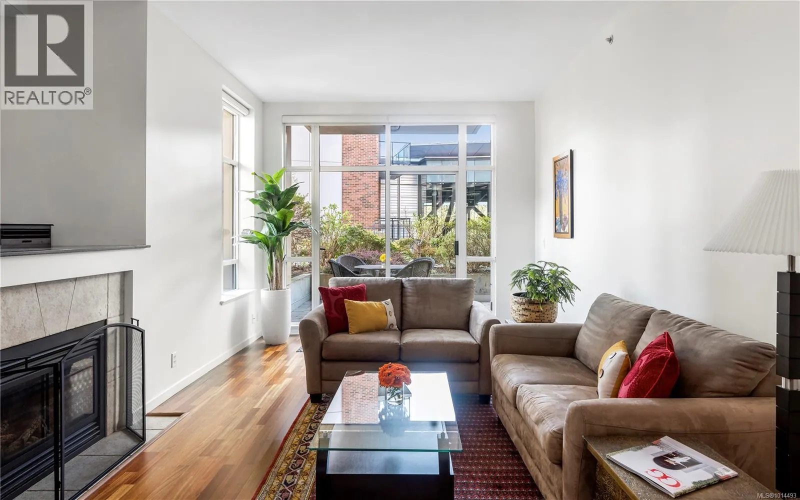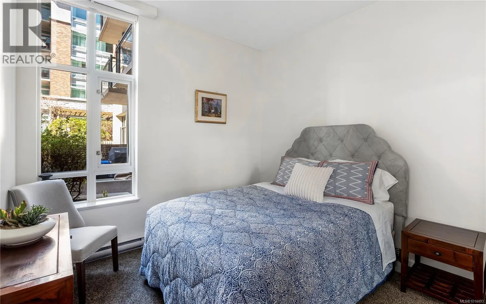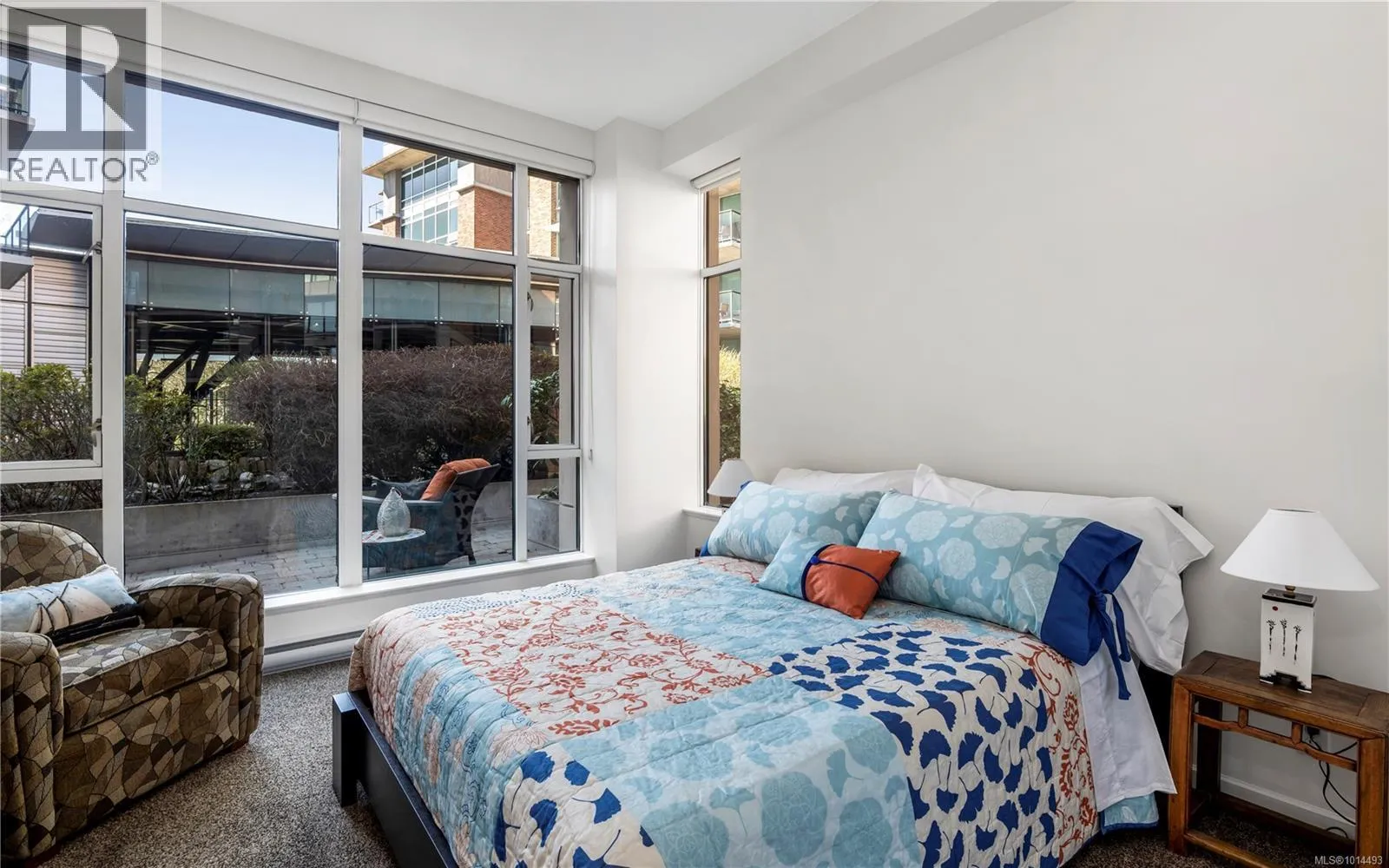 Discover an extraordinary blend of space, light, and tranquillity in Victoriaâs sought-after Humboldt Valley, bordering Fairfield and just steps to Beacon Hill Park, St. Annâs Academy, Cook St Village, and the Inner Harbour. This ground-level residence feels more like a private townhome, with soaring 9â9â ceilings, an open layout, and a seamless flow to the outdoors. The true centrepiece is an impressive 23'7'' x 8'6â south-facing patio that extends into beautifully landscaped courtyard gardens. Sun-drenched and sheltered, this outdoor retreat becomes an extension of your living space - perfect for morning coffee, entertaining, or unwinding in peace. Surrounded by greenery, it offers a rare garden connection that few condominiums can match, blending the ease of condo living with the serenity of a private yard. Inside, the two-bedroom, two-bathroom layout is bright and thoughtfully designed. Floor-to-ceiling windows in the primary suite bring the gardens indoors, while the ensuite bath provides a private retreat. A modern kitchen anchors the living space, complemented by an open den and generous storage. This home offers true one-level living with zero steps - from the front door of the building to your patio, making it ideal for those seeking to downsize without compromise, combining space, comfort, and accessibility. Located in City Place, an award-winning steel and concrete building. This residence provides both elegance and peace of mind with secure underground parking (including EV charger), bike storage, and a separate locker. The building welcomes pets, including up to two dogs, and rentals are permitted, offering flexibility and long-term value. A rare offering that balances the calm of a garden sanctuary with the quality and security of concrete construction. (id:27476)