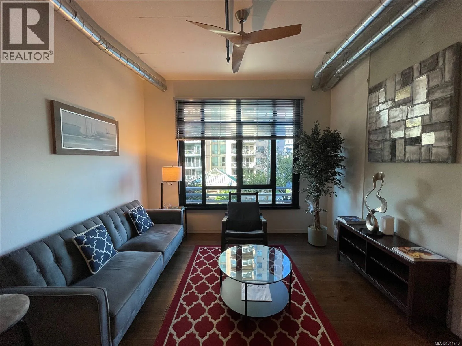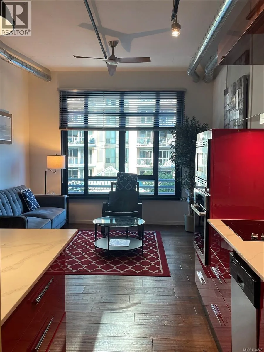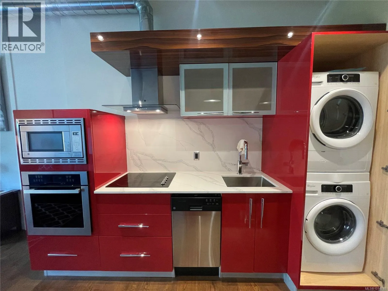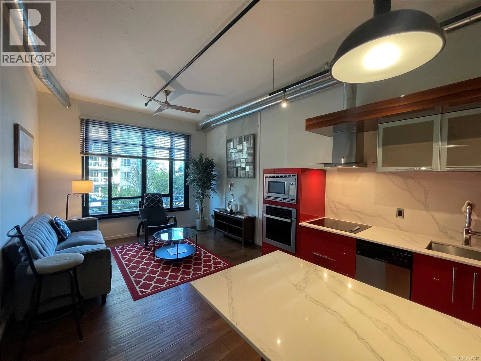 Location!!! PARKING included!!! VACANT; move in immediately!!! Welcome to Jukebox! This modern downtown 1 bed, 1 bath condo on the 3rd floor of the contemporary steel and concrete building. Large window offers great city views and plenty of natural light. The high ceiling with exposed ducts and concrete walls gives this condo an industrial look; the hardwood floors throughout, quartz countertops, custom soft closing cabinetry plus stainless kitchen appliances, decadent bathroom with ceiling rain shower head, built-in wooden ceiling fan and heating/fresh air system maintain the condo's modern style. Frosted glass sliding doors maximize the space. In-suite laundry. Free access to an expansive fitness centre on the same floor. One underground secured parking and a storage locker. Within walking distance to shops, restaurants, groceries, and the Inner Harbour. Ideal for first time buyers, investors, or those looking to downsize. Balance of 2-5-10 New Home Warranty. (id:27476)