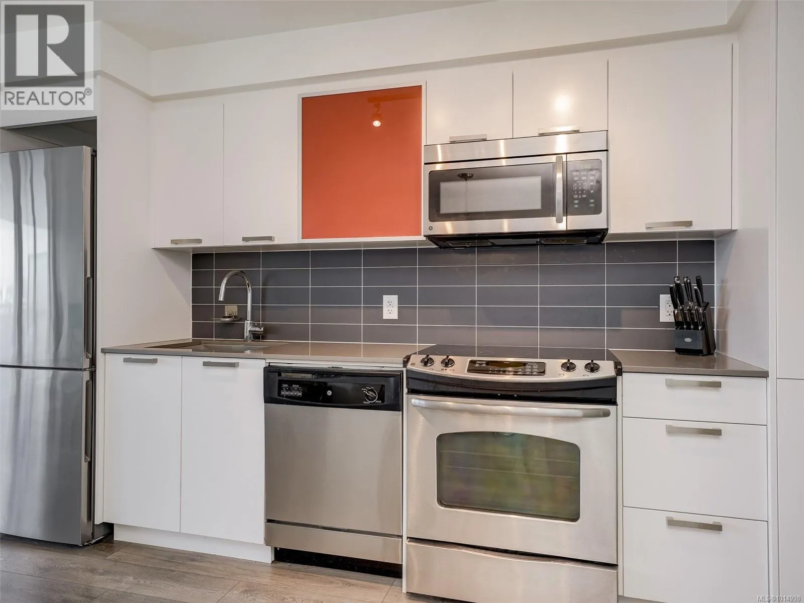 BEST VALUE IN THE BUILDING - LARGE BALCONY WITH MOUNTAIN VIEWS AND CHINA TOWN - UNDERGROUND PARKING - SEPARATE STORAGE. Situated in the heart of Chinatown this property is steps away from all amenities such as gyms, shopping, coffee shops, restaurants, the inner harbour and so much more. Boasting a modern aesthetic this condo includes an upscale kitchen with stainless steel appliances, quartz countertops, laminate flooring, floor to ceiling windows, New in-suite washer and dryer, ample storage space, 1 underground parking stall, exterior storage, and a generous private patio that looks over Chinatown. You don't want to miss taking a tour of this open concept living home. (id:27476)