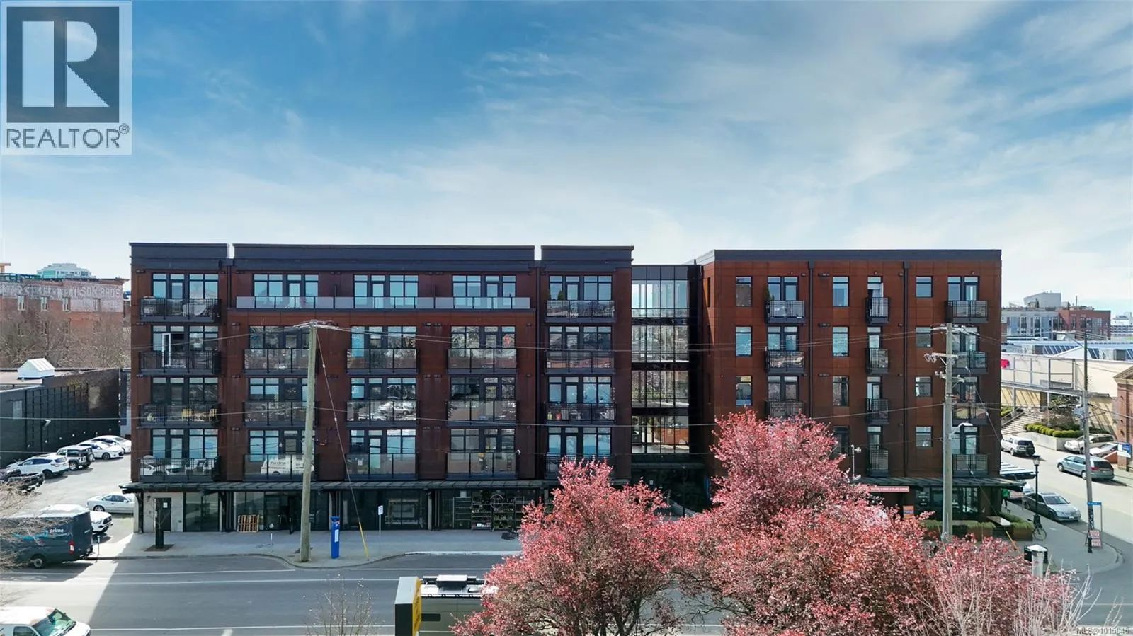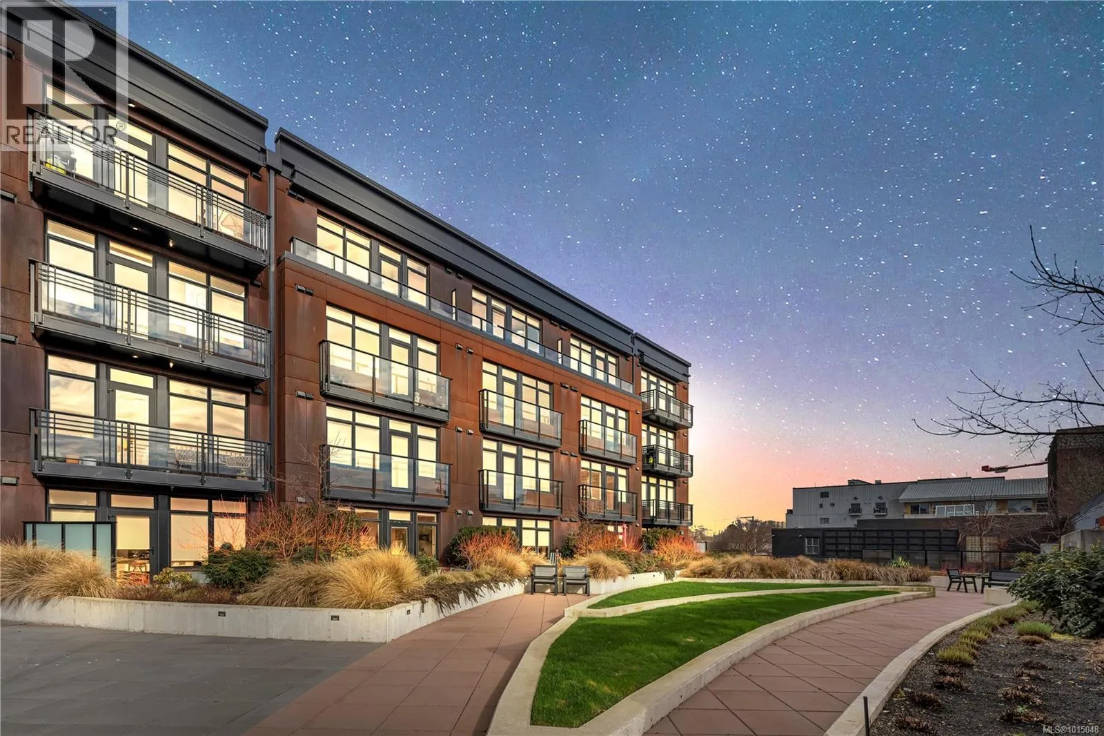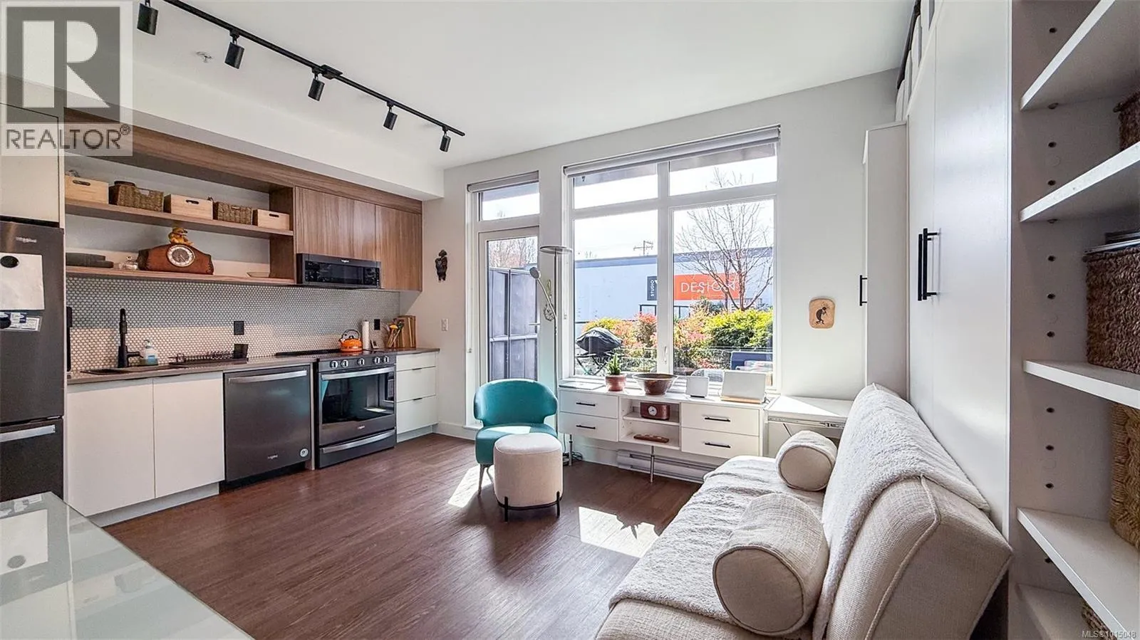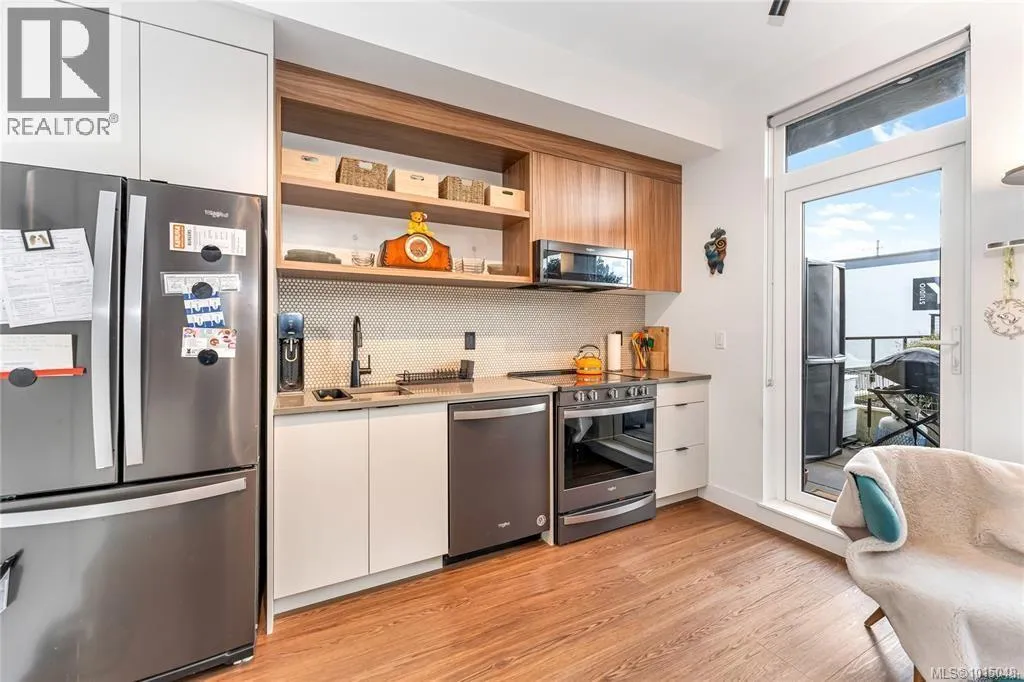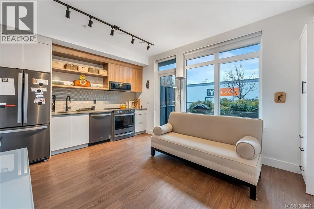 Welcome to this modern and private, end-unit suite boasting a bright and sunny elevated courtyard patio that is complete with secure underground parking at the Ironworks, in the heart of BCâs historic Capital. The combined living and dining space features a modern kitchen, incorporating premium appliances, quartz countertops, unique backsplash, dual-tone cabinetry and open shelving that blends well with the BBQ-friendly, south-facing outdoor space - perfect for small pets and faces the quiet courtyard outlaid with luscious grass and greenery to enjoy serene afternoons nestled away from the daily downtown activity. This condo has in-unit laundry, a beautiful 3 piece bathroom with contemporary matte black plumbing fixtures & a rain shower head all designed by LeFevre and Co., a local leader in Victoria Development. Steps from the city's best restaurants, cafes, shops, markets, culture venues, and nightlife making it easier to choose the lifestyle that you prefer. (id:27476)