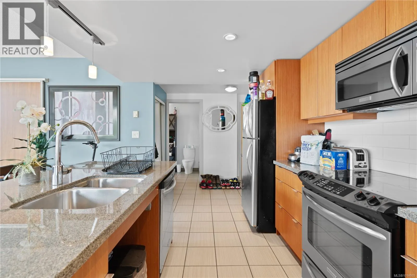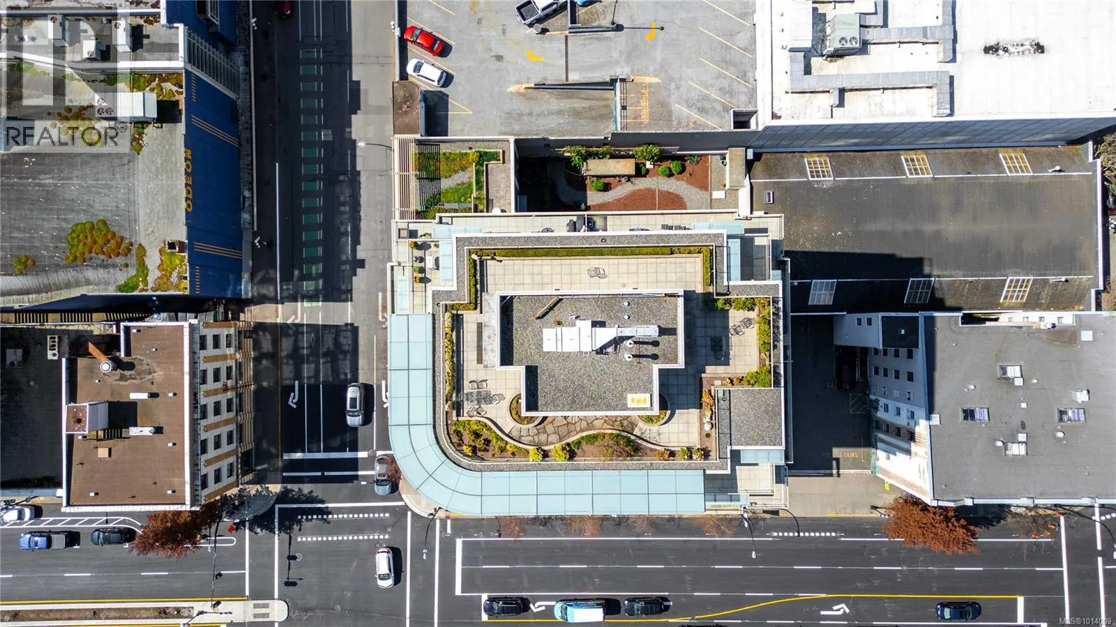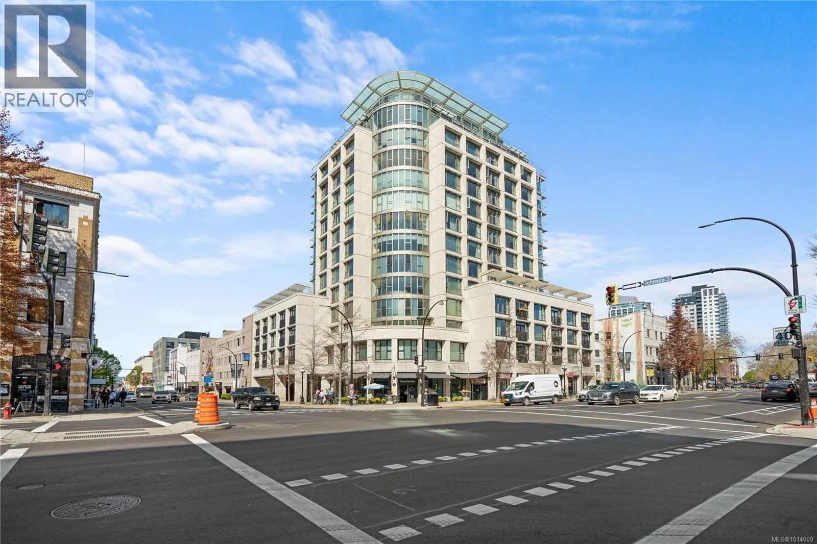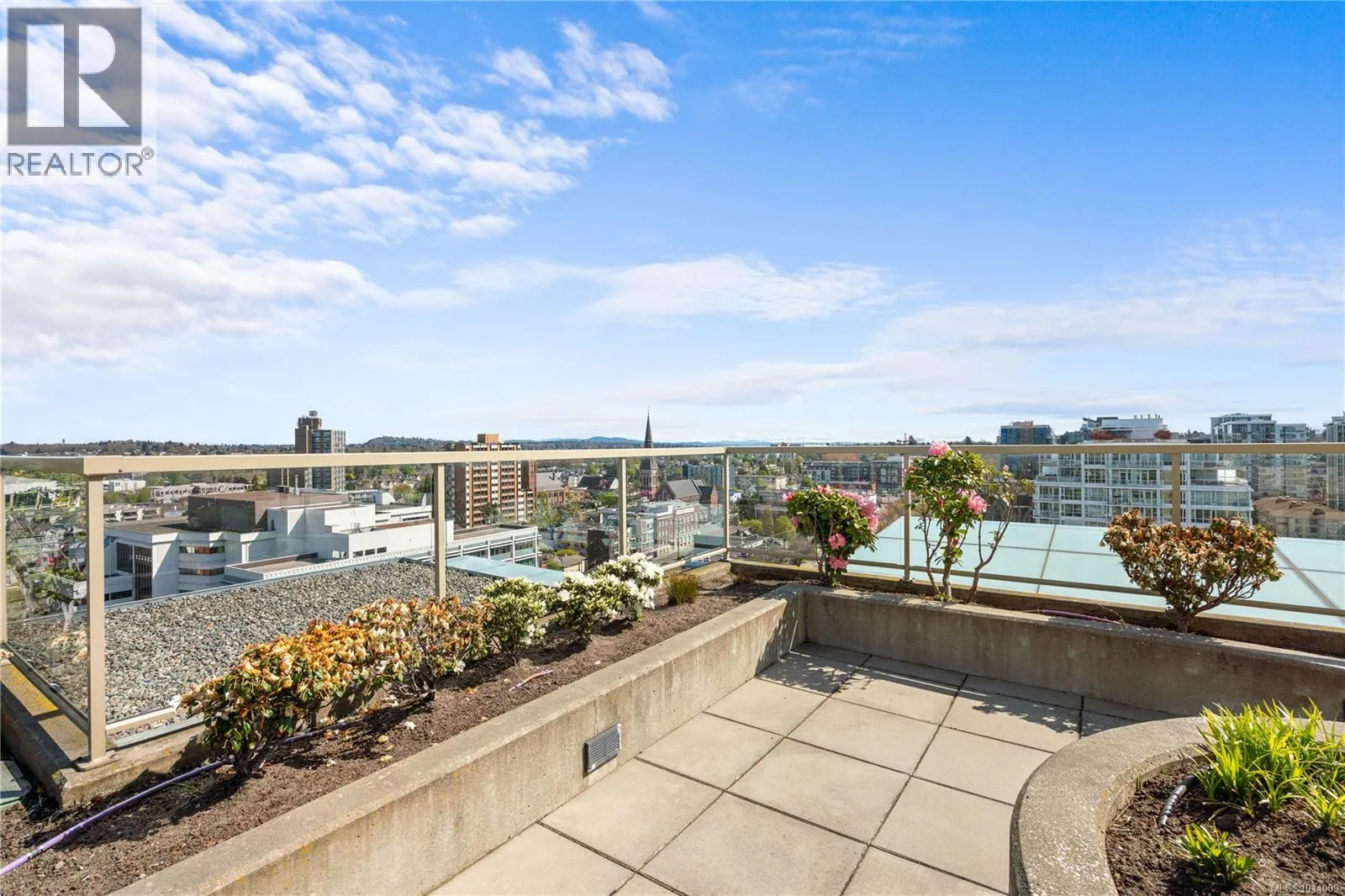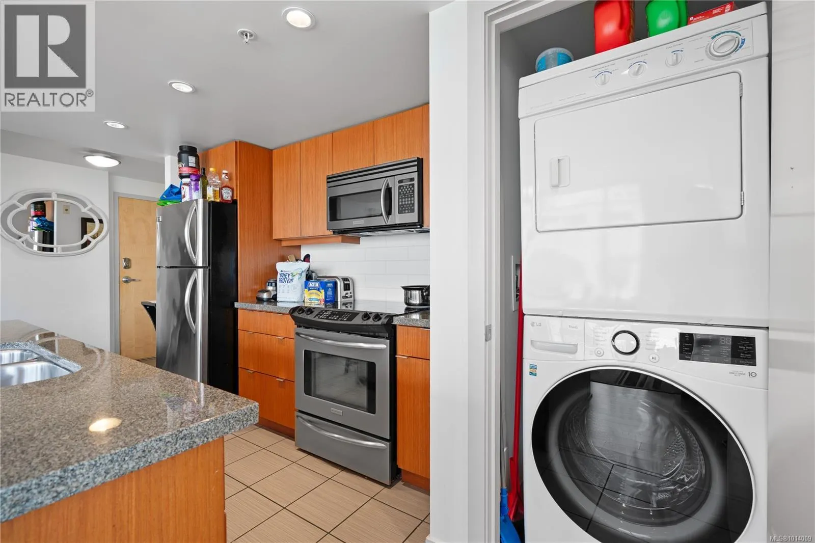 Welcome to a bright 2-bed, 1-bath condo in The Juliet, a sought-after steel and concrete building in the heart of Victoria. The floor-to-ceiling windows offer sweeping views of the city, which fill the space with natural light. The modern kitchen features ss appliances, quartz counters, a bi-level island with breakfast bar, and sleek bamboo flooring throughout. The primary bedroom includes its own access to the 4-piece bathroom. Step out onto your covered balcony, perfect for enjoying your morning coffee. This unit also features in-suite laundry, 1 secure parking stall, & bike storage. This building includes an expansive rooftop terrace, complete with a zen garden and bbq area, that wraps around the entire building showcasing 360° views of Victoria. Located steps from cafes, restaurants, shops, and everything downtown Victoria has to offer. Including an onsite caretaker and pet-friendly policies, this condo blends modern comfort with an unbeatable location. (id:27476)