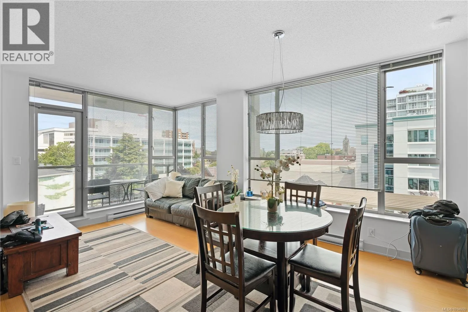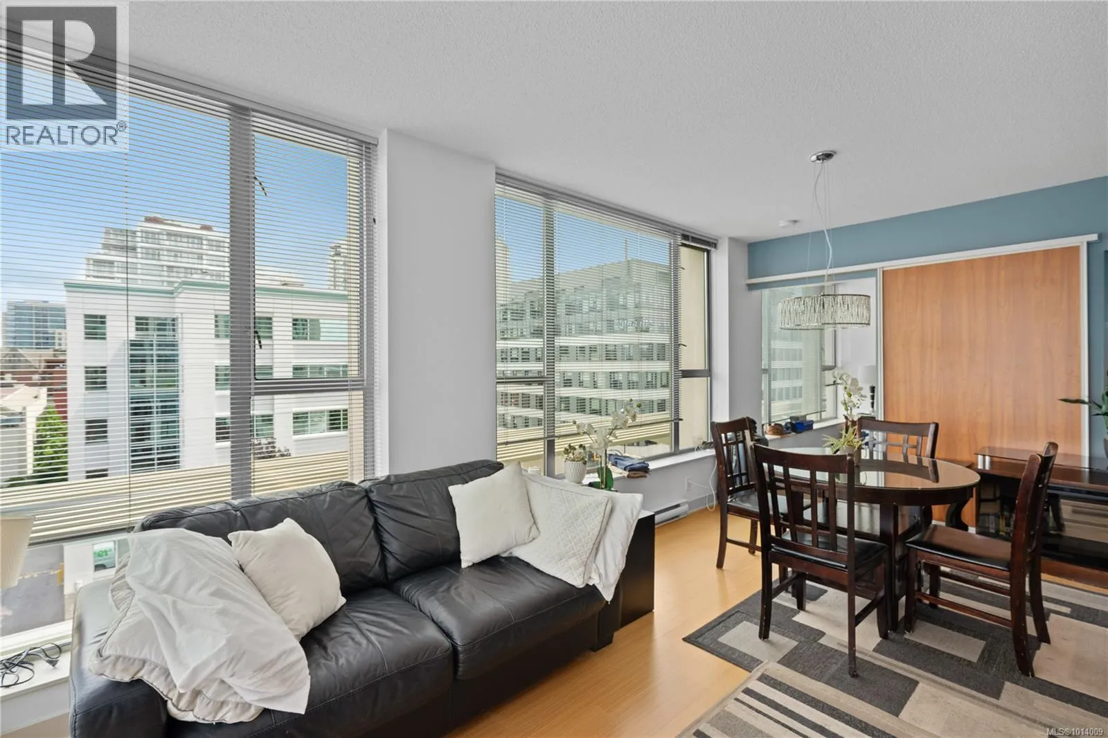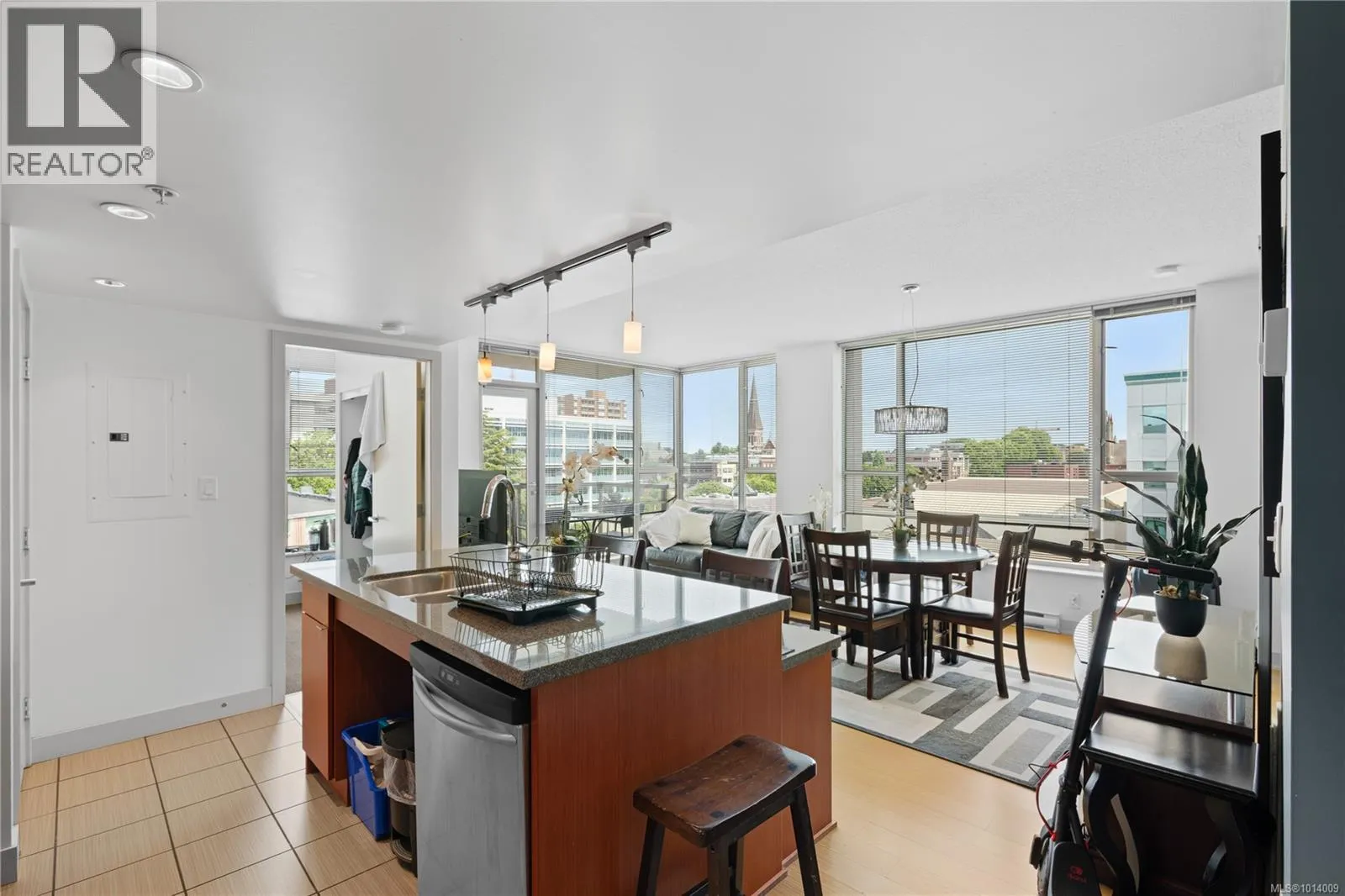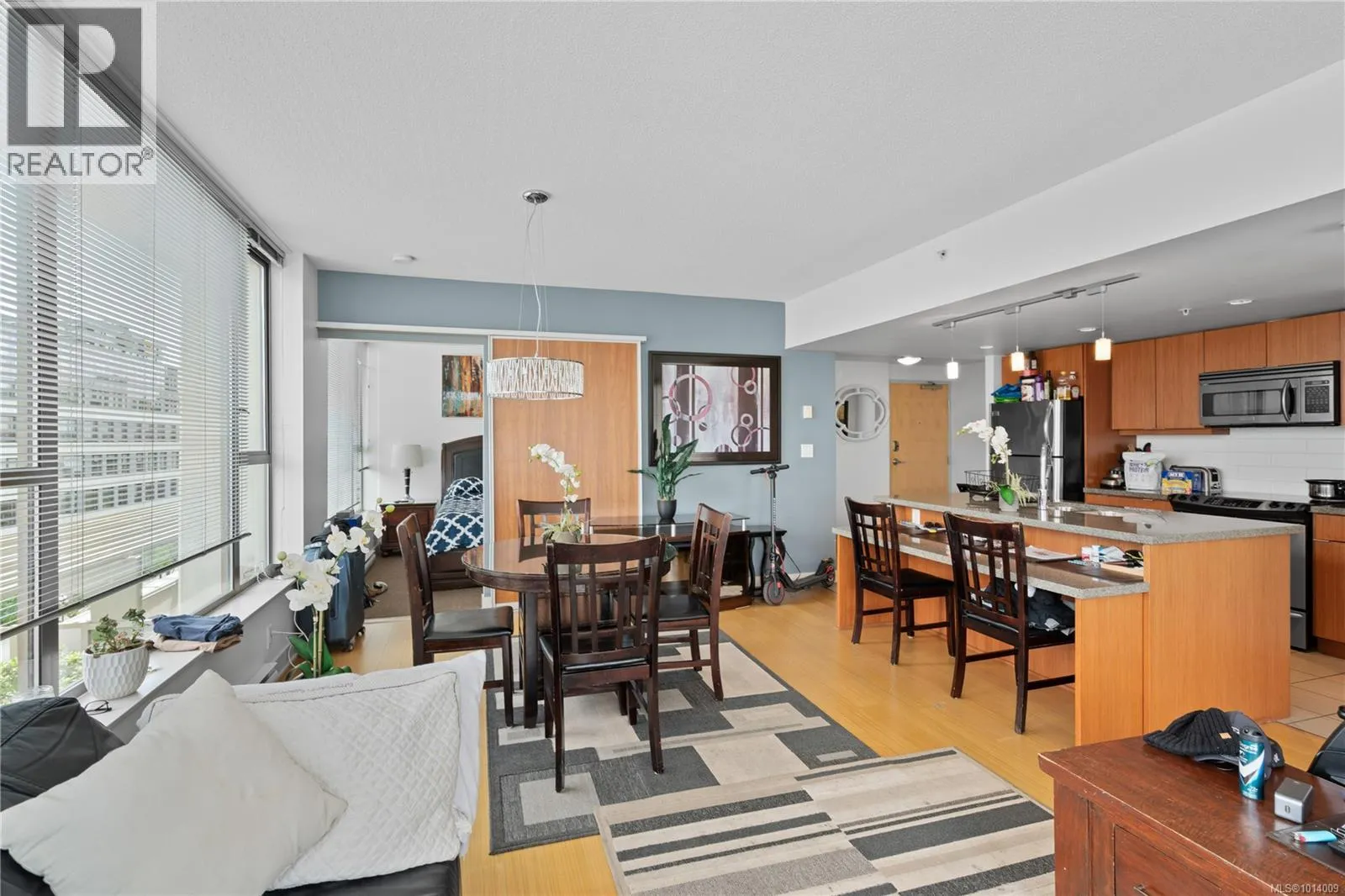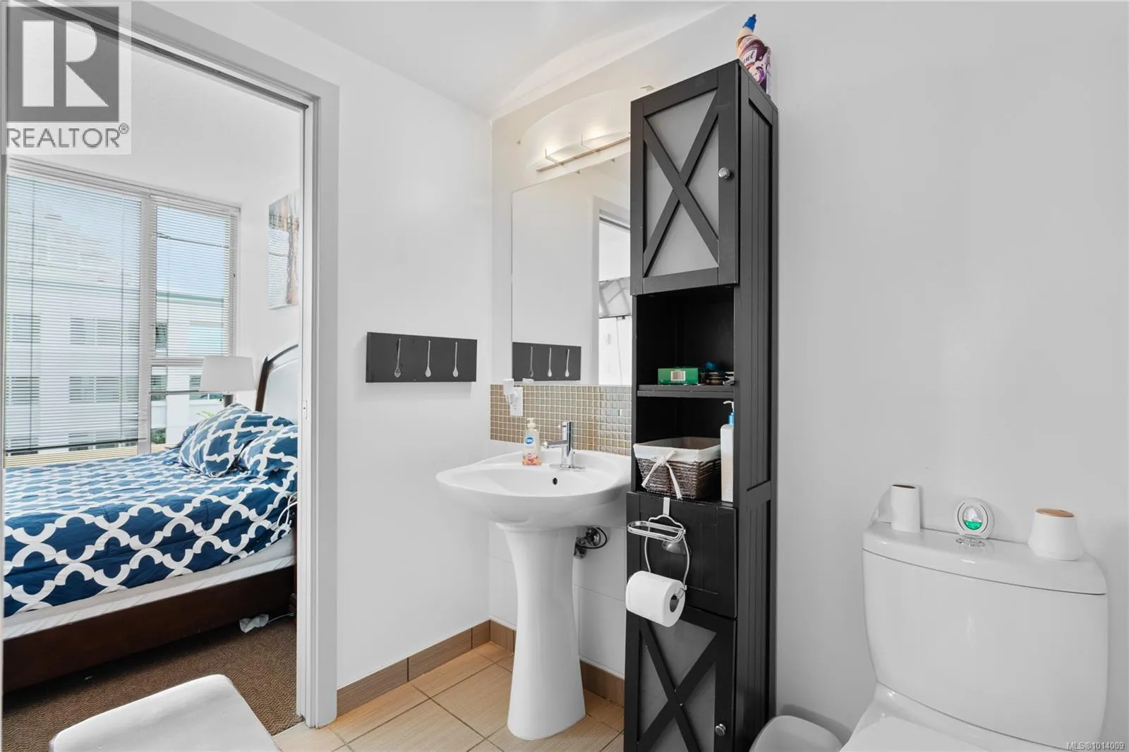 Welcome to a bright 2-bed, 1-bath condo in The Juliet, a sought-after steel and concrete building in the heart of Victoria. The floor-to-ceiling windows offer sweeping views of the city, which fill the space with natural light. The modern kitchen features ss appliances, quartz counters, a bi-level island with breakfast bar, and sleek bamboo flooring throughout. The primary bedroom includes its own access to the 4-piece bathroom. Step out onto your covered balcony, perfect for enjoying your morning coffee. This unit also features in-suite laundry, 1 secure parking stall, & bike storage. This building includes an expansive rooftop terrace, complete with a zen garden and bbq area, that wraps around the entire building showcasing 360° views of Victoria. Located steps from cafes, restaurants, shops, and everything downtown Victoria has to offer. Including an onsite caretaker and pet-friendly policies, this condo blends modern comfort with an unbeatable location. (id:27476)