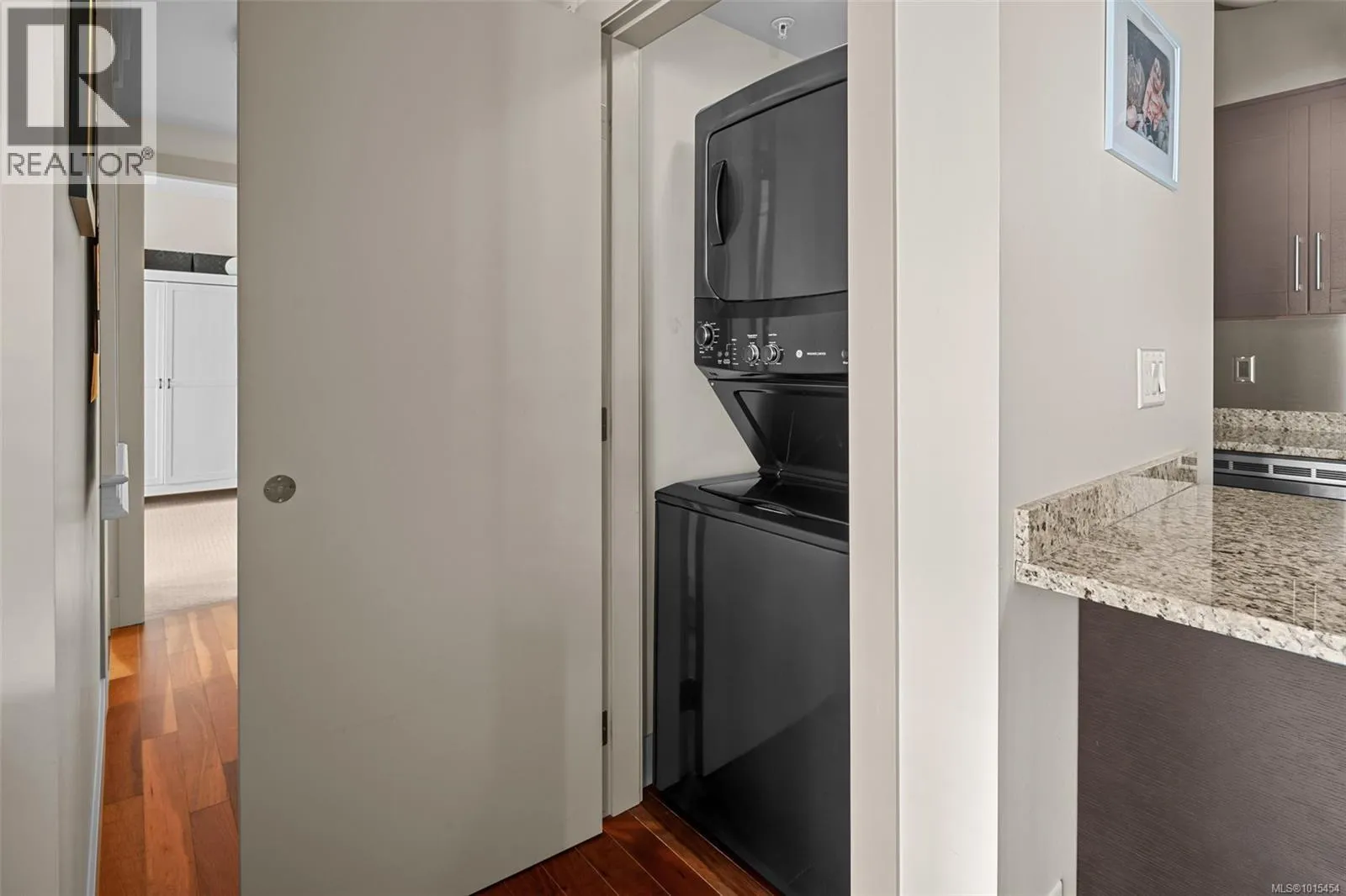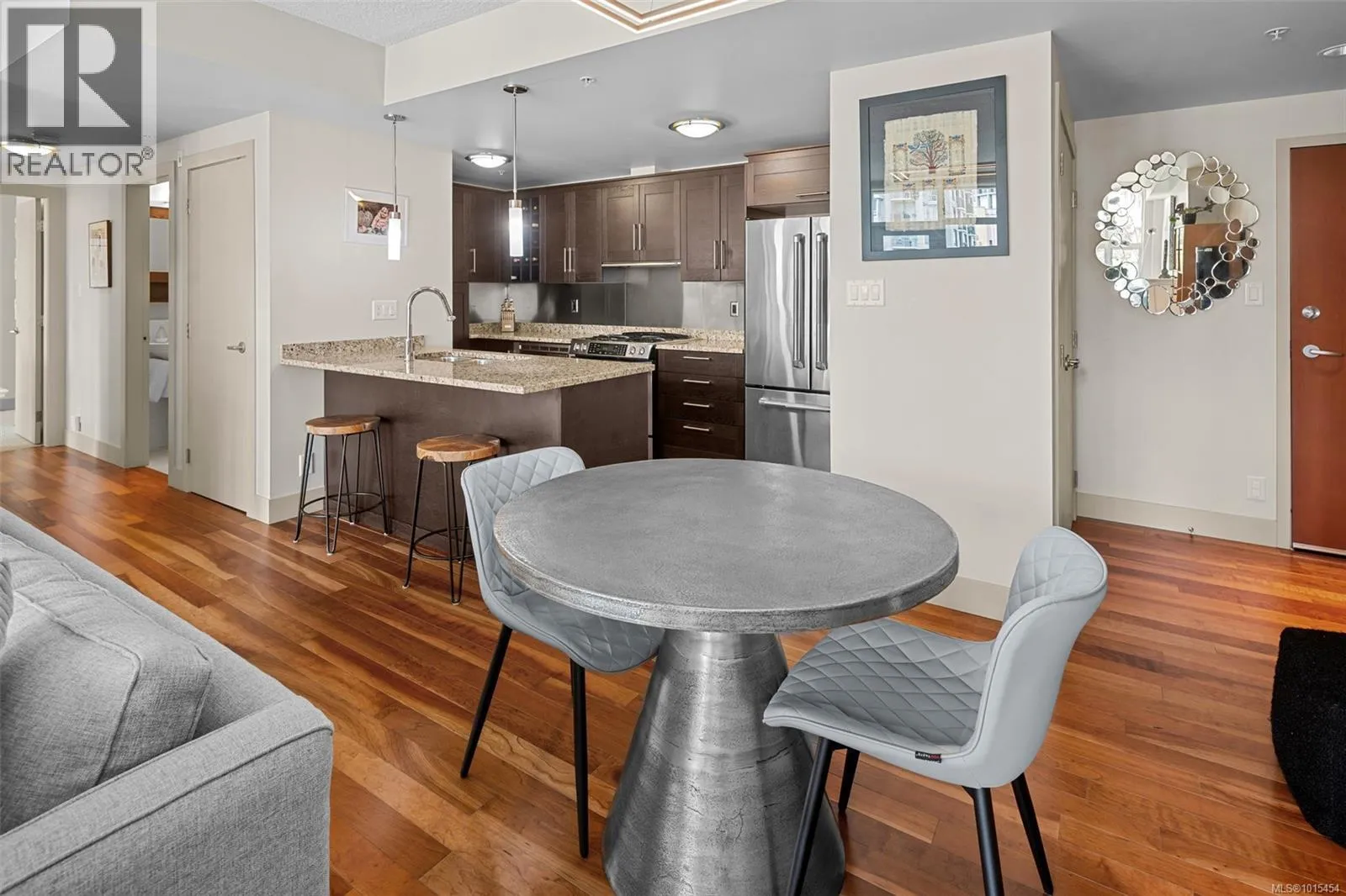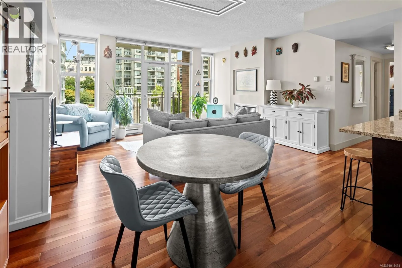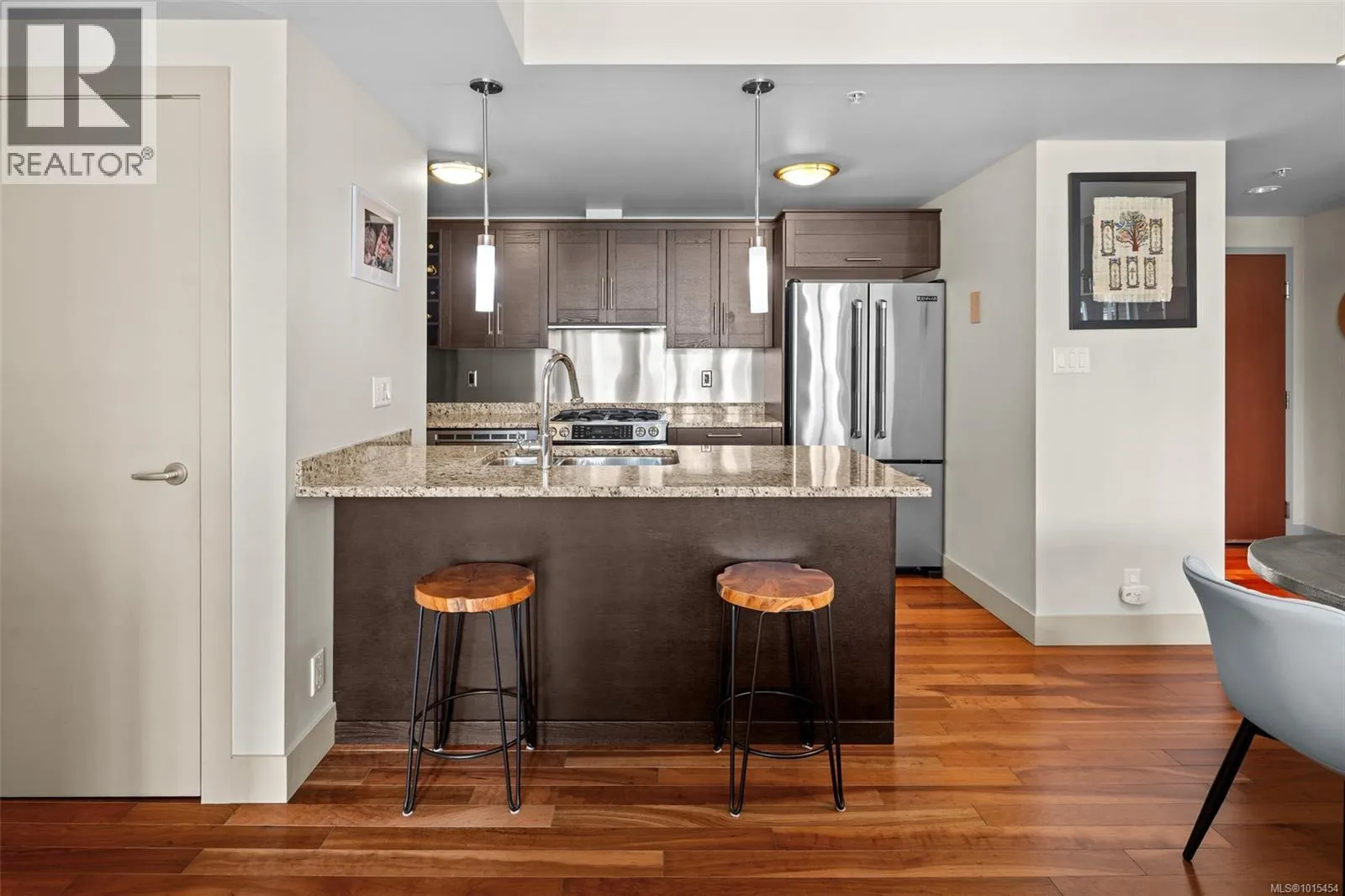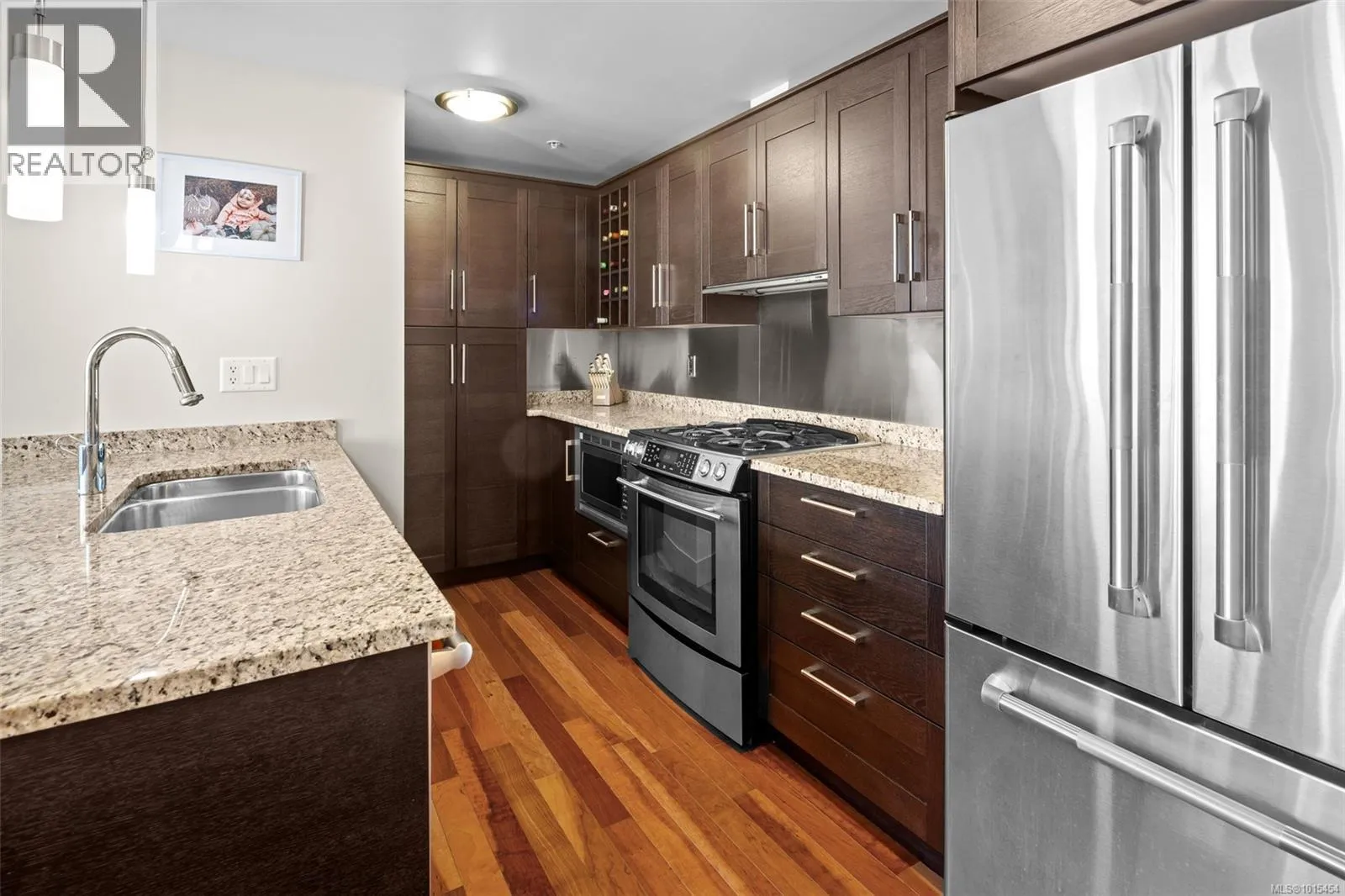 Prepare to be impressed with this meticulous luxury condo in the prestigious ARIA building. Step into a bright open floor plan showcasing gleaming engineered wood flooring, cozy gas fireplace, floor to ceiling windows framing picturesque corridor views of blue skies and elevated garden greenery. A Chefâs kitchen finished with granite countertops, richly toned cabinets, wine storage and stainless appliances including gas range. Spacious primary bedroom with accommodation space for furnishings and 4pc ensuite. Spa-inspired bathroom for guests and second bedroom. Complex amenities feature a residents lounge, fitness facility and sauna, bike storage room workshop, and underground parking. City living at its finest in the heart of the Humboldt Valley, a neighbourhood encompassing famous landmark destinations. Steps to the Inner Harbour, Beacon Hill Park, IMAX theatre, Royal BC Museum, Parliament Buildings, Restaurants, Entertainment and Shopping. (id:27476)