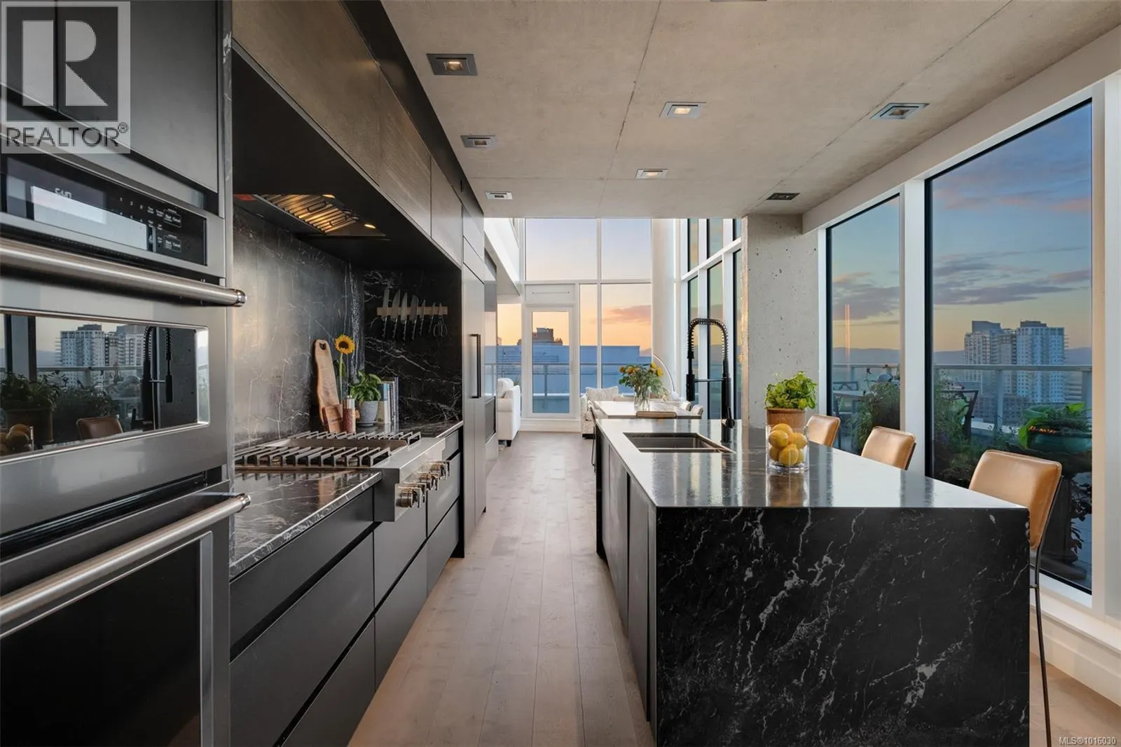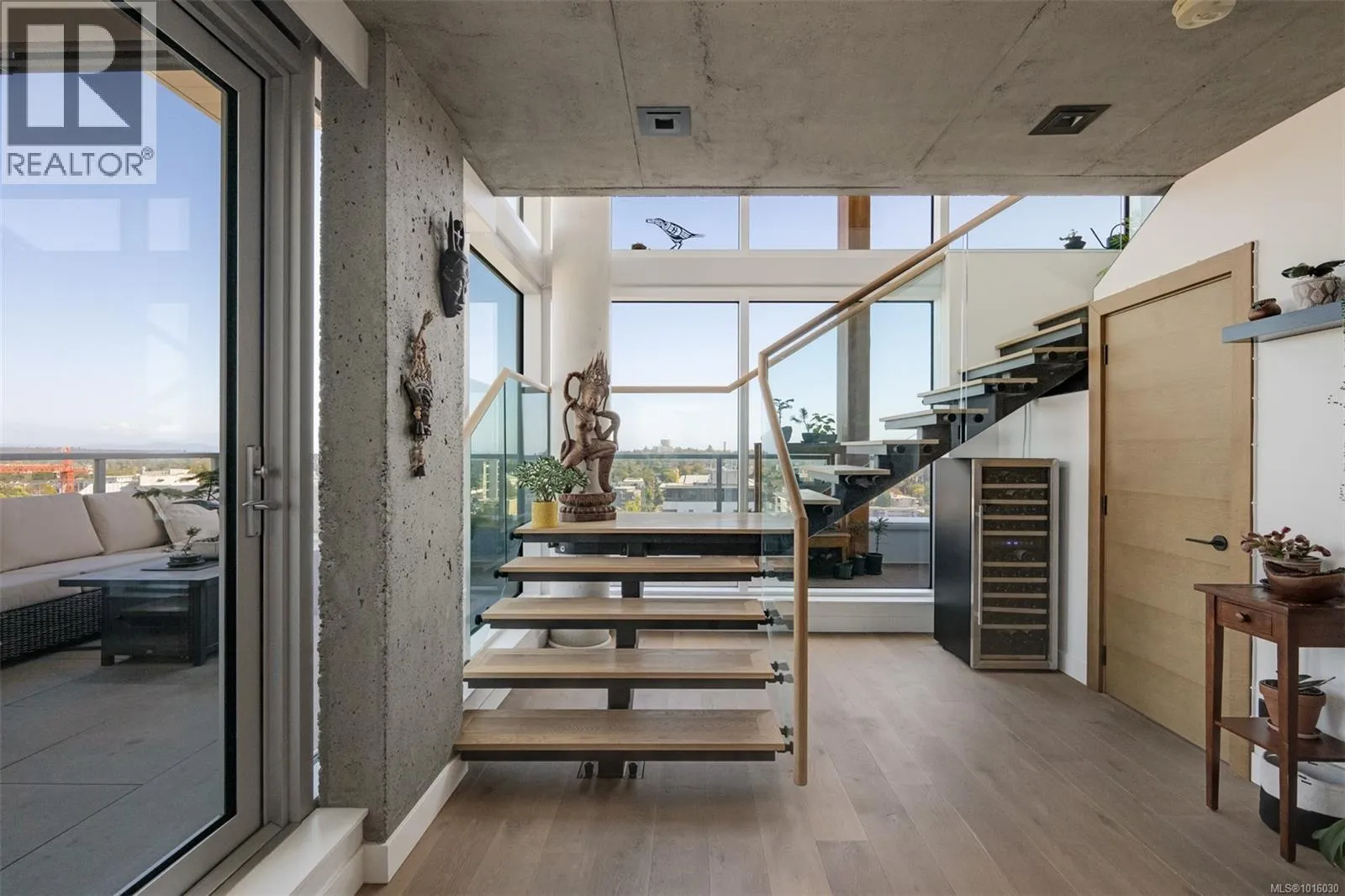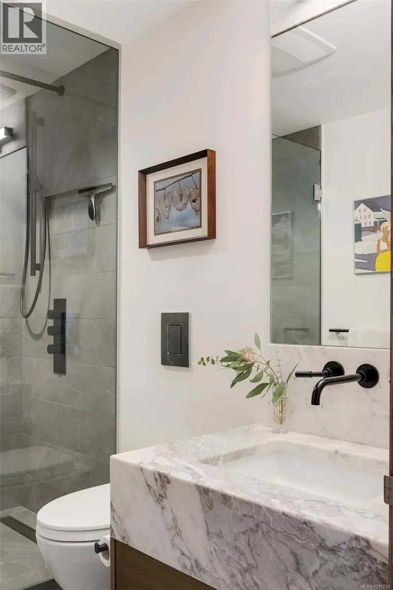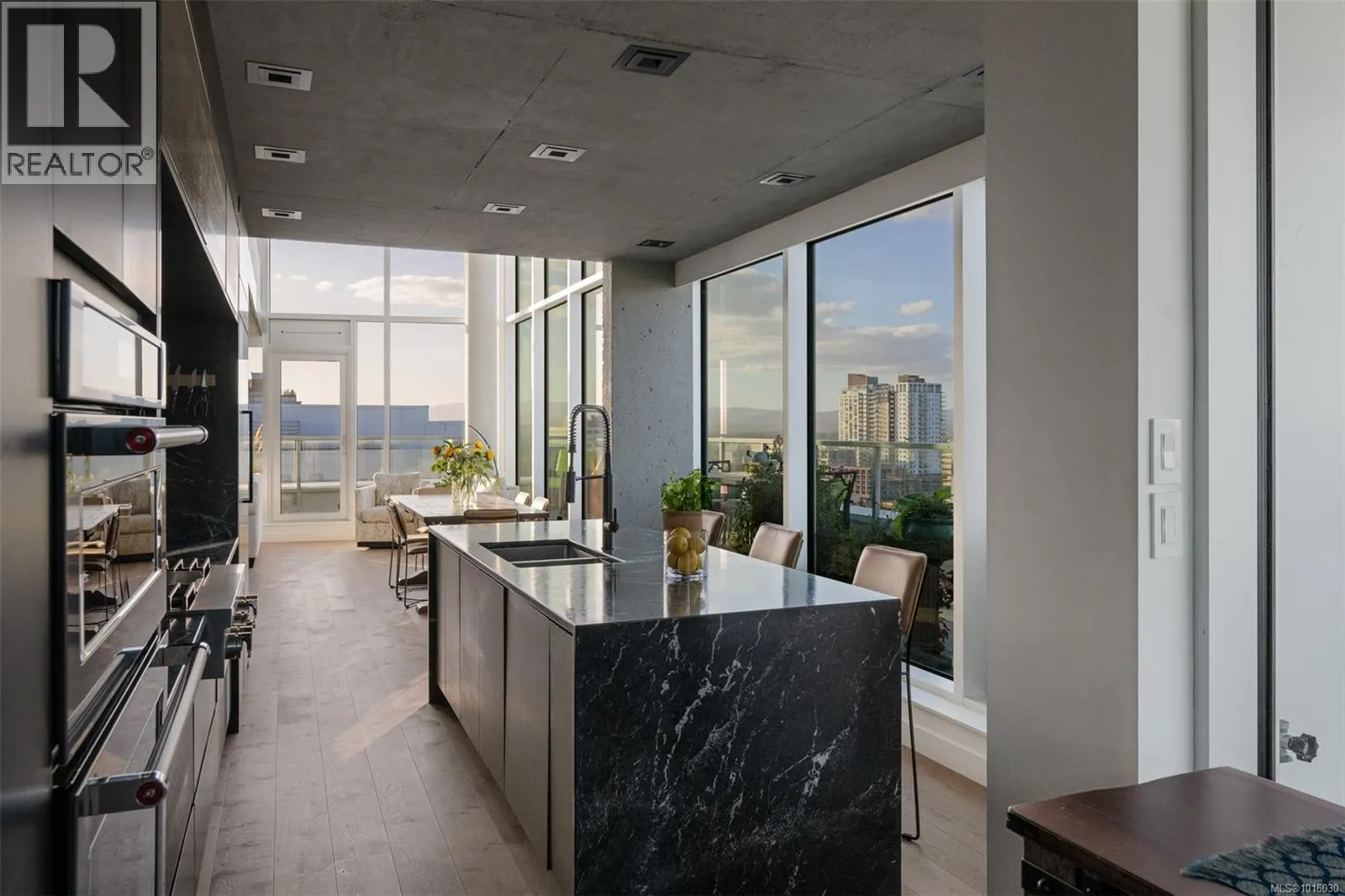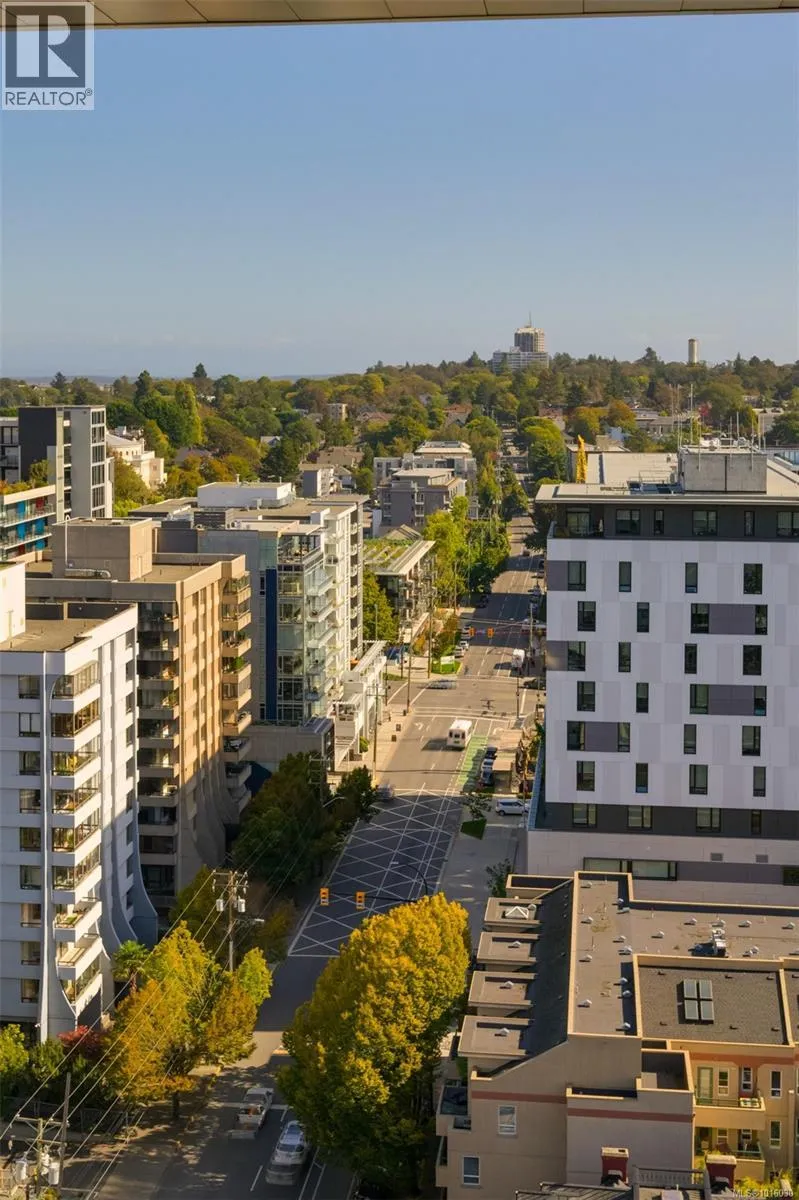 Discover the ultimate penthouse lifestyle at 989 Johnson St in downtown Victoria. This stunning steel and concrete home spans 1,800 sqft over two levels with 17.5-ft ceilings. Floor-to-ceiling windows fill the space with natural light. The kitchen flows seamlessly into the open-concept living area, perfect for hosting or unwinding. Enjoy 270-degree views of mountains, ocean, and city, with three patios to take it all in, including two covered east-facing decks with electric blinds and water/gas hookups. High-end finishes and warm wood accents bring elegance to the industrial style, complementing three bedrooms and baths. The primary bedroom suite, complete with a luxurious ensuite, sits above the family room for unparalleled views. Just steps from restaurants, spas, and downtown amenities. This pet-friendly, rentable penthouse includes two parking spots and a large private storage unit. (id:27476)