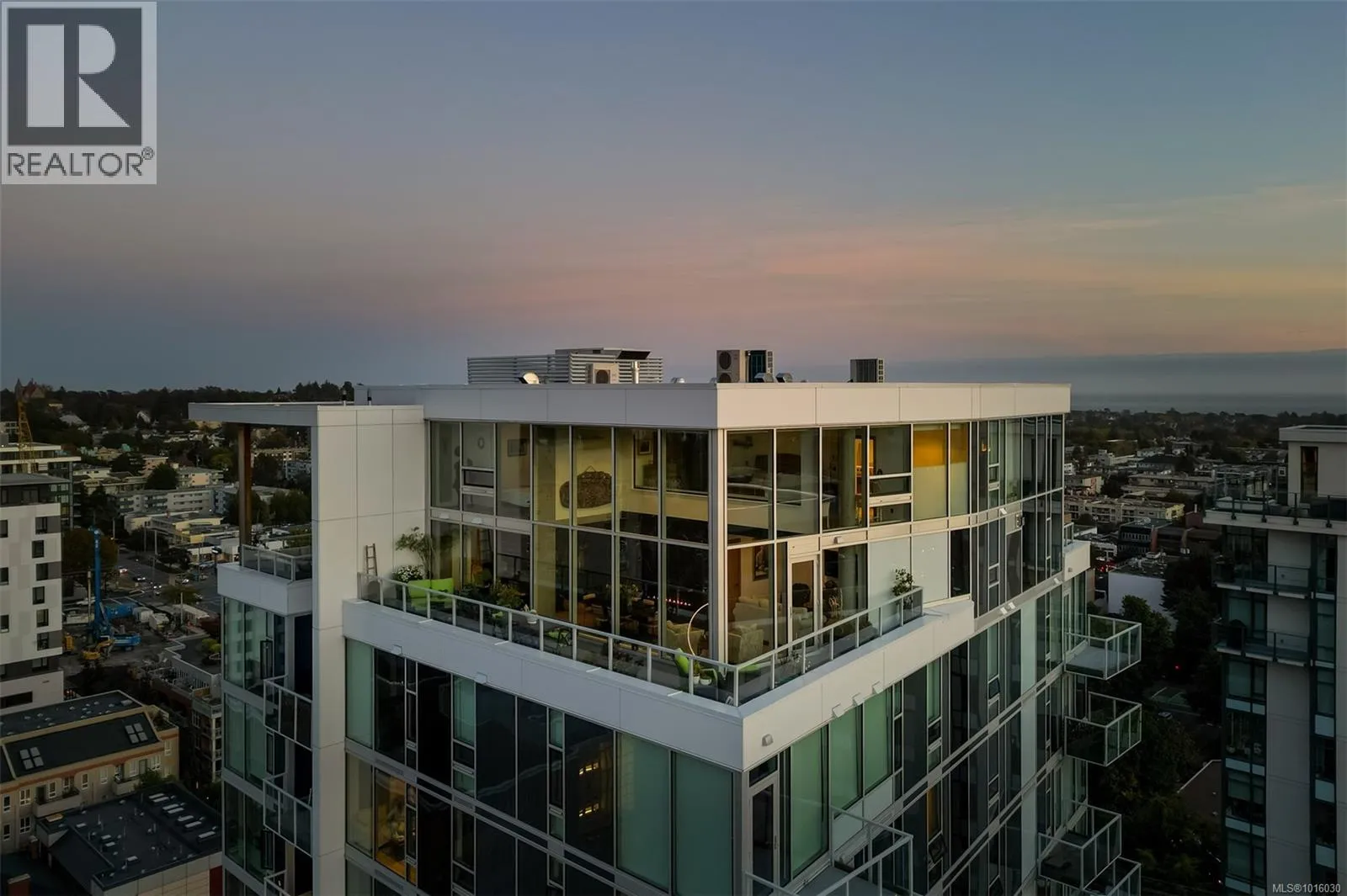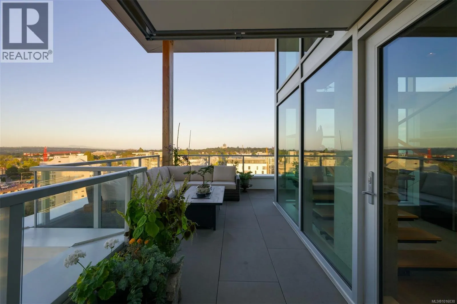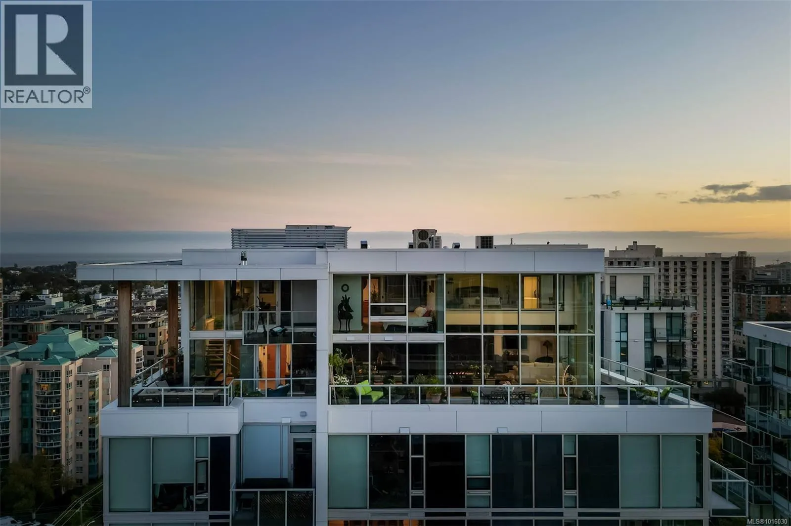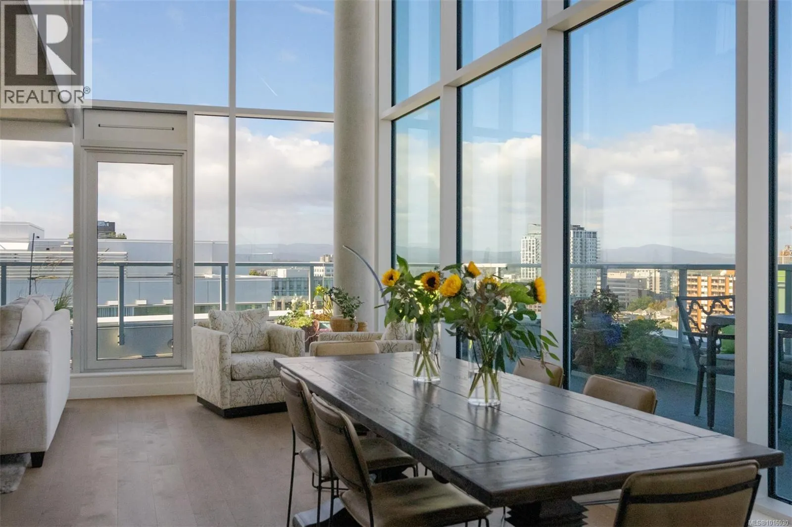 Discover the ultimate penthouse lifestyle at 989 Johnson St in downtown Victoria. This stunning steel and concrete home spans 1,800 sqft over two levels with 17.5-ft ceilings. Floor-to-ceiling windows fill the space with natural light. The kitchen flows seamlessly into the open-concept living area, perfect for hosting or unwinding. Enjoy 270-degree views of mountains, ocean, and city, with three patios to take it all in, including two covered east-facing decks with electric blinds and water/gas hookups. High-end finishes and warm wood accents bring elegance to the industrial style, complementing three bedrooms and baths. The primary bedroom suite, complete with a luxurious ensuite, sits above the family room for unparalleled views. Just steps from restaurants, spas, and downtown amenities. This pet-friendly, rentable penthouse includes two parking spots and a large private storage unit. (id:27476)