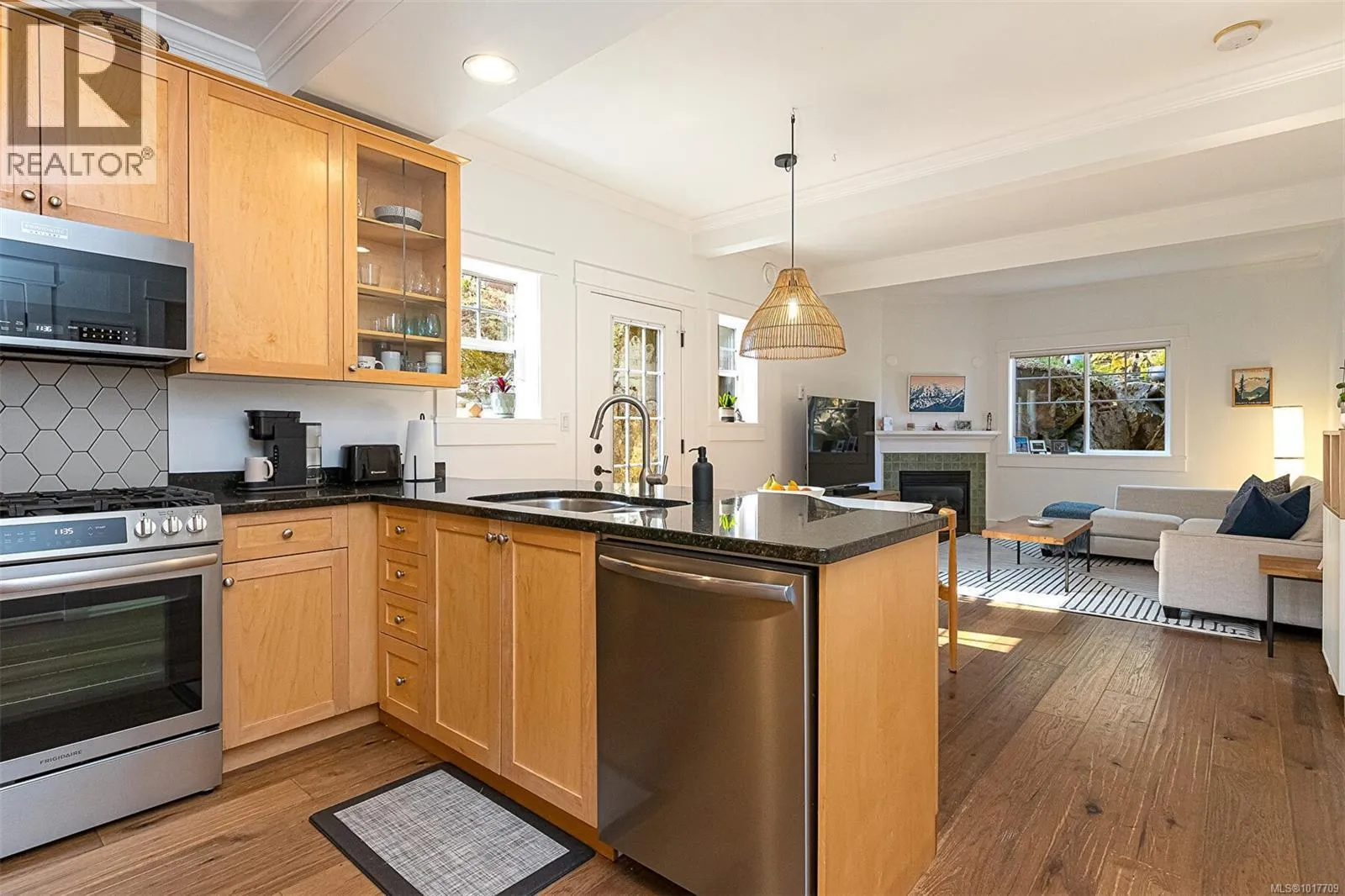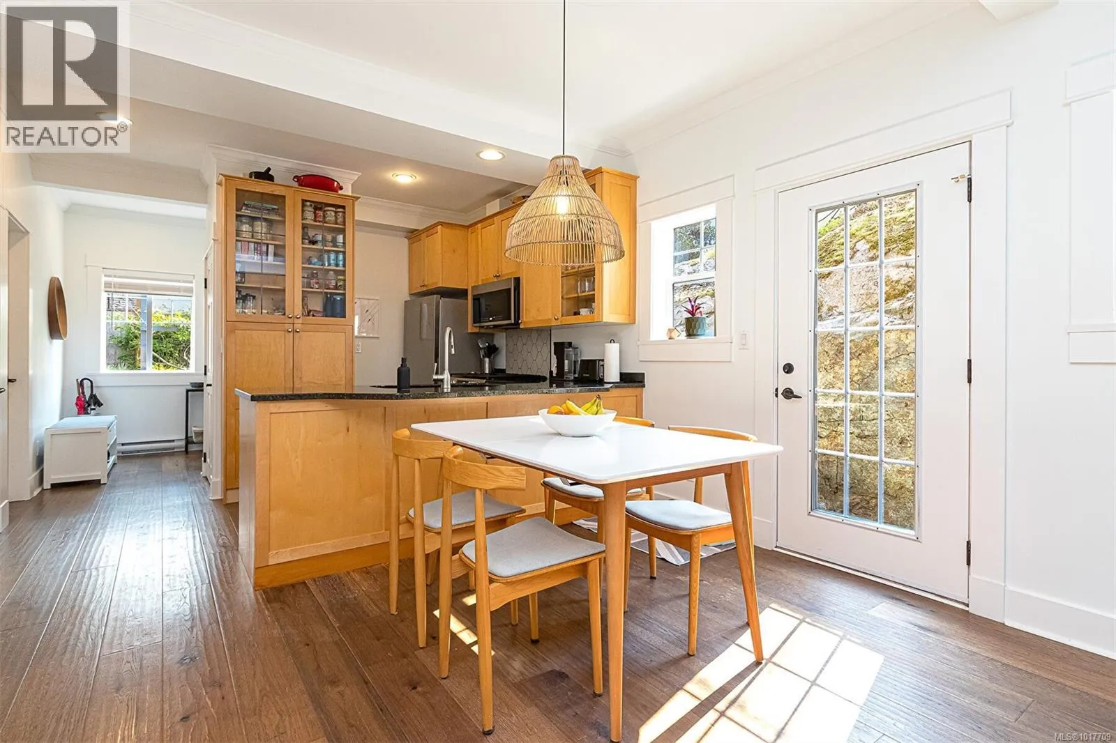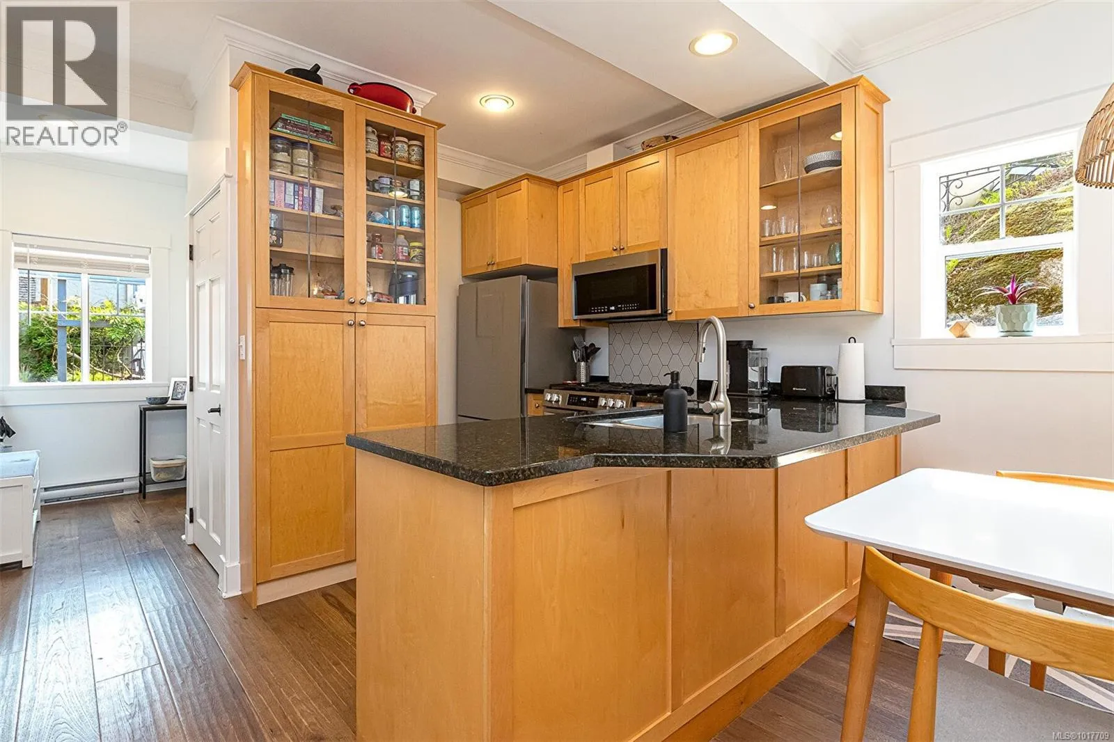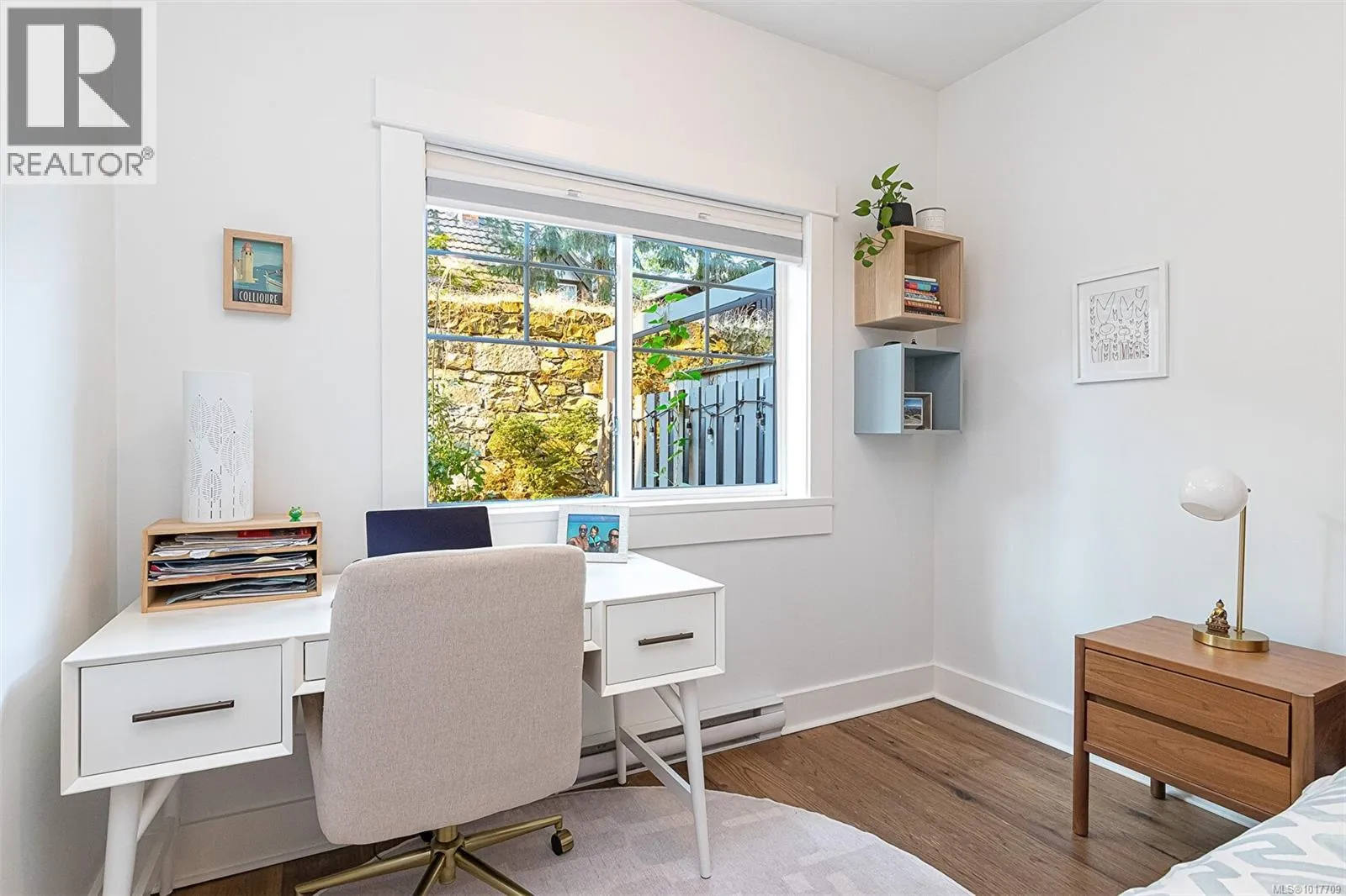 Tucked away on a quiet Rockland one-way road, this ''Garden Suiteâ at Erin Hall offers a rare blend of privacy, charm, and modern comfort. One of only four homes in a beautifully maintained 2004 character conversion, this 2-bed, 1-bath home features a bright, open layout, with 9ft ceilings, Brazilian hardwood floors, and abundant natural light with windows on 3 sides. Enjoy two exceptional outdoor areasâone fencedâperfect for pets, gardening, or entertaining. Newly painted and move-in ready, it includes Rinnai on-demand hot water, heated bathroom floors, all new kitchen appliances inc a gas stove, gas fireplace, and BBQ hookup. Natural rock walls create a serene backdrop, adding to the sense of tranquillity. A separate storage shed, low strata fees, and well-kept common gardens and lawn further enhance this unique offering. A perfect place to call home amongst the Rockland heritage charm and just moments from all downtown amenities. (id:27476)
