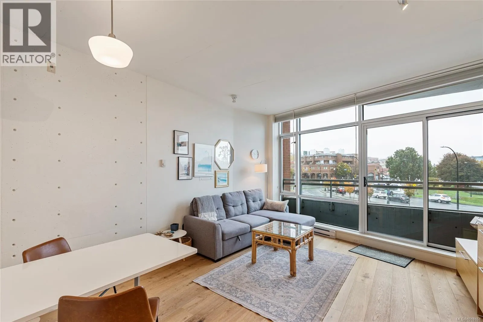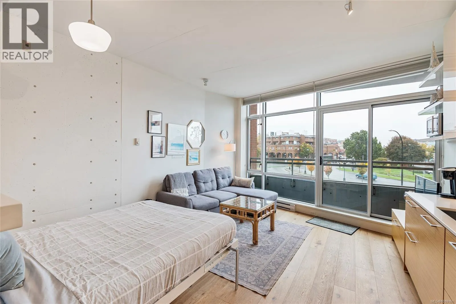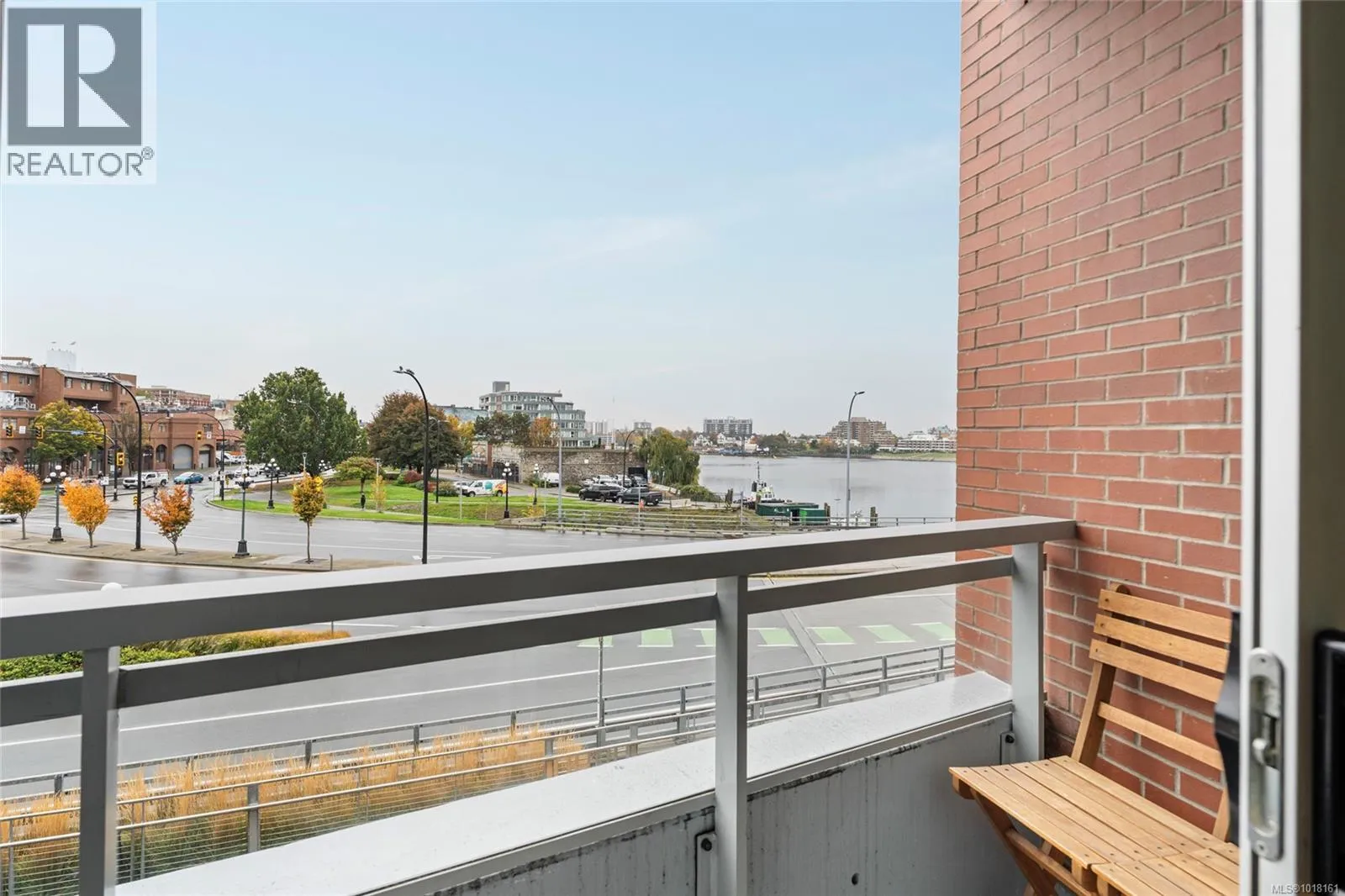 Ocean views! Located in Victoria's popular Old Town, The Janion is an architectural and historical standout. This steel and concrete development offers amazing amenities like a rooftop terrace with BBQ's and stunning harbour views, kayak storage with direct water access, a well equipped gym, and amenity room with kitchen. Step inside unit 211, and be delighted by natural light from south facing floor to ceiling windows, which offer picturesque ocean views. It is also equipped with a full kitchen including drawer dishwasher, murphy bed with dining table, 9' ceilings, in-suite laundry, blackout blinds, brand new engineered wood floors, and private balcony overlooking the water. This loft also comes with a storage locker! Perfect for simplified full time living, or investment (rental friendly and in high demand). Just steps to Victoria's best dining, coffee and retail, the urban lifestyle is waiting for you! Ran by a very professional strata. (id:27476)