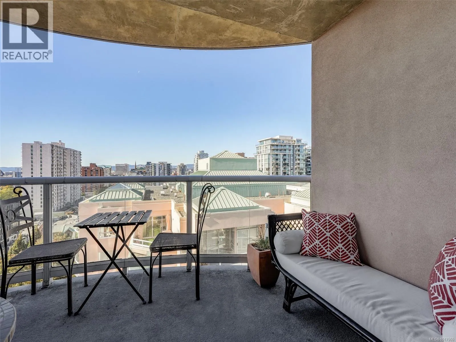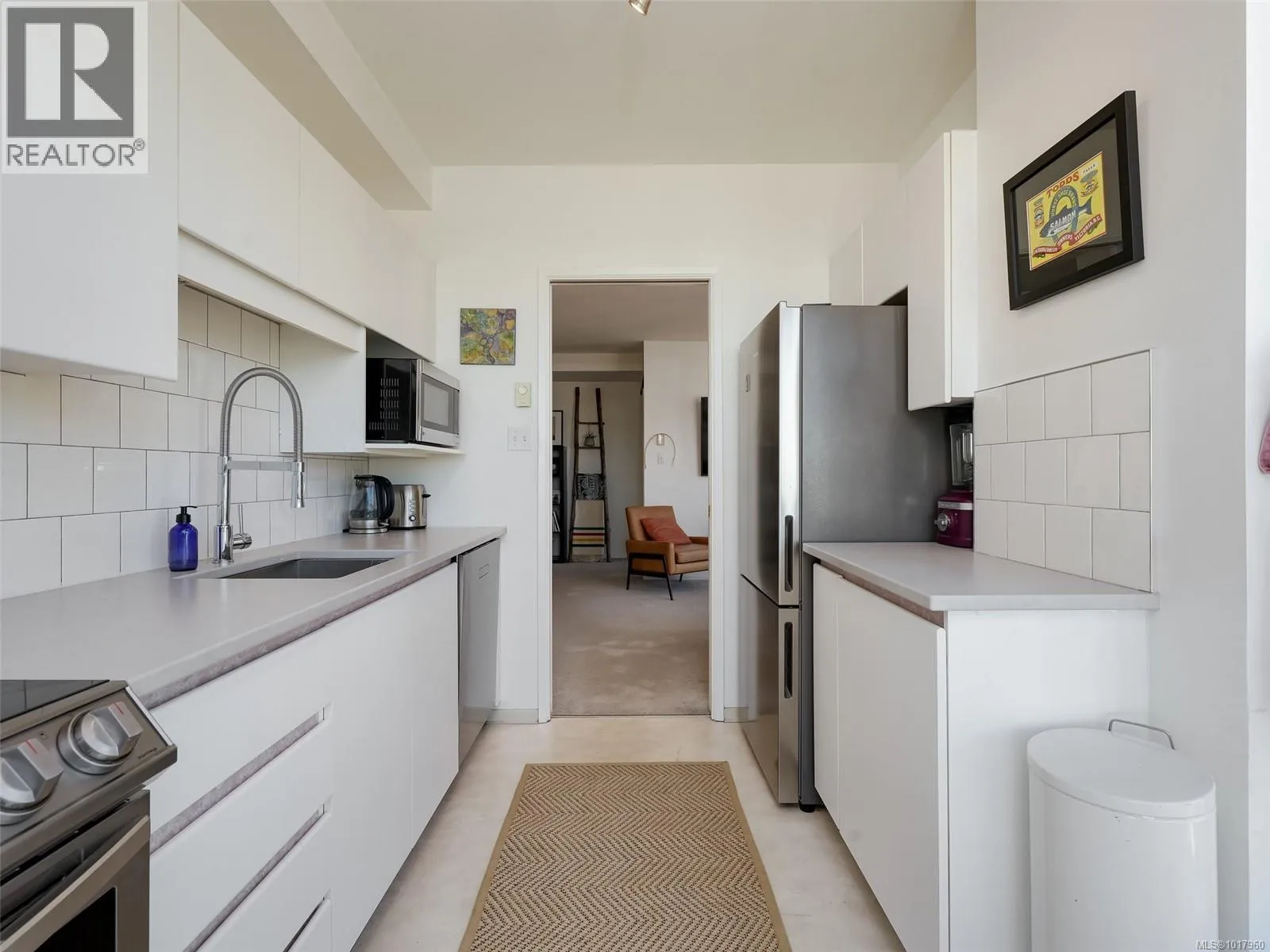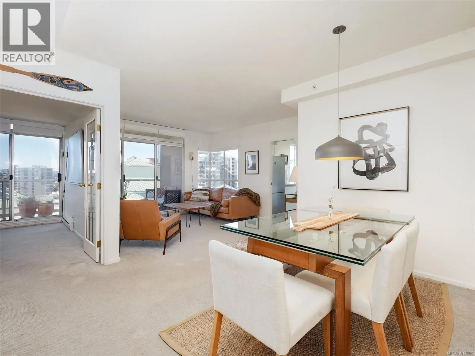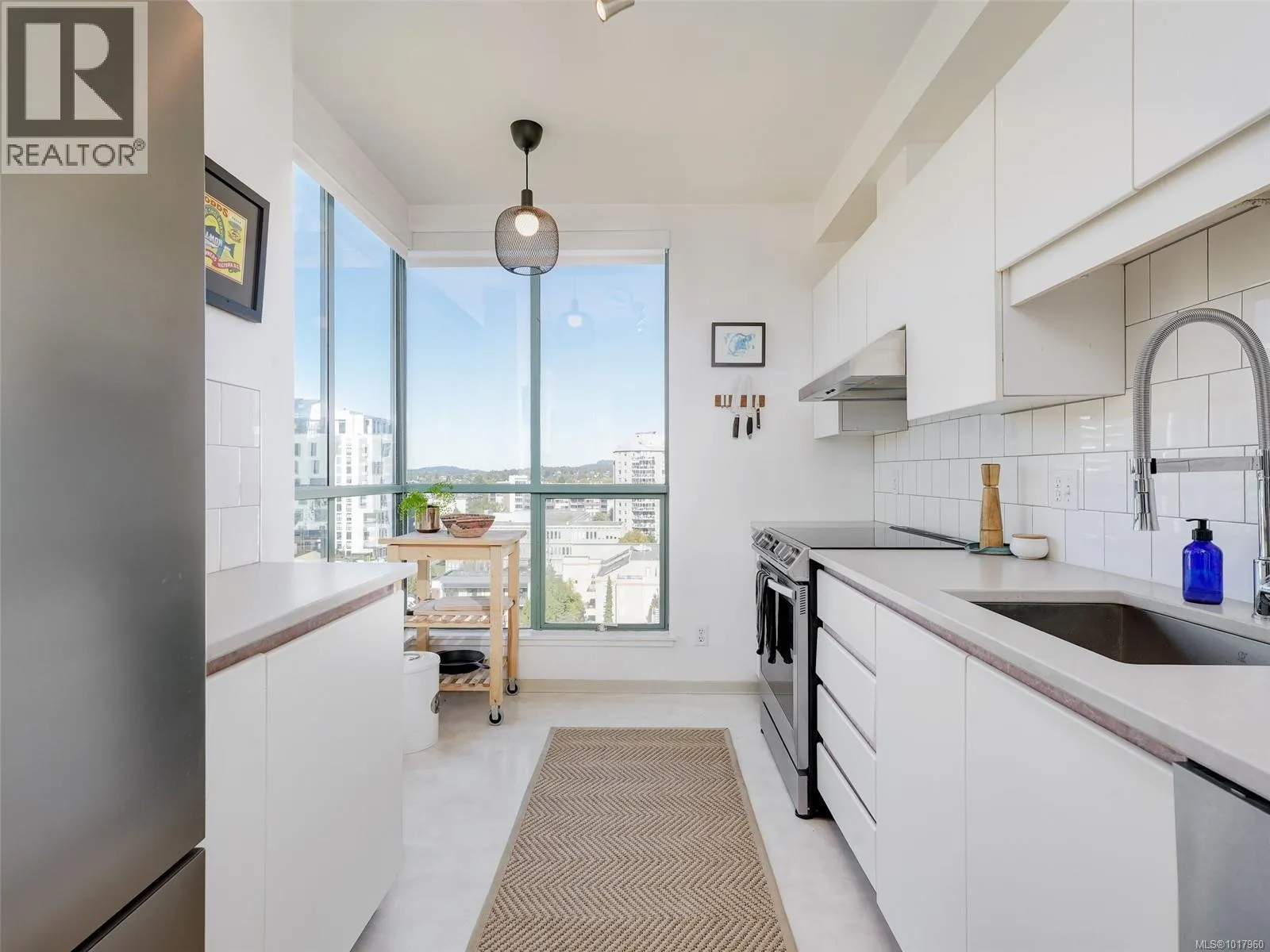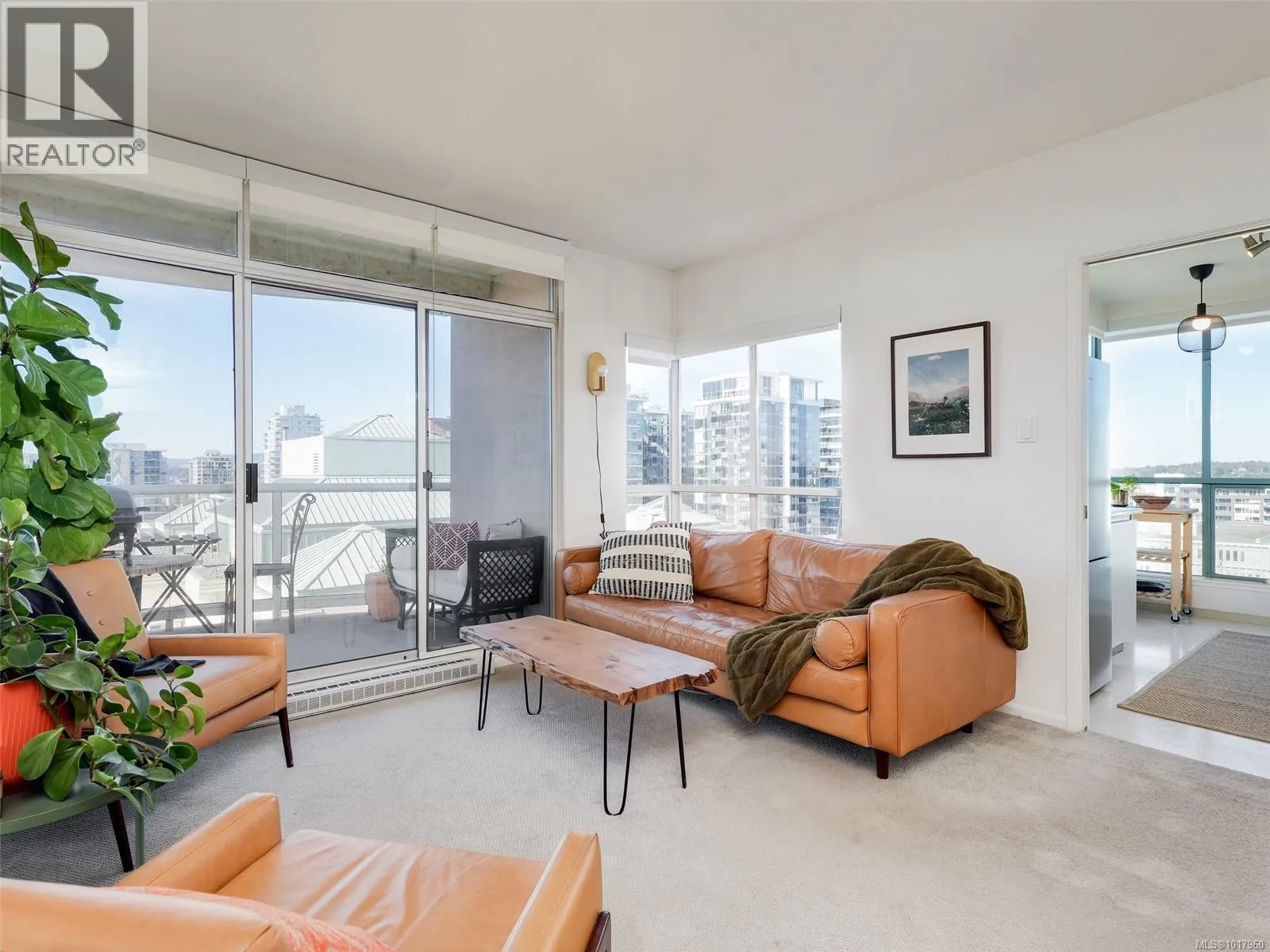 Open House Sunday, Oct. 26th, 2â4! Discover Regents Park in the sought after Harris Green district, downtown Victoria living at its best. Enjoy a prime central location with an exceptional walk score to shops, cafes, and amenities. This bright and spacious 2 bed, 2 bath southwest facing home is bathed in natural light with stunning ocean, city, and mountain views. Thoughtfully redesigned by an interior designer, high end upgrades include quality carpet, sleek kitchen appliances, tile backsplash, countertops, sink and faucet, and two beautifully renovated bathrooms featuring luxury fixtures, glass shower, tub, lighting, vanities, and modern barn doors for the in suite laundry. Enjoy secure underground parking, guest parking, a storage locker, fitness centre with sauna, workshop, and professional management. A welcoming, pet and family friendly community in an unbeatable location. Immediate possession available, move in and start living the downtown lifestyle! (id:27476)