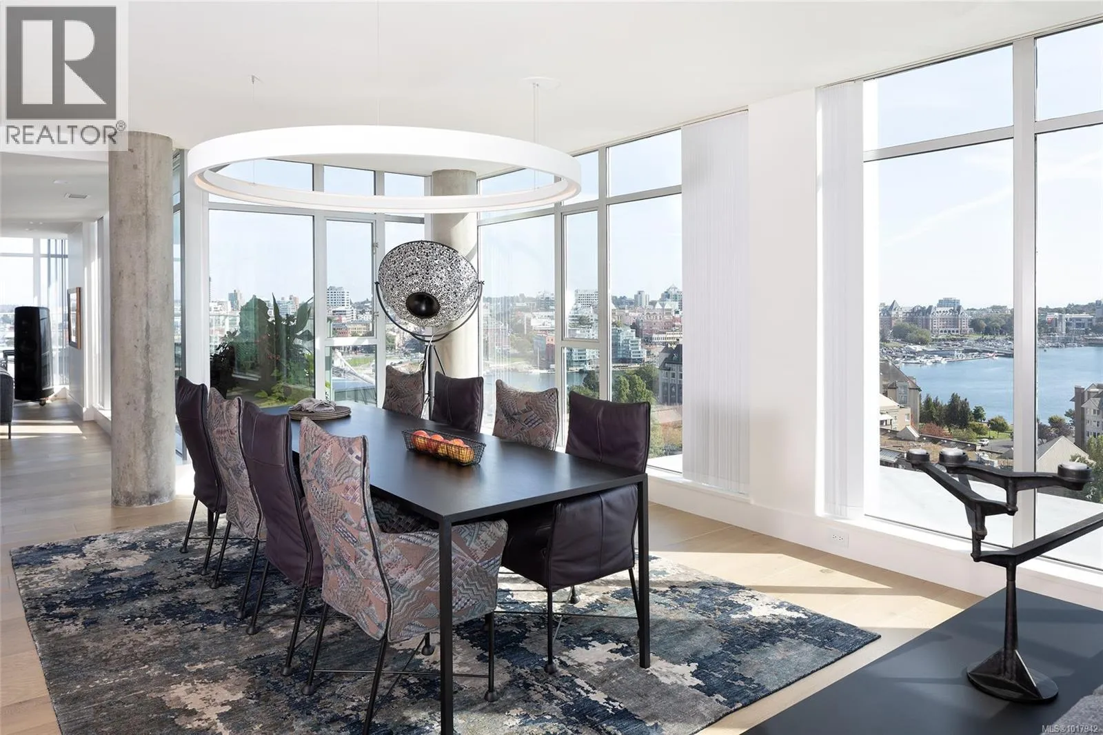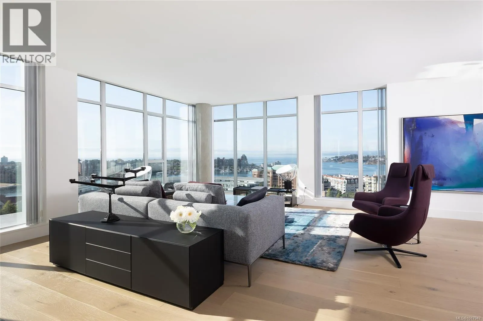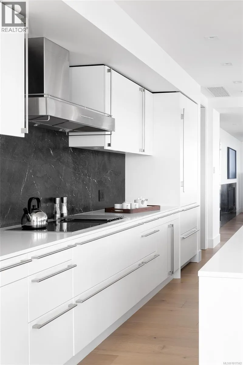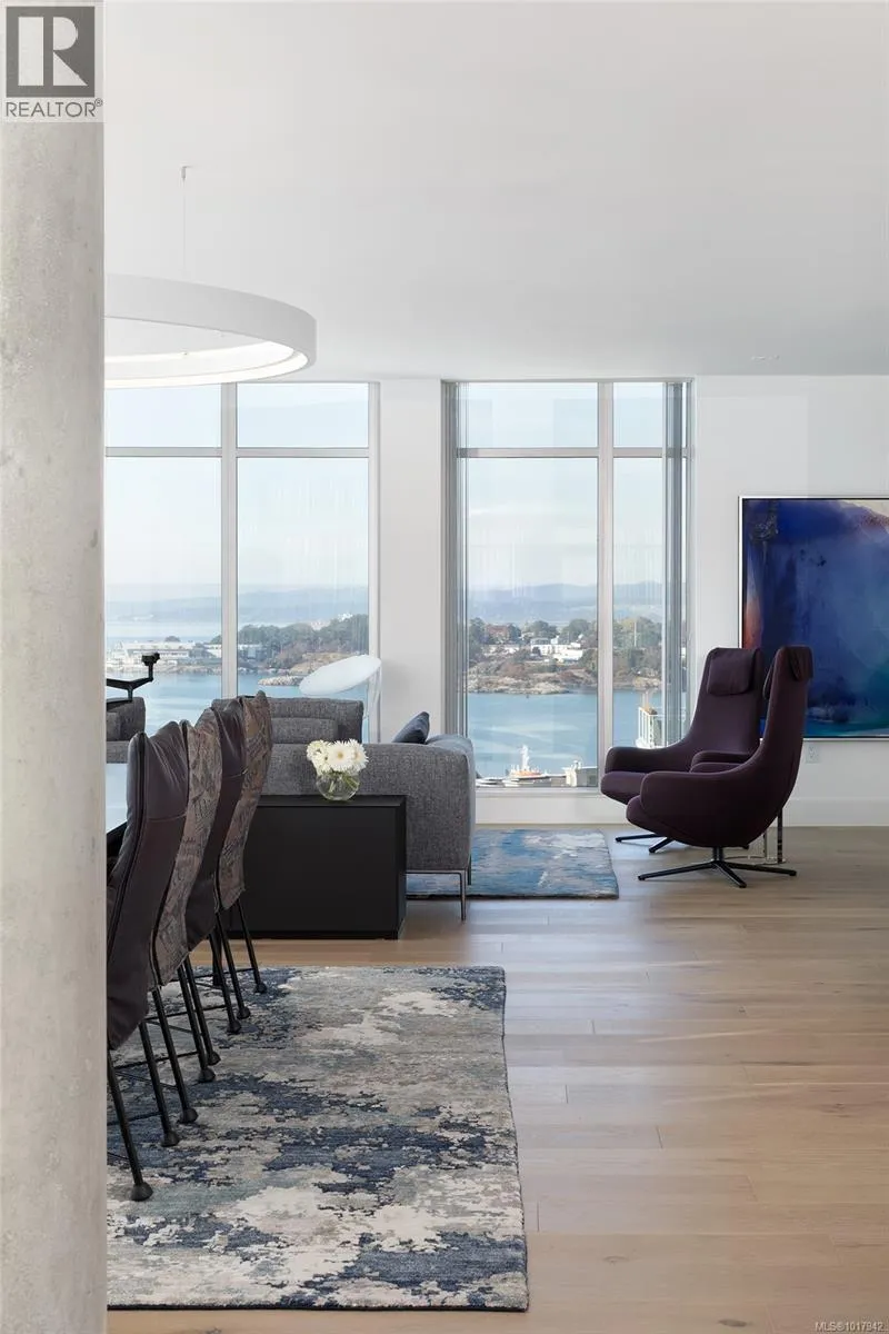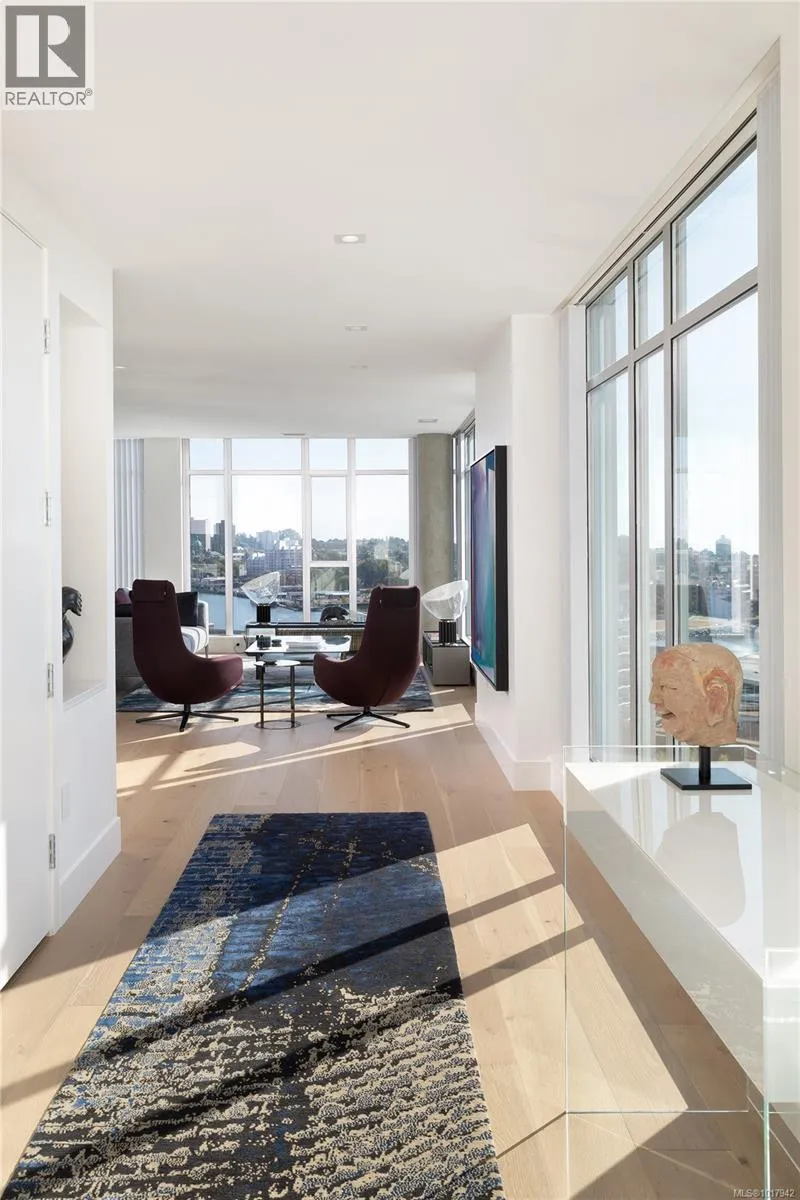Perched high on one of Victoria's most prestigious buildings, this one-of-a-kind, 4234 sq ft penthouse offers unparalleled luxury and breathtaking panoramic views. With a rare position that overlooks the dynamic activity of the Inner Harbour, the tranquil waters, and majestic mountain vistas, this home spans East, South, and West, providing views of the Olympic Mountains, Port Angeles, and the iconic Mt. Baker. The open-concept design is flooded with natural light, thanks to expansive windows that frame the ever-changing scenery. Every inch of this residence has been meticulously curated and extensively renovated in 2022, blending sophisticated elegance with modern functionality. The home boasts three luxurious bedrooms, each with its own ensuite bathroom, a stunning media room, and a spacious butlerâs pantry off the chef-inspired kitchen. Crafted with the finest materials, the property features engineered flooring with a ¾â plywood base for exceptional stability, locally sourced marble, and high-end appliances. High-tech elements such as an integrated Whole House electrical system, electric window blinds, and heat pumps ensure both convenience and comfort. The building itself is regarded as one of the best in Victoria, offering exclusive amenities such as a concierge, a common entertainment room with a pool table, outdoor BBQ area, gym, hot tub, sauna, and even a dog-washing facility. Additional luxuries include four parking stalls in a secure, heated underground garage and two oversized storage lockers. This penthouse epitomizes the pinnacle of refined living in Victoria, combining space, style, and spectacular surroundings. (id:27476)