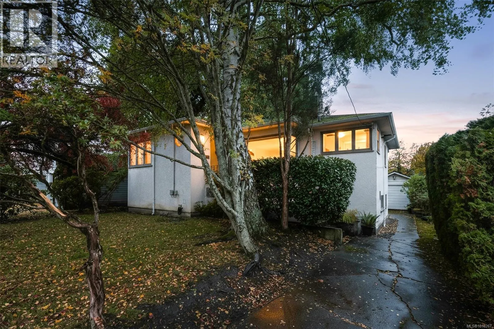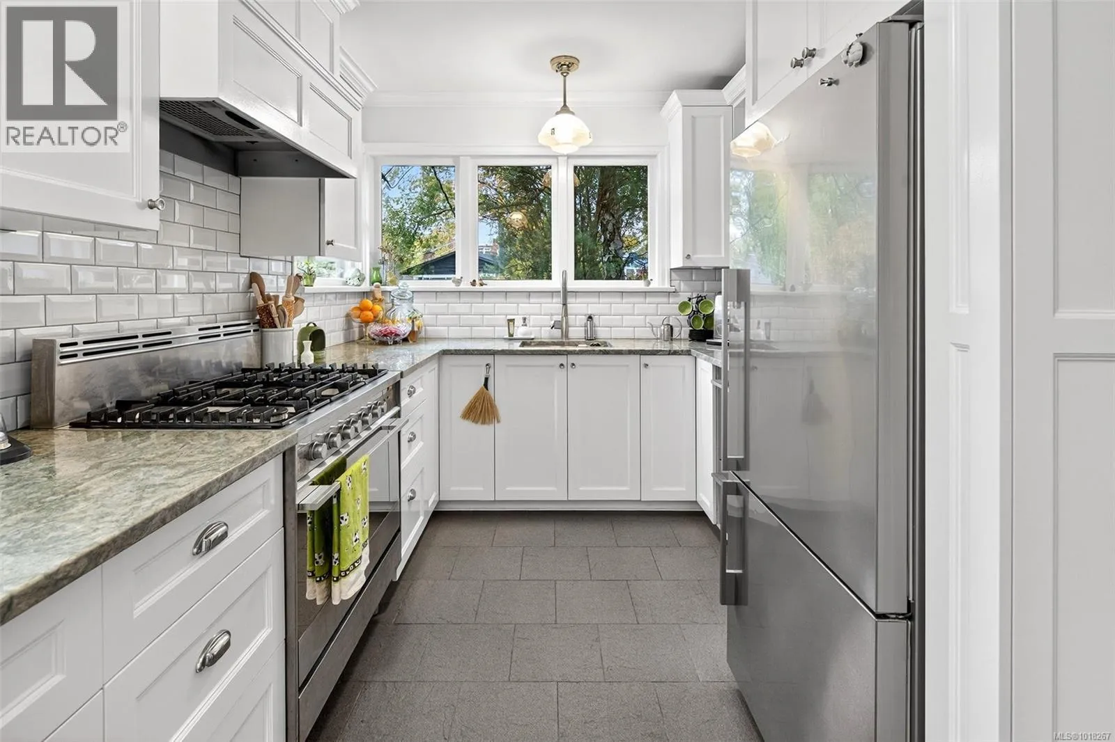 New Listing! Nestled in one of Victoriaâs more charming communities. This well-loved character home delivers cosy living with old world character. Inside you'll find a natural light filled living & dining room framed by large picture windows, arched doorways, coved ceilings, wood mantel, and built-ins with no neighbours in sight. Updates: Kitchen 2011, Perimeter Drains 2011, Roof 2016, Hot water tank 2024, Gas to house, New paint in bath, New back deck & stairs, refinished Oak flrs. Chef kitchen w soft green marbled stone counter, light slate flr, wrap-around windows, pendant lights, custom wd cabinets w pantry & inserts. Refinished oak floors through main. The fully renovated chefâs kitchen features soft green marbled stone counters, grey slate tile, wrap-around windows, pendant lighting, and custom wood cabinetry with pantry and smart insertsâpaired with a Fisher Paykel package: 5-burner built-in gas cooktop with professional-grade oven, stainless fridge, two-drawer dishwasher and an under-mount sink. Main floor primary bedroom includes a walk-in closet. Large Second bed w walk-in closet & corner windows, Bath is freshly painted, Linen closet. Lower level offers: family room w access to backyard. Youâll also find a bedroom w original fir floors, tile in family and laundry areas; storage under the stairs + nanny suite potential. Partial kitchen in placeâfreezer, sink, counter, cabinetsâplumbing ready for a full bathroom (sink and toilet currently installed; designated space for a shower). Cold storage rm with commercial-grade door. Outdoors, enjoy a private front yard with mature trees, long driveway, sunny, west-facing yard w fruit trees & lovely landscape. New back-deck & stairs, level yardâperfect for gardening, family and entertaining. Detached garage. Walk to Fairfield shops and cafés, beaches, parks, schools & transitâan easy lifestyle in one of Victoriaâs adored communities. (id:27476)