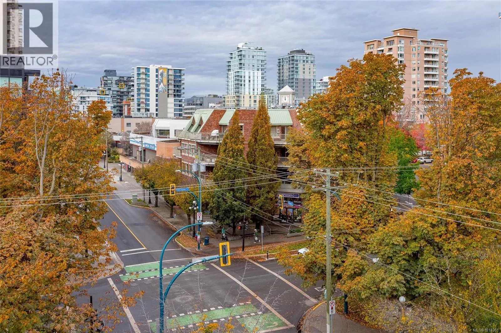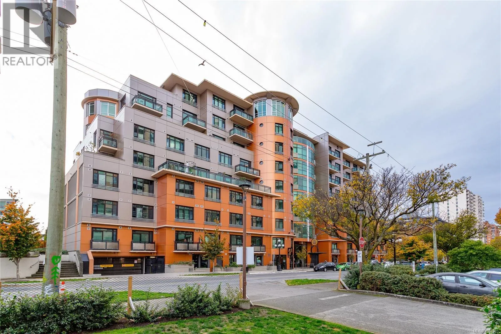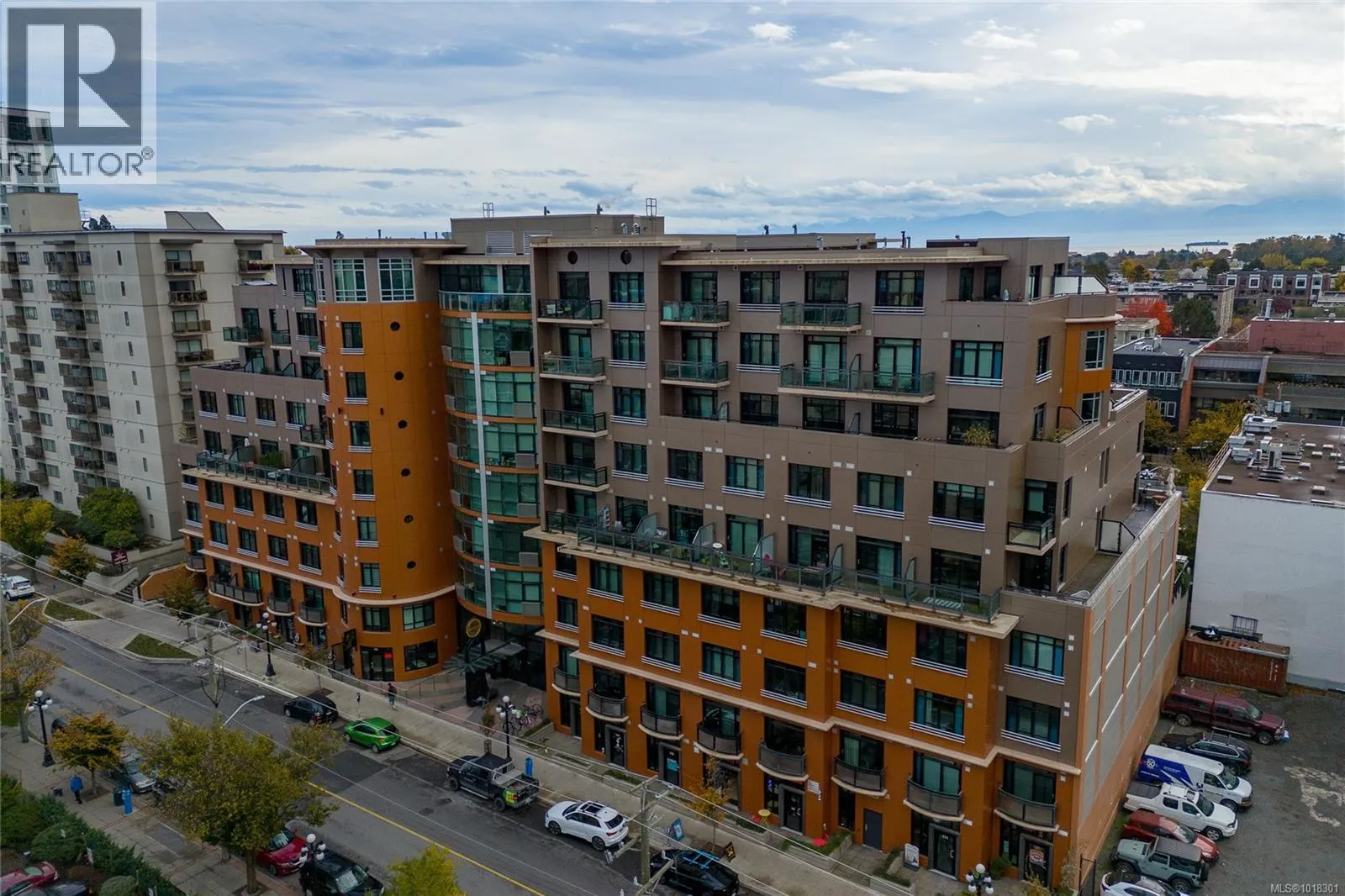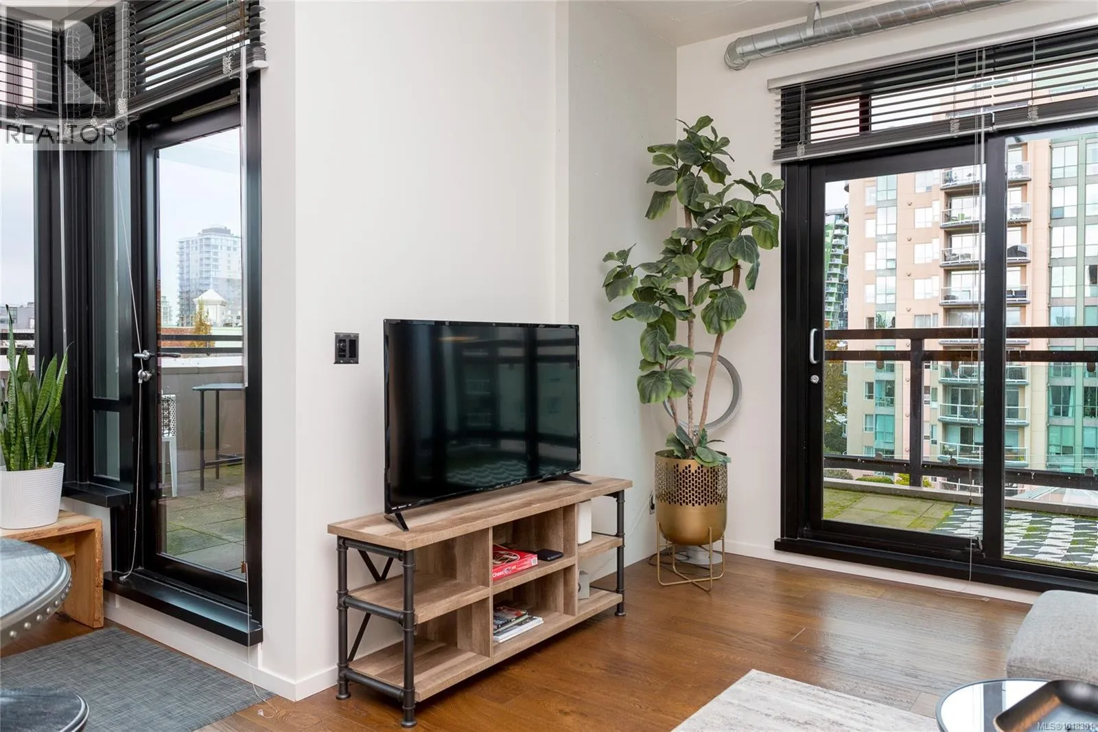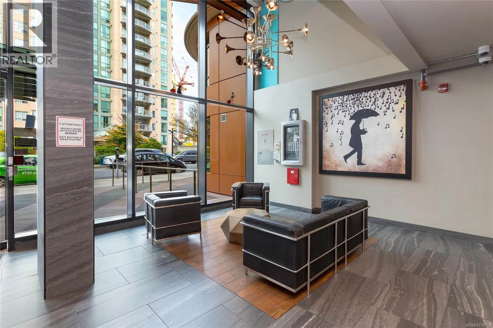 Gorgeous & Unique Loft Style Living in The Juke Box! Light filled corner unit with floor to ceiling windows, over 400 sq. ft of balconies,10'high ceilings, European Vinyl Plank flooring throughout, high gloss kitchen w/quartz counters, built in appliances and island, decadent bathroom with ceiling rain shower head, washer and dryer and custom freestanding armoires. Live the downtown lifestyle in Harris Green-across the street from Yates Market with its numerous market stores, 1/2 block to Cook St., yet only 3 blocks from the heart of Victoria's downtown where all the action is. COMES FULLY FURNISHED and READY TO LIVE IN or a GREAT TURN KEY PROFESSIONALLY MANAGED REVENUE PROPERTY. Min 90 days rental. Pets welcome. U/G parking and storage/bike lockers included. Huge Fitness centre with outdoor patio and water feature. Call now to book viewing! (id:27476)