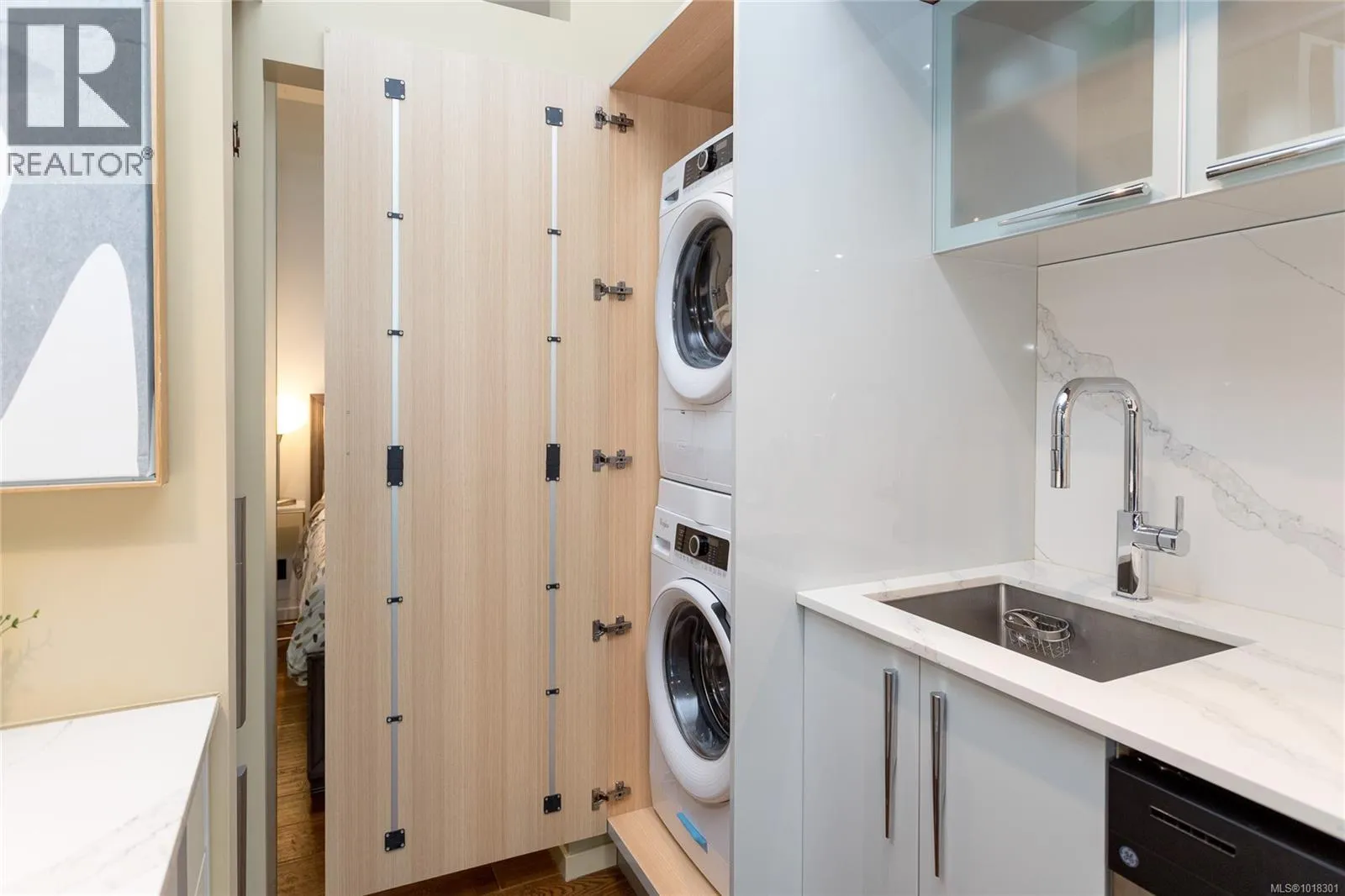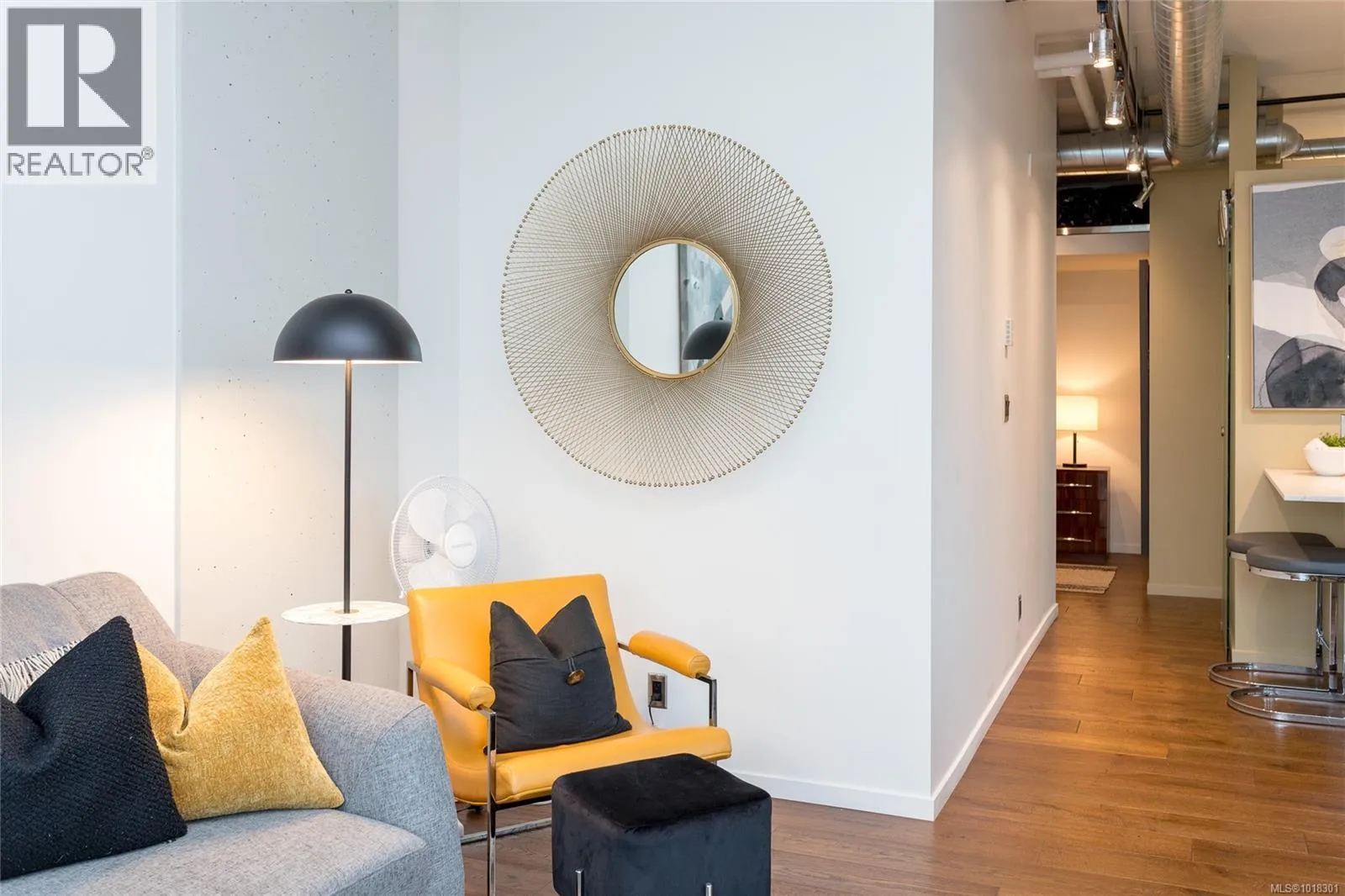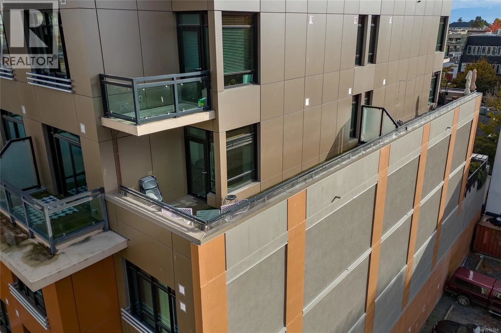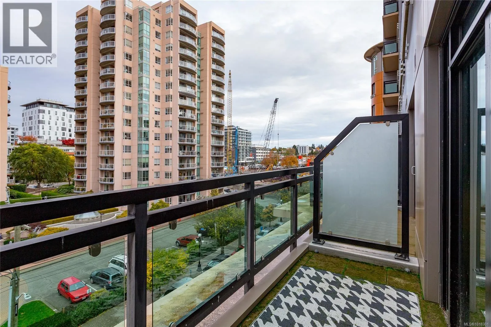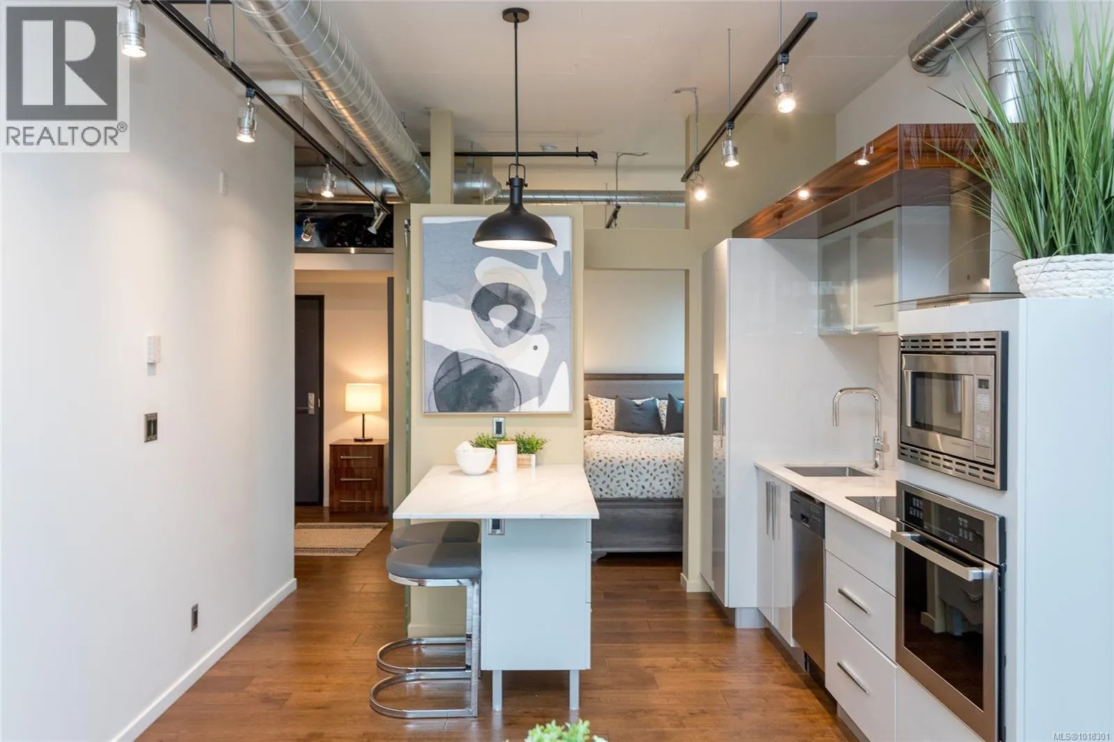 Gorgeous & Unique Loft Style Living in The Juke Box! Light filled corner unit with floor to ceiling windows, over 400 sq. ft of balconies,10'high ceilings, European Vinyl Plank flooring throughout, high gloss kitchen w/quartz counters, built in appliances and island, decadent bathroom with ceiling rain shower head, washer and dryer and custom freestanding armoires. Live the downtown lifestyle in Harris Green-across the street from Yates Market with its numerous market stores, 1/2 block to Cook St., yet only 3 blocks from the heart of Victoria's downtown where all the action is. COMES FULLY FURNISHED and READY TO LIVE IN or a GREAT TURN KEY PROFESSIONALLY MANAGED REVENUE PROPERTY. Min 90 days rental. Pets welcome. U/G parking and storage/bike lockers included. Huge Fitness centre with outdoor patio and water feature. Call now to book viewing! (id:27476)