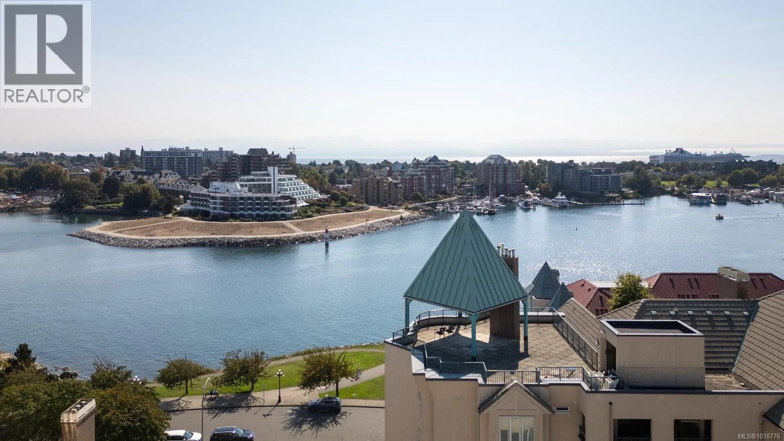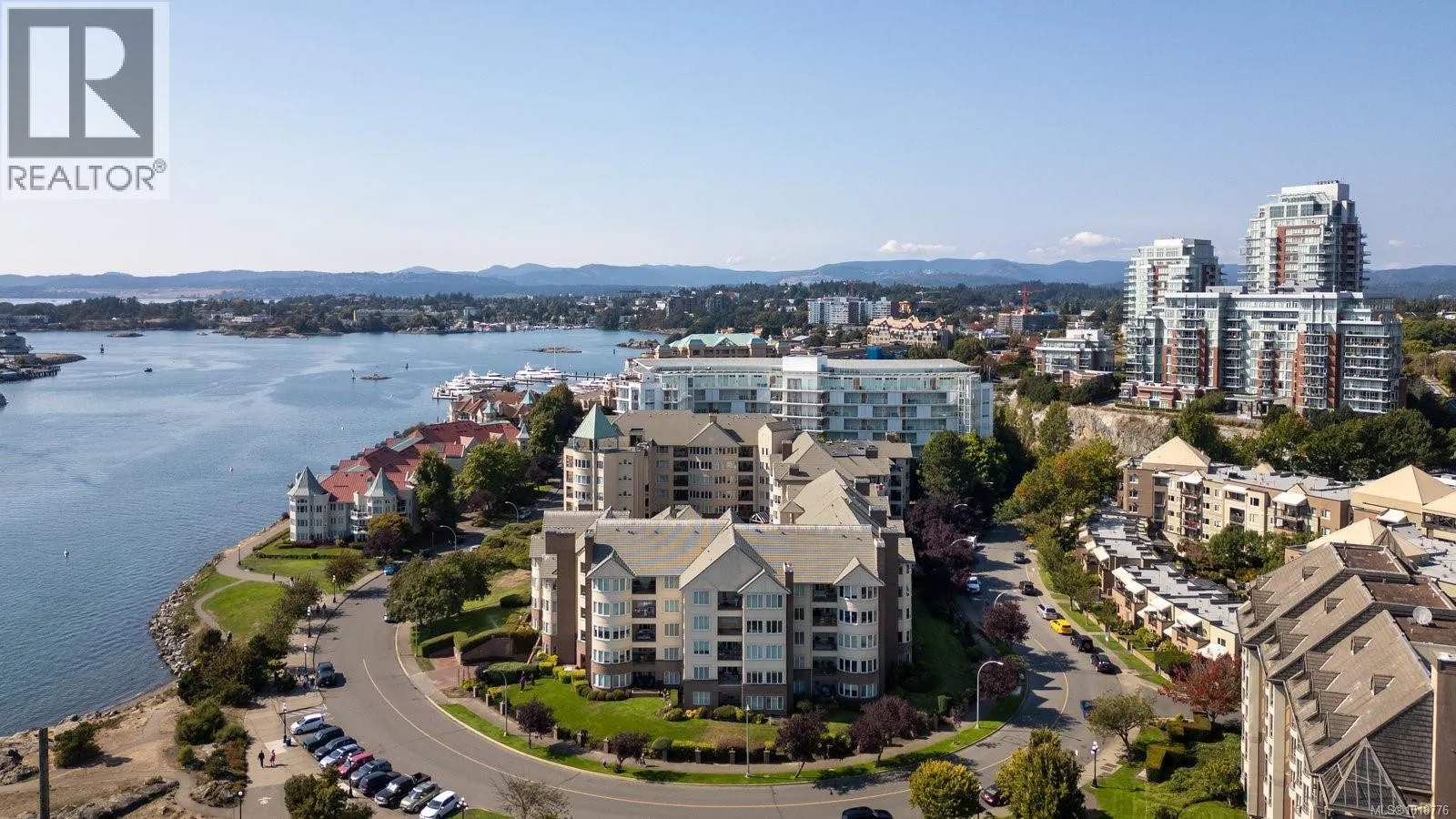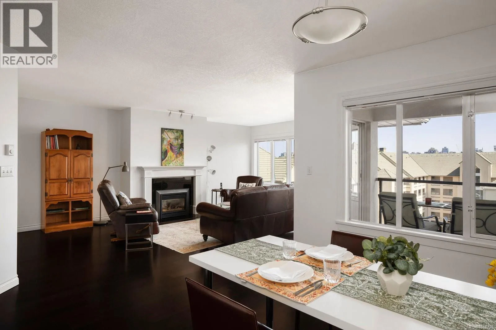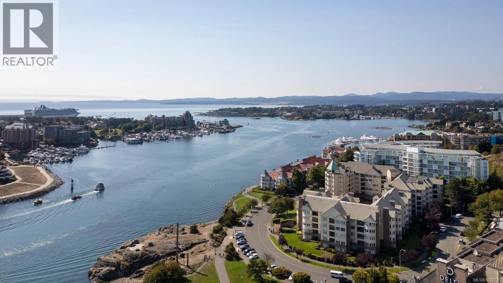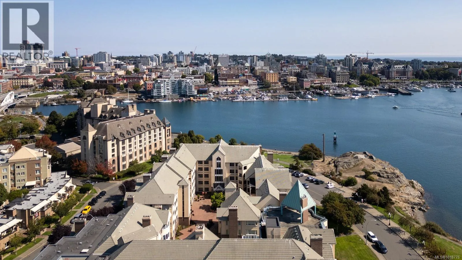 Morning sunrises over the city with south-eastern views of the Empress Hotel and Inner Harbour, along with just under 1,500 sqft of living space, make this a standout top-floor condo. Ideally located in one of the cityâs most desirable neighbourhoods, offering tranquility with immediate access to downtown. Inside, an open-concept layout features high ceilings, expansive windows, and abundant natural light. The living room, anchored by a cozy gas fireplace, is framed by harbour views, while the adjacent dining area easily accommodates gatherings against the Empress Hotel and Inner Harbour backdrop. The private primary suite boasts generous proportions, large windows, and a spacious ensuite. A second bedroom enjoys harbour views to the south-west, with a full bath nearby. Additional highlights include a laundry room, ample in-suite storage, secure parking, and building amenities such as a lounge, conference room, guest suite, and landscaped courtyards, plus the waterfront pathway linking to the marina, shops, and cafés. (id:27476)