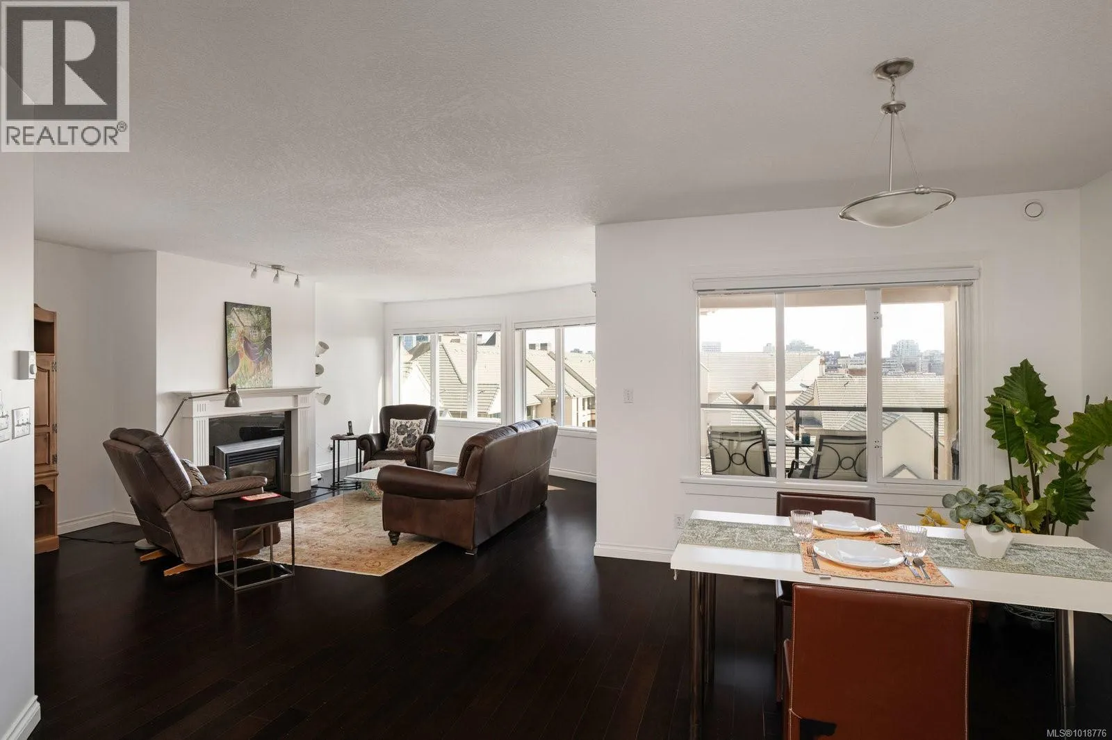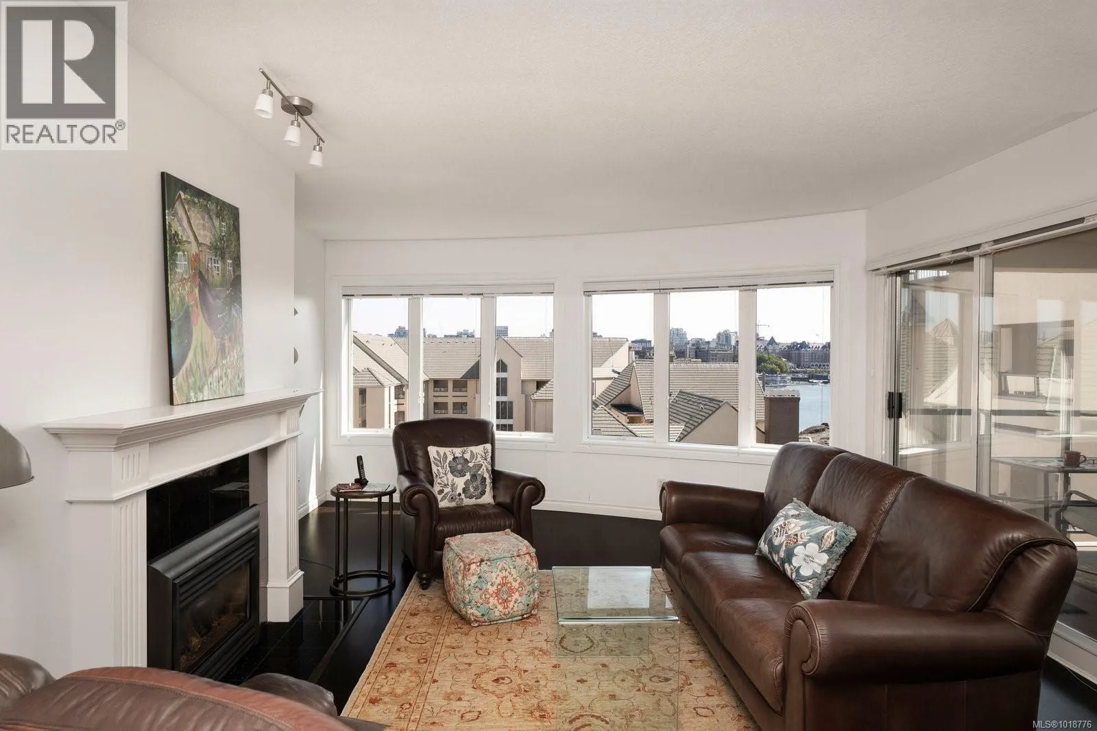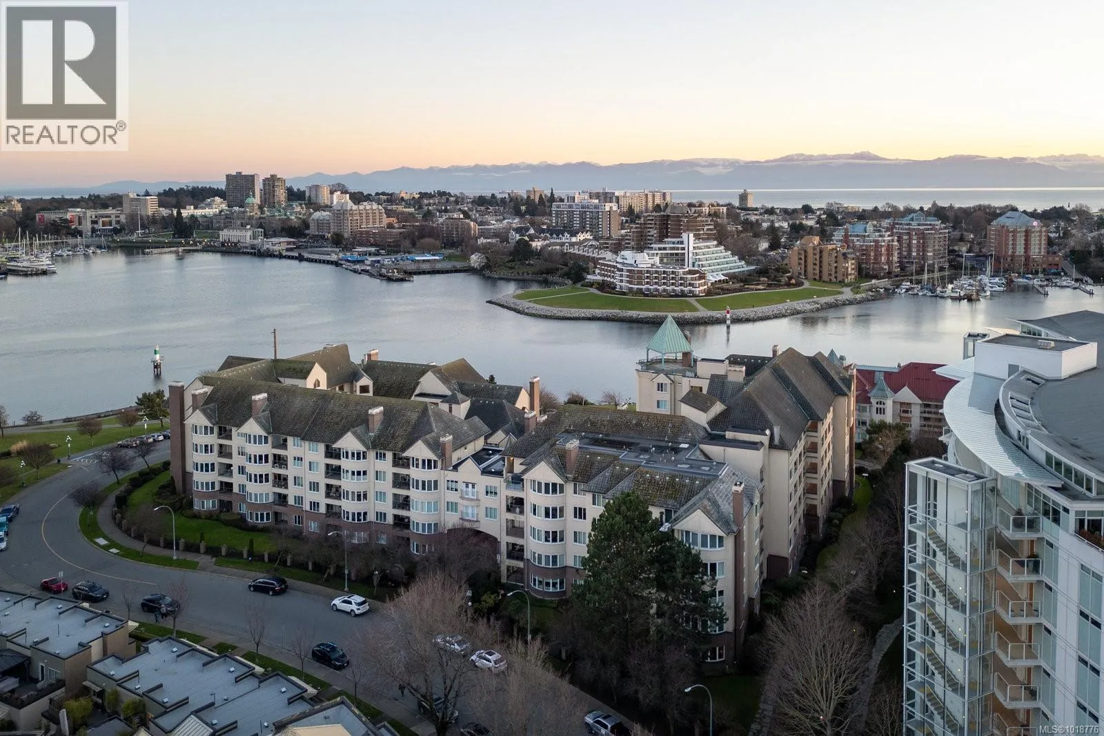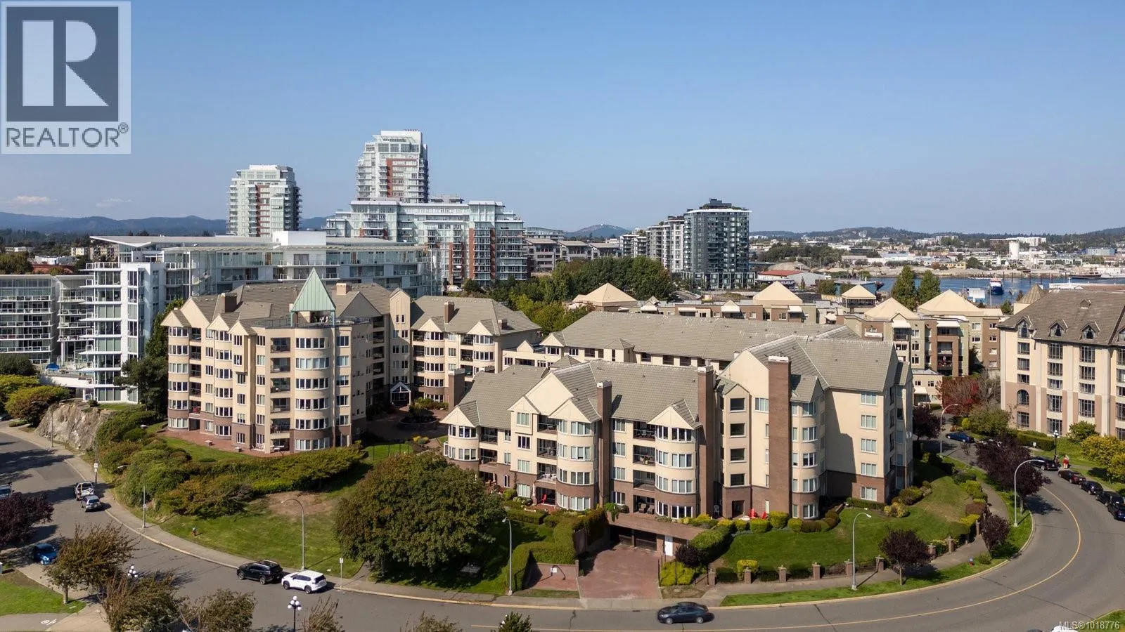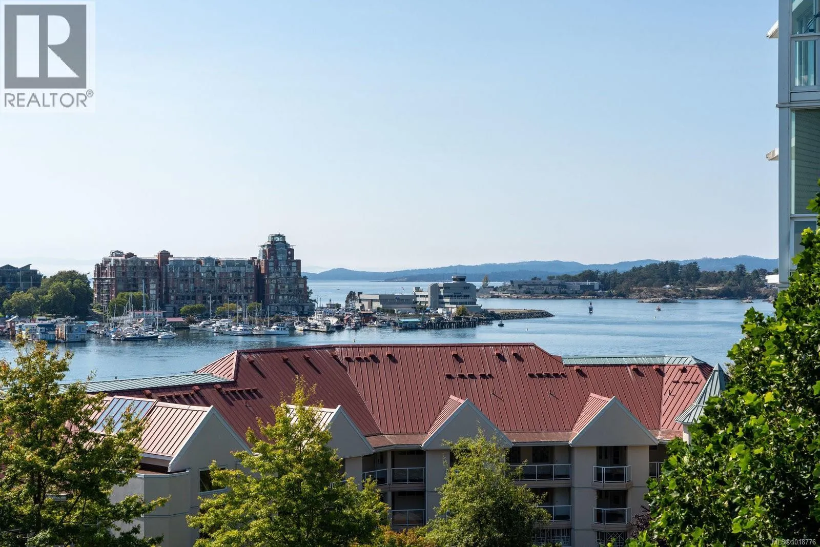 Morning sunrises over the city with south-eastern views of the Empress Hotel and Inner Harbour, along with just under 1,500 sqft of living space, make this a standout top-floor condo. Ideally located in one of the cityâs most desirable neighbourhoods, offering tranquility with immediate access to downtown. Inside, an open-concept layout features high ceilings, expansive windows, and abundant natural light. The living room, anchored by a cozy gas fireplace, is framed by harbour views, while the adjacent dining area easily accommodates gatherings against the Empress Hotel and Inner Harbour backdrop. The private primary suite boasts generous proportions, large windows, and a spacious ensuite. A second bedroom enjoys harbour views to the south-west, with a full bath nearby. Additional highlights include a laundry room, ample in-suite storage, secure parking, and building amenities such as a lounge, conference room, guest suite, and landscaped courtyards, plus the waterfront pathway linking to the marina, shops, and cafés. (id:27476)