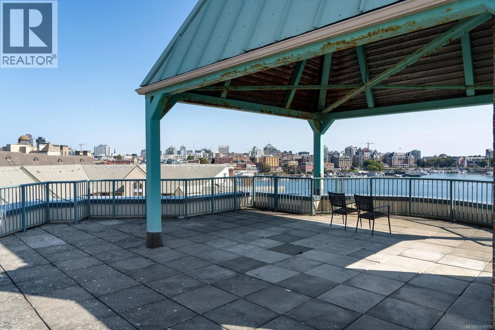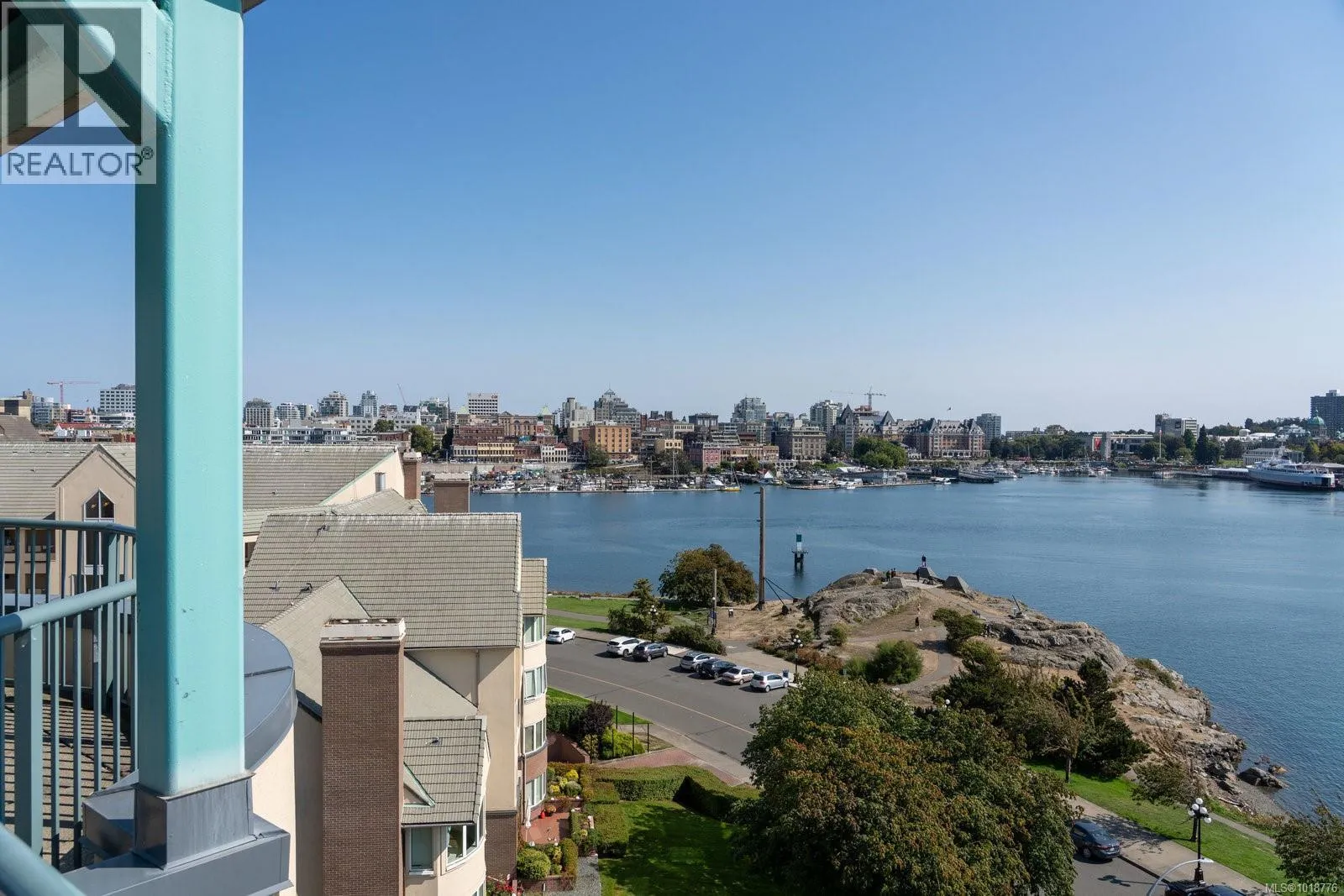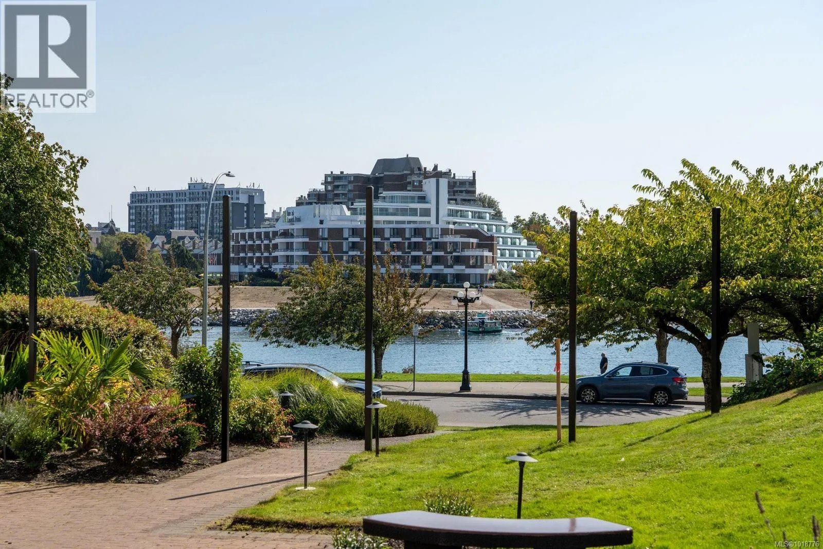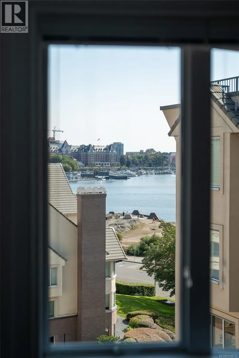 Morning sunrises over the city with south-eastern views of the Empress Hotel and Inner Harbour, along with just under 1,500 sqft of living space, make this a standout top-floor condo. Ideally located in one of the cityâs most desirable neighbourhoods, offering tranquility with immediate access to downtown. Inside, an open-concept layout features high ceilings, expansive windows, and abundant natural light. The living room, anchored by a cozy gas fireplace, is framed by harbour views, while the adjacent dining area easily accommodates gatherings against the Empress Hotel and Inner Harbour backdrop. The private primary suite boasts generous proportions, large windows, and a spacious ensuite. A second bedroom enjoys harbour views to the south-west, with a full bath nearby. Additional highlights include a laundry room, ample in-suite storage, secure parking, and building amenities such as a lounge, conference room, guest suite, and landscaped courtyards, plus the waterfront pathway linking to the marina, shops, and cafés. (id:27476)