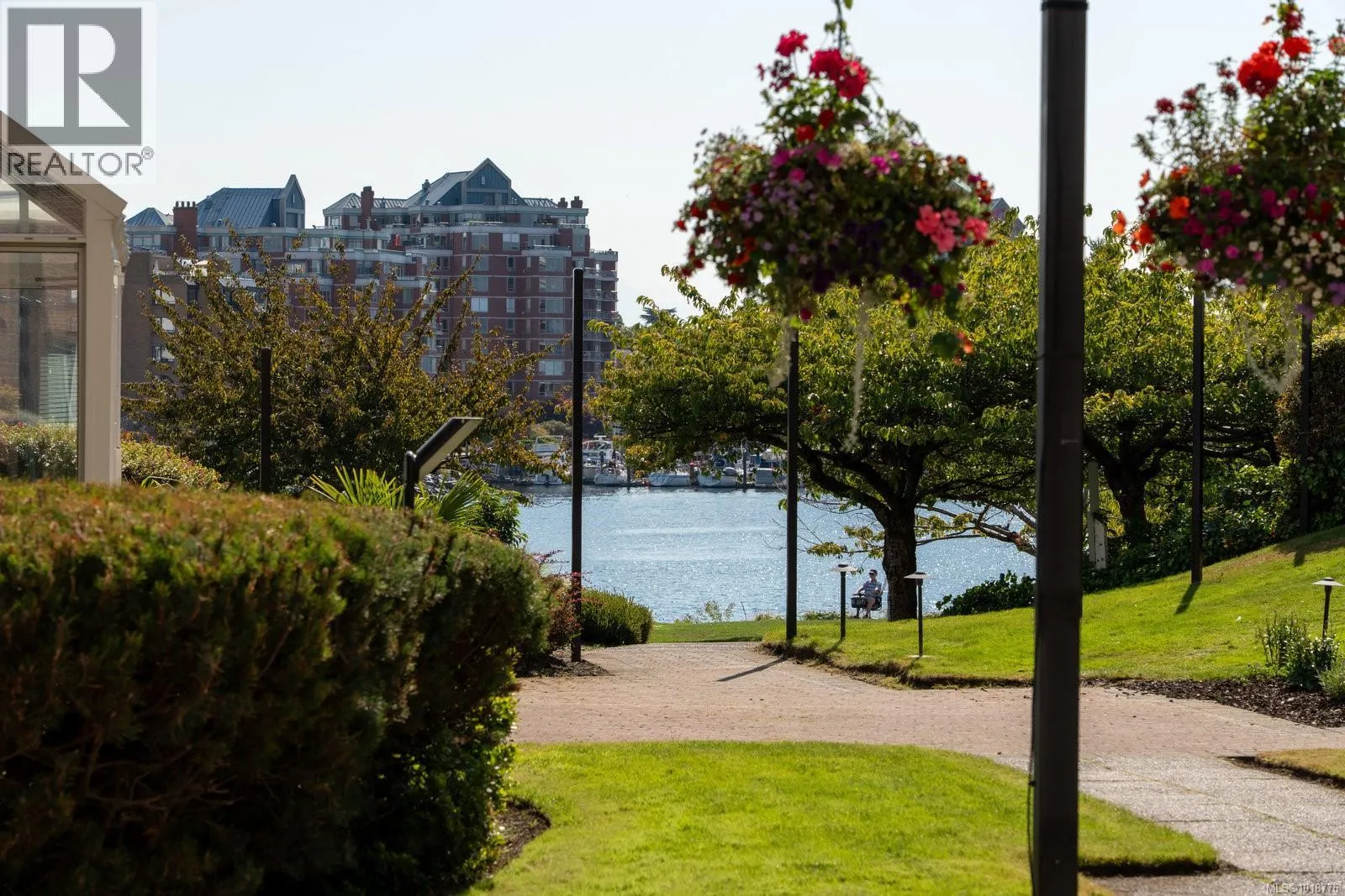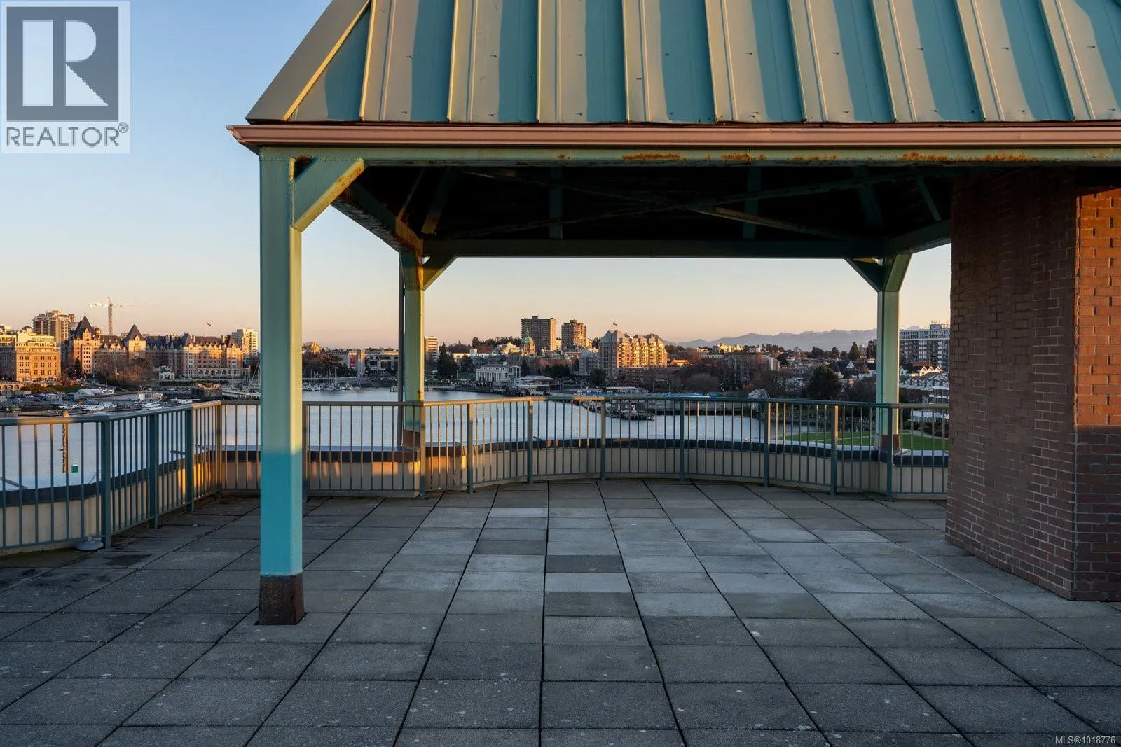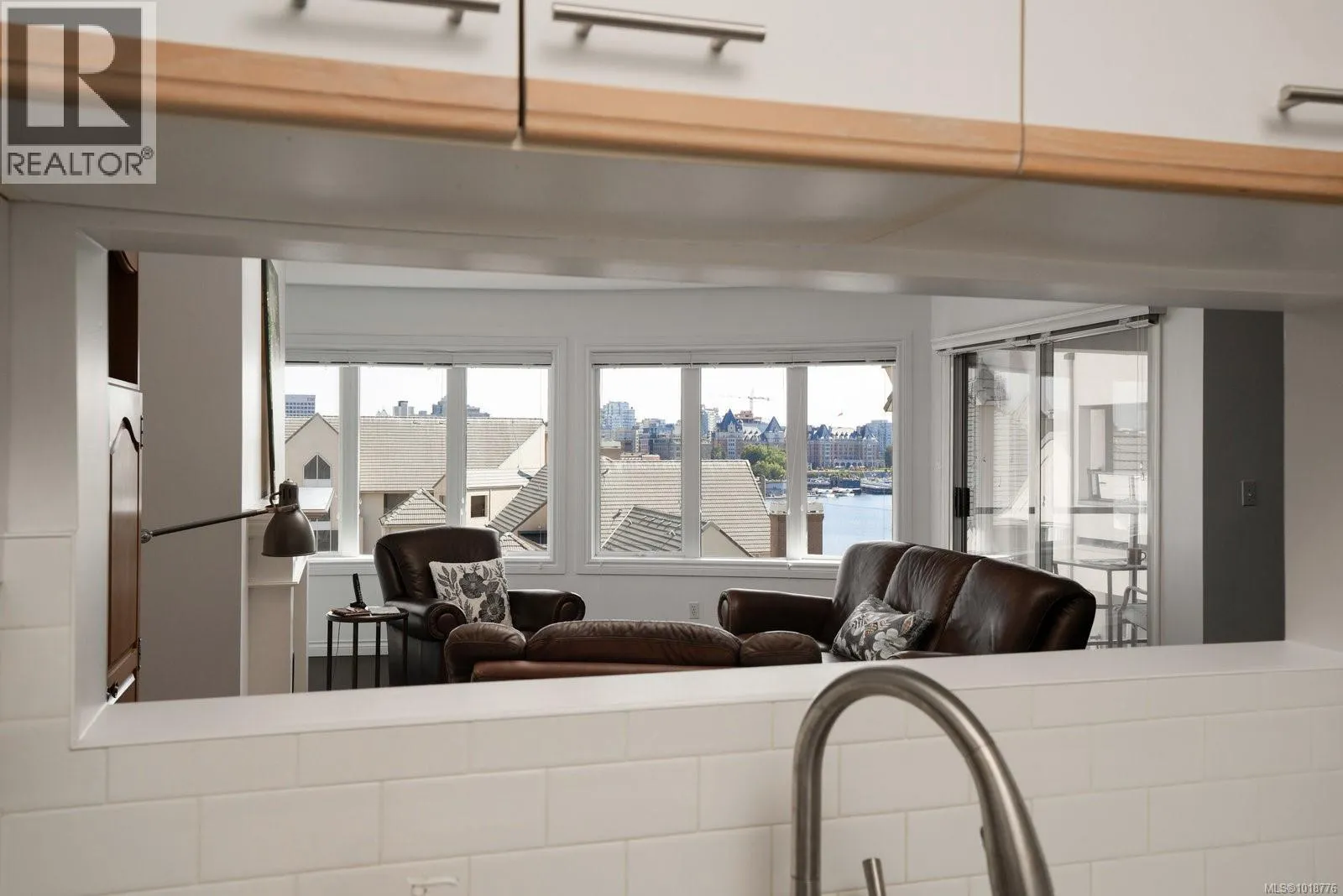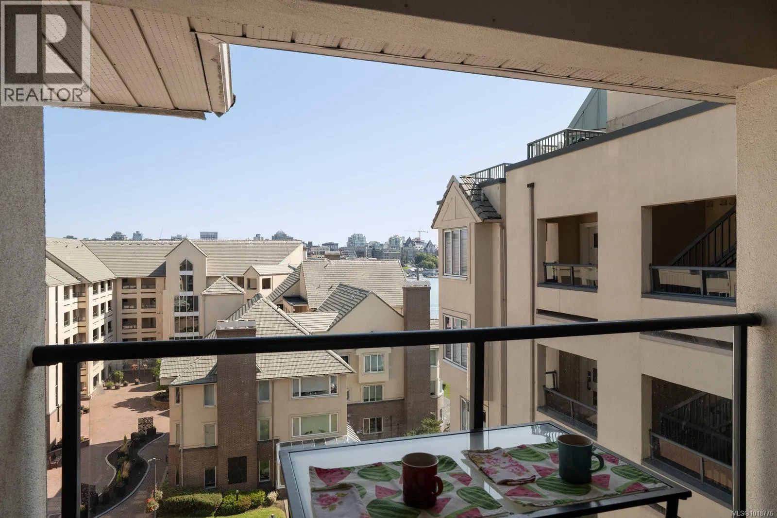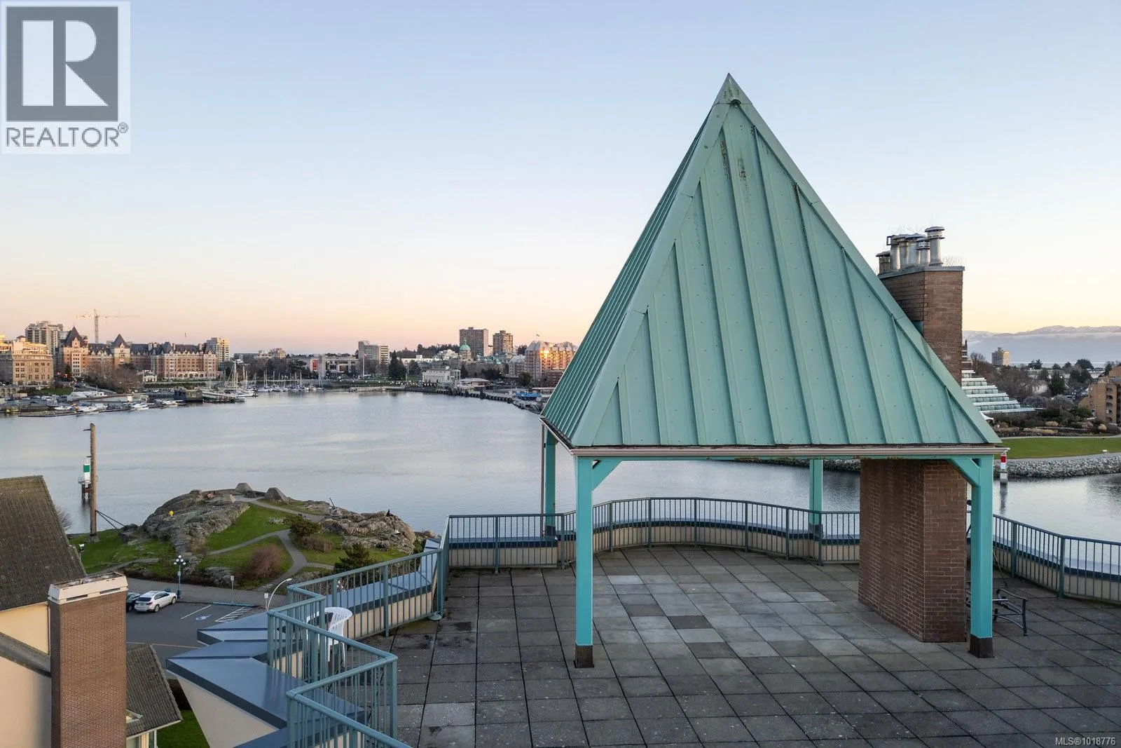 Morning sunrises over the city with south-eastern views of the Empress Hotel and Inner Harbour, along with just under 1,500 sqft of living space, make this a standout top-floor condo. Ideally located in one of the cityâs most desirable neighbourhoods, offering tranquility with immediate access to downtown. Inside, an open-concept layout features high ceilings, expansive windows, and abundant natural light. The living room, anchored by a cozy gas fireplace, is framed by harbour views, while the adjacent dining area easily accommodates gatherings against the Empress Hotel and Inner Harbour backdrop. The private primary suite boasts generous proportions, large windows, and a spacious ensuite. A second bedroom enjoys harbour views to the south-west, with a full bath nearby. Additional highlights include a laundry room, ample in-suite storage, secure parking, and building amenities such as a lounge, conference room, guest suite, and landscaped courtyards, plus the waterfront pathway linking to the marina, shops, and cafés. (id:27476)