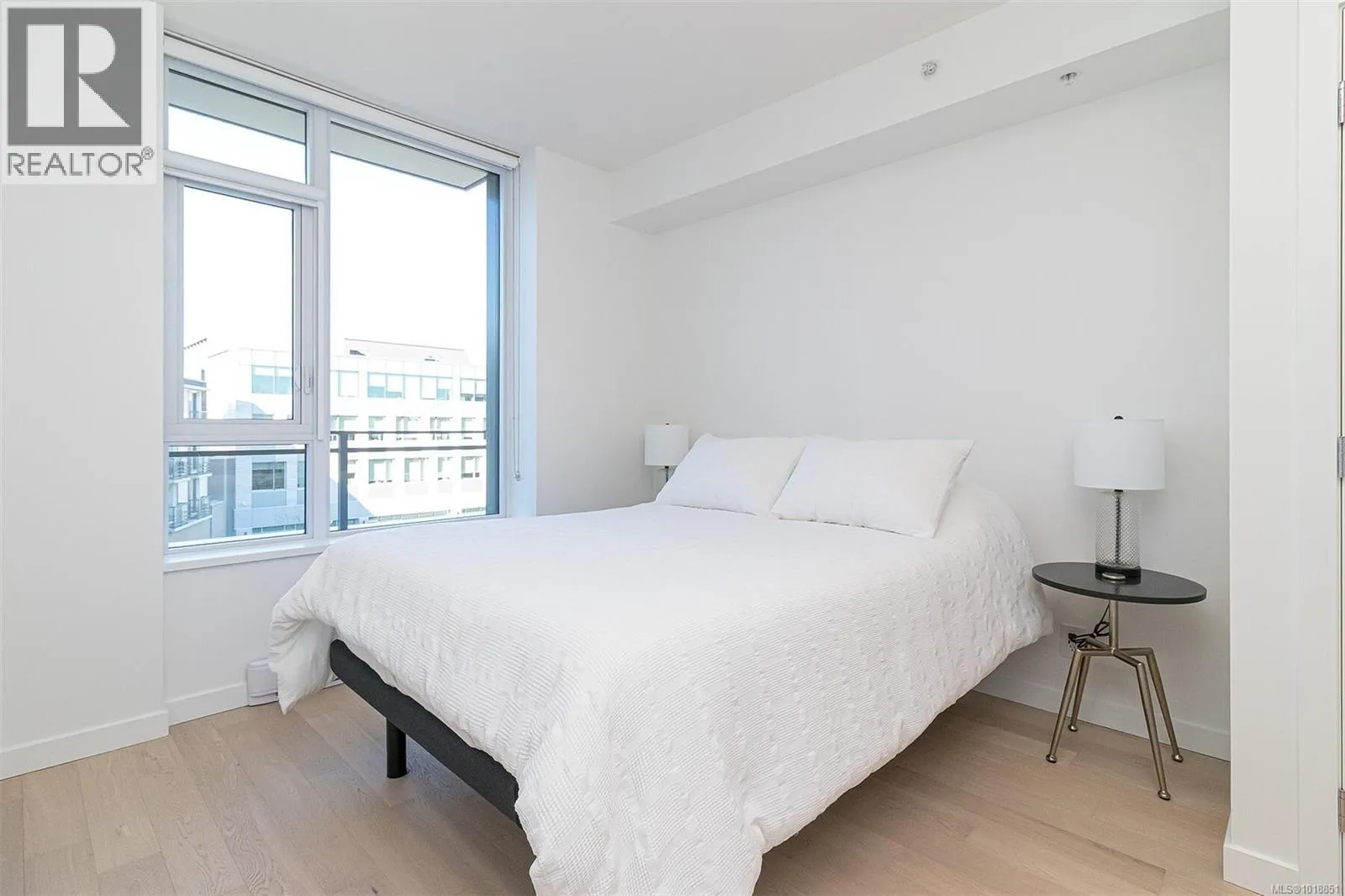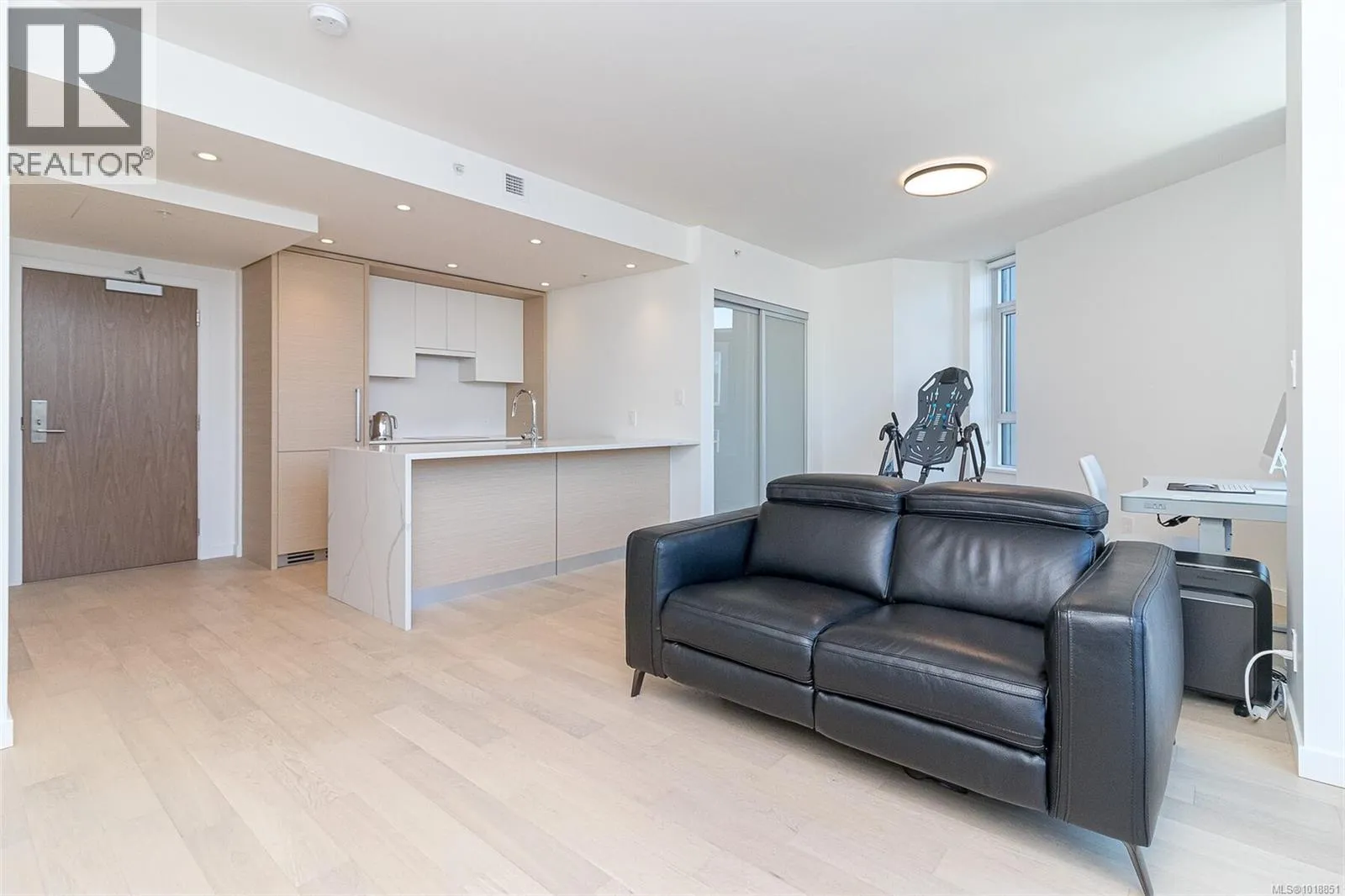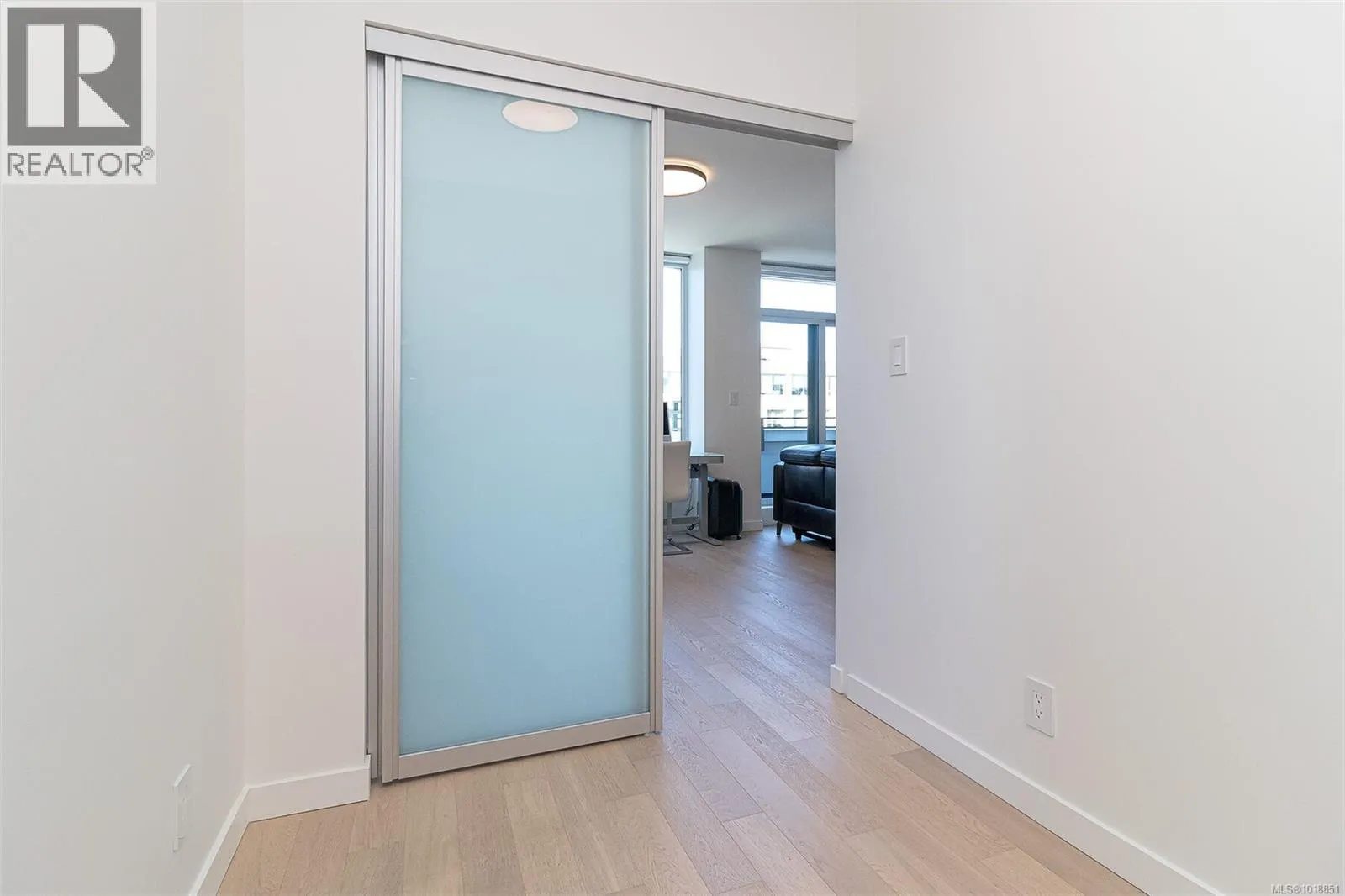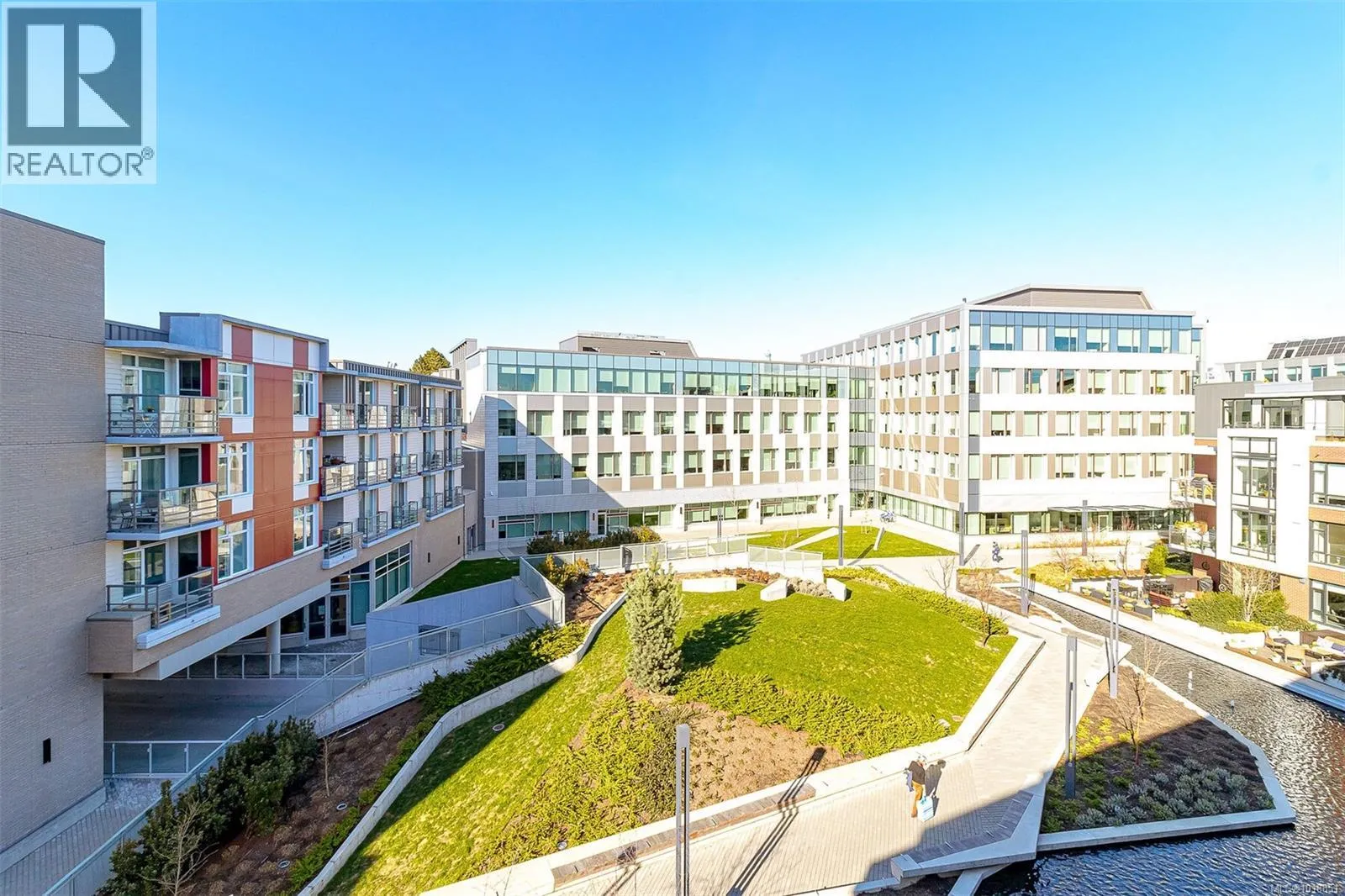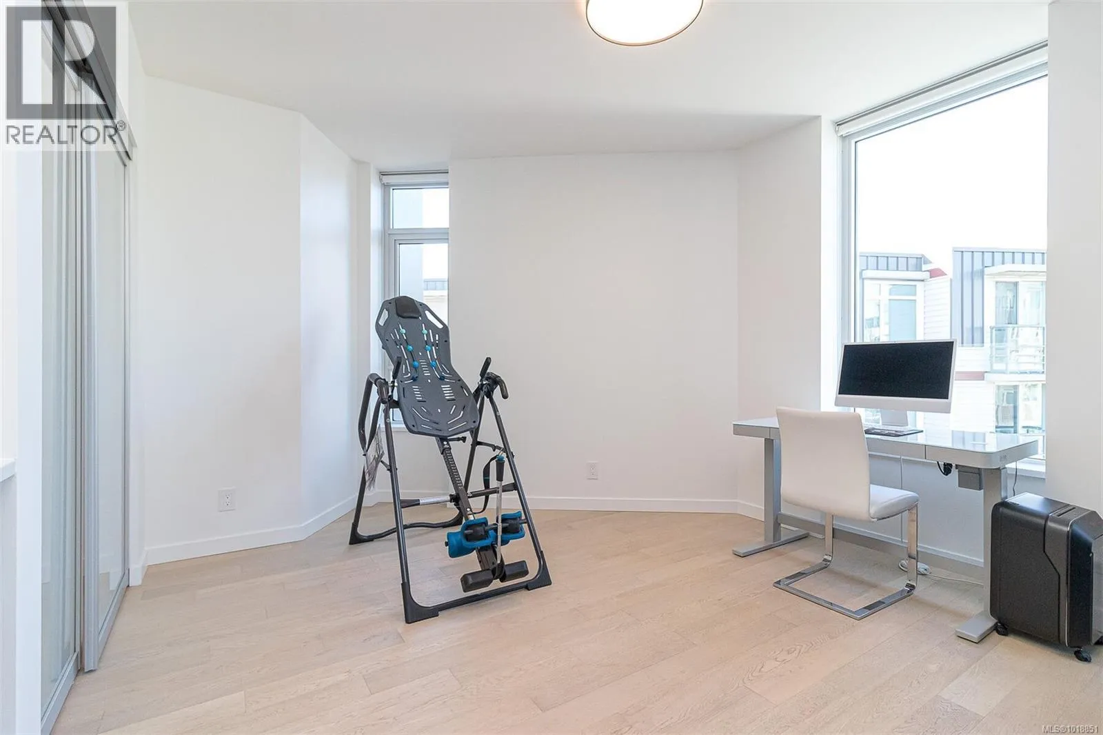 Welcome to Capital Park Residences! One Bedroom plus Den Unit! Master-plan community brought to you by award winning Concert & Jawl Properties. Situated in the heart of Victoria's Historic Inner Harbor, take advantage of the lifestyle presented: steps to downtown, Fisherman's Wharf, Red Barn Market, Good Earth & Discovery Coffee! Rarely do resales come available & its obvious why once entering this immaculately kept 1Bed+Den & 1Bath home. This executive 725 sq/ft TOP floor unit will surely impress. Enjoy a luxurious kitchen w/a quartz waterfall island & backsplash, integrated Bosch apps, custom built-ins & beautiful Cabinetry. A bright, open Floorplan is highlighted w/large windows (& custom Phantom screens) & a generous patio overlooking the common courtyard. A Den w/built-ins is perfect for that home office or young ones. An elegant cheater Ensuite showcases in-floor heating & a custom shower & medicine cabinet. Bonus amenities: Gym, Serenity Lounge, 1Parking, Storage & bike storage! (id:27476)