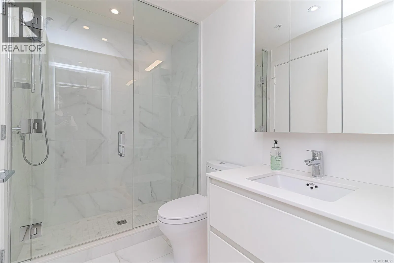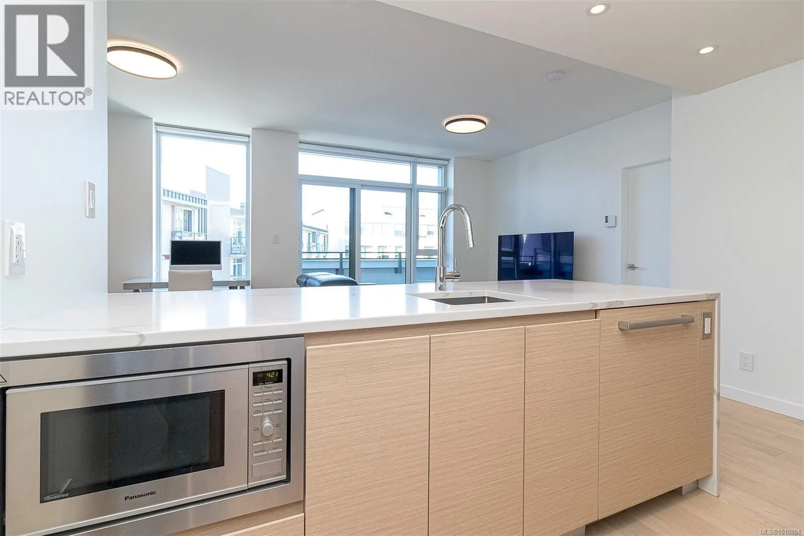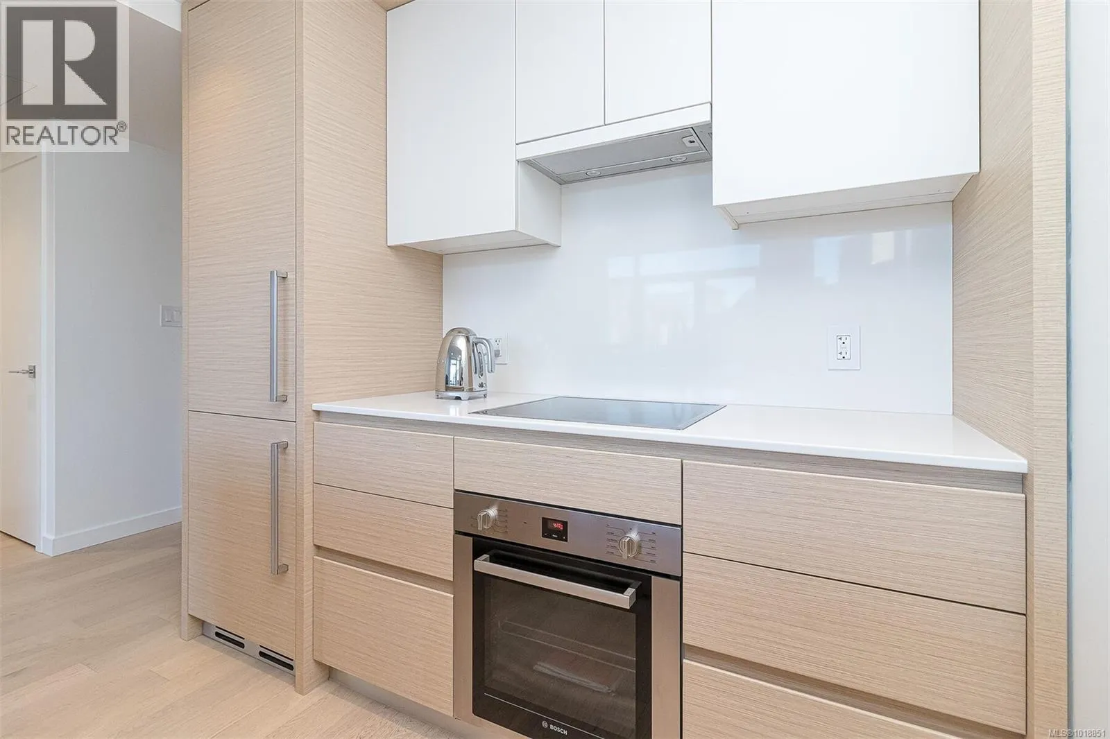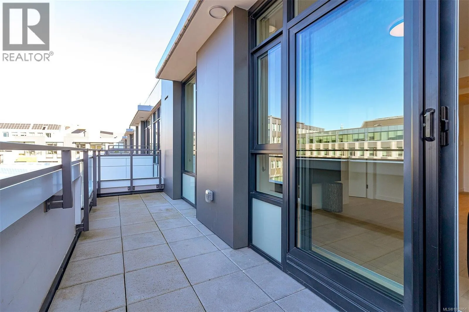 Welcome to Capital Park Residences! One Bedroom plus Den Unit! Master-plan community brought to you by award winning Concert & Jawl Properties. Situated in the heart of Victoria's Historic Inner Harbor, take advantage of the lifestyle presented: steps to downtown, Fisherman's Wharf, Red Barn Market, Good Earth & Discovery Coffee! Rarely do resales come available & its obvious why once entering this immaculately kept 1Bed+Den & 1Bath home. This executive 725 sq/ft TOP floor unit will surely impress. Enjoy a luxurious kitchen w/a quartz waterfall island & backsplash, integrated Bosch apps, custom built-ins & beautiful Cabinetry. A bright, open Floorplan is highlighted w/large windows (& custom Phantom screens) & a generous patio overlooking the common courtyard. A Den w/built-ins is perfect for that home office or young ones. An elegant cheater Ensuite showcases in-floor heating & a custom shower & medicine cabinet. Bonus amenities: Gym, Serenity Lounge, 1Parking, Storage & bike storage! (id:27476)