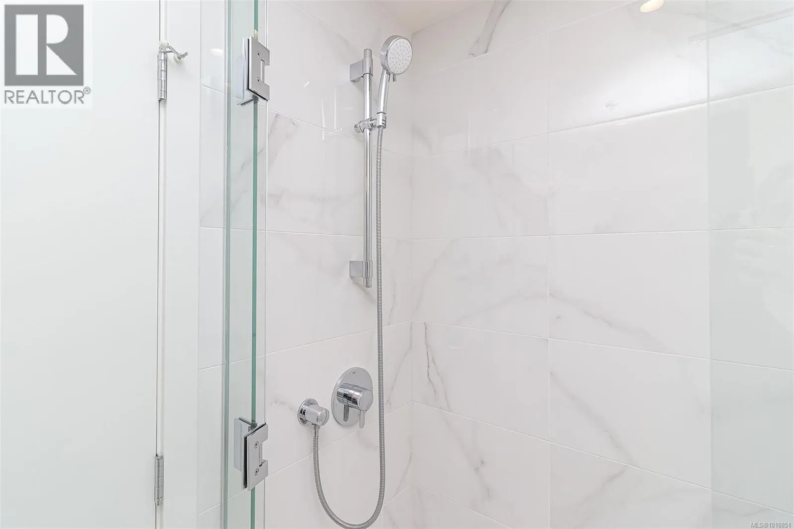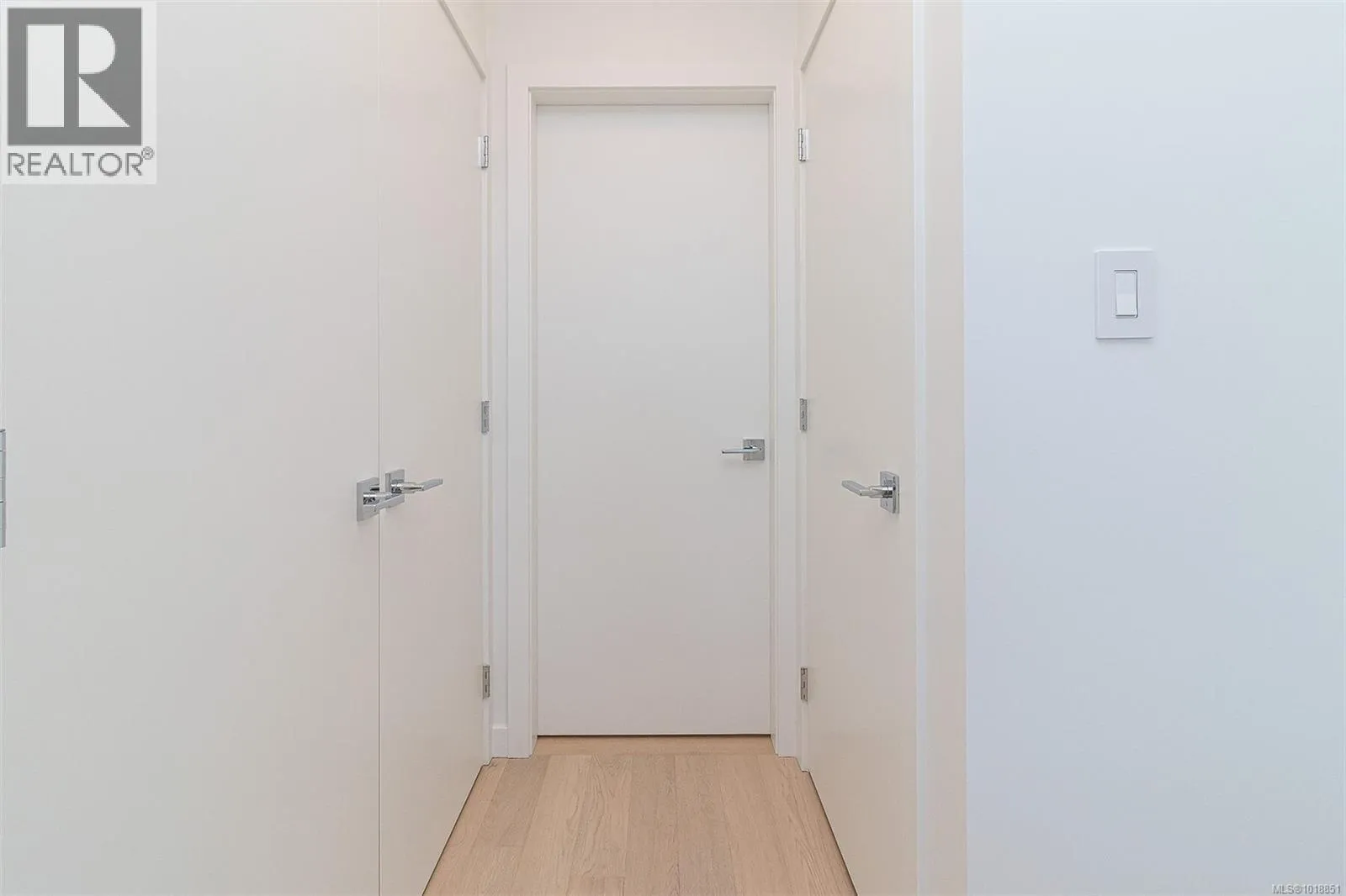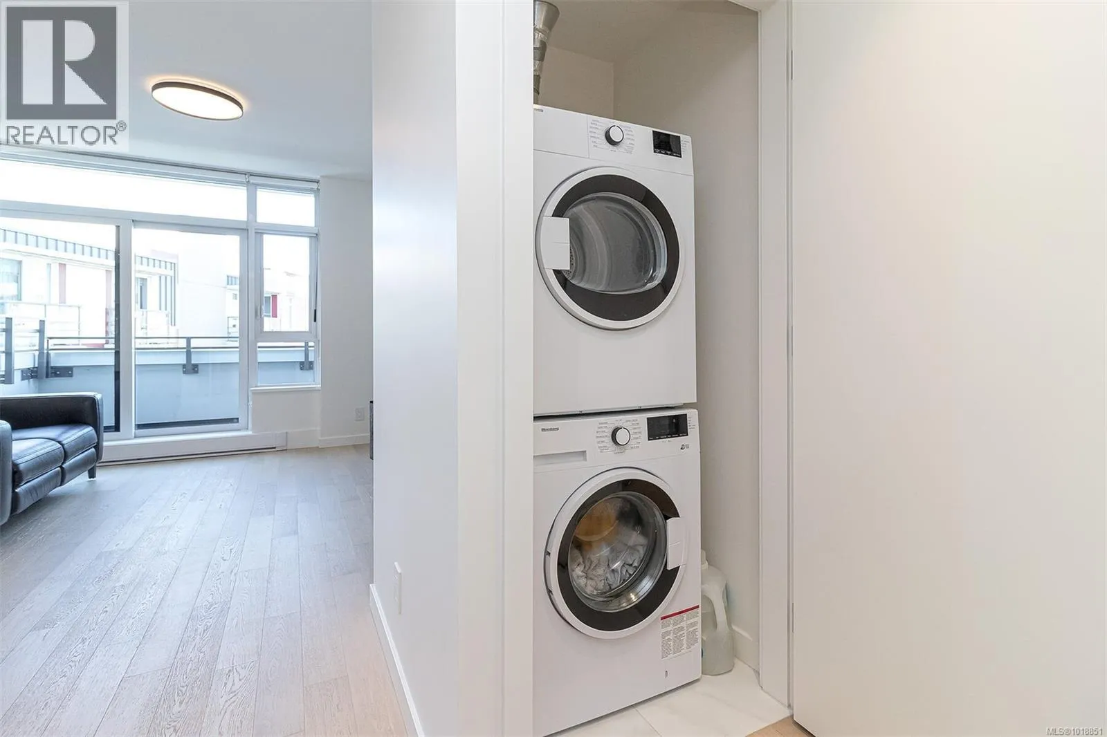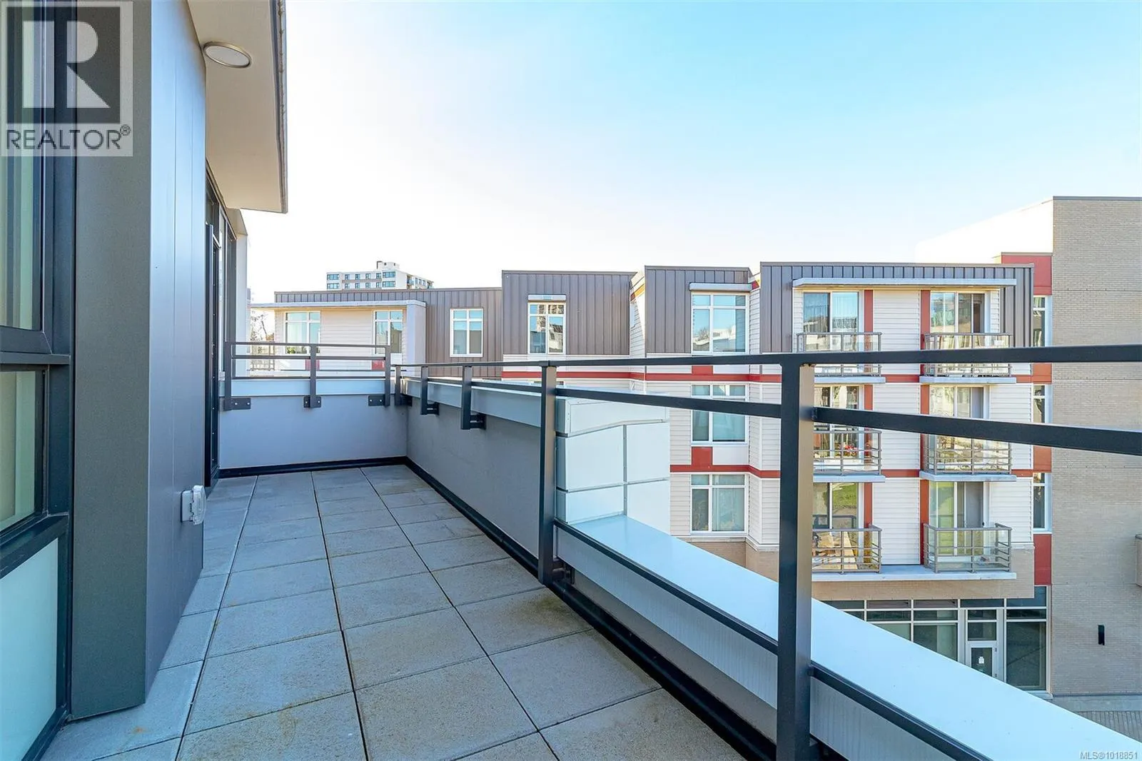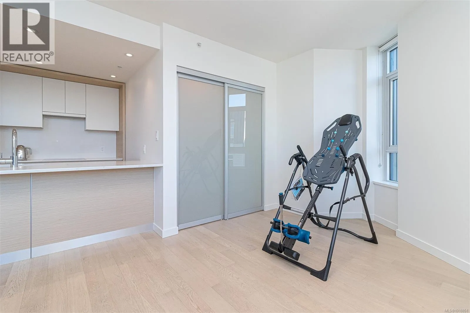 Welcome to Capital Park Residences! One Bedroom plus Den Unit! Master-plan community brought to you by award winning Concert & Jawl Properties. Situated in the heart of Victoria's Historic Inner Harbor, take advantage of the lifestyle presented: steps to downtown, Fisherman's Wharf, Red Barn Market, Good Earth & Discovery Coffee! Rarely do resales come available & its obvious why once entering this immaculately kept 1Bed+Den & 1Bath home. This executive 725 sq/ft TOP floor unit will surely impress. Enjoy a luxurious kitchen w/a quartz waterfall island & backsplash, integrated Bosch apps, custom built-ins & beautiful Cabinetry. A bright, open Floorplan is highlighted w/large windows (& custom Phantom screens) & a generous patio overlooking the common courtyard. A Den w/built-ins is perfect for that home office or young ones. An elegant cheater Ensuite showcases in-floor heating & a custom shower & medicine cabinet. Bonus amenities: Gym, Serenity Lounge, 1Parking, Storage & bike storage! (id:27476)