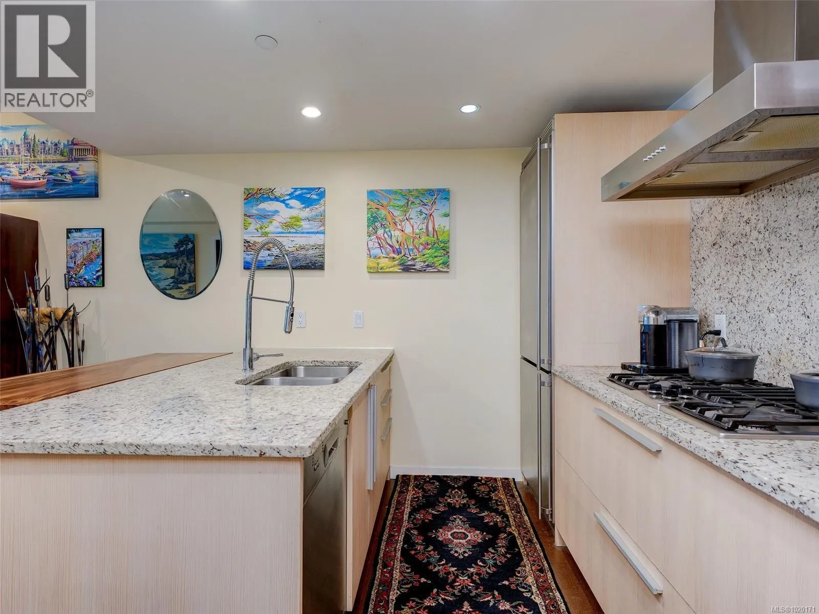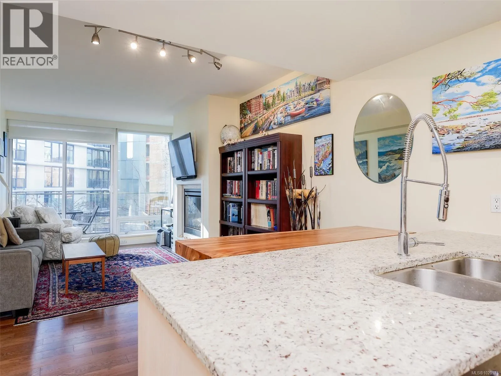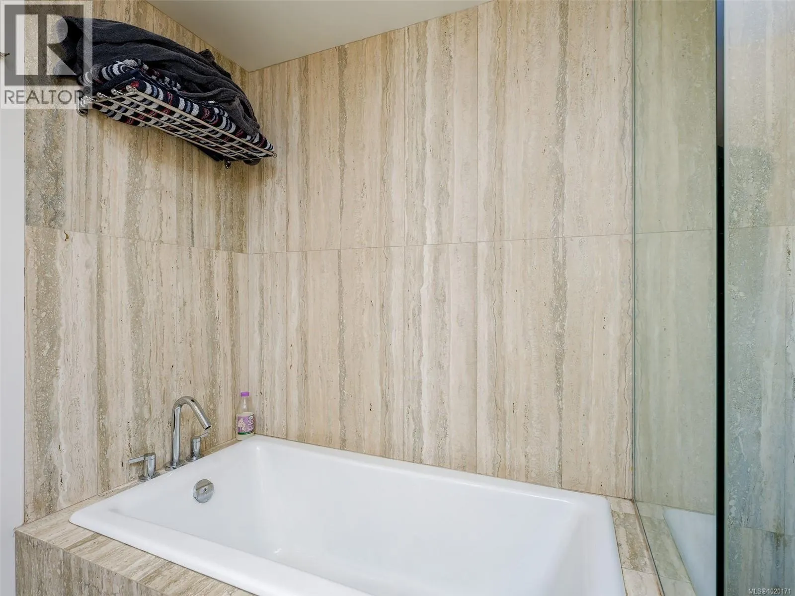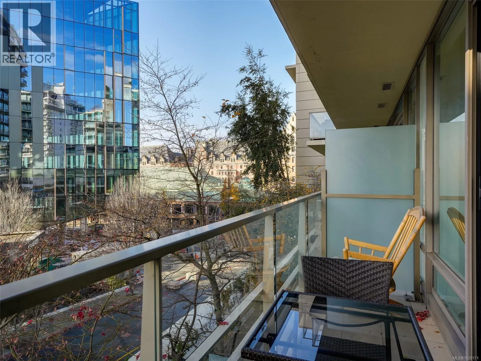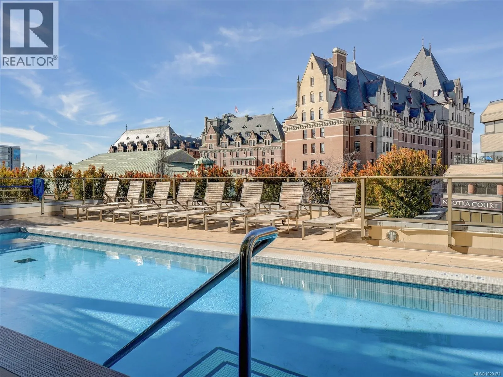 Bright, sunny, immaculate 1 bed and 1 bath unit at The Falls, one of Victoriaâs most desirable downtown addresses. Situated in the south tower along Burdett Ave, you have instant access to the inner harbour, trendy restaurants, and vibrant neighbourhoods. The ideal lifestyle for an urban dweller, busy downtown office worker, or for those who want to be in the heart of the city. This stylish unit checks all the boxes for today's discerning buyers and tenants. Full size stainless steel appliances, gas range, granite countertops, fireplace, rollershades, and open concept living. The spacious spa-like bathroom has double sinks, tiled shower, and deep soaker tub. Enjoy the hot island summers comfortably in your air conditioned unit with access to an outdoor pool, jacuzzi, gym. A coveted luxury for downtown condo living. One parking, external storage, up to 2 dogs/cats up to 25lbs and resident caretaker. Call today! (id:27476)