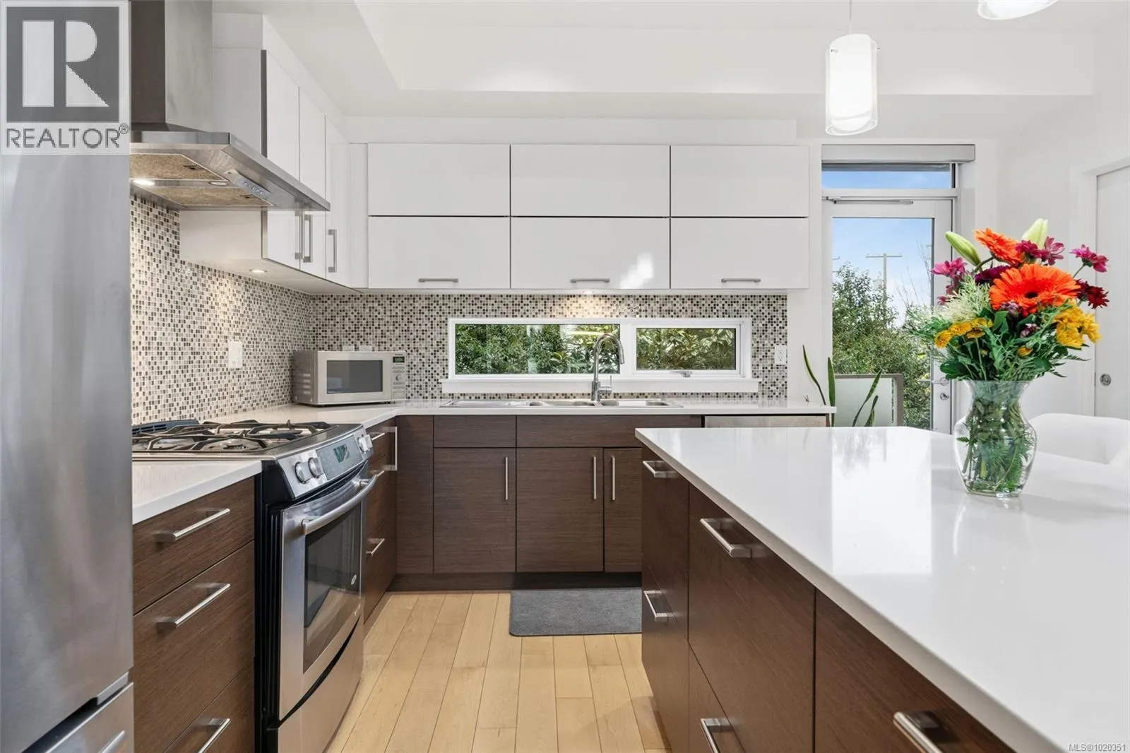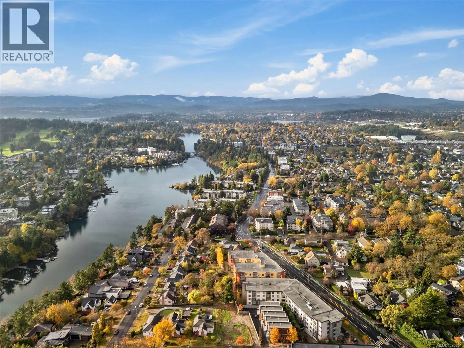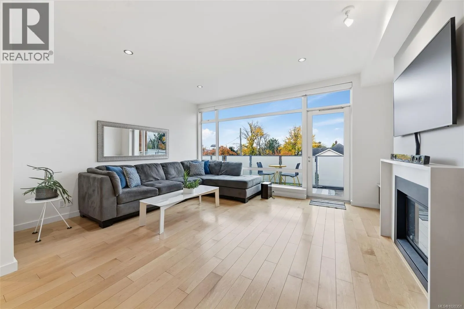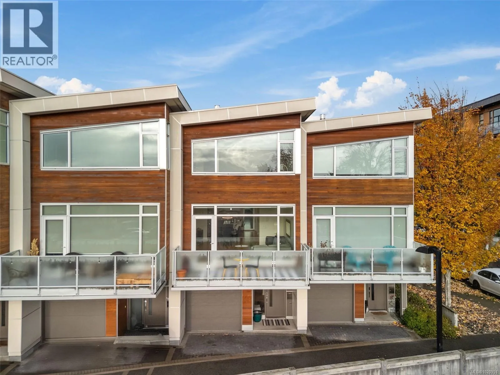 O/H Sat Nov 22nd 1-3 pm Steps from the Gorge Waterway, this vibrant south-facing townhome is close to parks, the Galloping Goose, shops, transit, and nearby schools and Montessori options. With over 2,000 sq ft, this one-owner home is freshly painted and well maintained, offering in-floor hot-water radiant heat, beautiful tile and hardwood, and construction engineered to extreme earthquake standards. The entry level includes a garage and a flexible bedroom/family room beside a full bath, opening to a generous private patio. The main level features two decks, a powder room, and an open-concept kitchen with high-end cabinets, gas range, large island, and abundant storage, flowing into the dining area and a bright living room with fireplace. Upstairs are two inviting bedrooms, including a vaulted primary with a luxe ensuite and built-ins. Schedule your visit today! (id:27476)