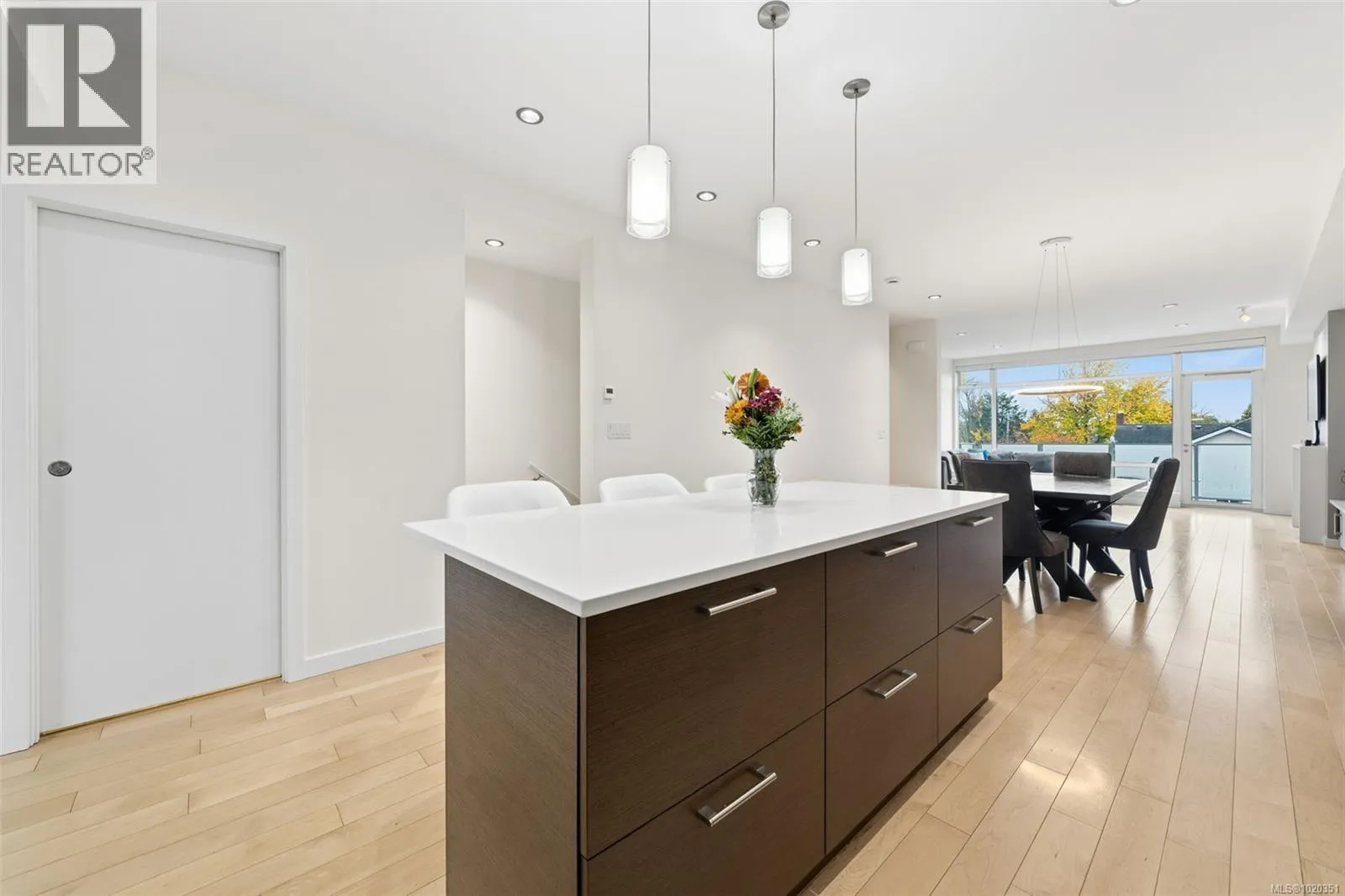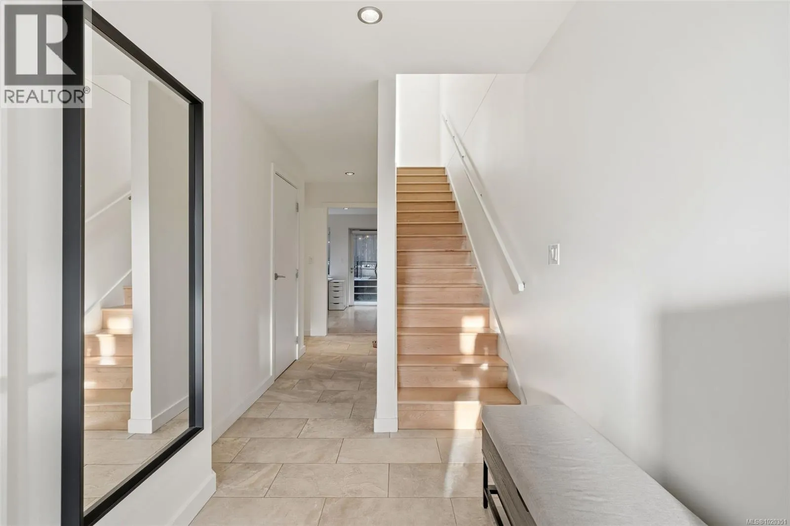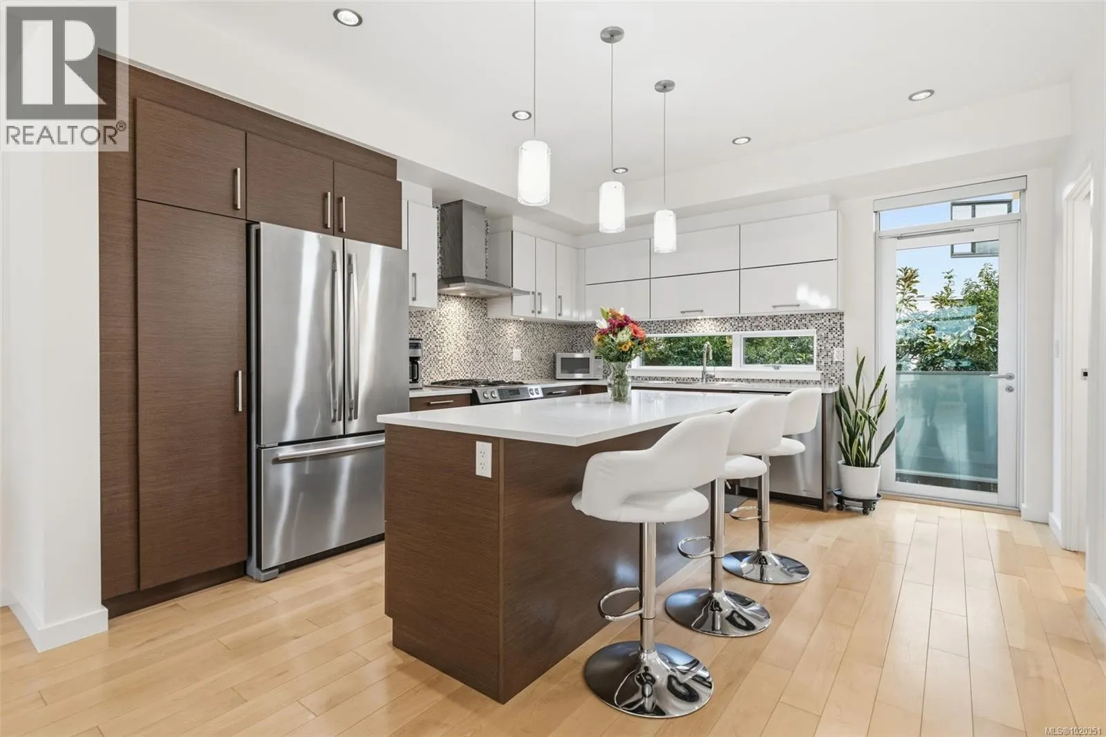 O/H Sat Nov 22nd 1-3 pm Steps from the Gorge Waterway, this vibrant south-facing townhome is close to parks, the Galloping Goose, shops, transit, and nearby schools and Montessori options. With over 2,000 sq ft, this one-owner home is freshly painted and well maintained, offering in-floor hot-water radiant heat, beautiful tile and hardwood, and construction engineered to extreme earthquake standards. The entry level includes a garage and a flexible bedroom/family room beside a full bath, opening to a generous private patio. The main level features two decks, a powder room, and an open-concept kitchen with high-end cabinets, gas range, large island, and abundant storage, flowing into the dining area and a bright living room with fireplace. Upstairs are two inviting bedrooms, including a vaulted primary with a luxe ensuite and built-ins. Schedule your visit today! (id:27476)