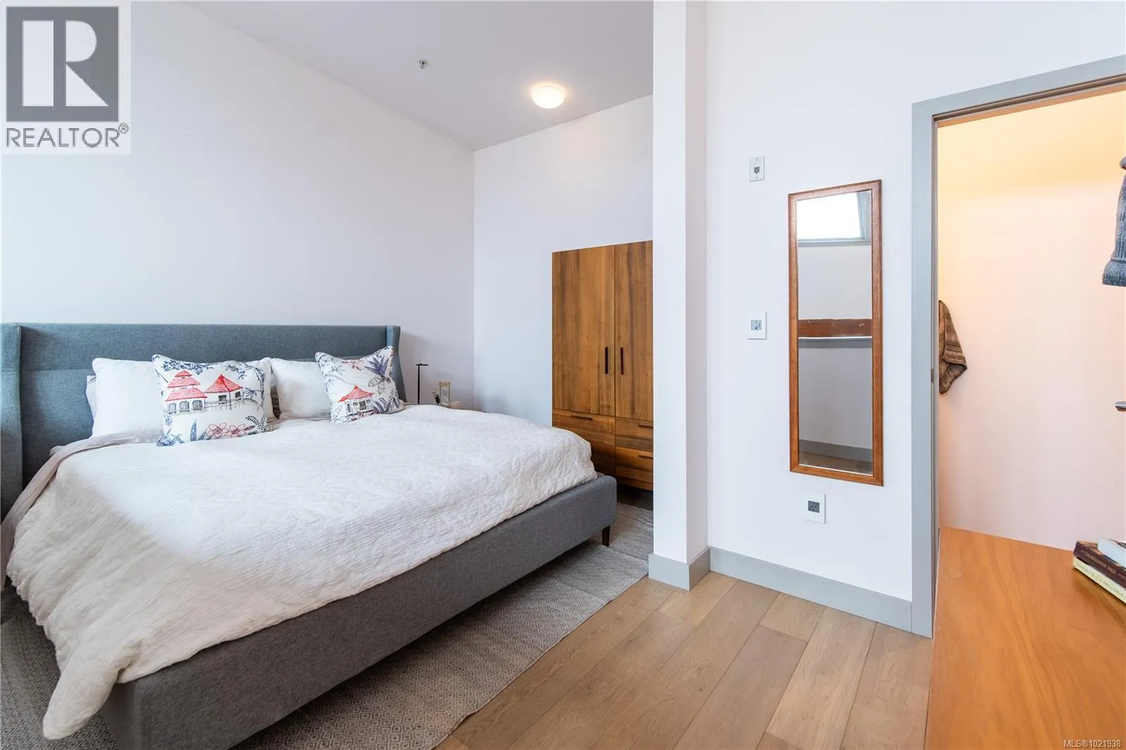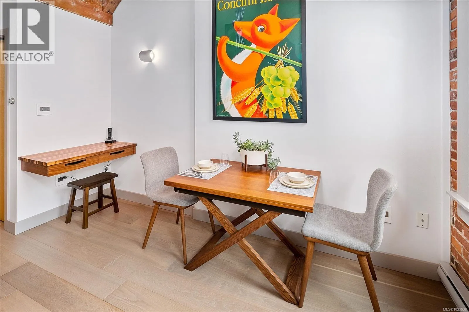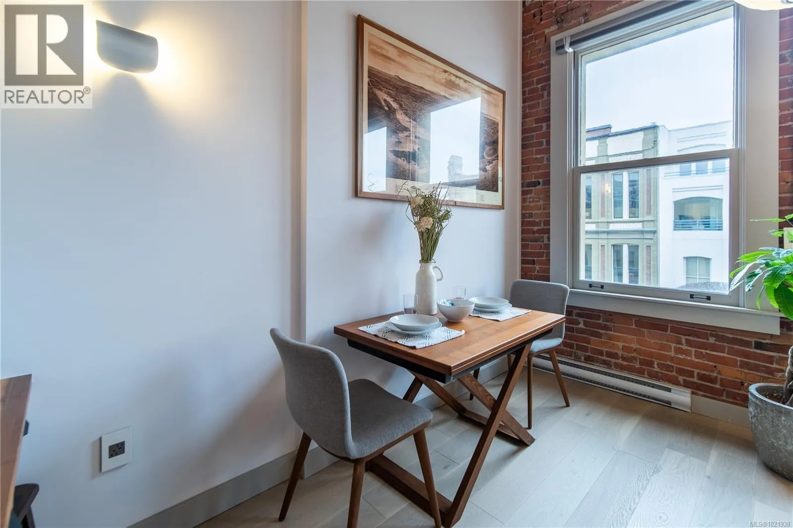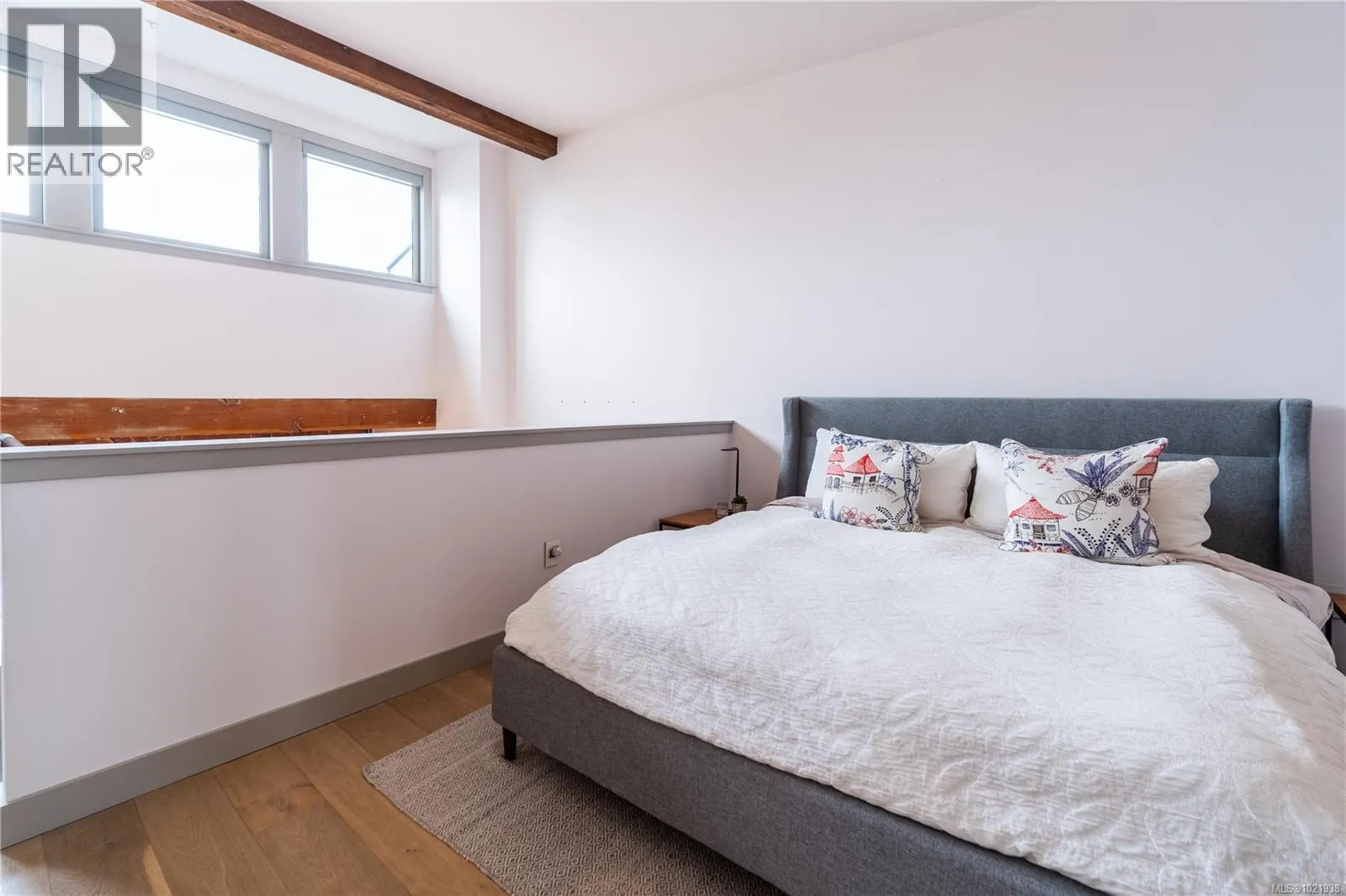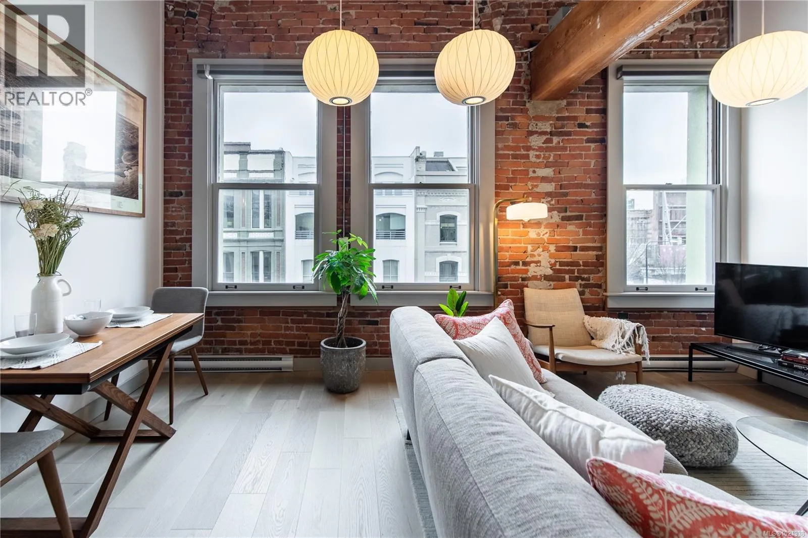 COOLEST LOFT IN YYJ! Luxury Heritage Loft in Victoriaâs Downtown Core. Welcome to The Vogueâa premier steel-and-concrete heritage conversion offering a perfect blend of historic charm and modern luxury. Located in Victoriaâs vibrant downtown core, this exceptional loft boasts over $77,000 in premium upgrades. Step inside to soaring 21-foot ceilings, exposed old-growth beams, and a stunning brick feature wall that add warmth and character. The open-concept living space is bathed in natural light from floor-to-ceiling windows, fitted w Hunter Douglas remote-controlled sheers + blackout blinds ($7,500 value). The gourmet kitchen is a showpiece, thoughtfully designed w custom cabinetry, stone countertops, and a stylish backsplash. Equipped w high-end European appliances, including a Bosch dishwasher ($2,500), Blomberg gas stove ($4,000), Blomberg fridge ($3,000), and premium sink & fixtures ($2,000). The cozy living area features a new Valor gas fireplace (installed 2025, $7,500 value) w custom tile work, creating an inviting focal point. Throughout the home, luxury lighting w dimmer switches ($5,000 value), designer bathroom cabinetry & upgrades ($8,000), built-in desk ($2,500). The spacious upper level features 11-foot ceilings, accommodating a king-sized bed, nightstands, and additional furniture w ease. The ensuite bath offers expansion potential, while the main-floor powder room was previously a full bath and can be converted back if desired. Enjoy your private 17-foot balcony w an irrigation system, perfect for outdoor relaxation. Additional conveniences include radiant floor heating, in-suite laundry, a large storage unit, and a secure parking space. Located in the heart of Victoriaâs downtown heritage district, The Vogue offers walkable access to the cityâs best restaurants, cafés, boutiques, and entertainment. With its extensive upgrades, high-end finishes, and unbeatable location, this is an incredible opportunity to own a truly one-of-a-kind luxury loft. (id:27476)