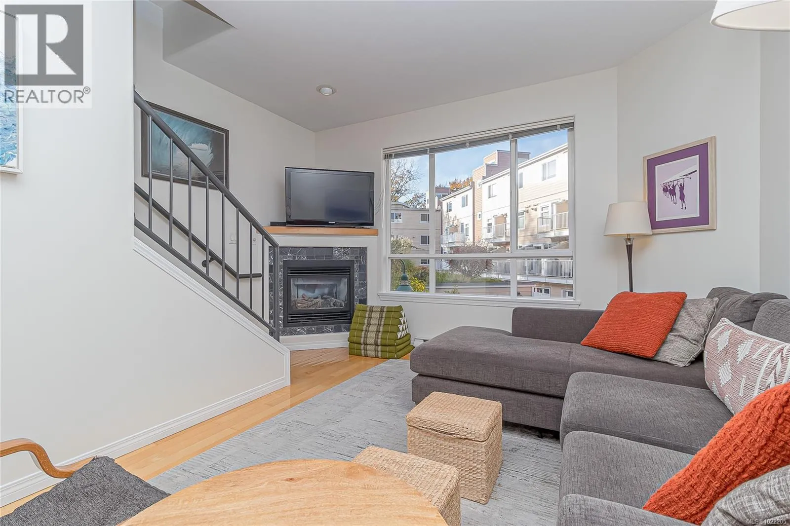 Bright and Upbeat 3-Bedroom, 3-Bath Townhome in James Bay. Ideally located along Dallas Road in the quieter part of James Bay, this beautifully maintained townhome is just steps from the sea, beaches, parks, Fishermanâs Wharf, the Ogden Point Breakwater, the Inner Harbour, and Downtown Victoria. The entry level features an oversized single-car garage and a versatile office/den or bedroom complete with a built-in Murphy bed. From here, enjoy access to the complexâs charming courtyard filled with mature plantings, gardens, pergolas, a picnic area, and plenty of additional parking. With 9-foot ceilings the main level boasts a stunning newly renovated kitchen with engineered maple flooring, quartz countertops, timeless cabinetry, stainless steel appliances, wine storage, and a large, functional island. The south-facing deck off the kitchen is perfect for soaking up the sun and overlooking the courtyard greenery and living rooftop gardens. The bright and spacious living/dining area features expansive windows, an open layout, and a cozy gas fireplace, perfect for relaxing or entertaining. The serene upper level includes laundry, two full bathrooms, and two bedrooms, including the luxurious and spacious primary suite that easily accommodates a king-sized bed. The spa-inspired ensuite offers double sinks, a soaker tub, a separate shower, and two skylights that flood the space with natural light. Enjoy the very best of coastal living in this gem of a home, part of one of James Bayâs most desirable and well-managed oceanside townhome communities. (id:27476)