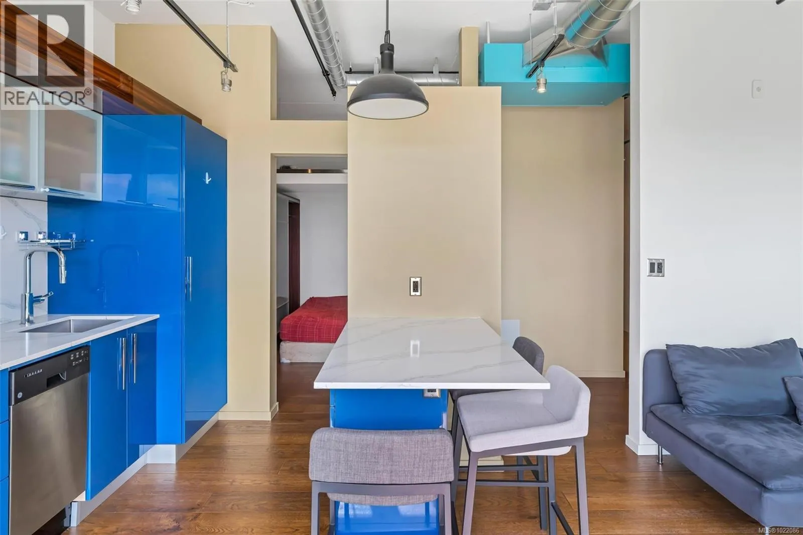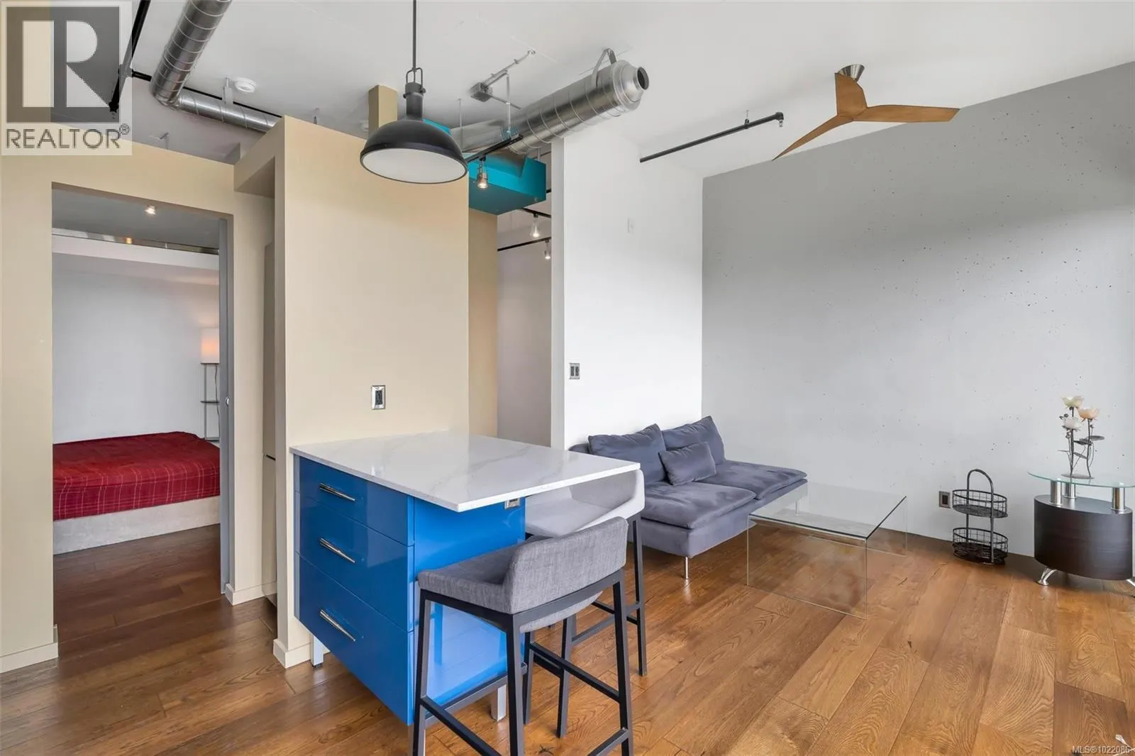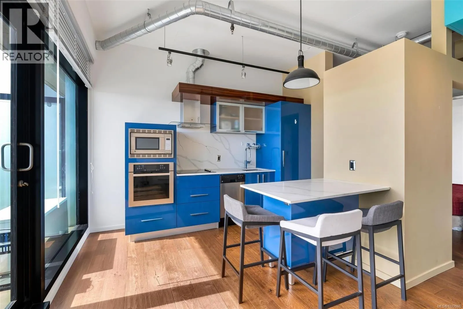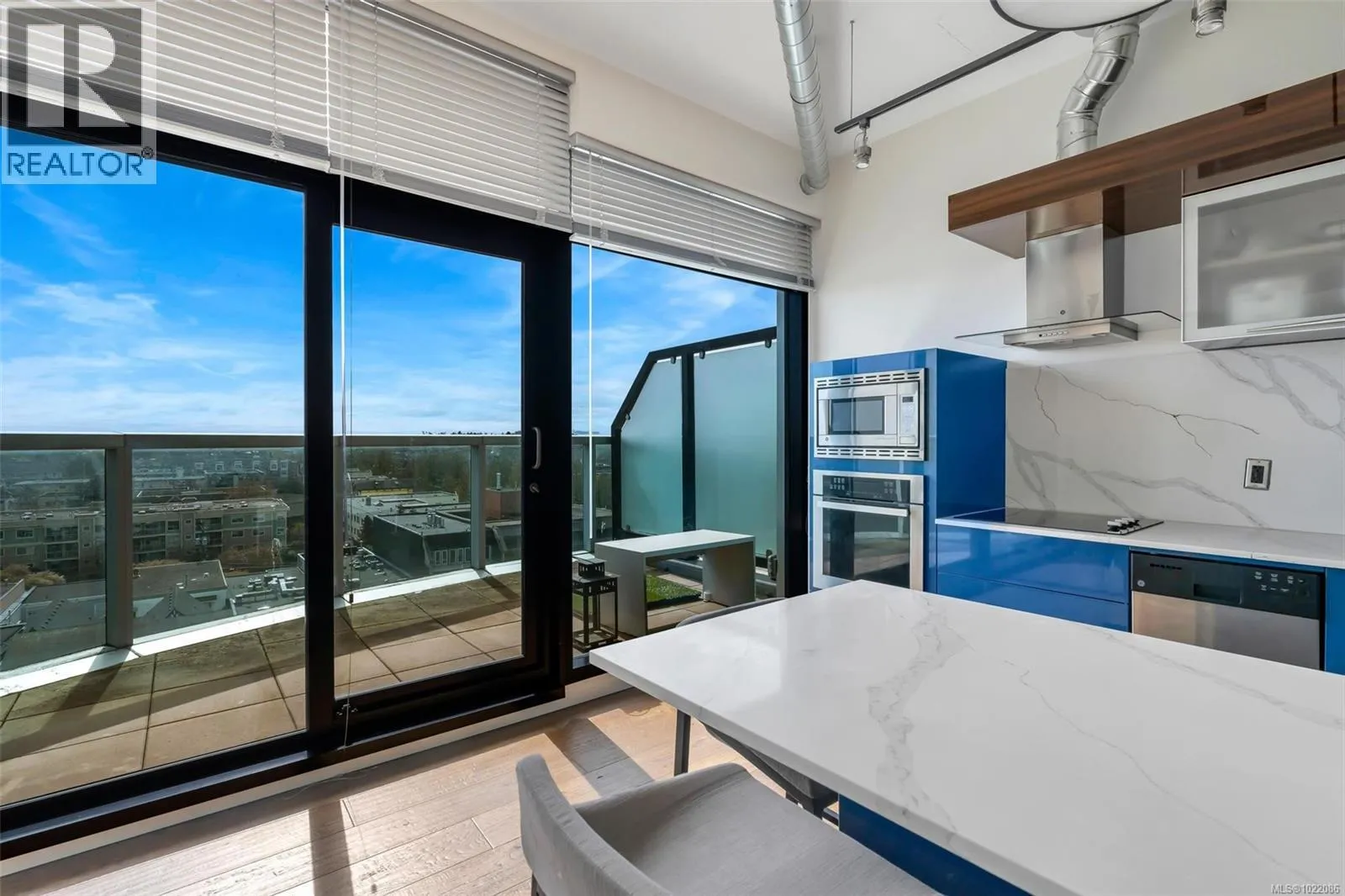 Bright 1-Bedroom Penthouse in Downtown Victoria This modern 1-bedroom penthouse, built in 2019, features 10-foot ceilings, floor-to-ceiling windows, and a bright open-concept layout filled with natural light. The contemporary kitchen offers quartz countertops, a central island, and built-in stainless steel appliances, seamlessly connecting to the living and dining areas. Enjoy outdoor living on the spacious 104 sq ft curved balcony, ideal for entertaining or relaxing. Additional highlights include secure underground parking, a storage locker, and bike storage. Residents enjoy access to building amenities such as a fitness centre, yoga area, and community lounge. Located just steps to Yates Street Market, shops, restaurants, and public transit, and only minutes to the Inner Harbour. Move-in ready, vacant, and easy to show, this home is ideal for both end users and investors. (id:27476)