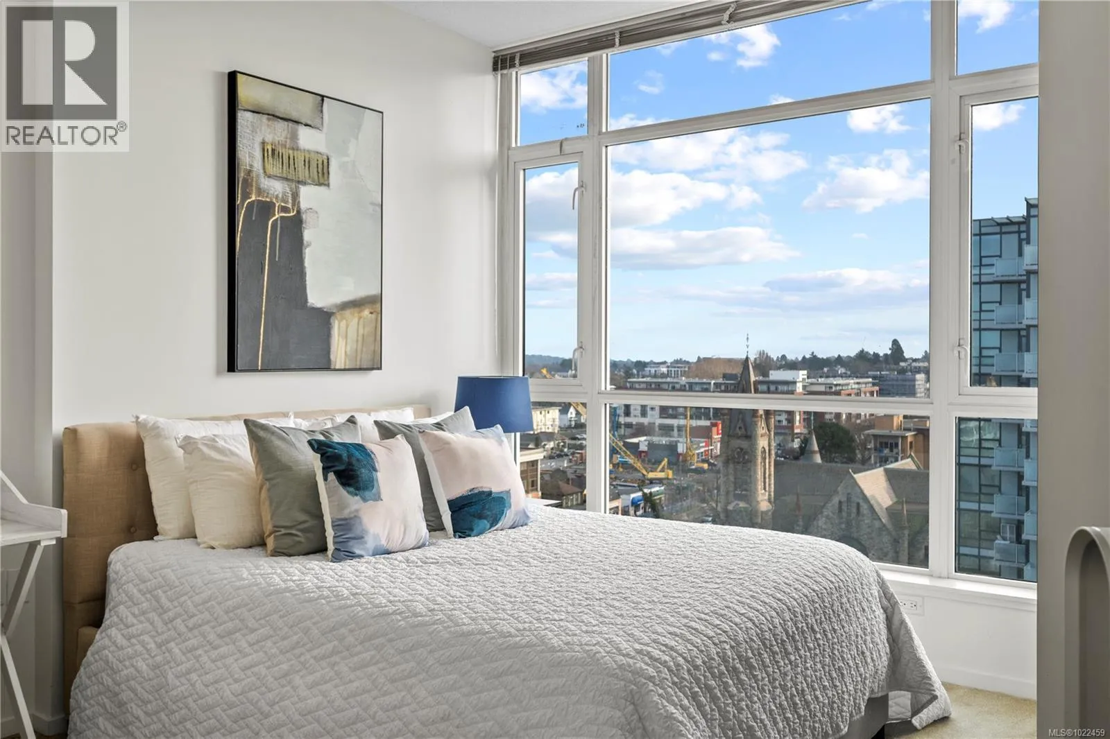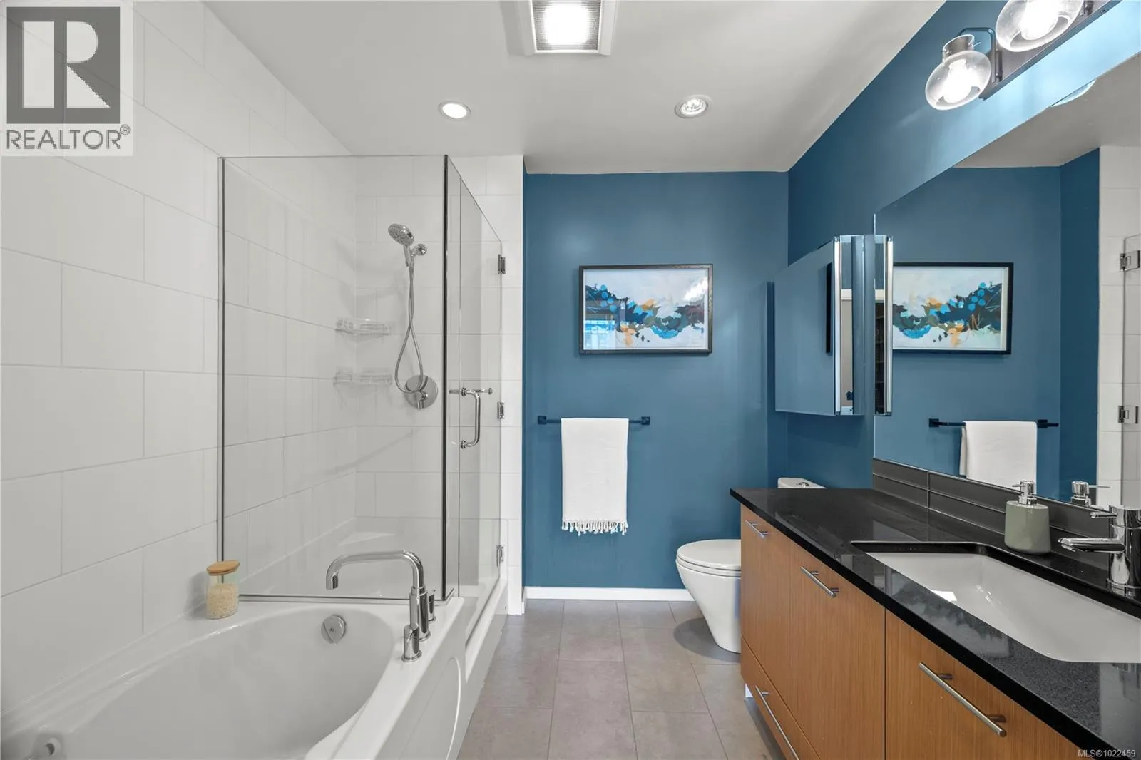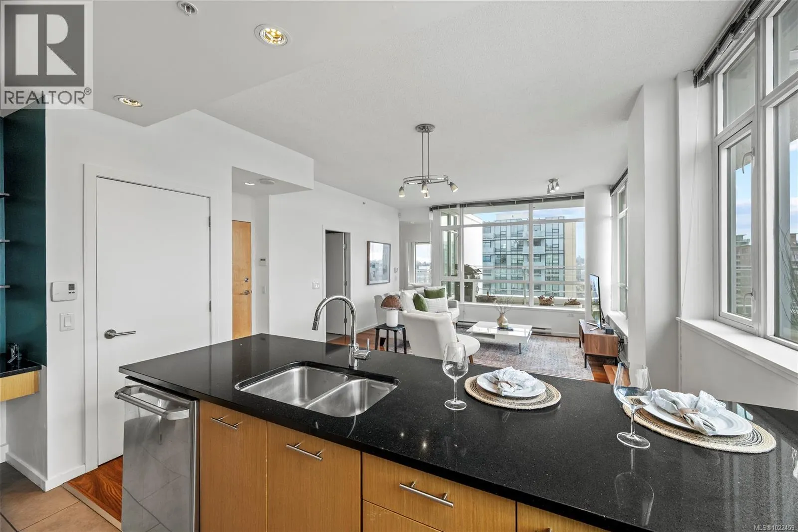 Beautiful OCEAN, Olympic Mountain, and City views from this sub Penthouse! Floor-to-ceiling windows and a sunny south exposure fill the home with light. Spectacular views sunrise to sunset from your kitchen, living room or massive (460 sqft)wrap around deck with gas and water hookups. Corner suite with open layout featuring: 2 balconies (virtually staged), warm hardwood floors, 9' ceilings, bathrooms with in-floor heating, stylish kitchen with granite countertops, ss appliances, and bar nook. The spacious Primary boasts walkthrough double closets and a spa-inspired ensuite. 2 dogs/2 cats or 1 of each allowed. Highly secure building with: a well managed strata, rooftop patio, media room, underground parking, bike storage, and storage locker. Steps to Inner Harbour, markets, cafes, Victoria culture scene, gyms/yoga studios, world-class dining + easy access to nature trails, beaches/boat launches and direct buses to Uvic. Priced to sell and ready to impress. Reach out today to book a viewing! (id:27476)