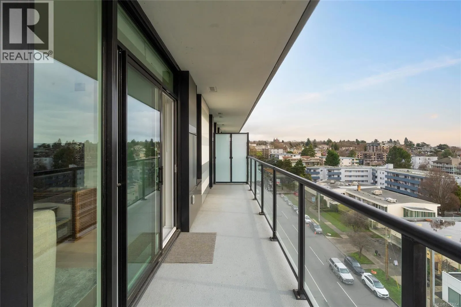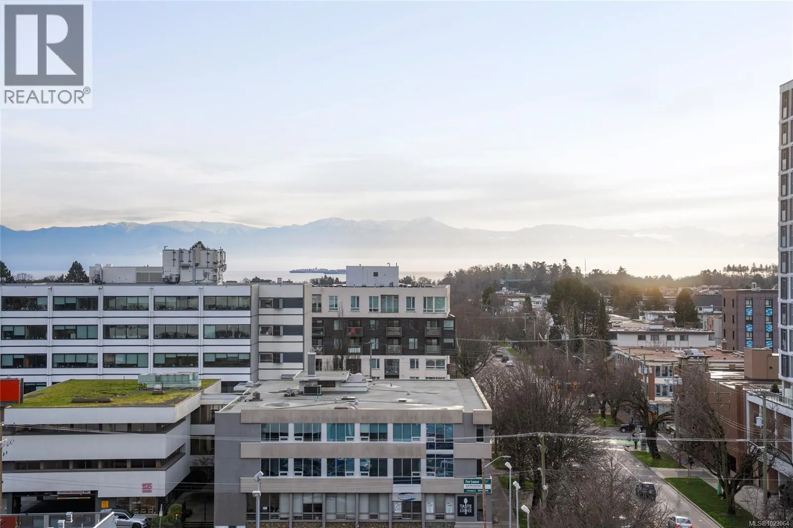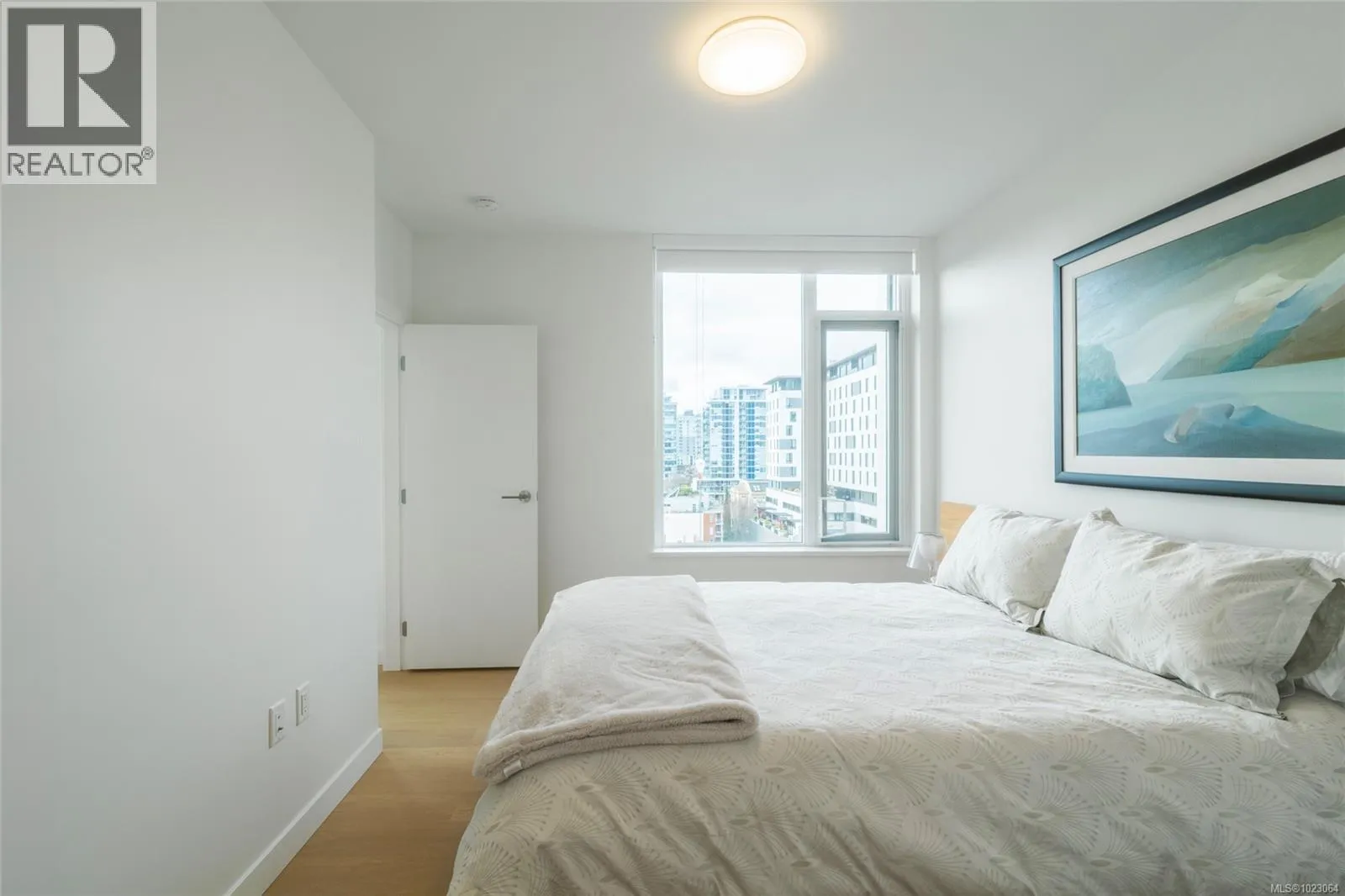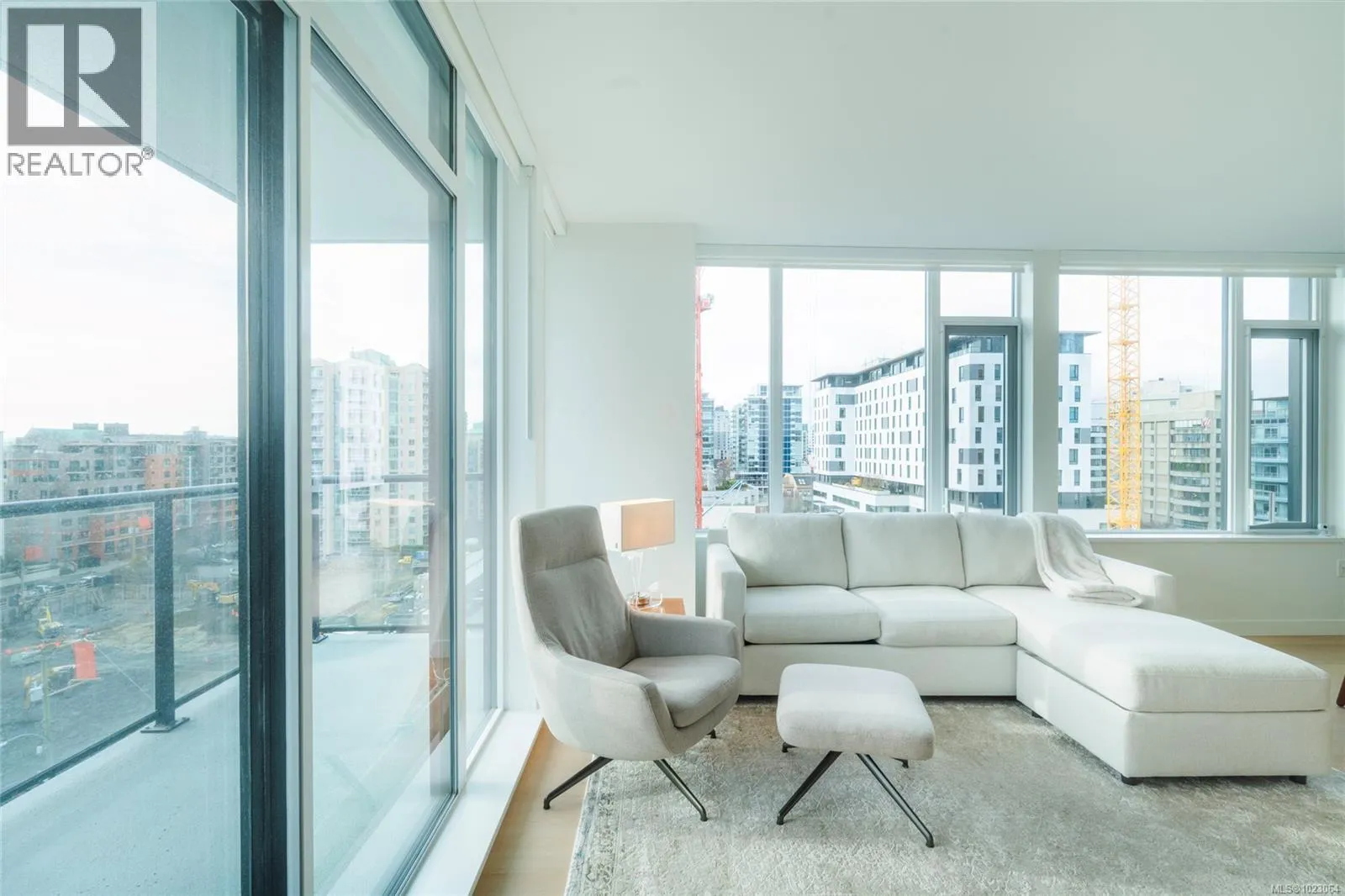 Nest by Chard presents the latest condominium offering from one of Victoriaâs most respected developers. Tucked into Fernwoodâs desirable southwest corner and cast in solid concrete, this boutique 12-storey midrise was completed in 2024 and offers refined urban living just a stoneâs throw from Downtownâclose to everything, yet quietly removed from the bustle. This signature southwest corner two-bedroom, two-bath residence is designed for year-round comfort with in-suite air conditioning and a continuous fresh air supply system. Expansive floor-to-ceiling windows bathe the interior in natural light, while the oversized south-facing balcony extends the living space outdoors, offering ocean views and an ideal setting for morning coffee or evening entertaining. The chef-inspired kitchen is both elegant and functional, featuring fully integrated Fisher & Paykel appliances, quartz waterfall countertops, a wine fridge, and a full-height pantry. Bedrooms are thoughtfully separated for privacy, each with generous walk-in closets and custom built-ins. The secondary bedroom is enhanced by a custom-built double Murphy bed with integrated bookshelf, storage cabinetry, and recessed lighting with remote controlâperfect for guests or a sophisticated home office. Spa-like bathrooms showcase heated tile floors, while a striking Bocci 28-series designer light fixture anchors the dining area. Additional custom closets extend through the front hall and laundry space for seamless organization. Included are parking, a large individual storage space, and bike lock-up, with a sought-after parking stall conveniently located near the main elevator and parkade entry. Building amenities include a gym, dog wash station, outdoor play area and MODO car share. Enjoy the ultimate convenience of downtown Victoria living, surrounded by acclaimed dining, boutique shopping, and cultural attractions. (id:27476)