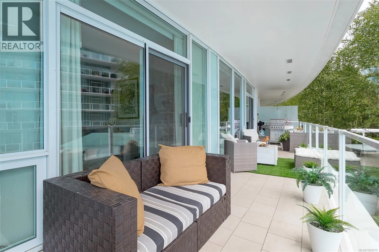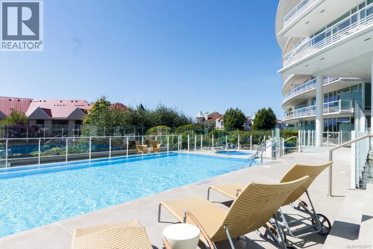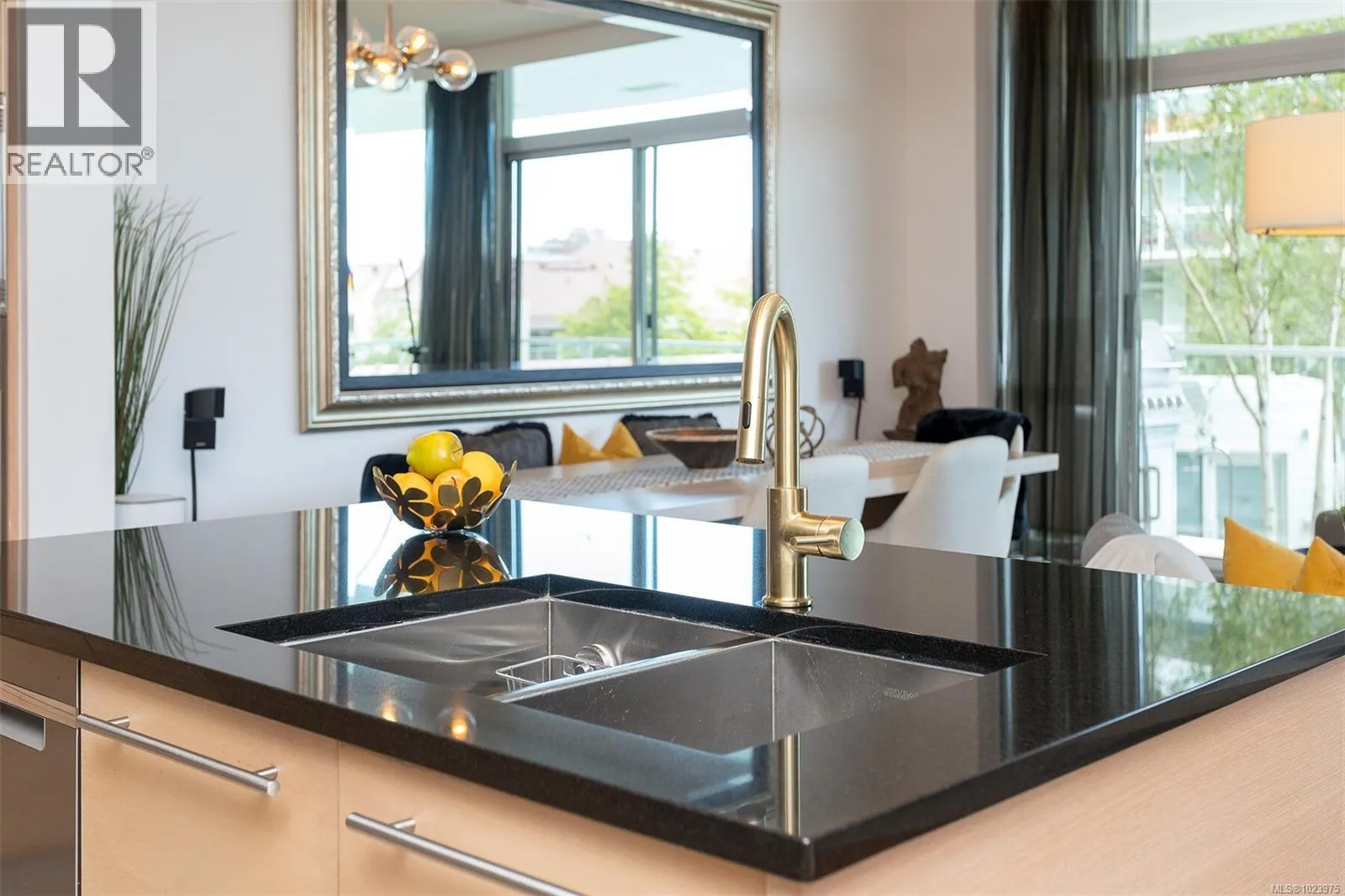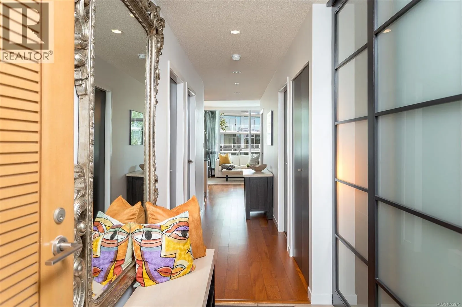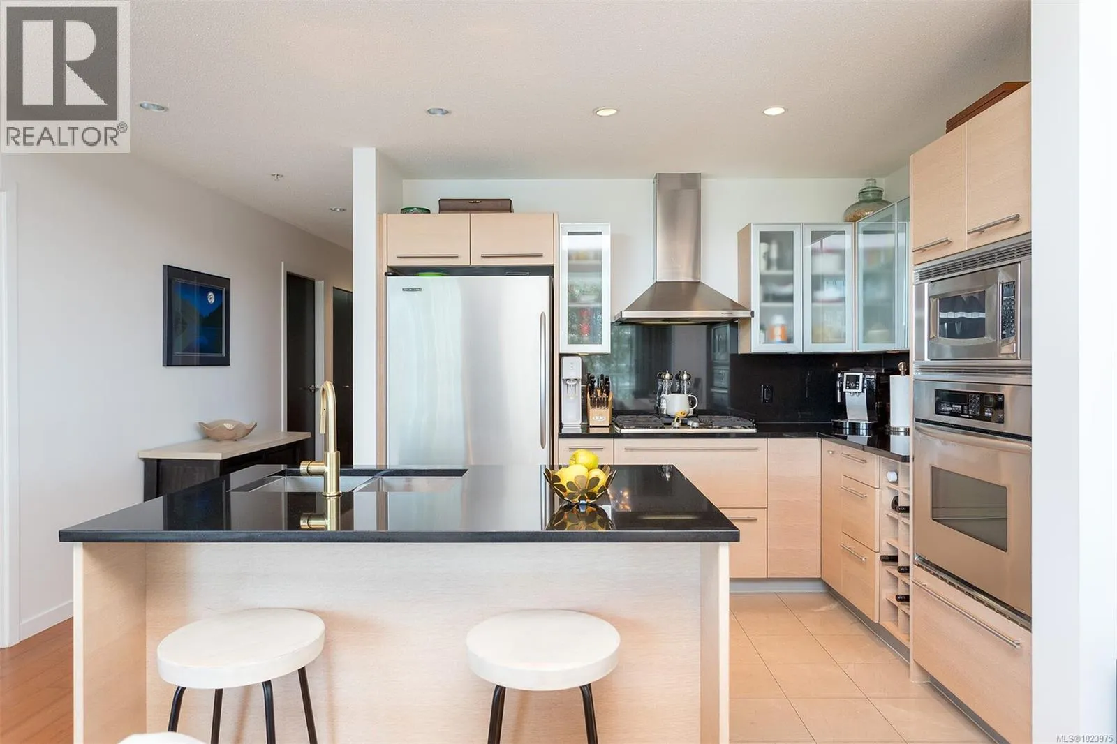 A SHOWPIECE in THE ICONIC SHUTTERS-customized and lightly lived in, original owner - this open concept suite is an anomaly in the development. Wonderful 2 bedrm+office, including a double size, custom rosewood, built-in wall cabinet/desk/''Murphy bed''(3rd bd), with 2 ensuite baths. Unique,very sought after floorplan & the ''only'' end unit of it's kind, offering views in 2 directions. Perched over the gurgling water features, fringed w/birch trees,providing quiet, privacy. Beyond the softly lit 75' infinity pool, the Parliament Blds illuminate the skyline, viewed from most rooms. Picturesque Cruise ships & Harbour lites on late balcony evenings!! 1st time avail since new, professionally designed, upgraded throughout. New appl-W/D, dishwasher, custom full granite designer kitchen w/ industrial style sink,tap,draperies,lighting,prof.paint throughout,upgraded hardwood throughout..Owner purchased highly sought after 2ND parking, now included, side/side, near elevators.(LS re details) Opportunity knocks...occasionally! (id:27476)