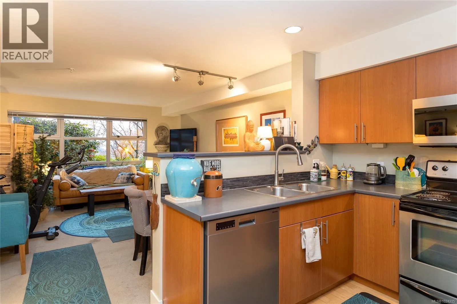 The Gateyard is a quality-built Vic West complex in the Railyards community fronting the Selkirk Waterway and close to the Galloping Goose Trail. Spacious 2 bedroom, 2 bath condo with 2 parking spots, separate storage and 2 pets allowed! 973 sq/ft plus a 309 sq.ft private and part covered garden patio. Cozy electric fireplace in the spacious livingroom, large kitchen with stainless appliances and wood floors. Nice open layout to the spacious livingroom and dining area with a cozy electric fireplace and leading to the entertaining sized patio. Primary bedroom has 4 piece ensuite and large closet space, in-suite laundry, 2 in ground secure parking spots. Short walk to amenities, and minutes to downtown Victoria. Pet friendly. (id:27476)