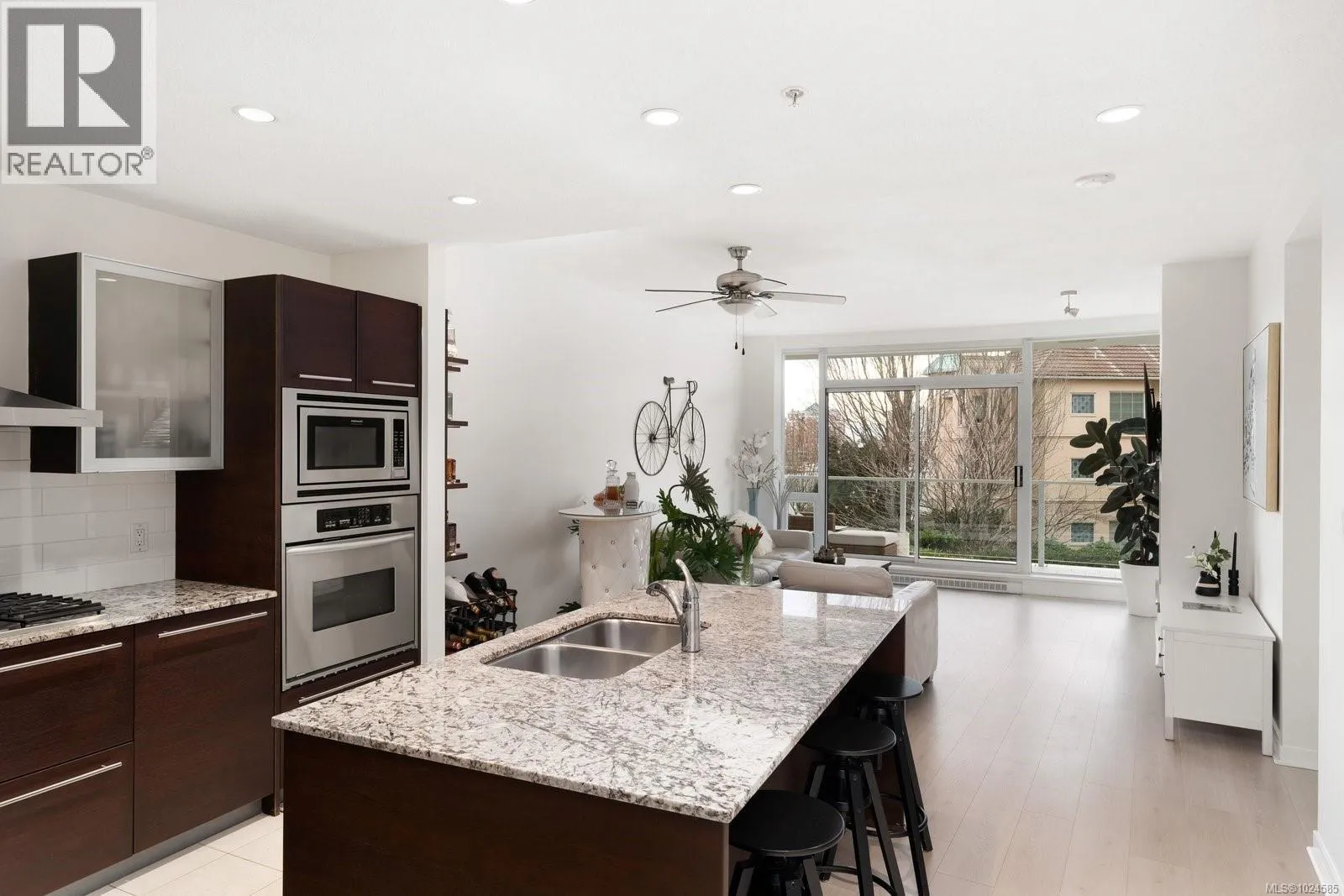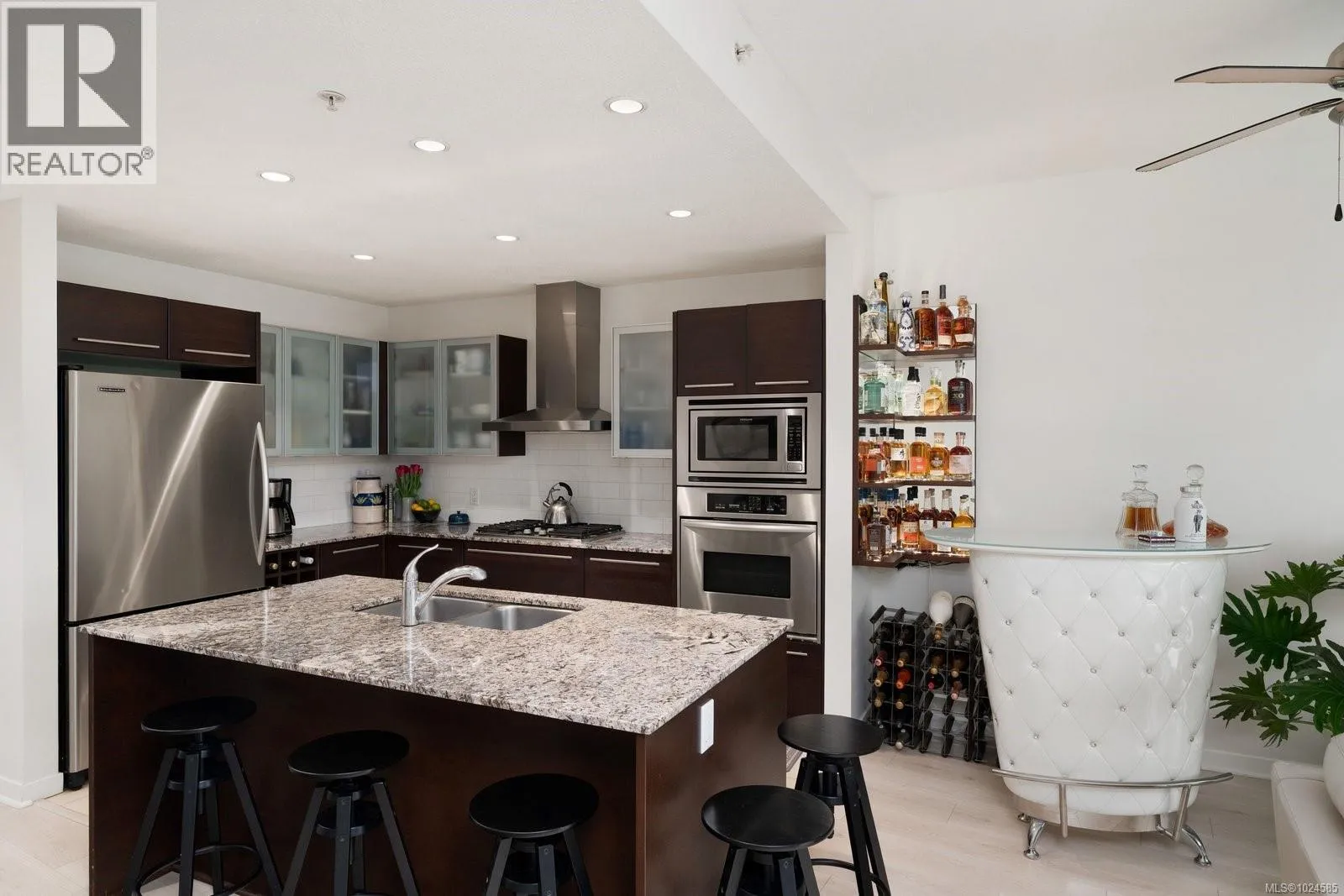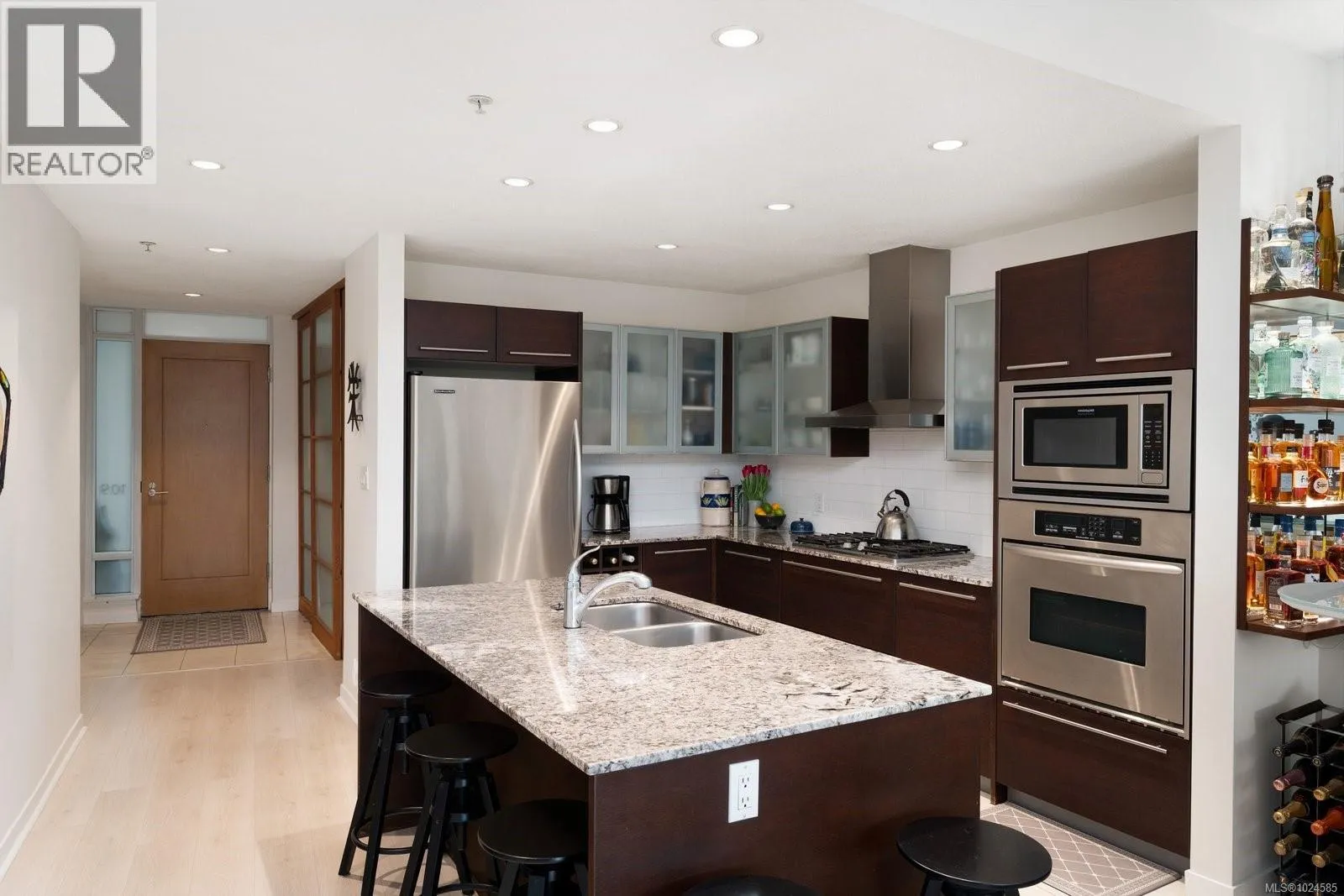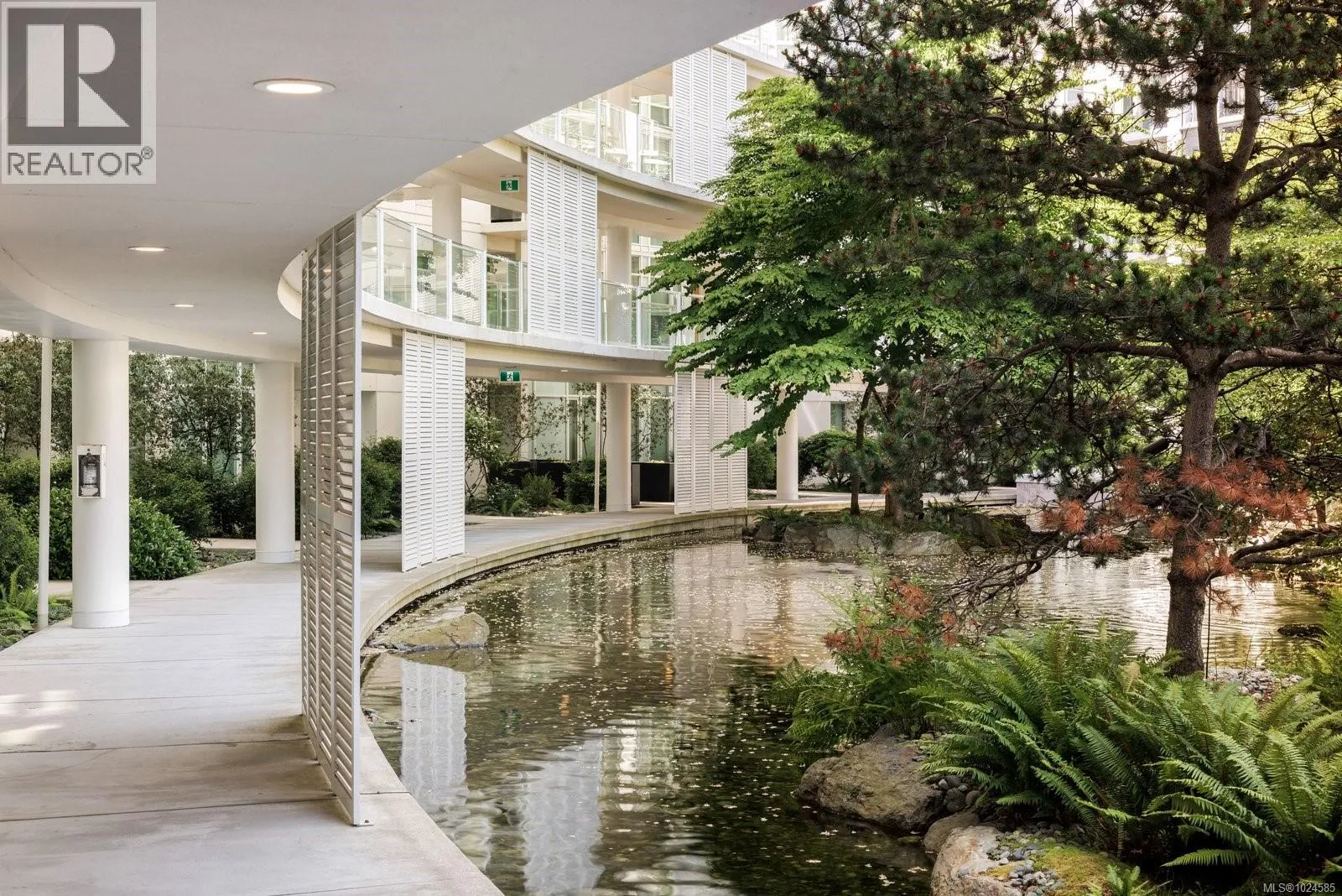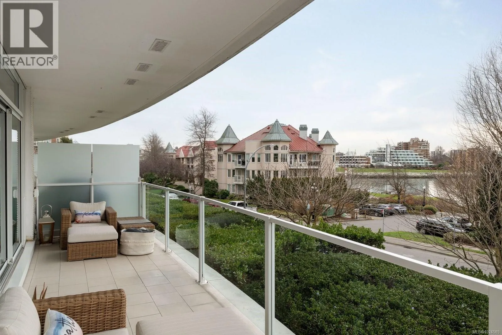 Located in the Shutters Residences on Victoriaâs Inner Harbour, this south-facing two-bedroom plus den waterfront home with three bathrooms offers comfortable living in the sought-after Songhees neighbourhood. The bright interior features an open-concept layout with large windows and sliding glass doors that provide excellent natural light and access to a private patio overlooking the harbour. The kitchen is finished with granite countertops and quality appliances, making it well suited for both everyday living and entertaining. The bedrooms are thoughtfully separated for privacy, each with its own ensuite bathroom. Additional features include in-suite laundry, secure underground parking, and separate storage. Residents of Shutters enjoy access to well-maintained resort-style amenities including a heated outdoor pool, hot tubs, steam room, sauna, fitness centre, guest suite, landscaped water gardens, and waterfront walkways. A scenic harbour path offers an easy connection to downtown Victoria, just minutes from shops, restaurants, and amenities. (id:27476)