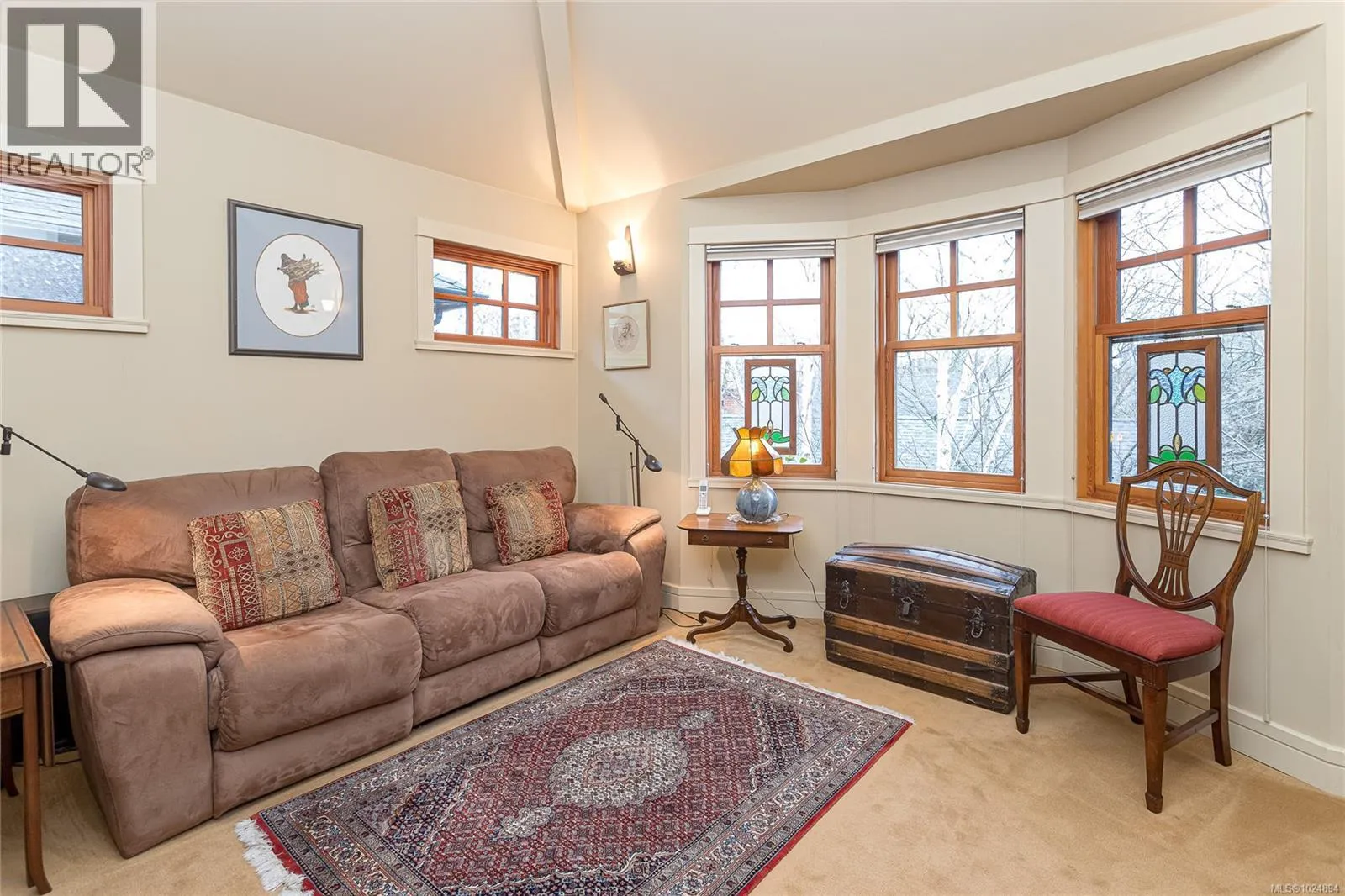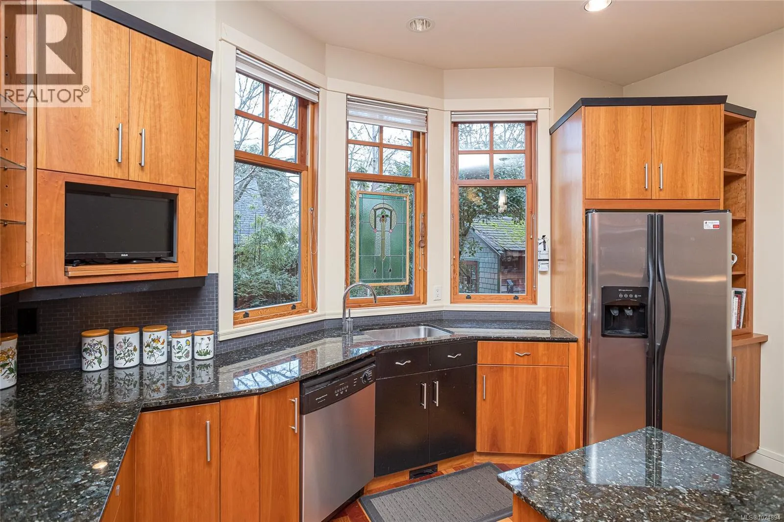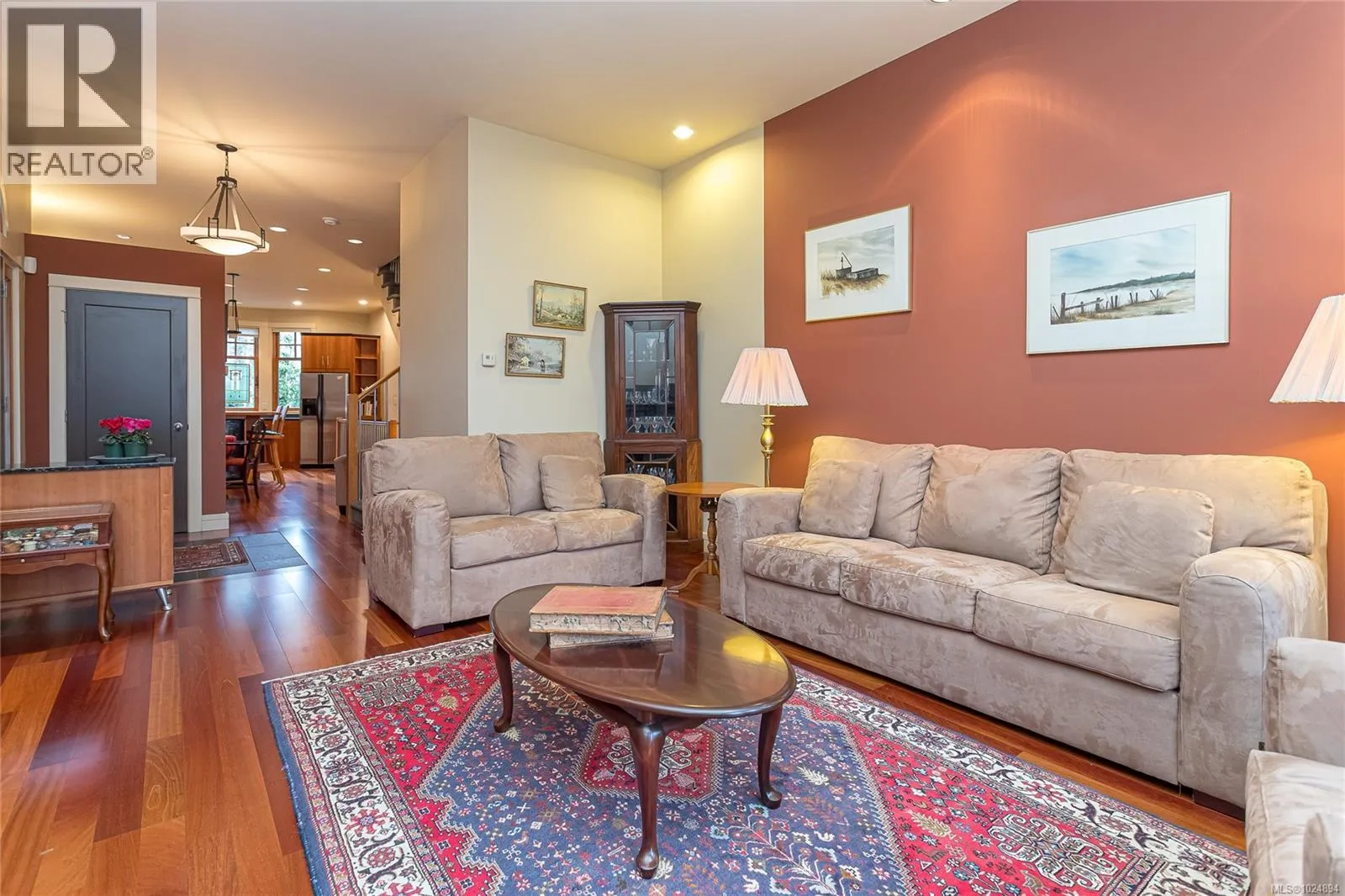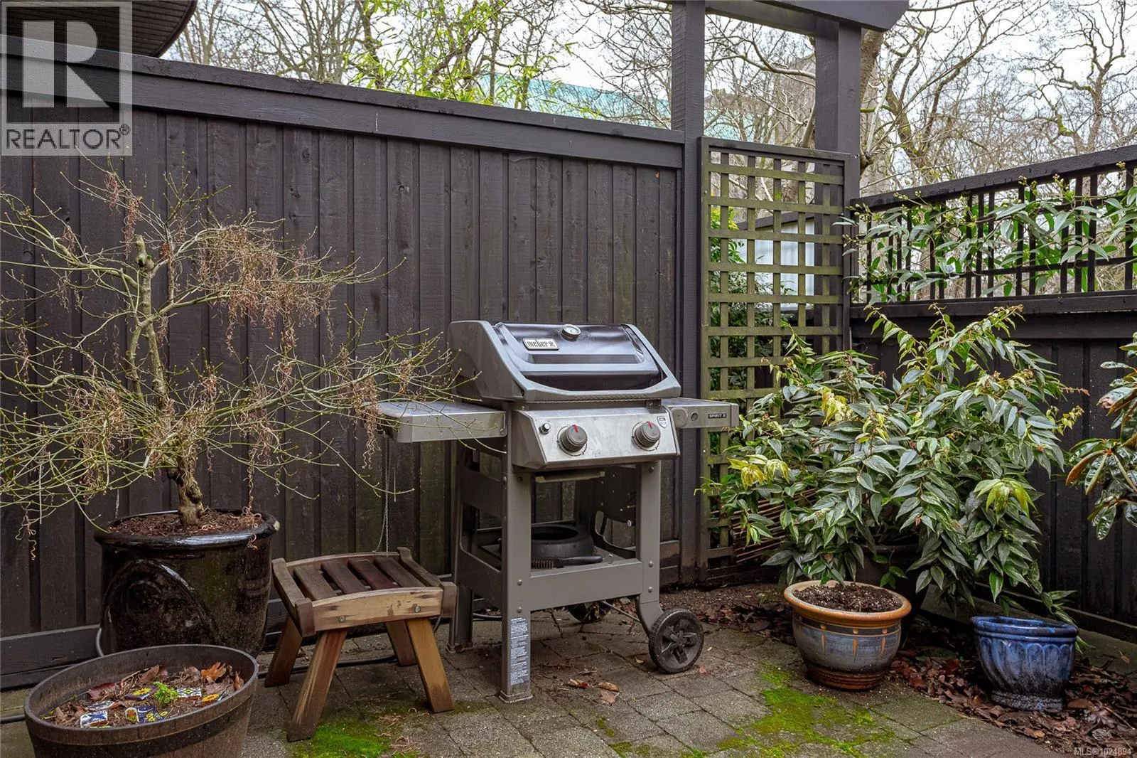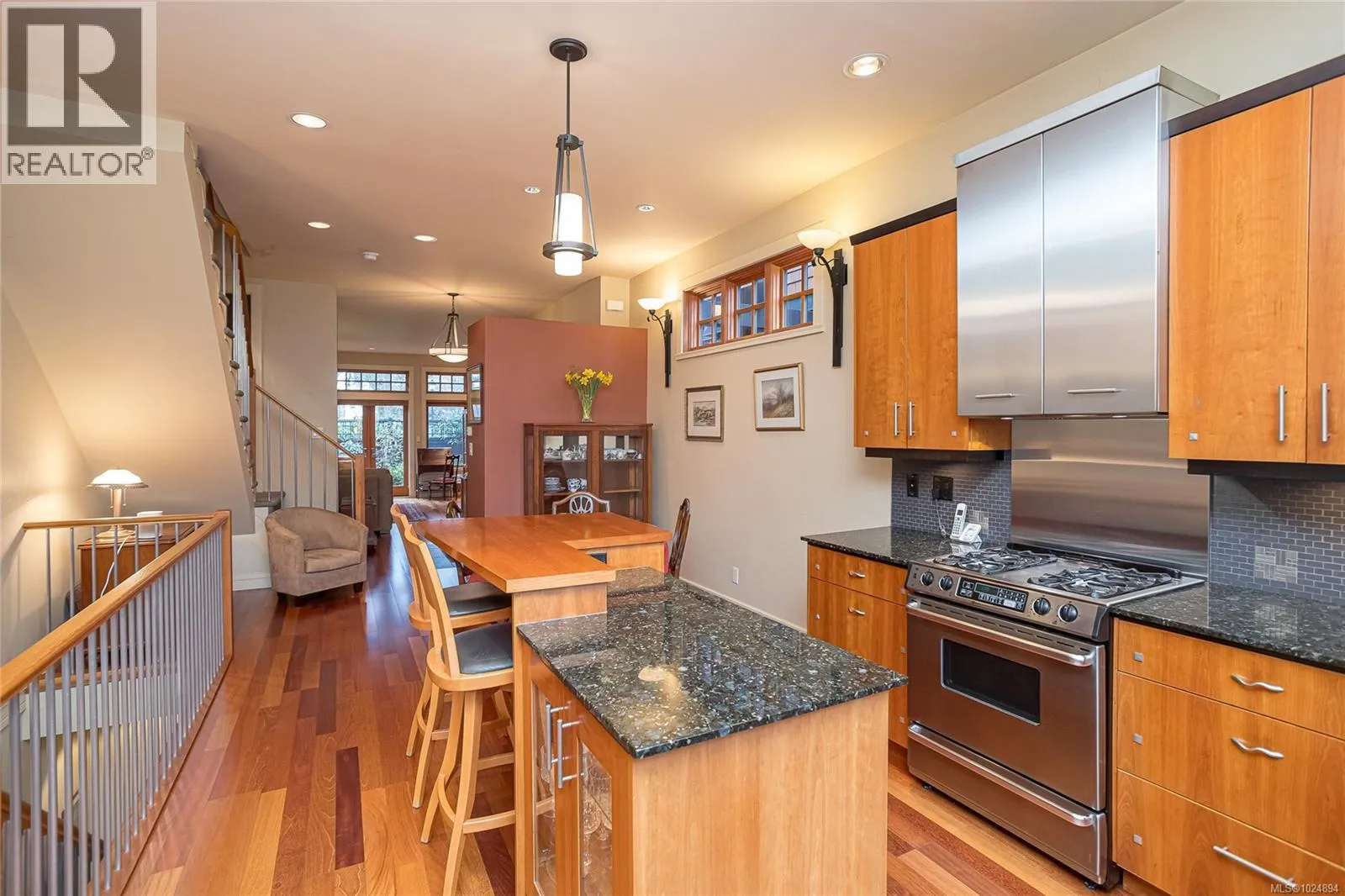 Enjoy luxurious downtown Victoria living at the award winning Terra Rose, built by Abstract Developments. A private enclave of 6 townhomes overlooking heritage greenspace. An oasis within the city. Enter through a private breezeway surrounded by mature landscaping & custom walkway lighting. Over 2000 sq. ft. of elegant living with 3 bedrooms and 4 bathrooms. Quality finishings including 10' ceilings, cherry wood floors, custom wood & stainless appliances, granite counters, wine fridge, built in cabinetry, in-floor radiant heat, gas f/p. Primary bedroom has vaulted ceilings, Juliet park view Balcony, spa inspired ensuite w/separate shower & soaker tub. Lowest level offers 3rd bedroom or office with murphy bed. Entertain on your 200 sq/ft private garden terrace w/BBQ hookup. 2 underground parking spots with EV charger, separate storage plus a heated storage attic. 5-10 minute walk to most downtown shopping, restaurants, theatres, cinemas, and cultural venues. (id:27476)