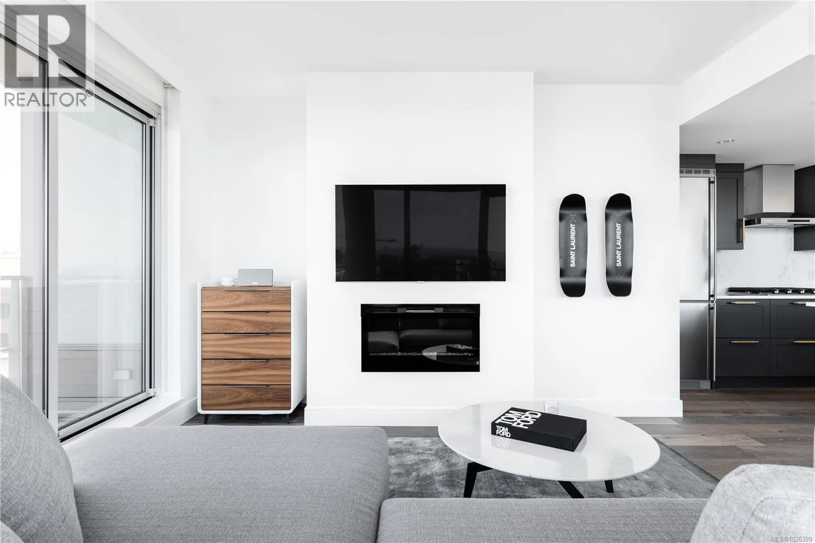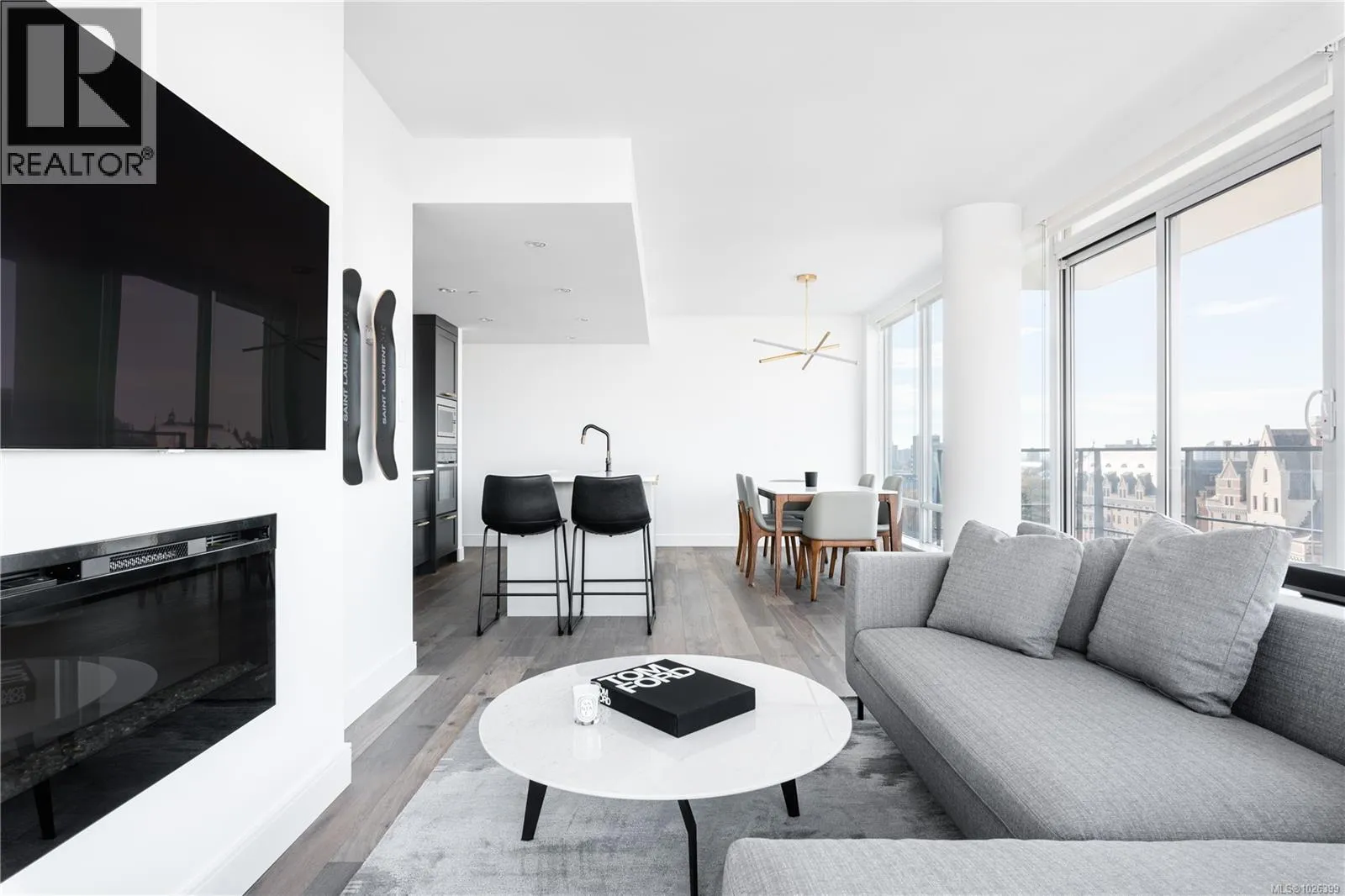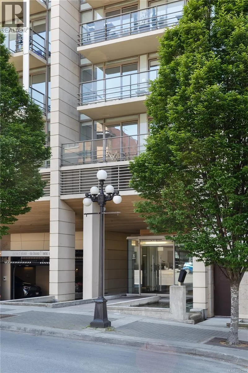 The most refined and design-forward offering currently available at The Falls. This is 1105, a corner, harbour-sunset-facing 2-bedroom + den, 2-bath, in-suite storage room, and nearly 1,200 sqft of magazine-featured interior space. This custom residence stands apart with tailored upgrades and bespoke detailing throughout. Fully reimagined in 2021 with curated materials: real wide-plank walnut hardwood floors, custom Thomas & Birch kitchen millwork, quartz countertops, Buster+Punch hardware, and updated appliances. A modern fireplace anchors the living space, framed by in-set LED wall lighting. Functional updates include new heat pump w/ AC, new full-sized laundry, and two-layer blackout blinds in each bedroom. A true turn-key home w/ high-end furniture included and exclusivity to upscale amenities - pool, hot tub, and gym. Located steps from Victoriaâs best dining and cultural landmarks, Unit 1105 is a rare blend of unique & timeless design, function, and lifestyle. AIRBNB INVESTMENT AVAILABLE. (id:27476)