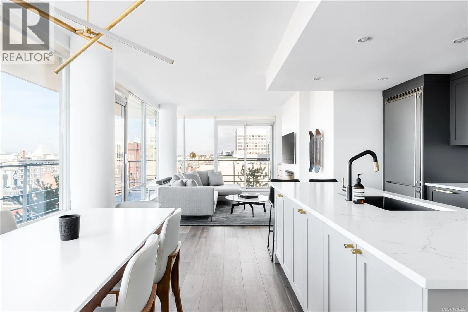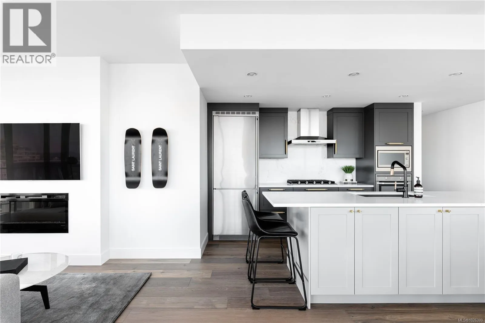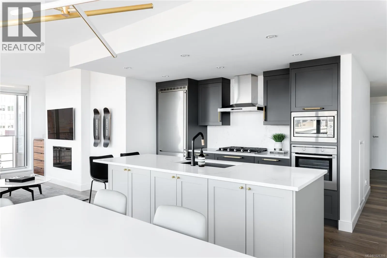 The most refined and design-forward offering currently available at The Falls. This is 1105, a corner, harbour-sunset-facing 2-bedroom + den, 2-bath, in-suite storage room, and nearly 1,200 sqft of magazine-featured interior space. This custom residence stands apart with tailored upgrades and bespoke detailing throughout. Fully reimagined in 2021 with curated materials: real wide-plank walnut hardwood floors, custom Thomas & Birch kitchen millwork, quartz countertops, Buster+Punch hardware, and updated appliances. A modern fireplace anchors the living space, framed by in-set LED wall lighting. Functional updates include new heat pump w/ AC, new full-sized laundry, and two-layer blackout blinds in each bedroom. A true turn-key home w/ high-end furniture included and exclusivity to upscale amenities - pool, hot tub, and gym. Located steps from Victoriaâs best dining and cultural landmarks, Unit 1105 is a rare blend of unique & timeless design, function, and lifestyle. AIRBNB INVESTMENT AVAILABLE. (id:27476)