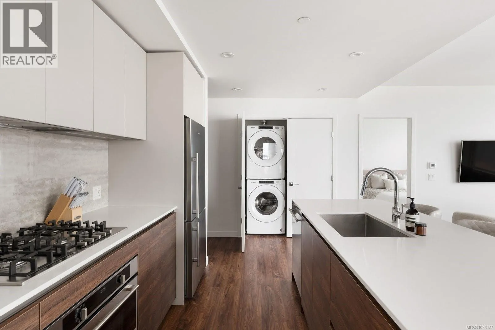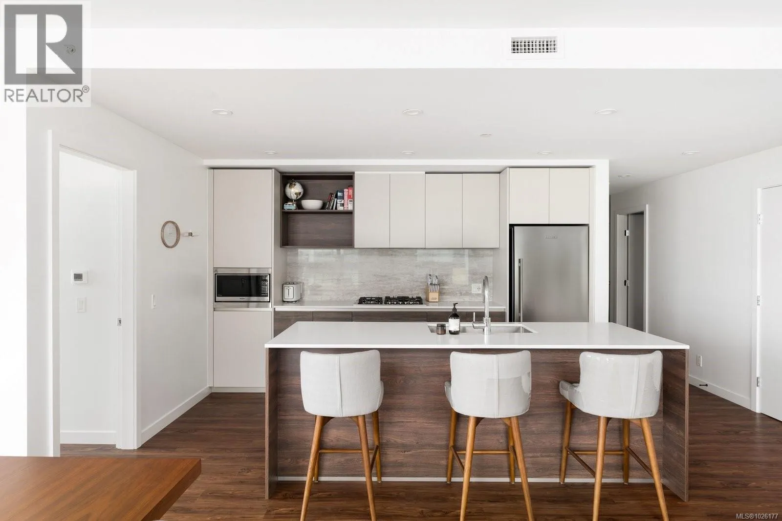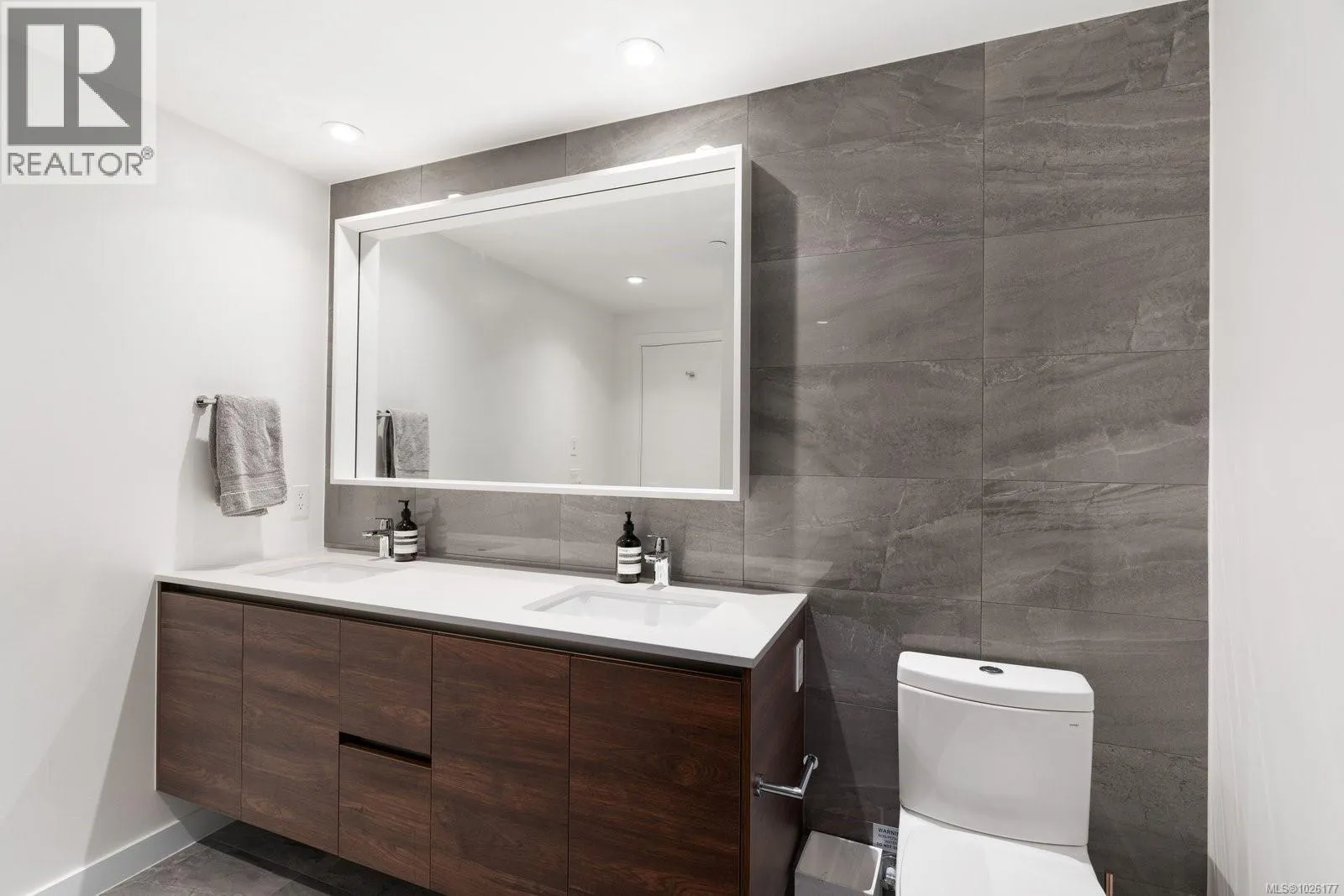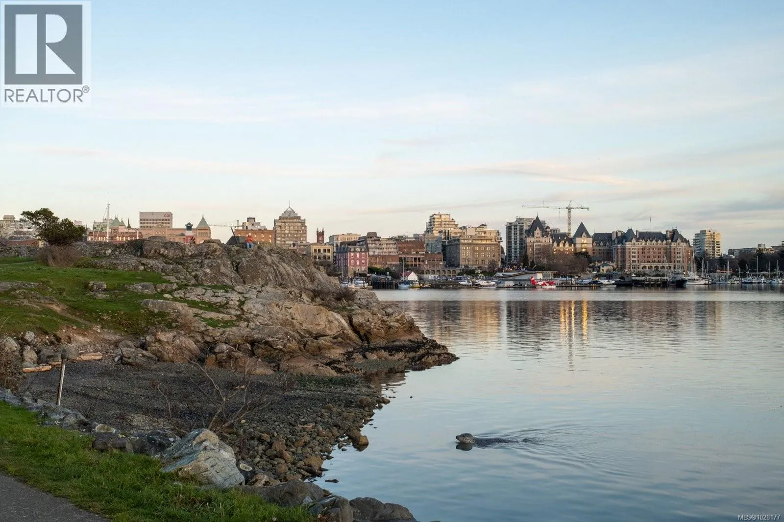 Sweeping ocean & downtown views from this corner unit on the 8th floor of 369 Tyee (Tower 1). This luxurious 2 bed/2 bath urban oasis in the heart of Vic West is thoughtfully designed with a perfect blend of modern living with sustainable features. Almost 1,100 sqft of open-concept living space, the kitchen boasts Stosa Italian cabinetry, sleek stainless steel appliances, quartz countertops, and a convenient breakfast bar. The primary bedroom is a tranquil retreat with a large ensuite & walk in closet. The 2nd bedroom is perfect for guests or office with amazing views of downtown. A large private patio overlooks the waterway, perfect spot for BBQ'ing & entertaining all summer. Storage space has not been overlooked, with plenty of closets to accommodate. Secure underground parking, separate storage & a bike room. Top it off with resident exclusive amenities - a lounge, fitness facility, pet wash, bike repair, and a rooftop patio to enjoy 360 degree views. (id:27476)