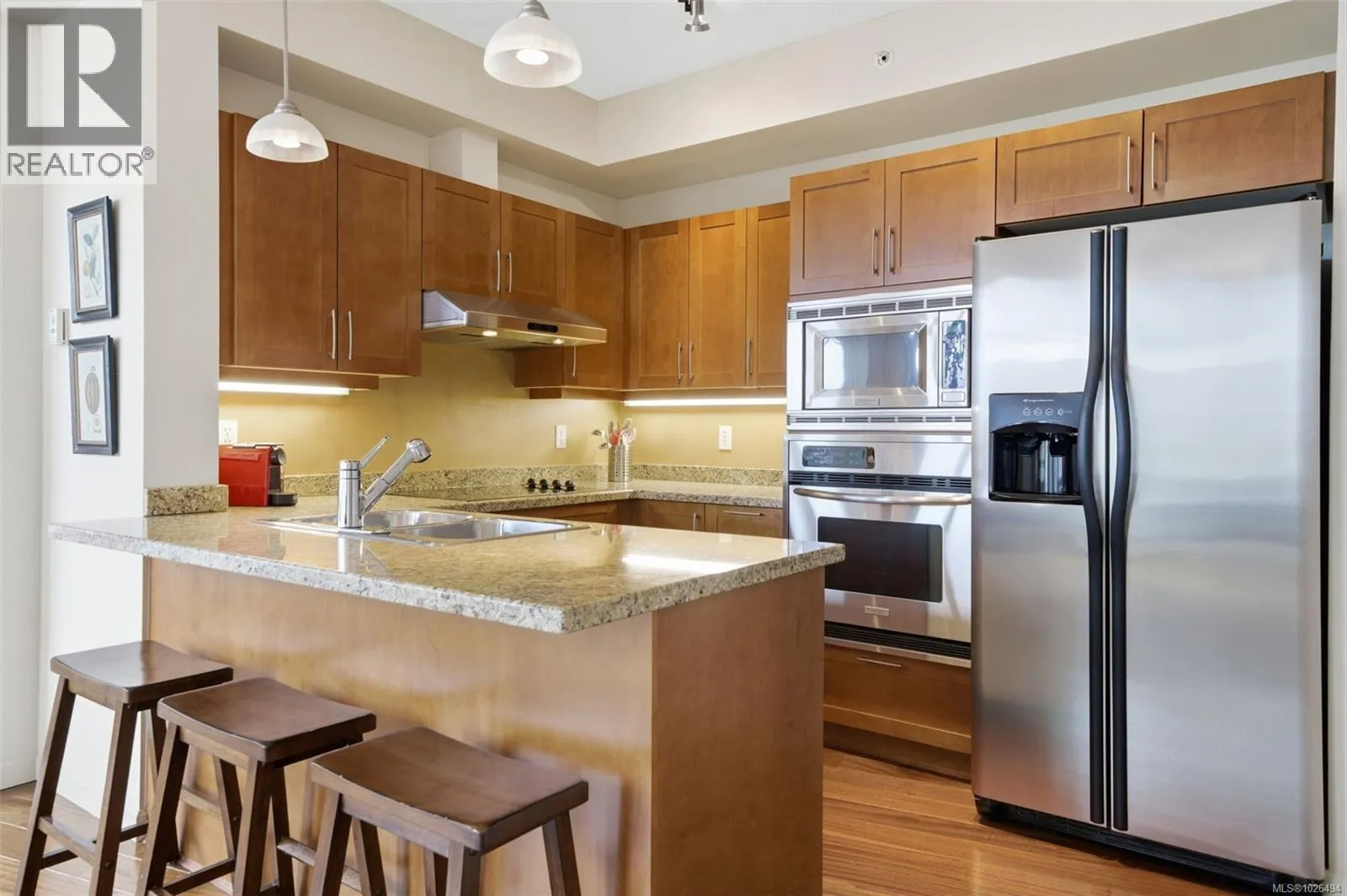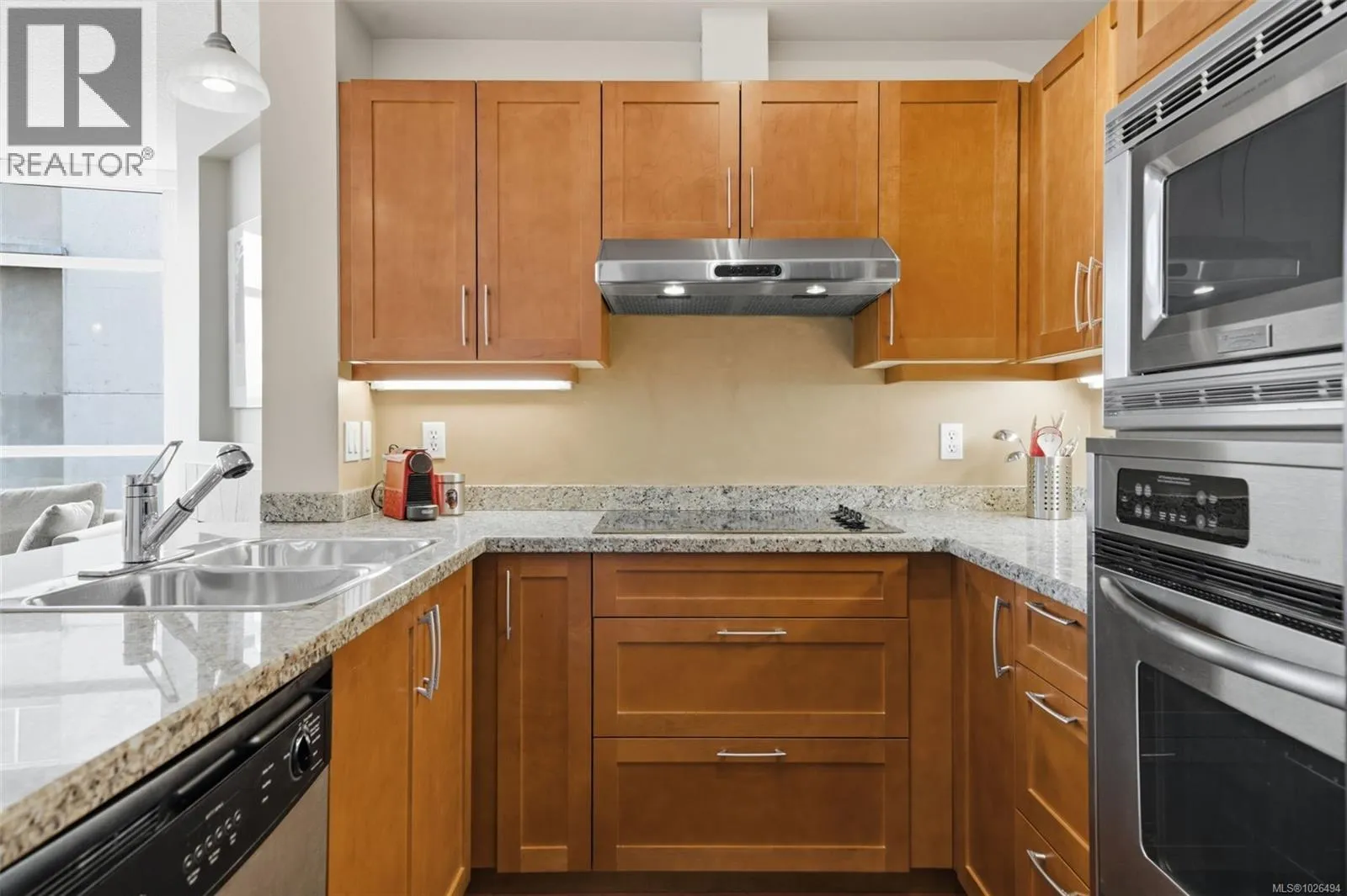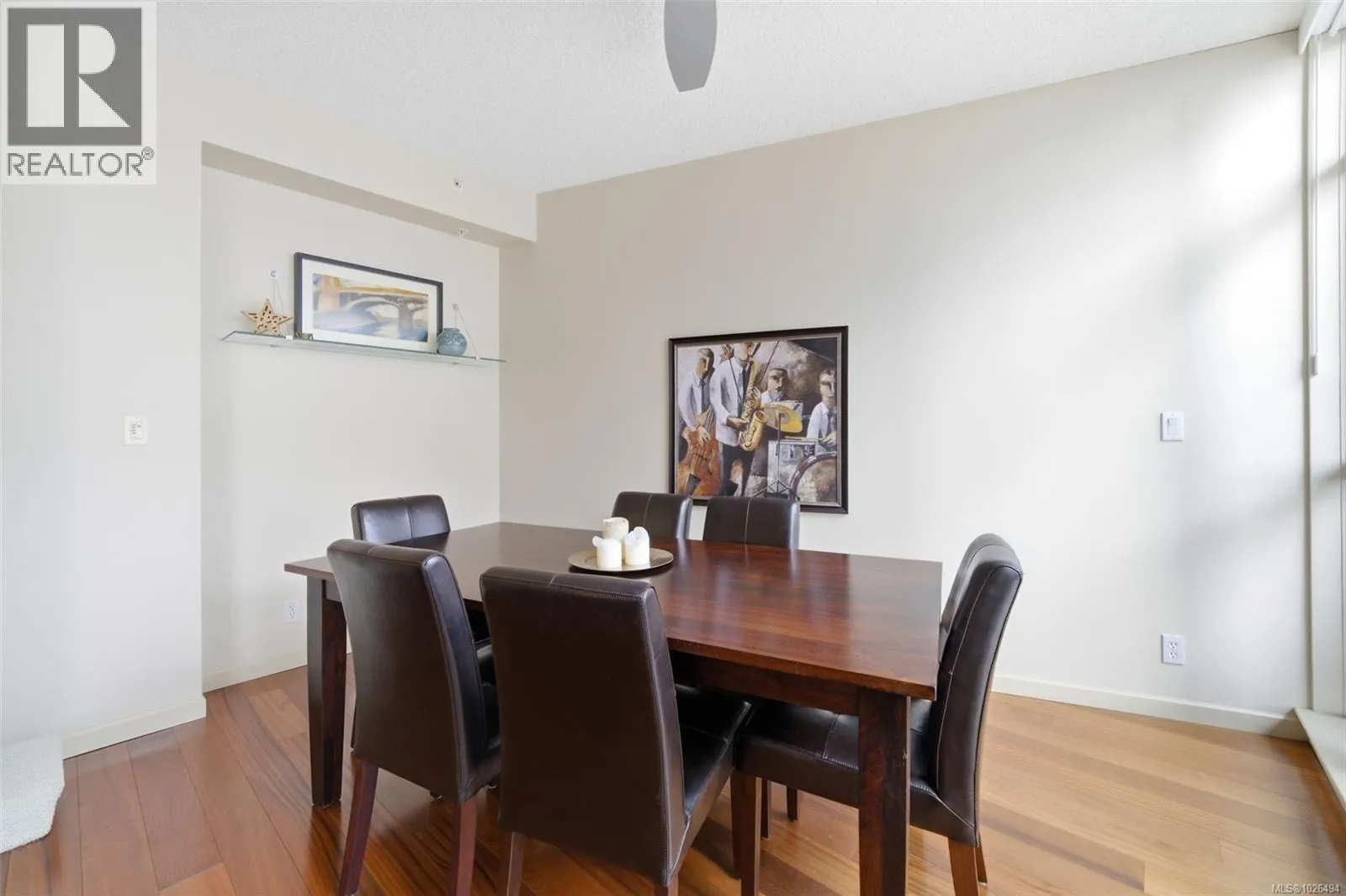 Top-floor penthouse living at City Place with exceptional indoor-outdoor spaces and refined two-level design. This immaculate 2-bed, 2-bath residence offers bright, executive living with soaring 10-ft ceilings, oversized windows, and a skylight that fills the home with natural light while offering a calm, private outlook rarely found downtown. Southern exposures showcase peekaboo views of the Salish Sea, Mt. St. Maryâs, and St. Annâs, adding a sense of openness while maintaining excellent privacy. Rich Brazilian cherry hardwood floors anchor the main level, and the kitchen features stainless steel appliances, granite countertops, and a breakfast bar that opens seamlessly to the airy living and dining area and private deck. Motorized solar roller shades provide comfort and convenience throughout. The spacious primary suite offers a spa-inspired ensuite with separate shower and deep soaker tub, creating a true retreat within the home. Upstairs, the exclusive 238 sq ft rooftop patio delivers open-sky west-facing city outlooks â a private setting ideal for entertaining, container gardening, or relaxing above the city. This thoughtful two-level layout provides excellent separation of space and a refined penthouse lifestyle with a focus on light, privacy, and livability. City Place is a well-managed steel and concrete building offering secure underground parking with EV charging options and pet-friendly living with no size or weight restrictions. Centrally located just steps to shops, dining, parks, and the Inner Harbour, this location pairs vibrant urban access with a peaceful residential feel. Elevated, private, and rare. Book your private showing today. (id:27476)
